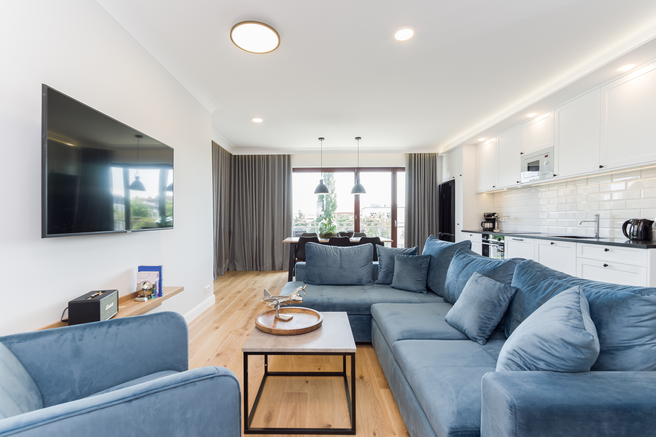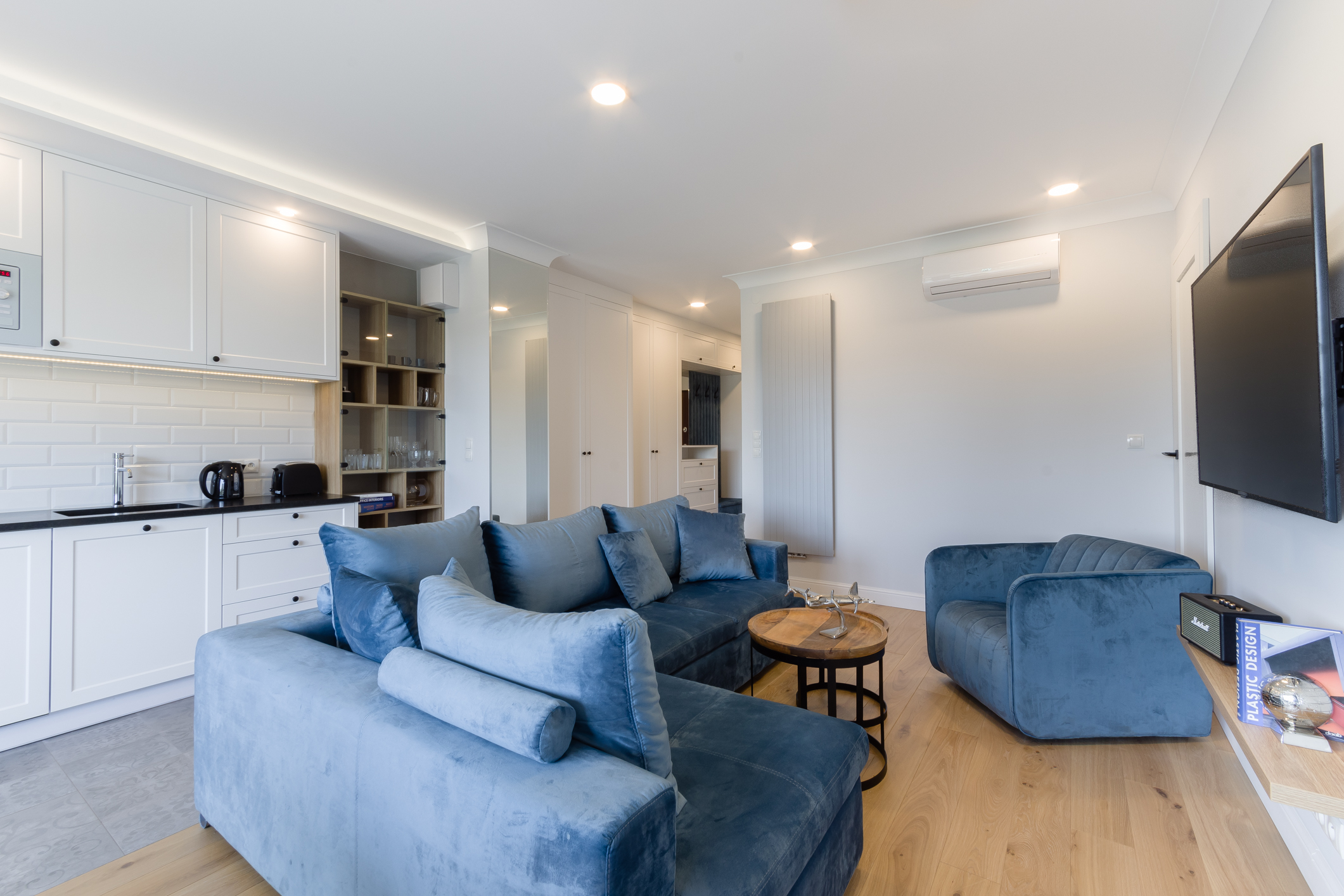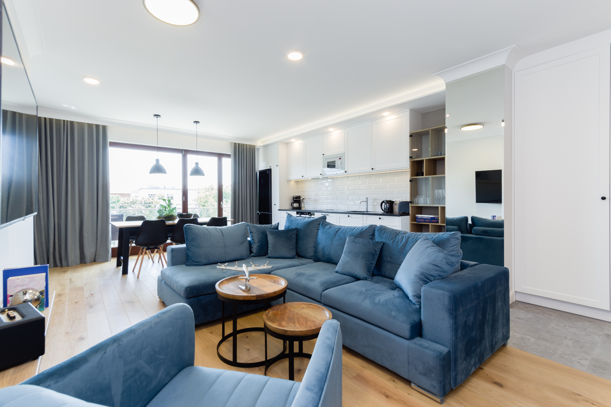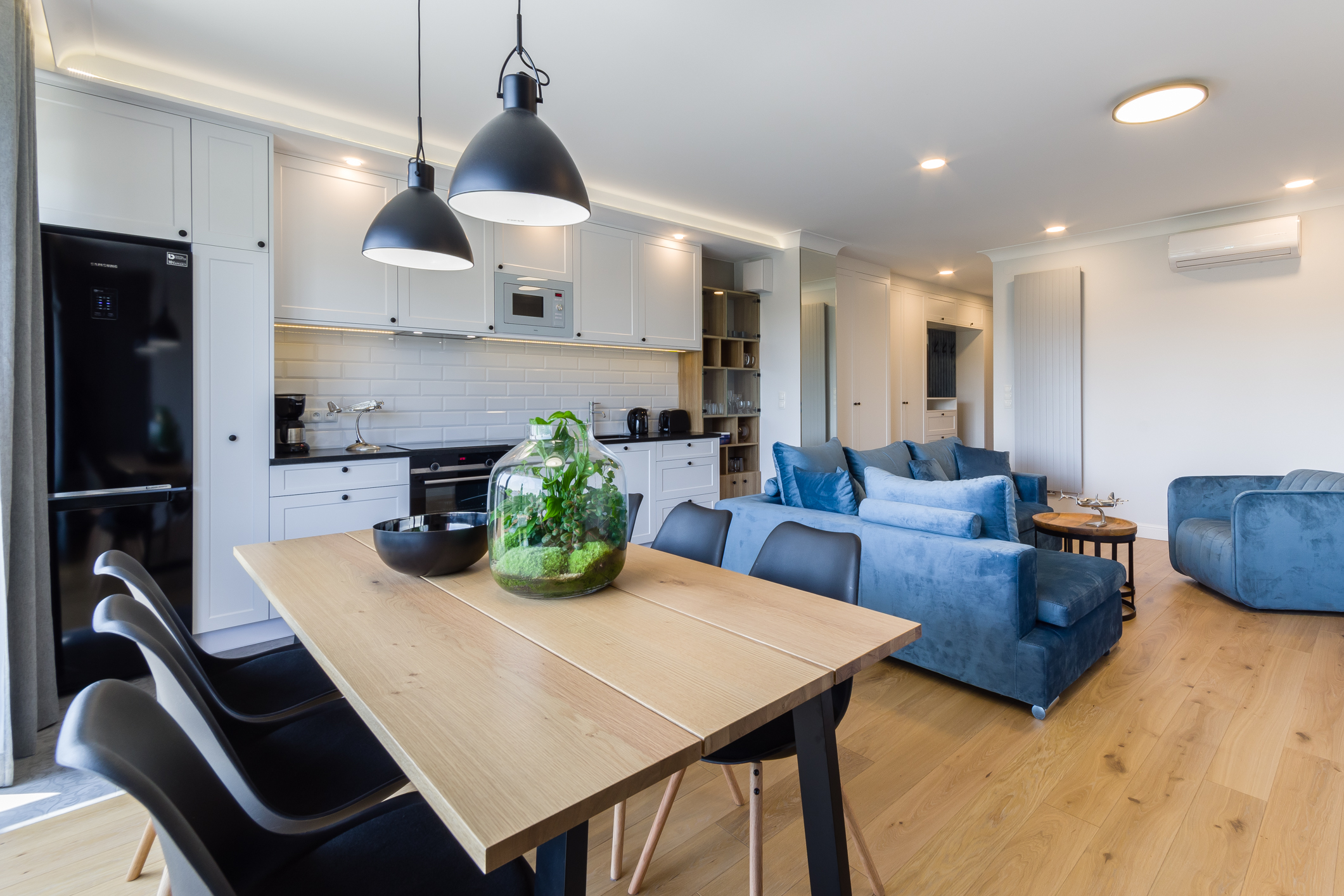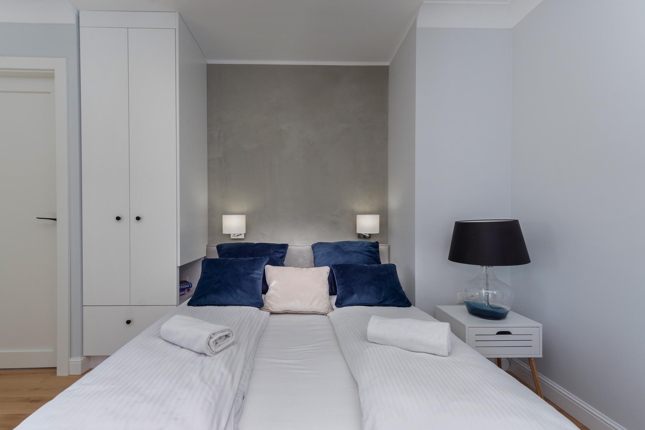 We designed the apartment in Chmielna in Gdańsk for short-term rent. The project is a more economical category, as the investment had to pay off for our client in a short period of time. The whole interior is held in the tones of wood, blue and navy blue, because the apartment is located in Gdańsk and was supposed to gently refer to the sea accessibility. The apartment with an area of 67m2 accommodates 6 people in comfort. A great effect is the moon printed on glass that decorate the shower wall in the bathroom.