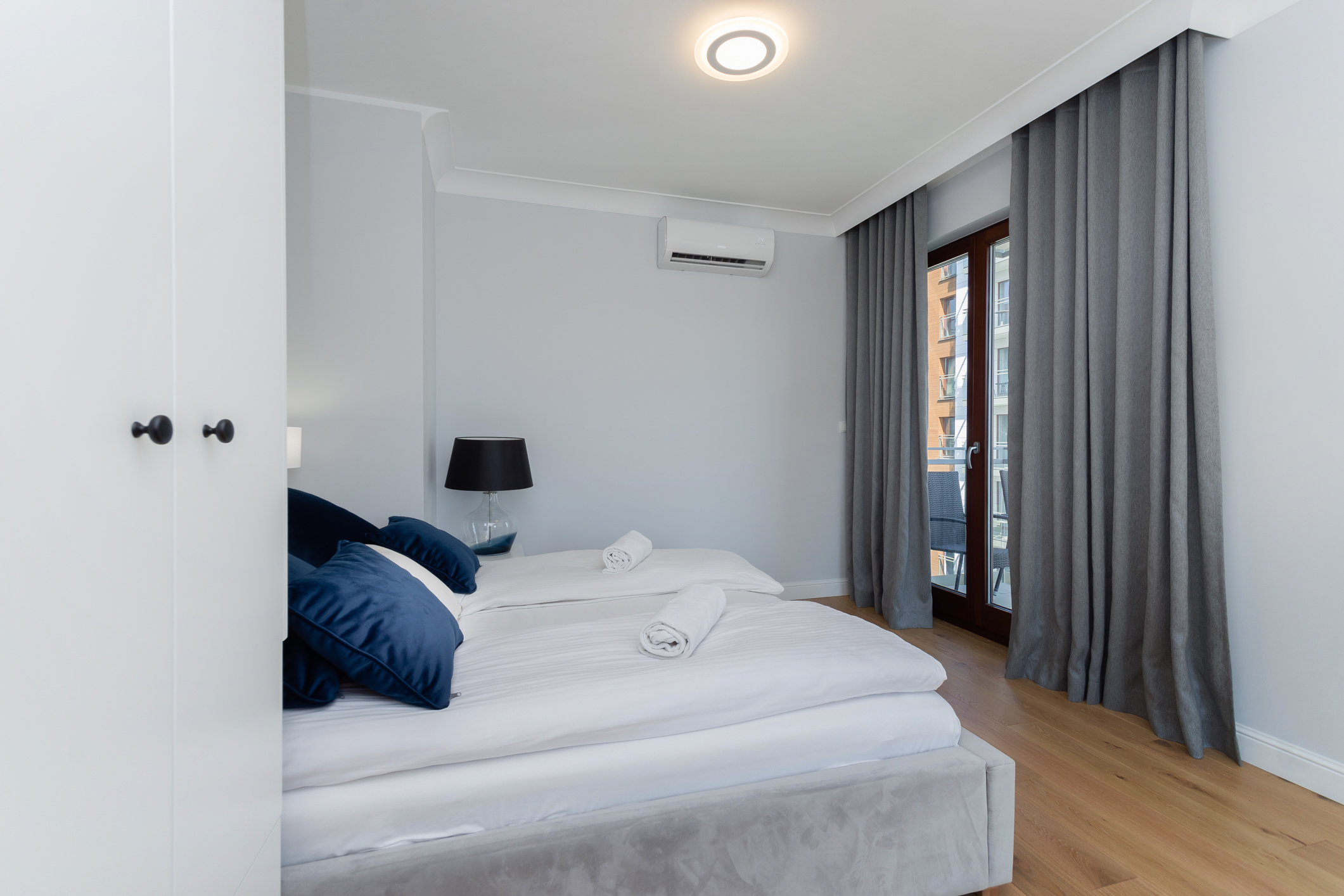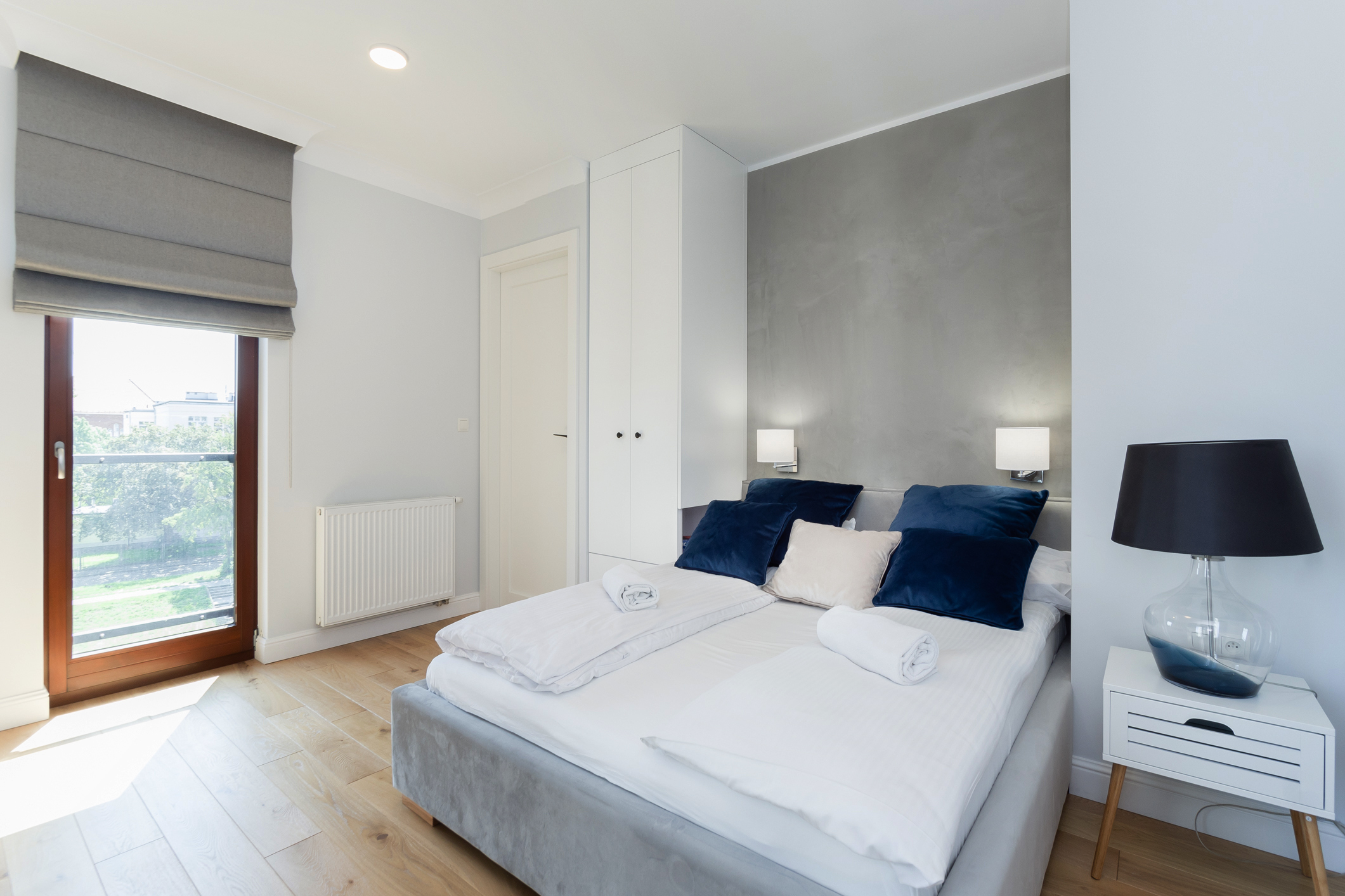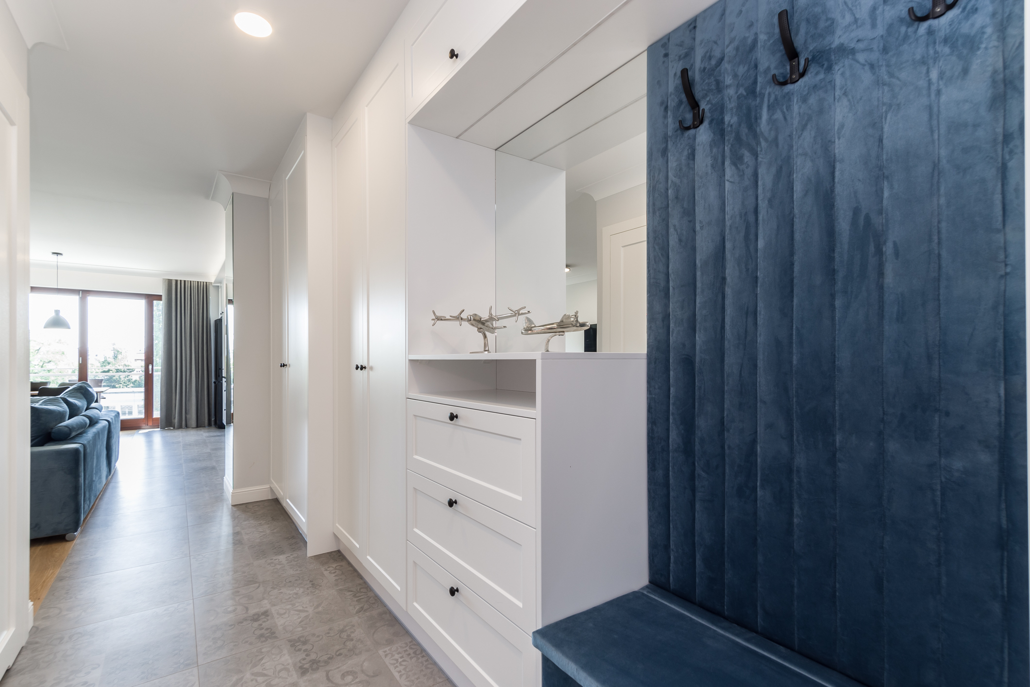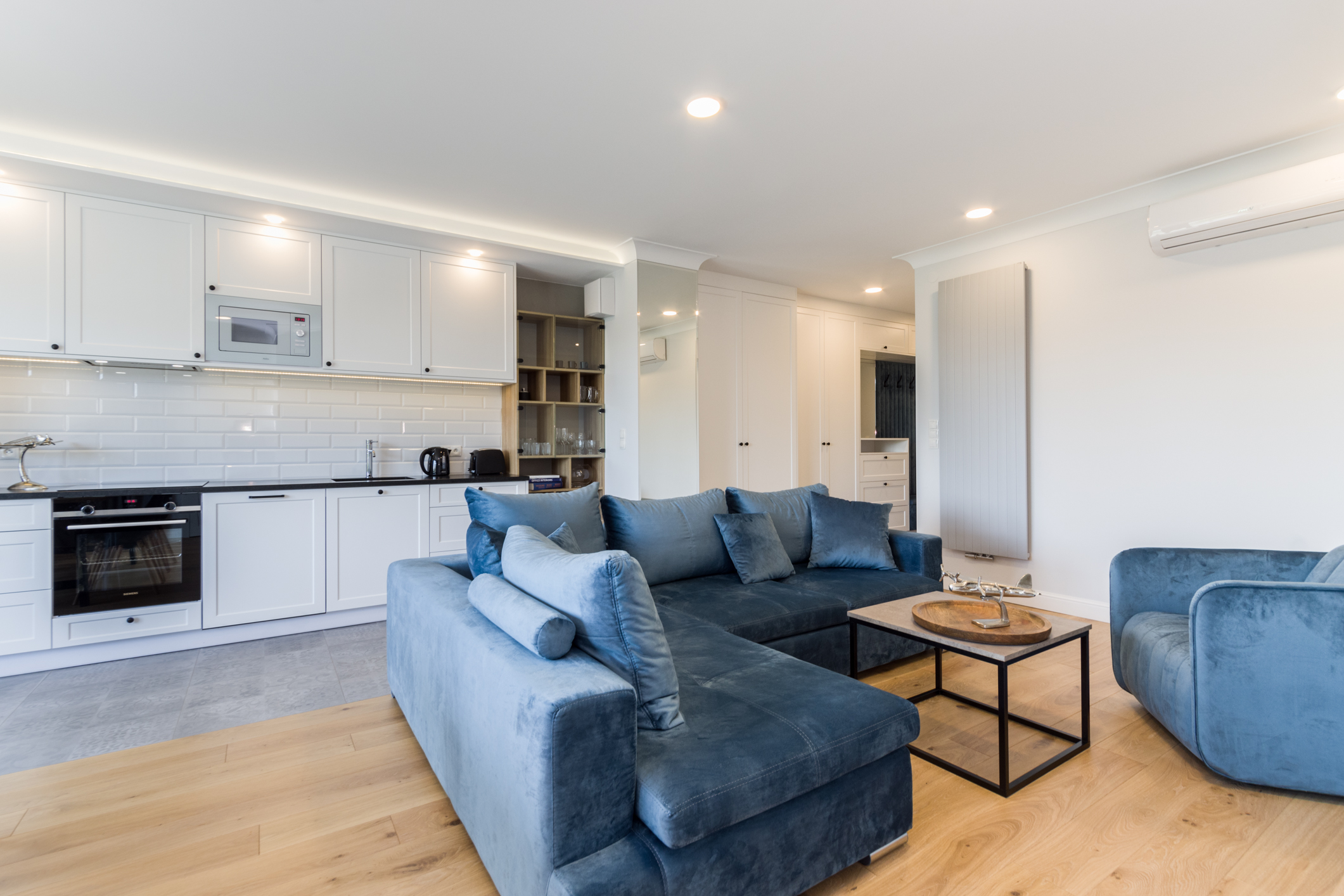 We designed the apartment in Chmielna in Gdańsk for short-term rent. The project is a more economical category, as the investment had to pay off for our client in a short period of time. The whole interior is held in the tones of wood, blue and navy blue, because the apartment is located in Gdańsk and was supposed to gently refer to the sea accessibility. The apartment with an area of 67m2 accommodates 6 people in comfort. A great effect is the moon printed on glass that decorate the shower wall in the bathroom.