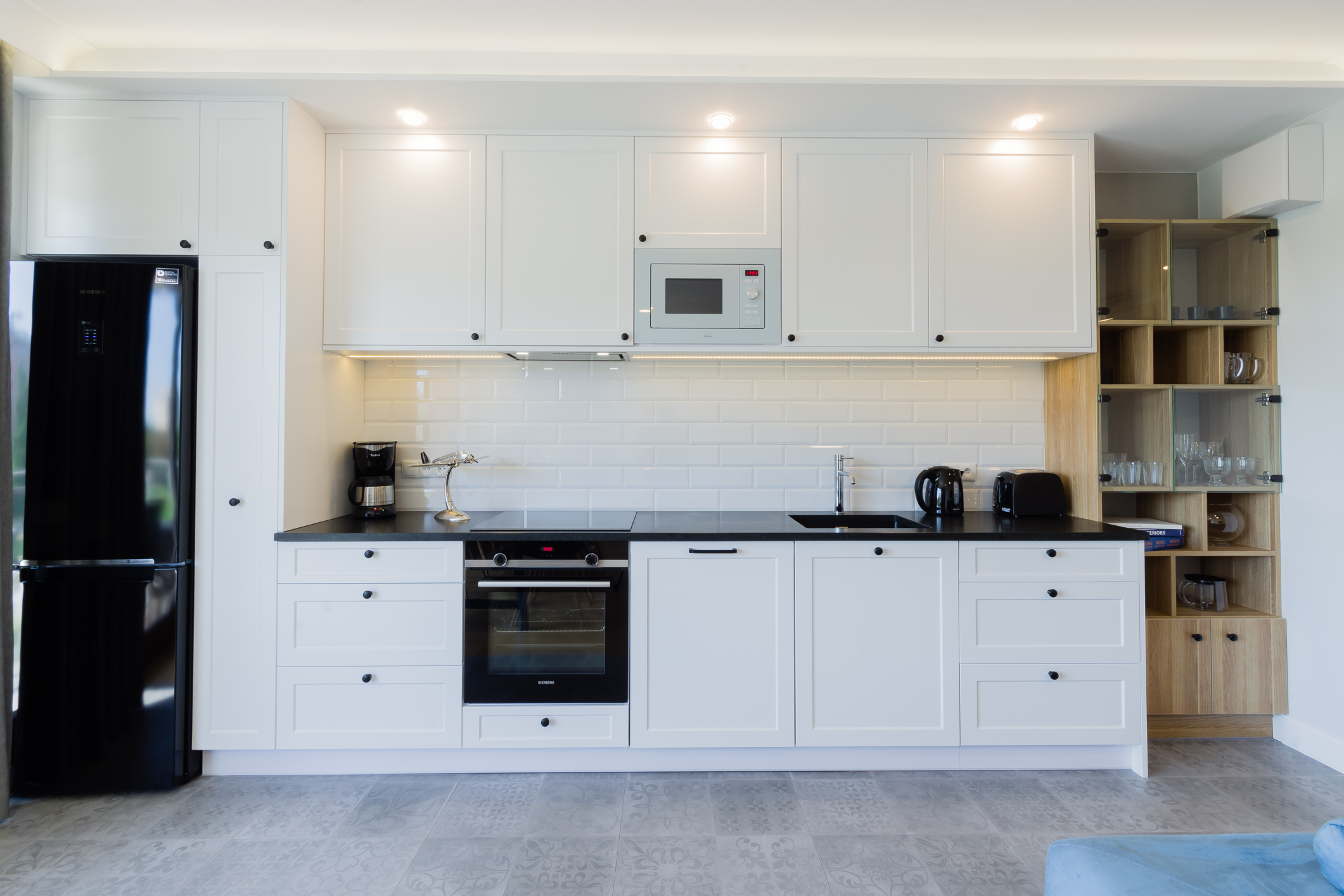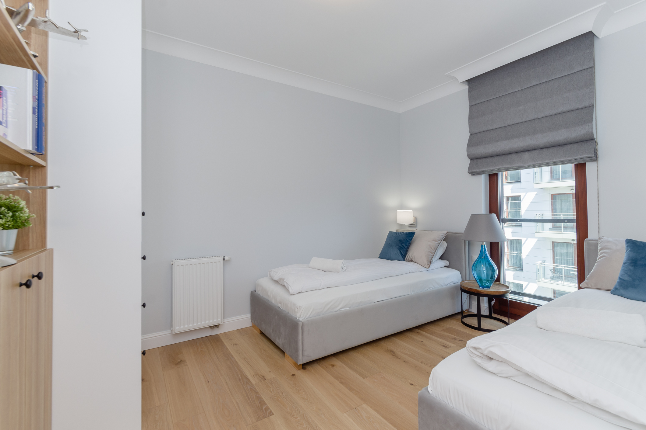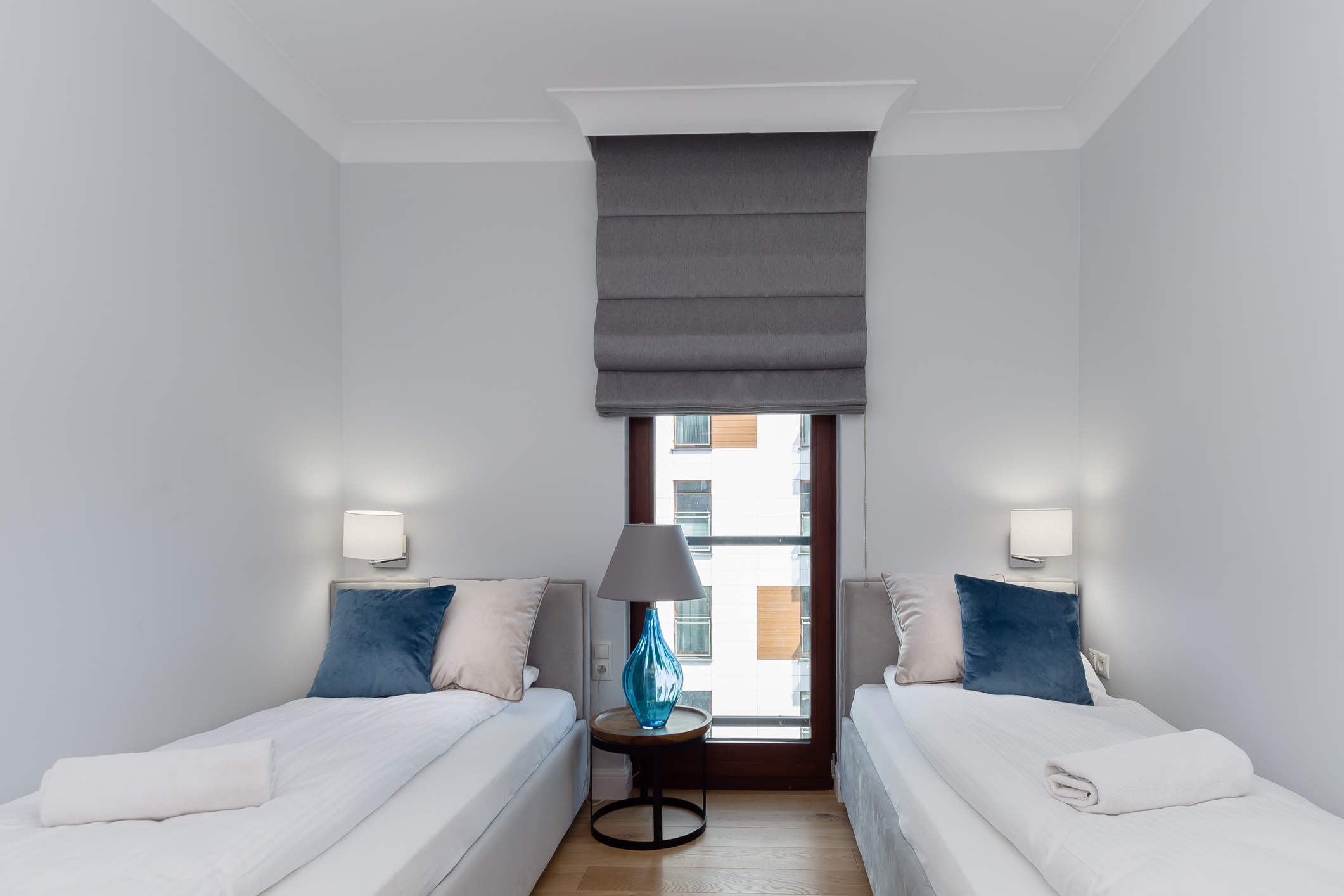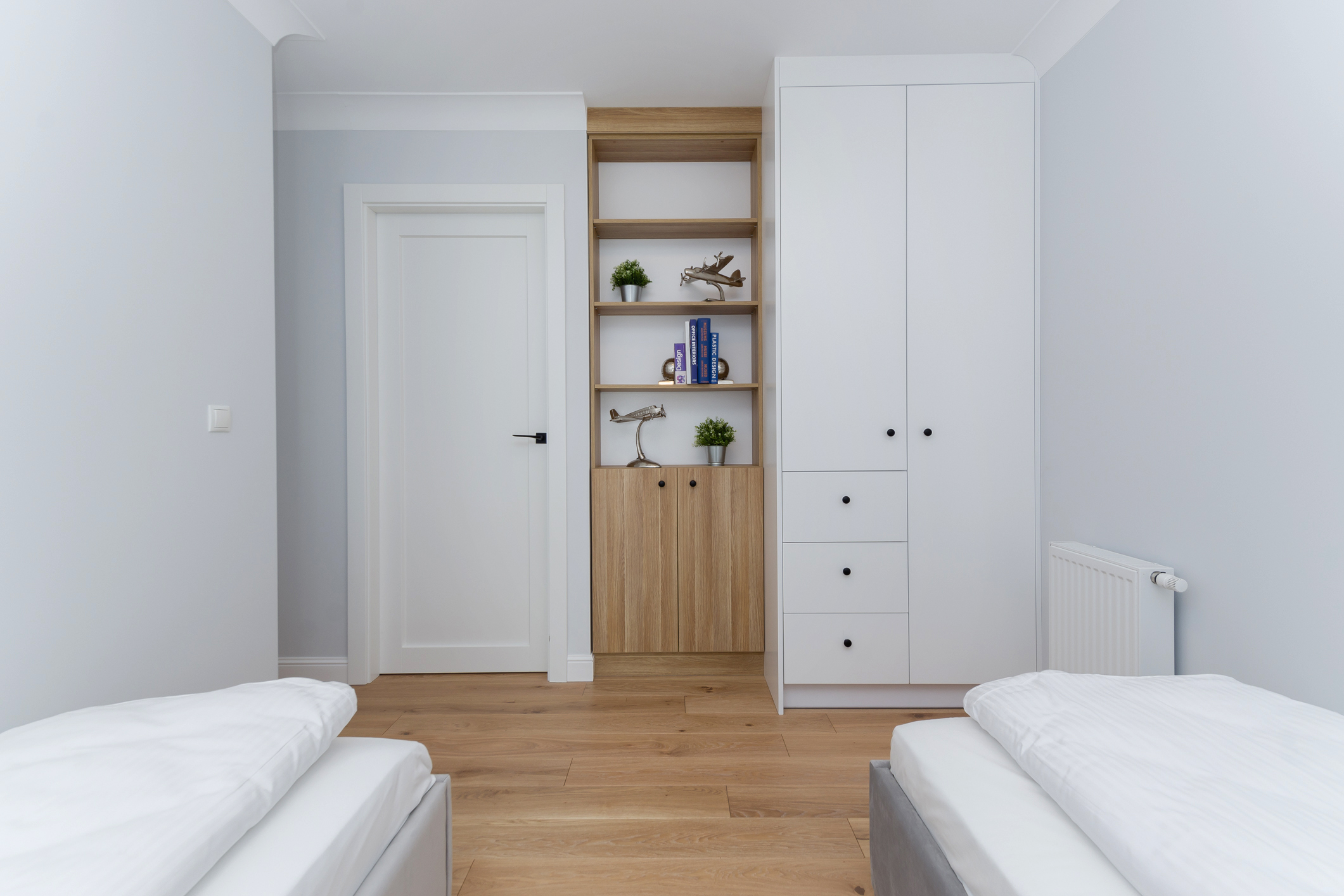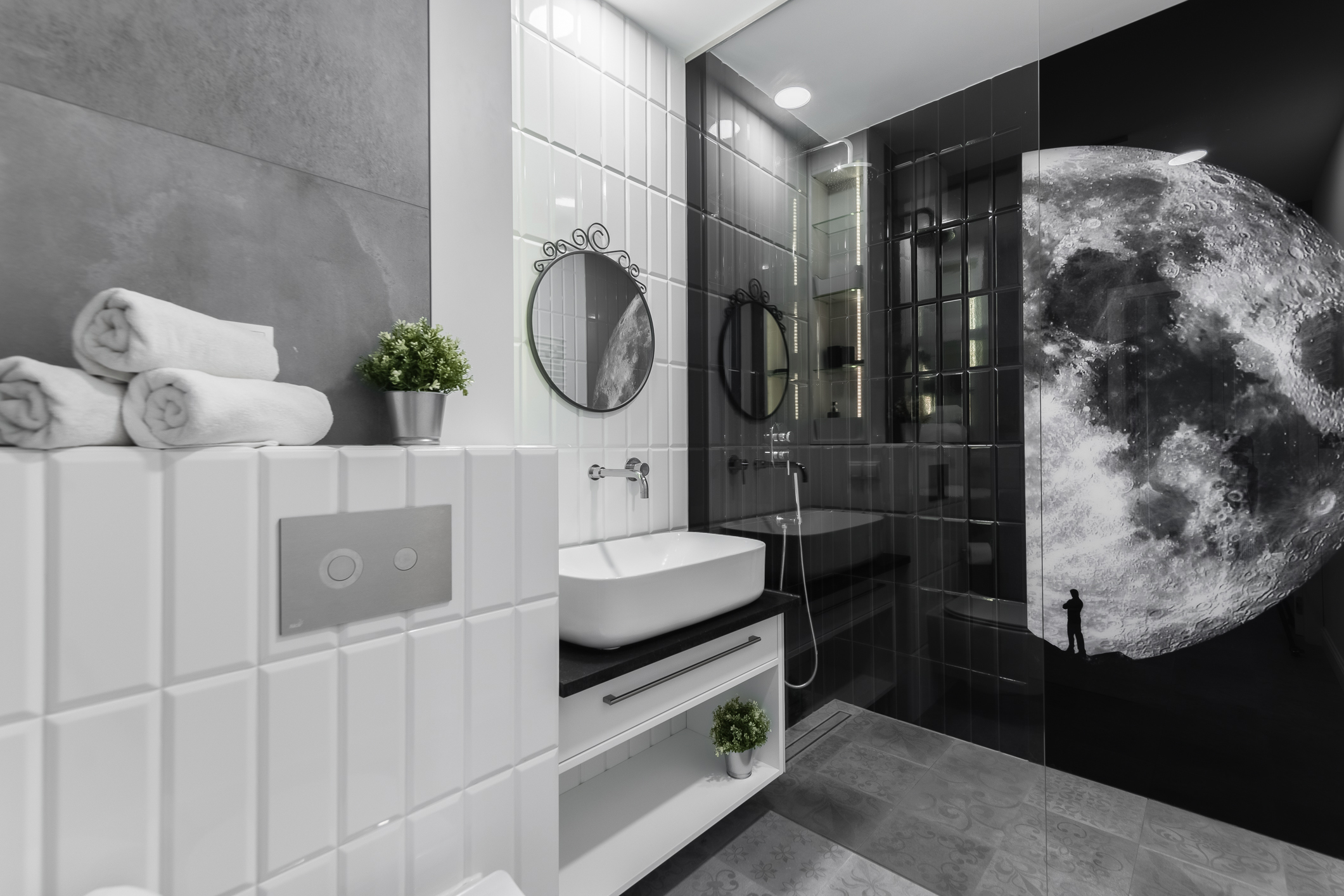 We designed the apartment in Chmielna in Gdańsk for short-term rent. The project is a more economical category, as the investment had to pay off for our client in a short period of time. The whole interior is held in the tones of wood, blue and navy blue, because the apartment is located in Gdańsk and was supposed to gently refer to the sea accessibility. The apartment with an area of 67m2 accommodates 6 people in comfort. A great effect is the moon printed on glass that decorate the shower wall in the bathroom.