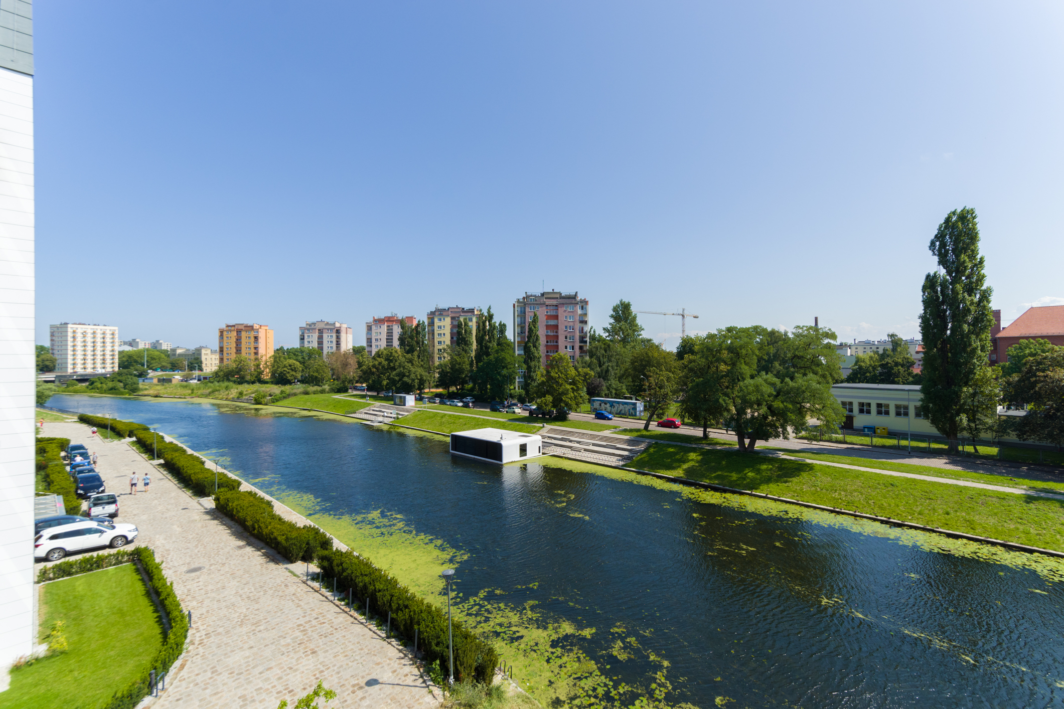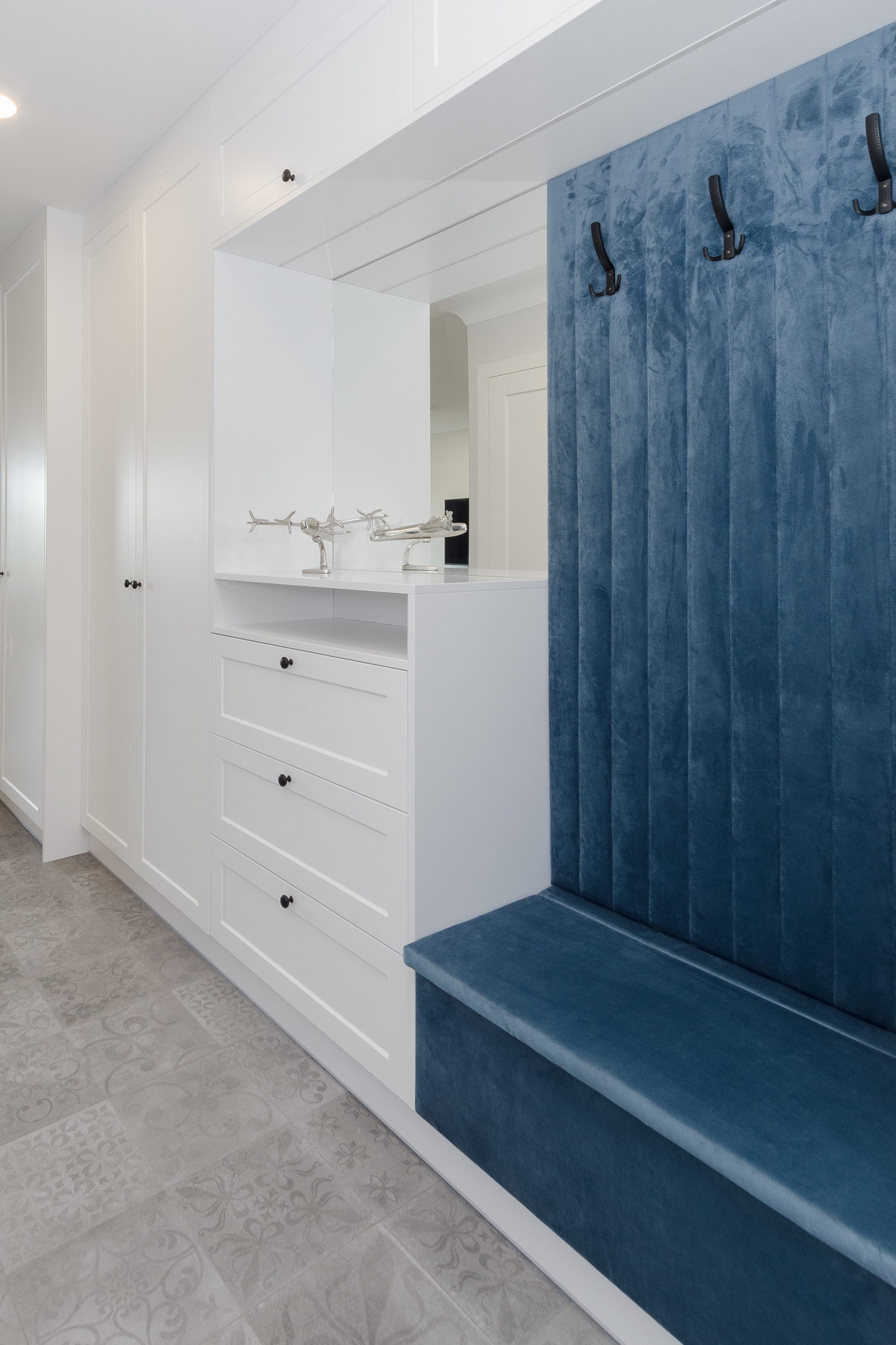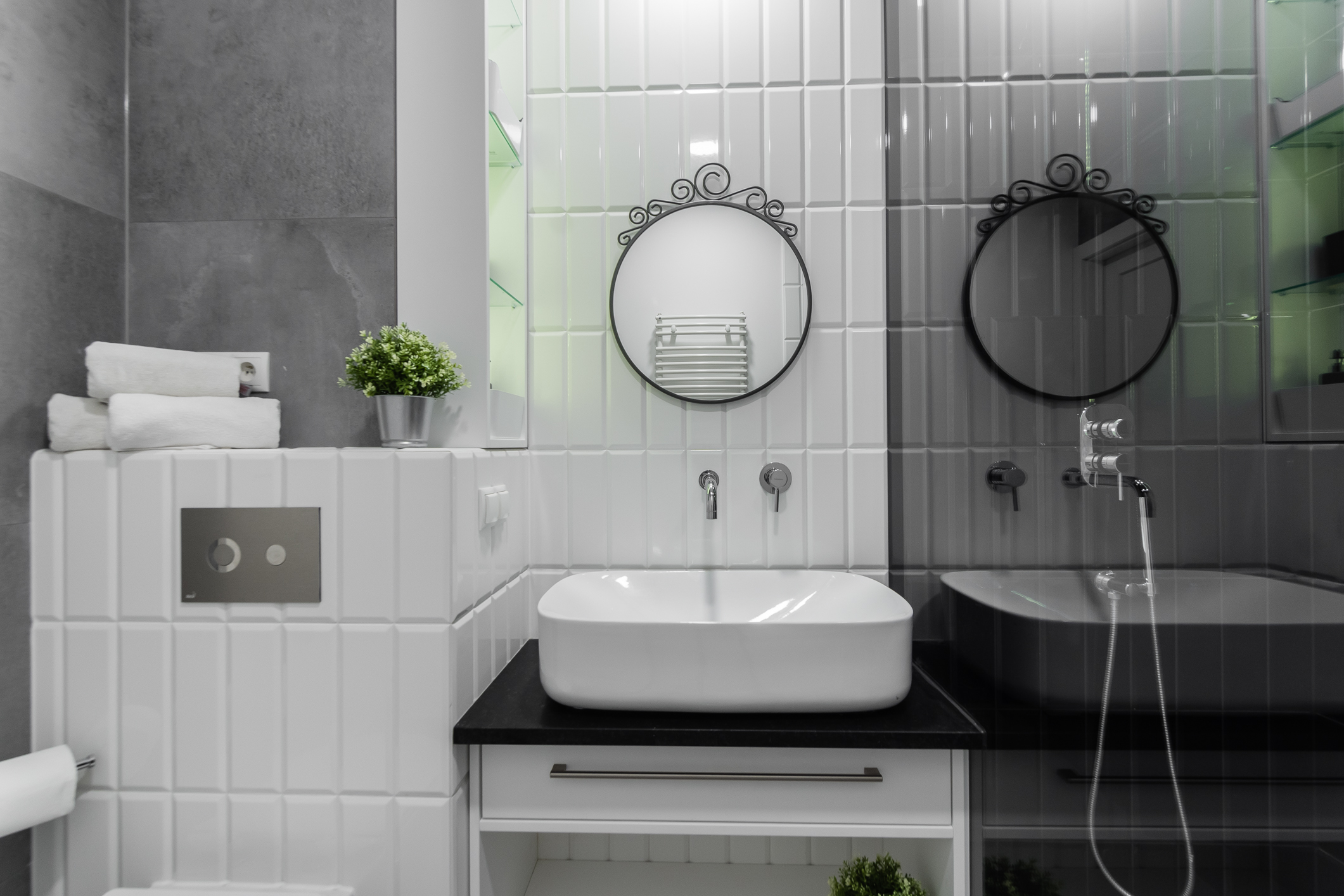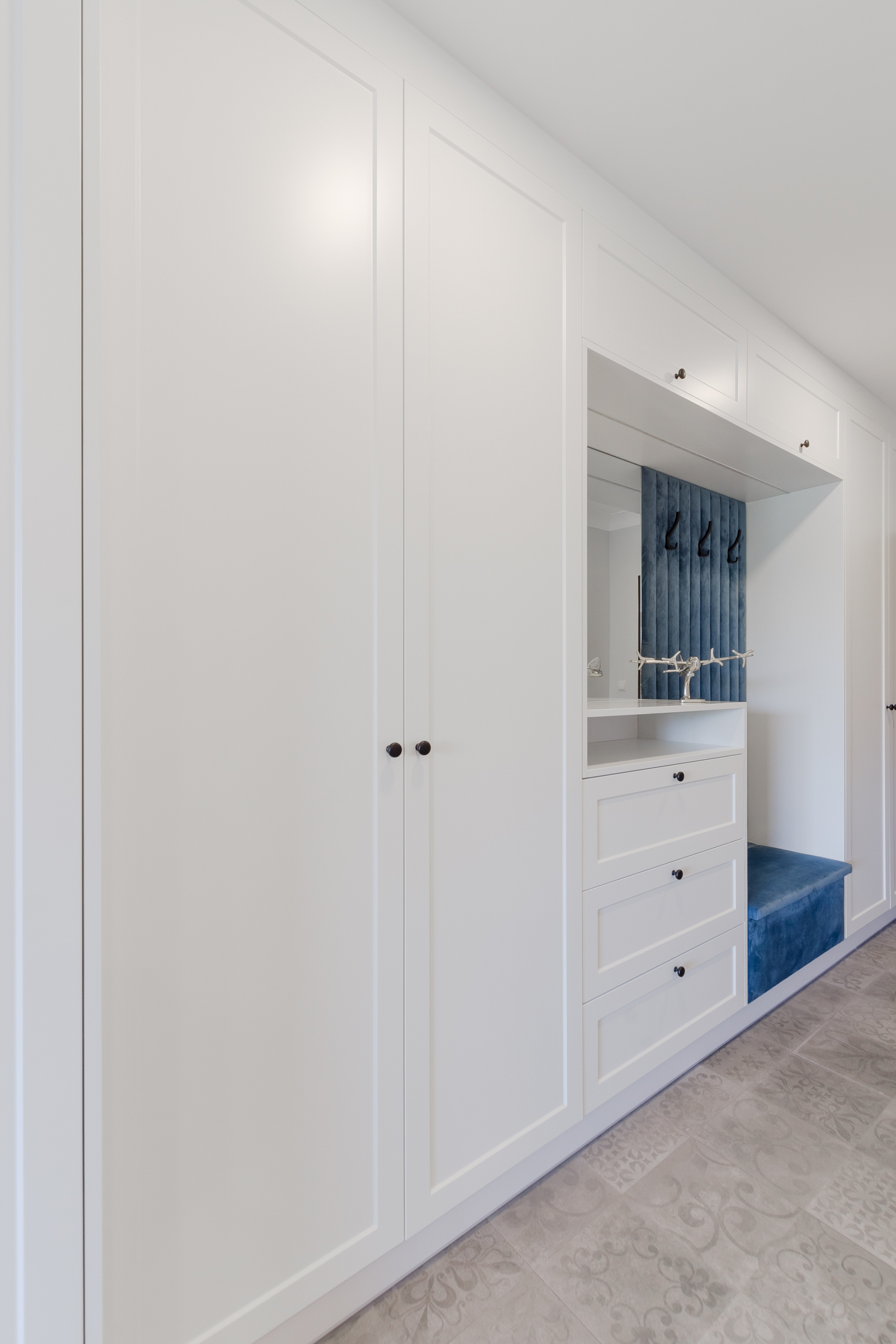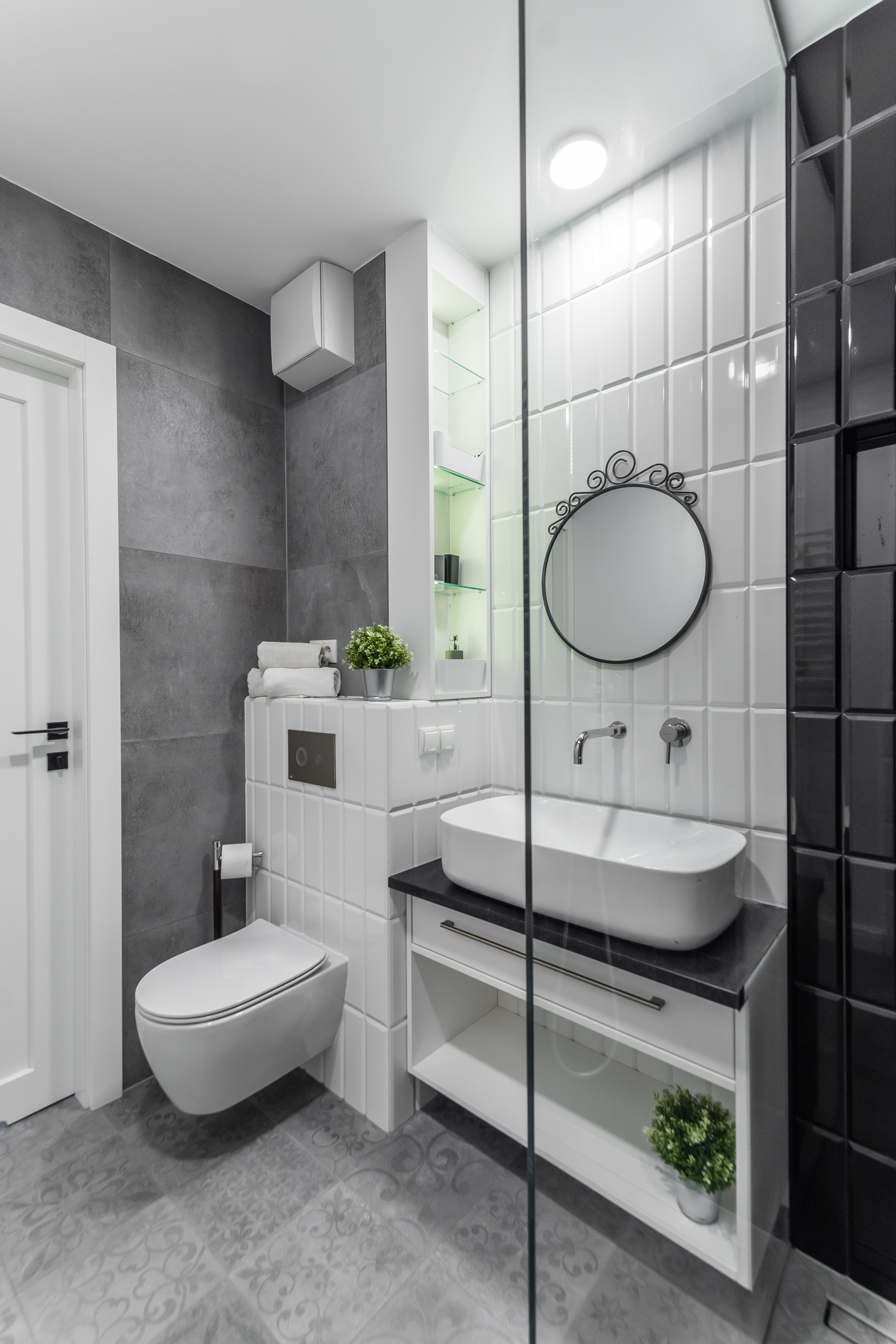We designed the apartment in Chmielna in Gdańsk for short-term rent. The project is a more economical category, as the investment had to pay off for our client in a short period of time. The whole interior is held in the tones of wood, blue and navy blue, because the apartment is located in Gdańsk and was supposed to gently refer to the sea accessibility. The apartment with an area of 67m2 accommodates 6 people in comfort. A great effect is the moon printed on glass that decorate the shower wall in the bathroom.