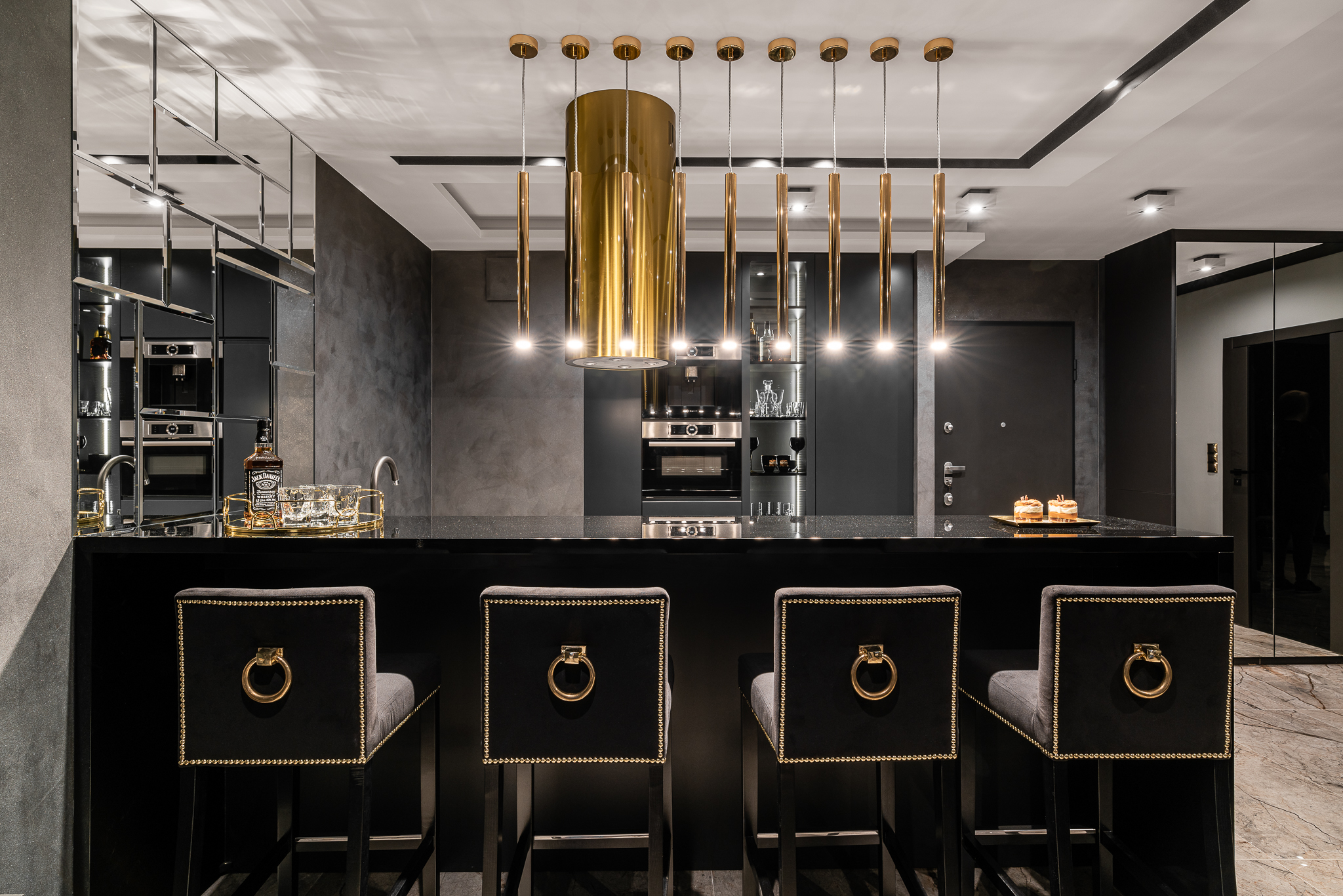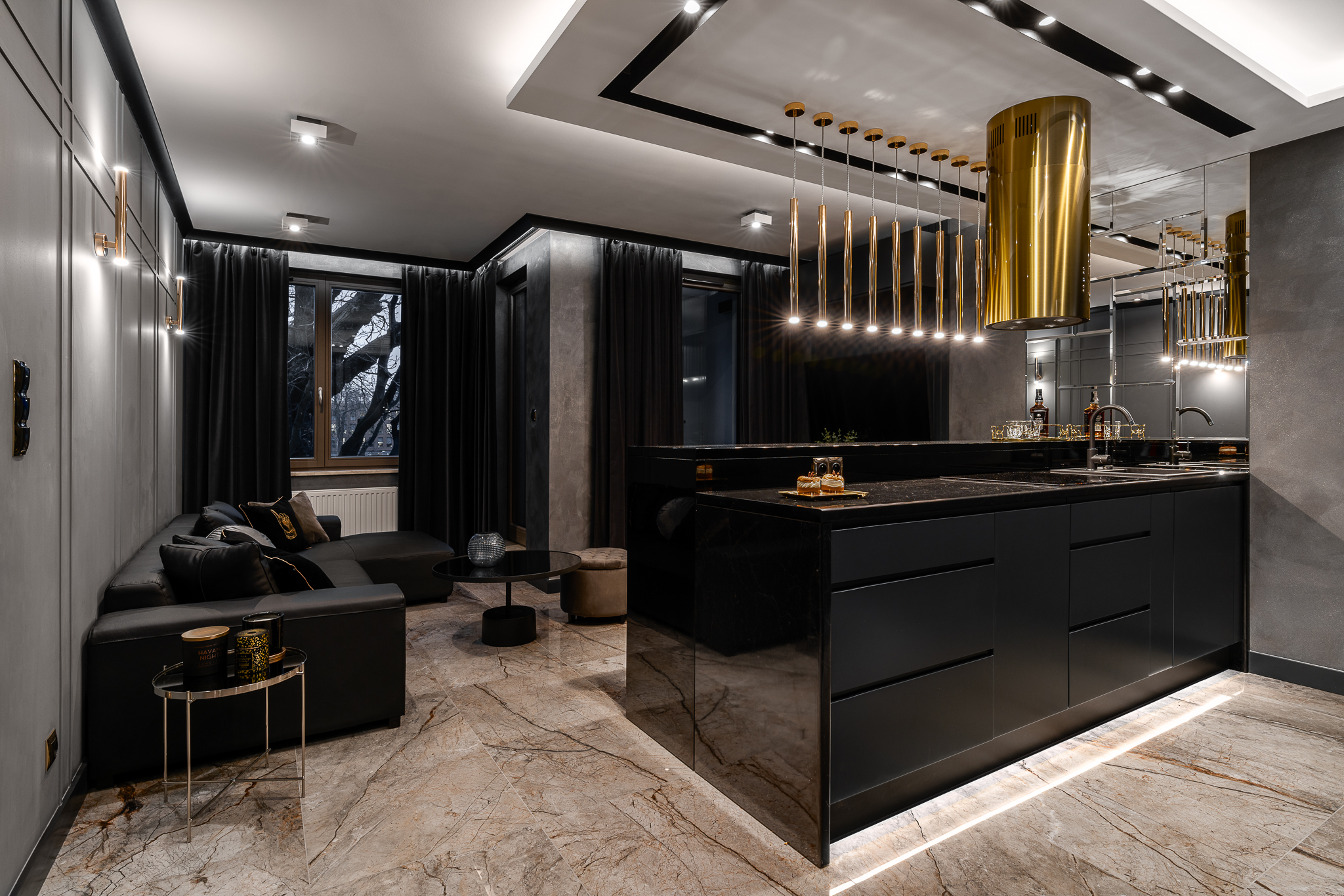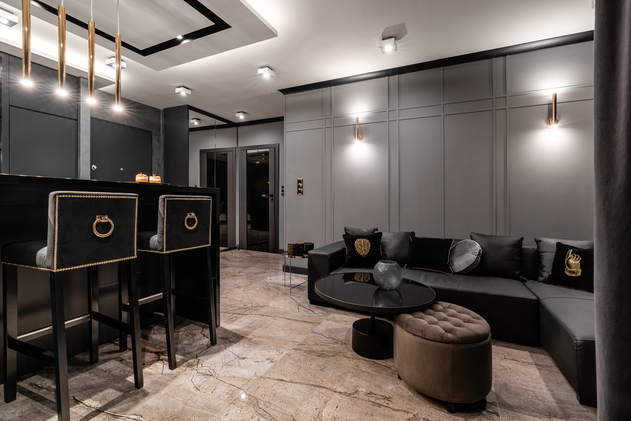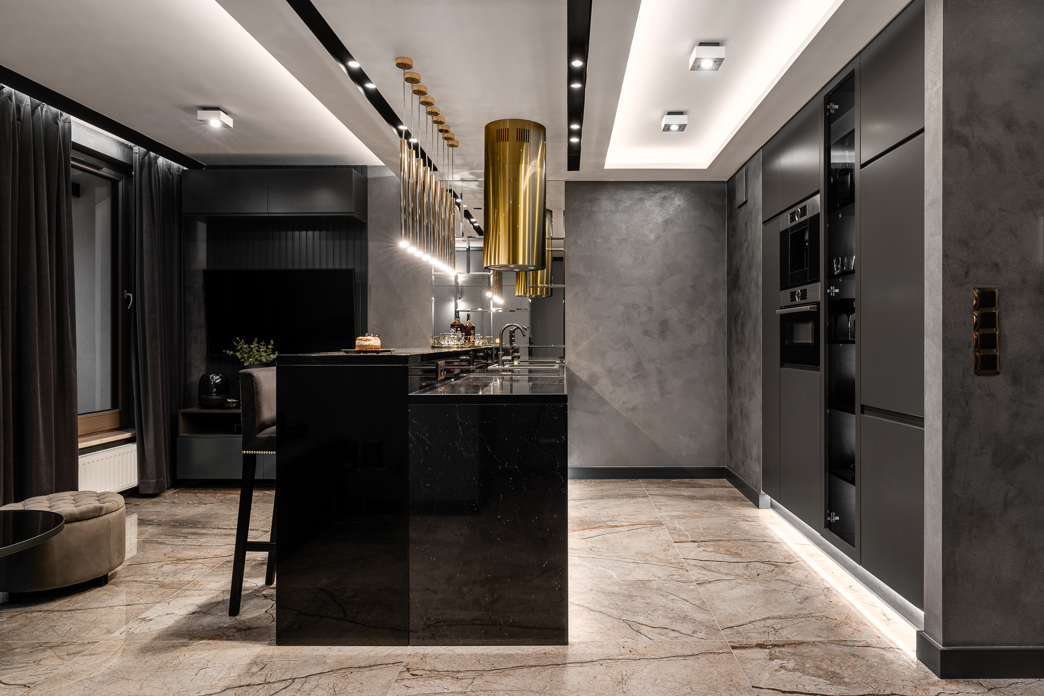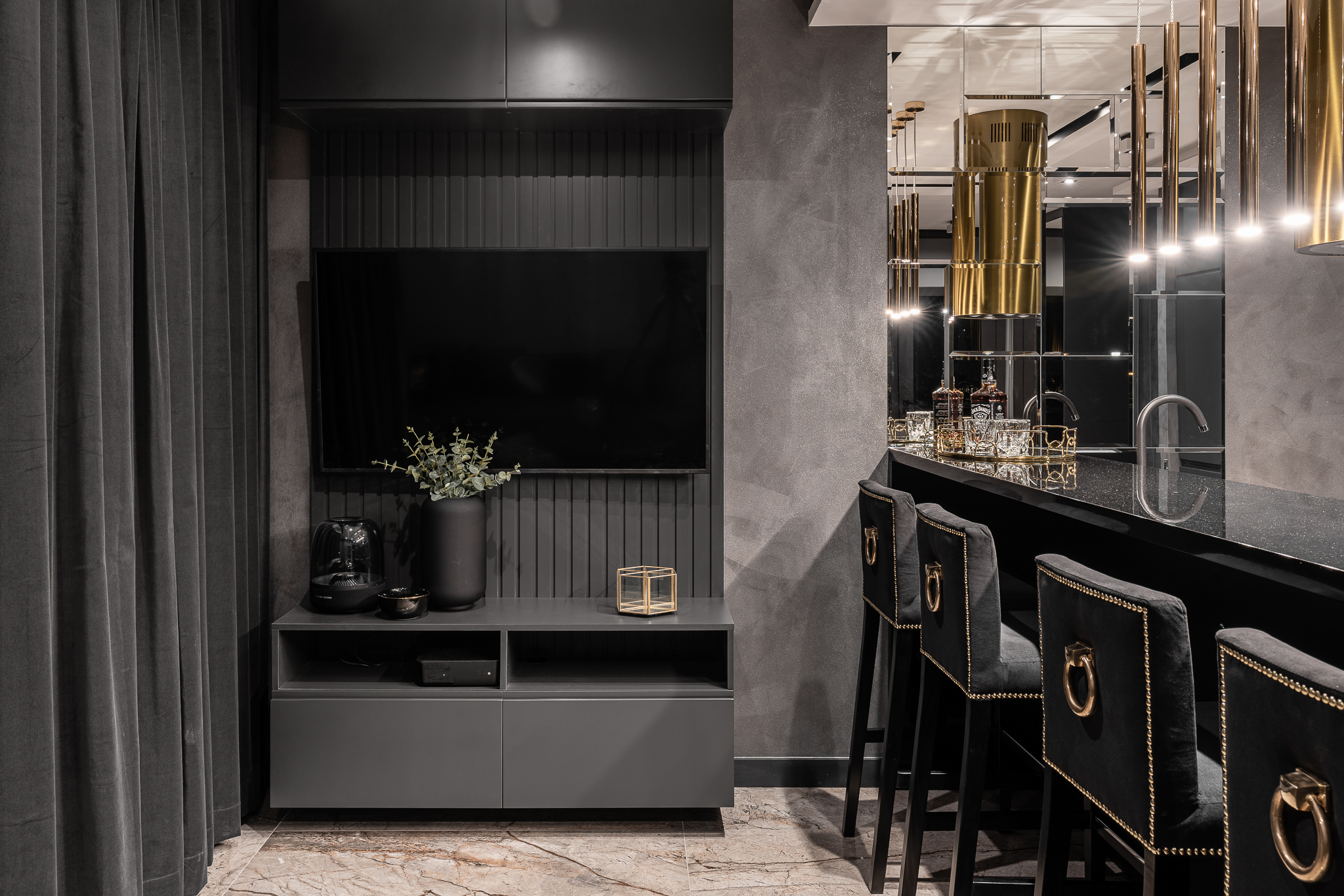 The apartment in Garnizon was supposed to give fun in atmosphere of mystery. The colour scheme from the very beginning was defined as black and gold. The client was delighted with the appearance of our office and insisted that his apartment "should be black". I made the project with pure pleasure, negotiating every shade of gray and lighter colors (e.g. stone, warmer floor) as well as white ceilings. The apartment in premium class was made in an ECONOMIC budget. We like