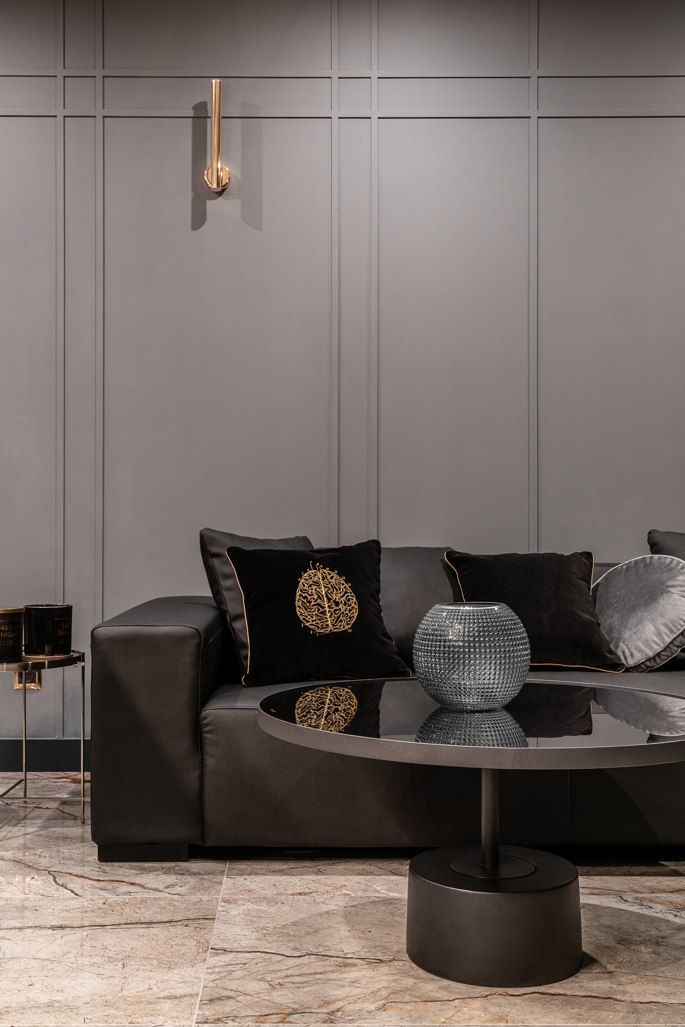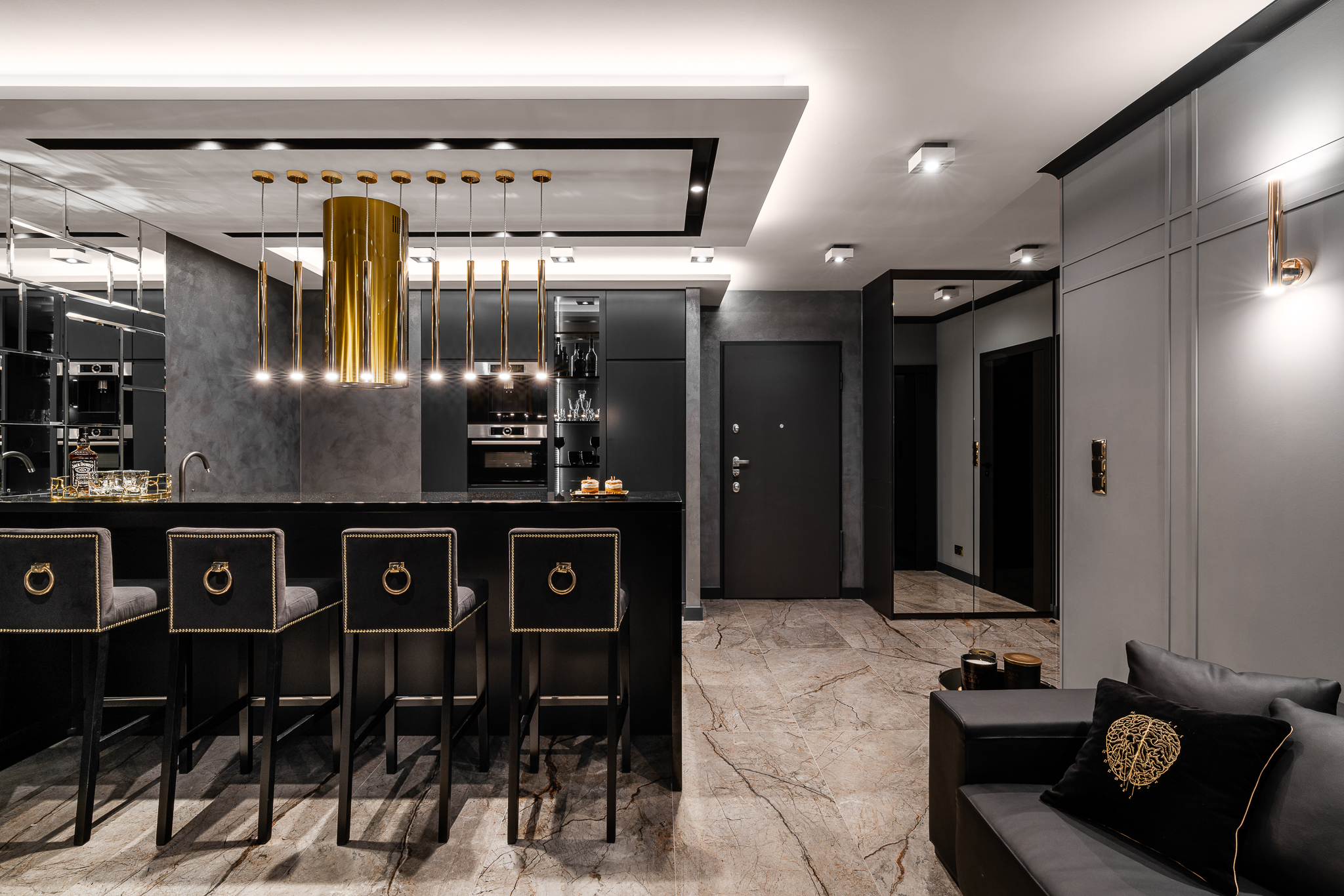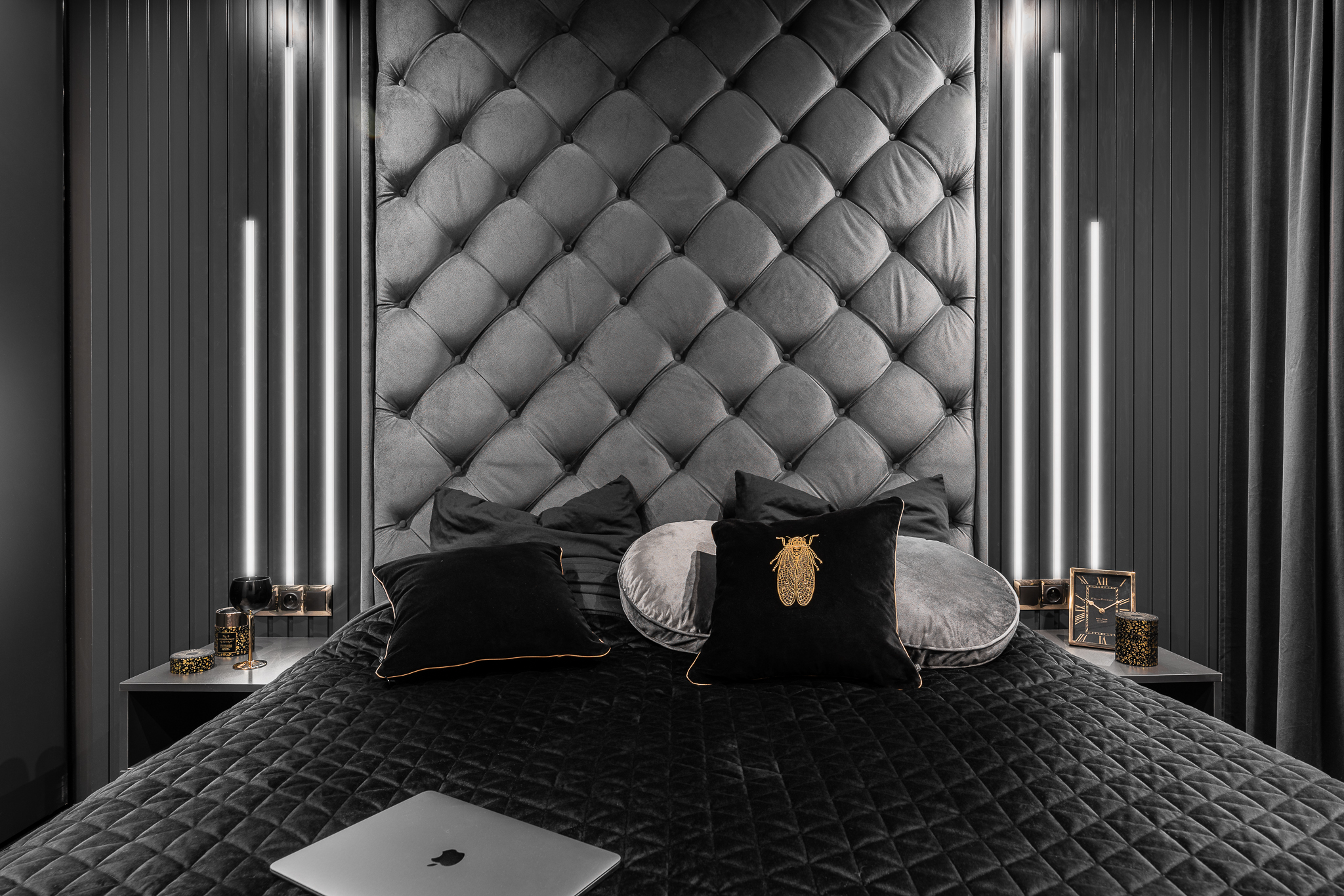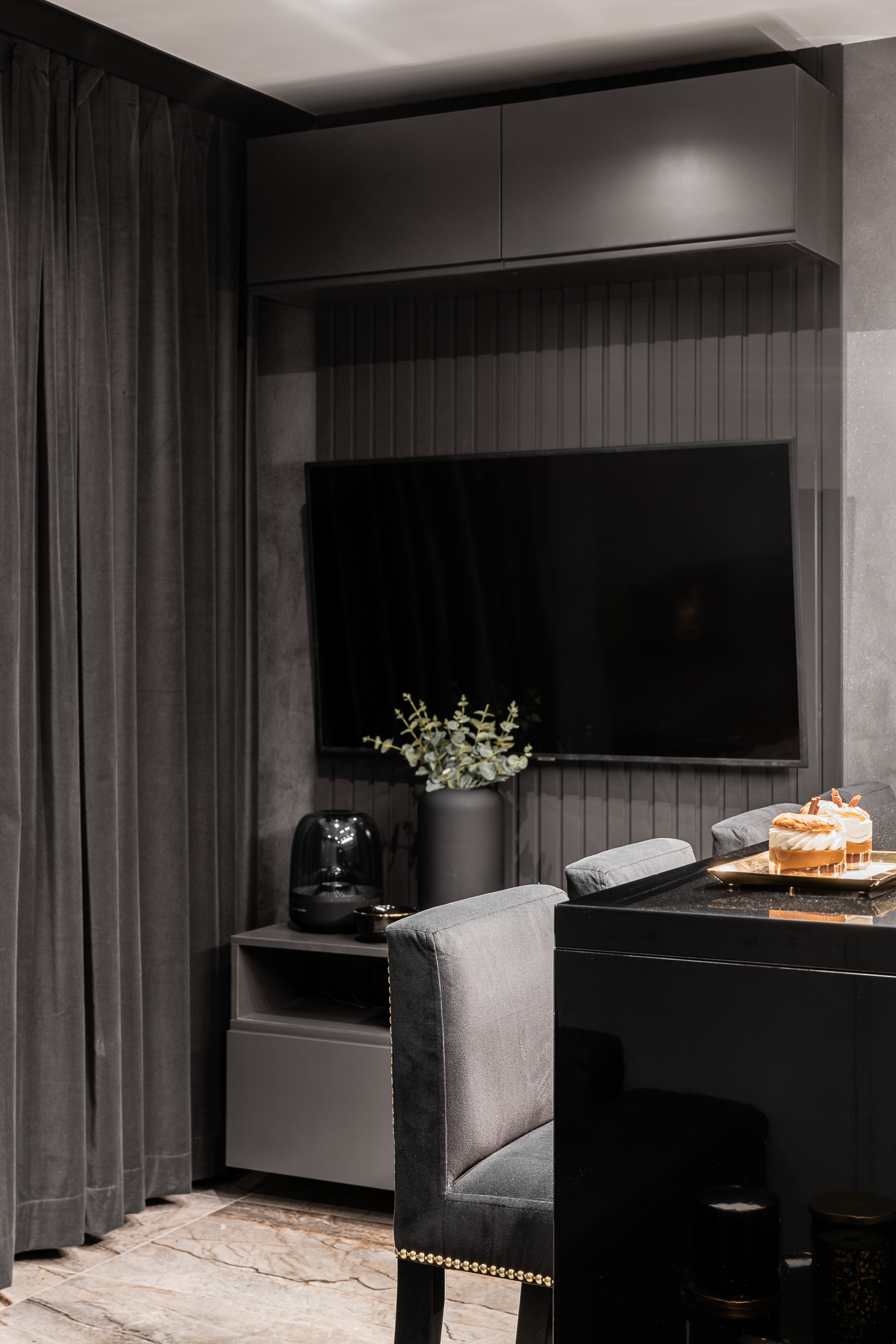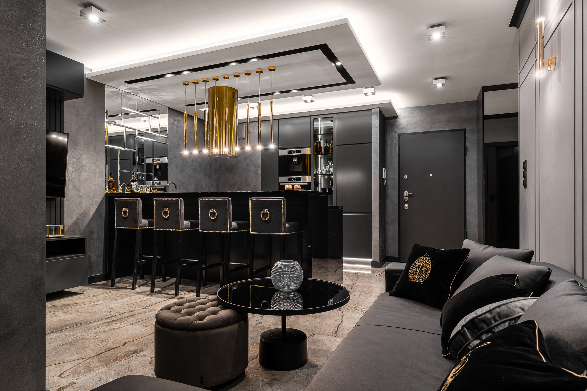 The apartment in Garnizon was supposed to give fun in atmosphere of mystery. The colour scheme from the very beginning was defined as black and gold. The client was delighted with the appearance of our office and insisted that his apartment "should be black". I made the project with pure pleasure, negotiating every shade of gray and lighter colors (e.g. stone, warmer floor) as well as white ceilings. The apartment in premium class was made in an ECONOMIC budget. We like