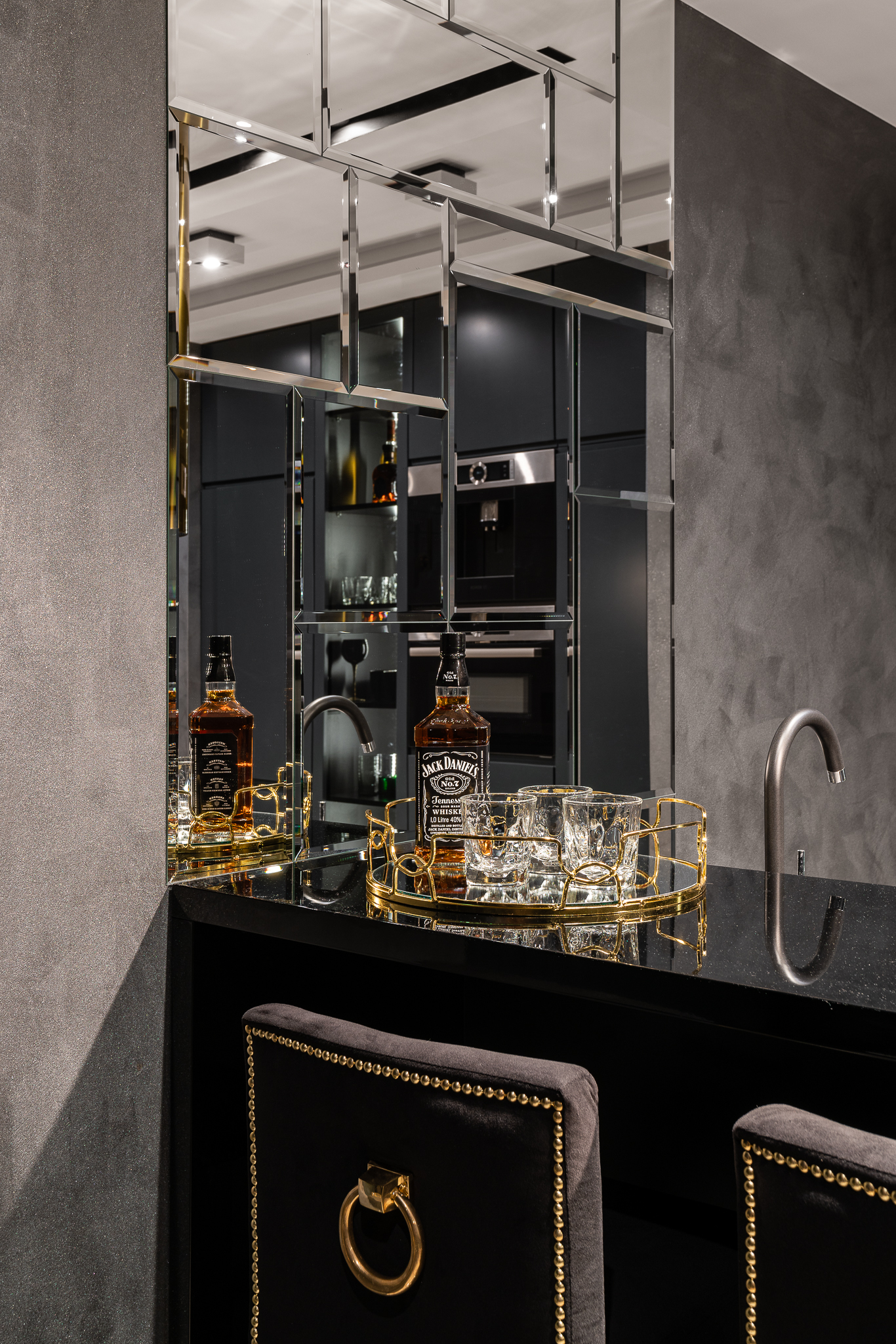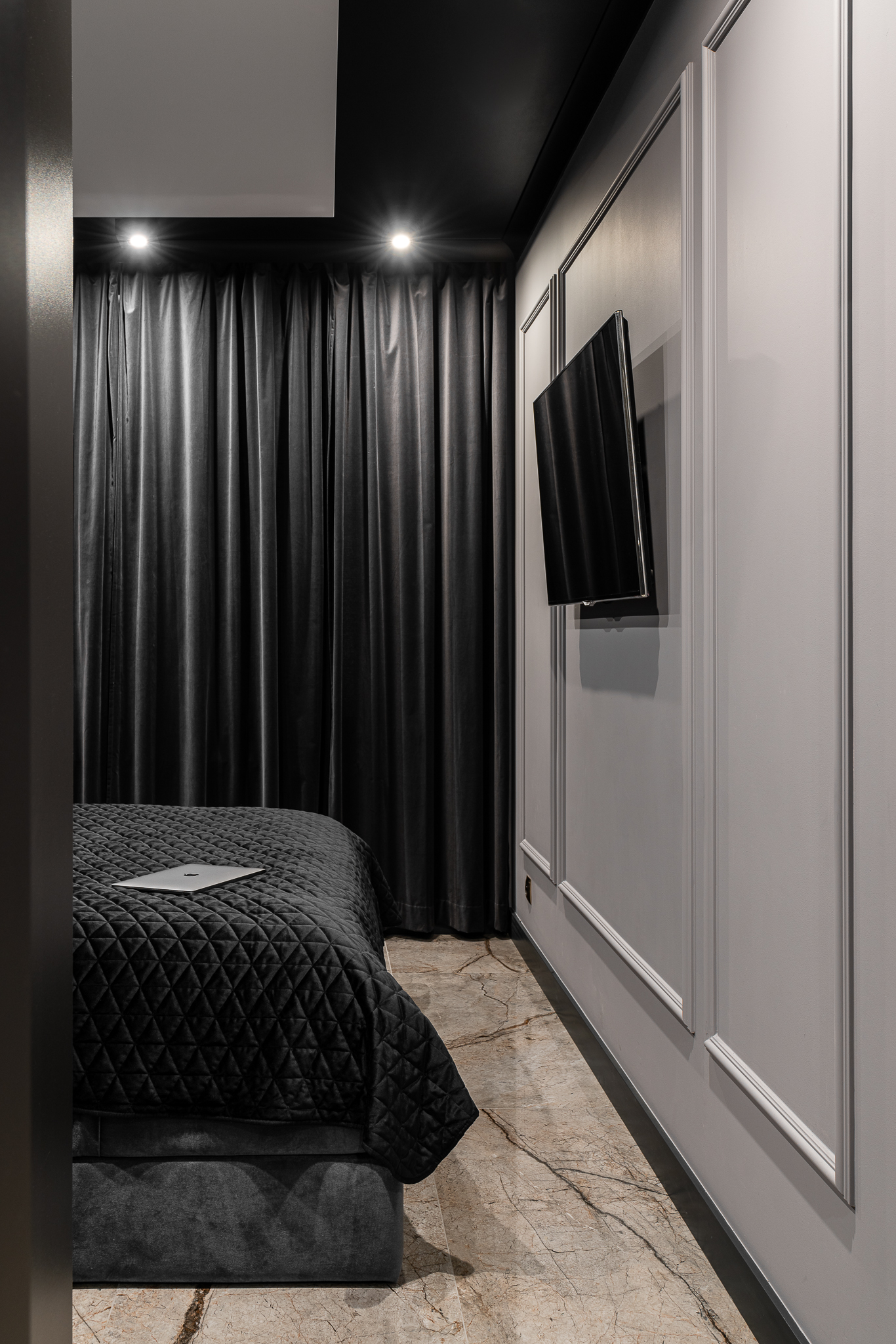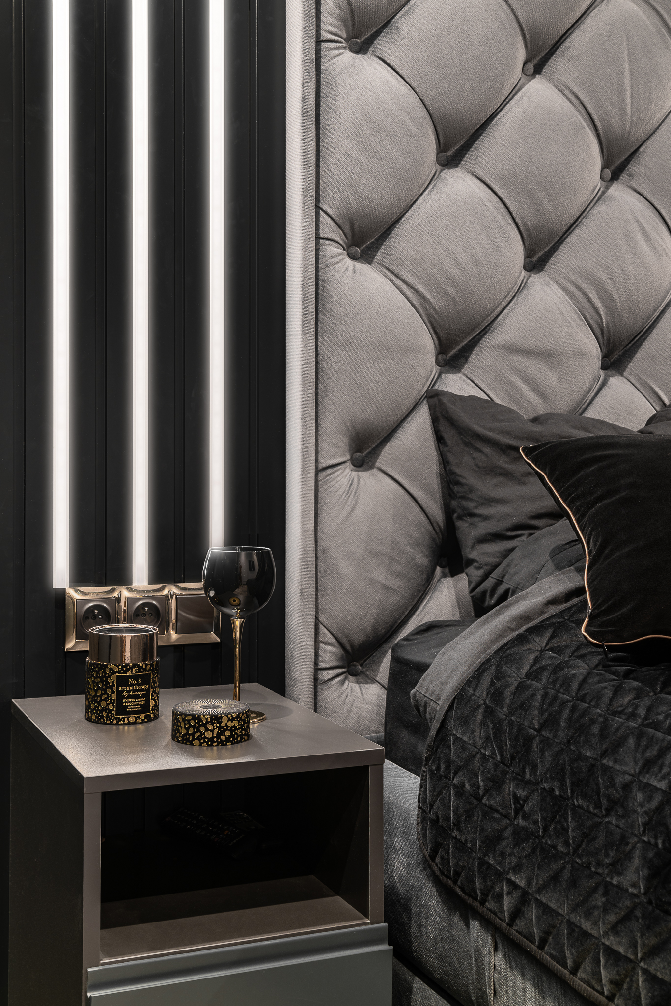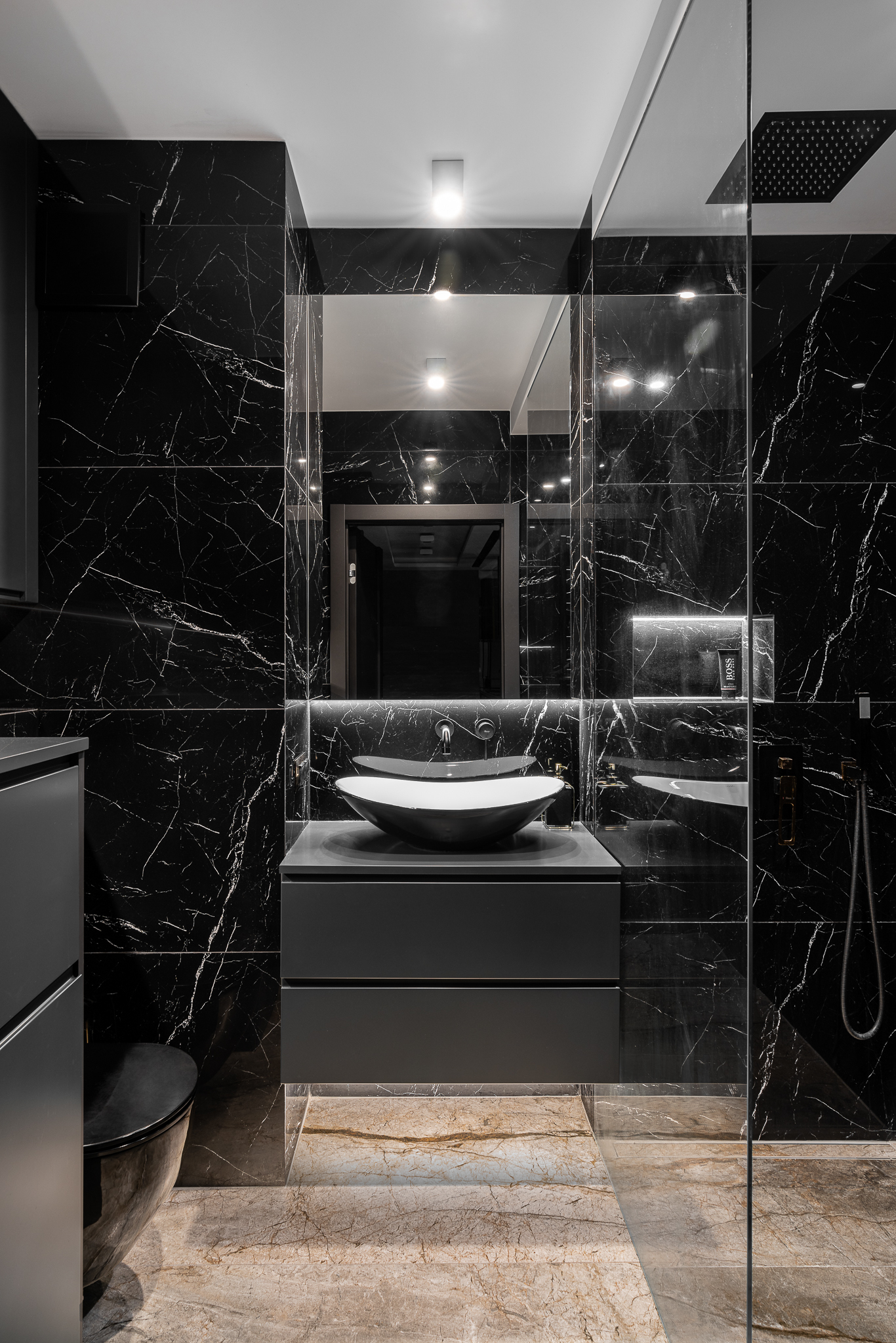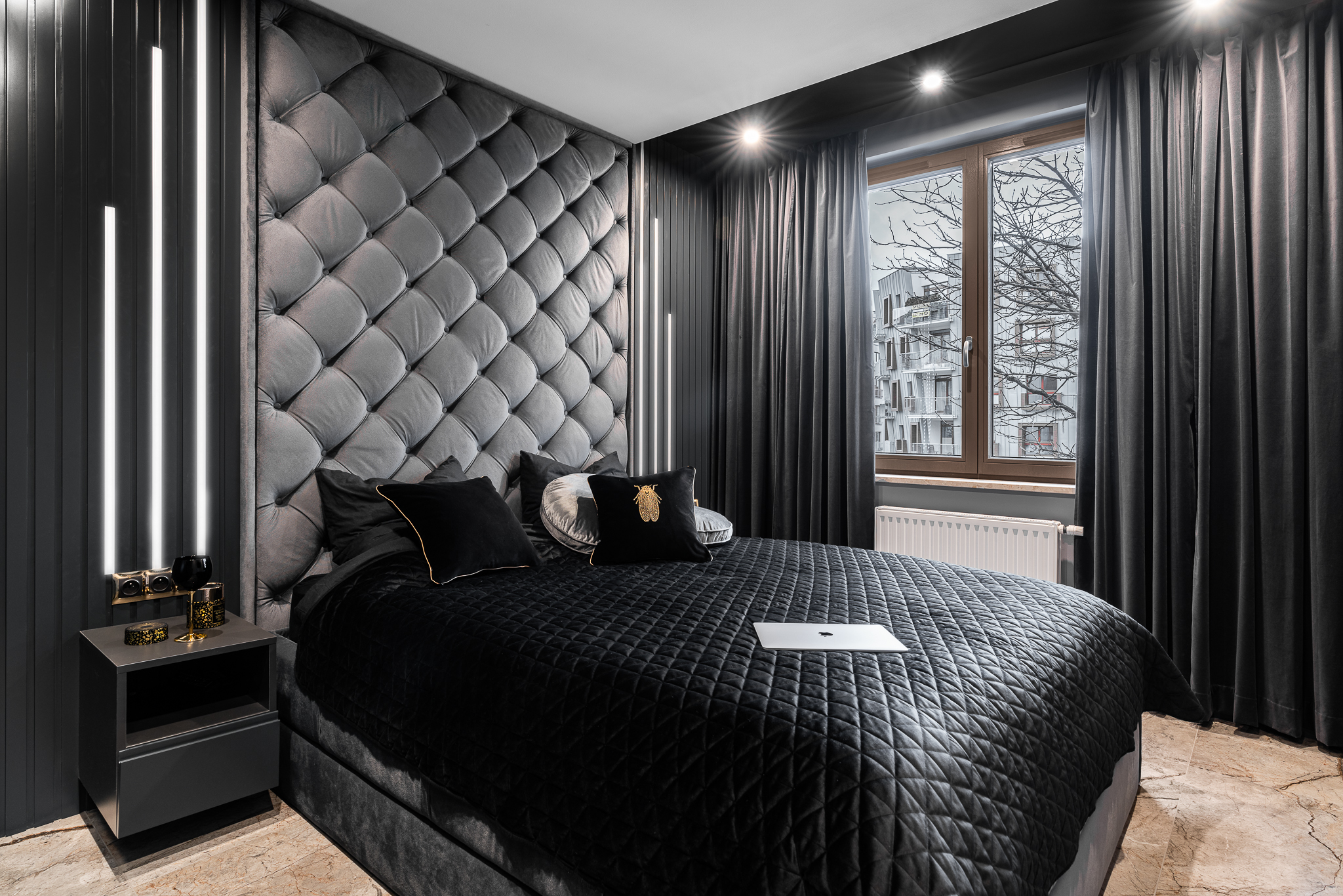 The apartment in Garnizon was supposed to give fun in atmosphere of mystery. The colour scheme from the very beginning was defined as black and gold. The client was delighted with the appearance of our office and insisted that his apartment "should be black". I made the project with pure pleasure, negotiating every shade of gray and lighter colors (e.g. stone, warmer floor) as well as white ceilings. The apartment in premium class was made in an ECONOMIC budget. We like
