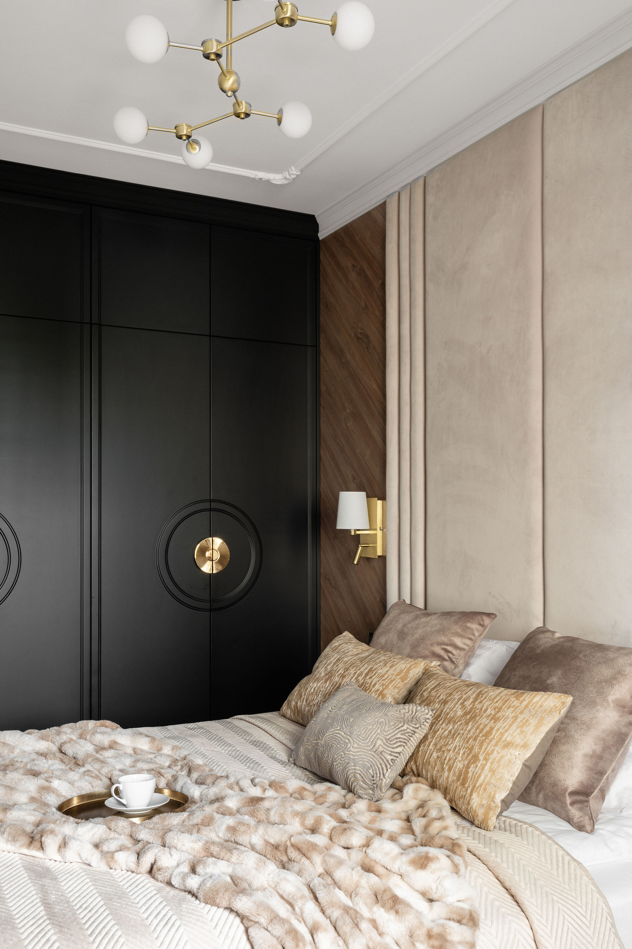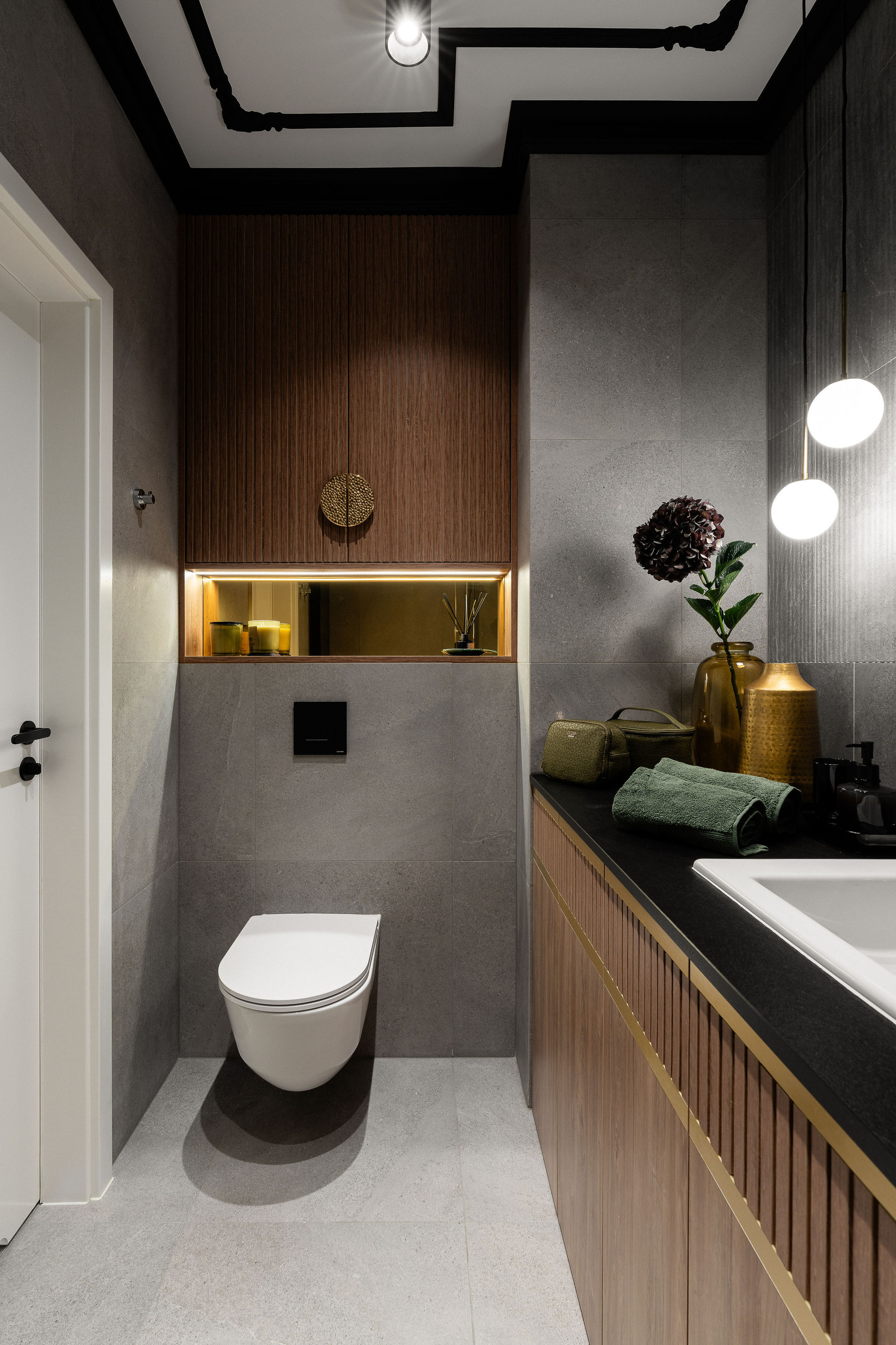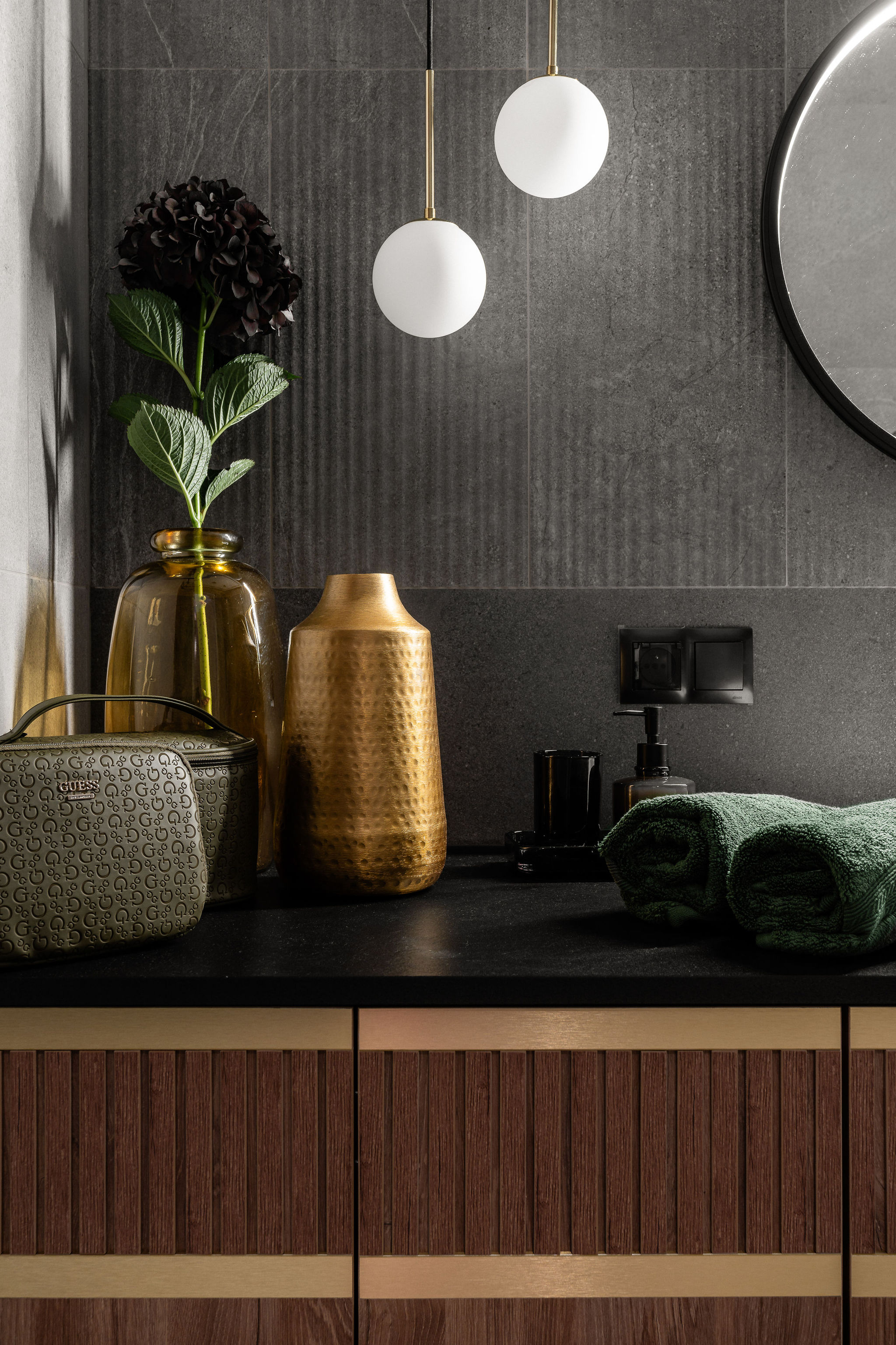 The kitchen and living room area are the heart of this apartment, distinguished by deep anthracite and red colors. The kitchen decorated in anthracite tones harmoniously matches the elegant sofa, creating a unique atmosphere. The rest of the apartment is decorated in warm shades of walnut wood, which adds coziness and a unique character to each room.