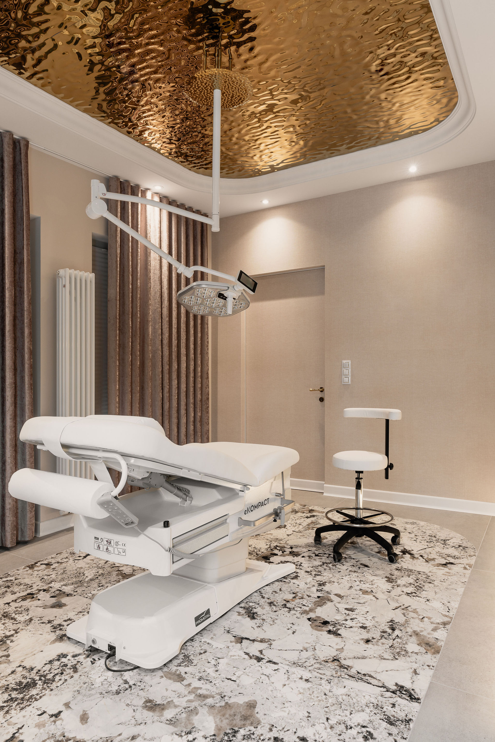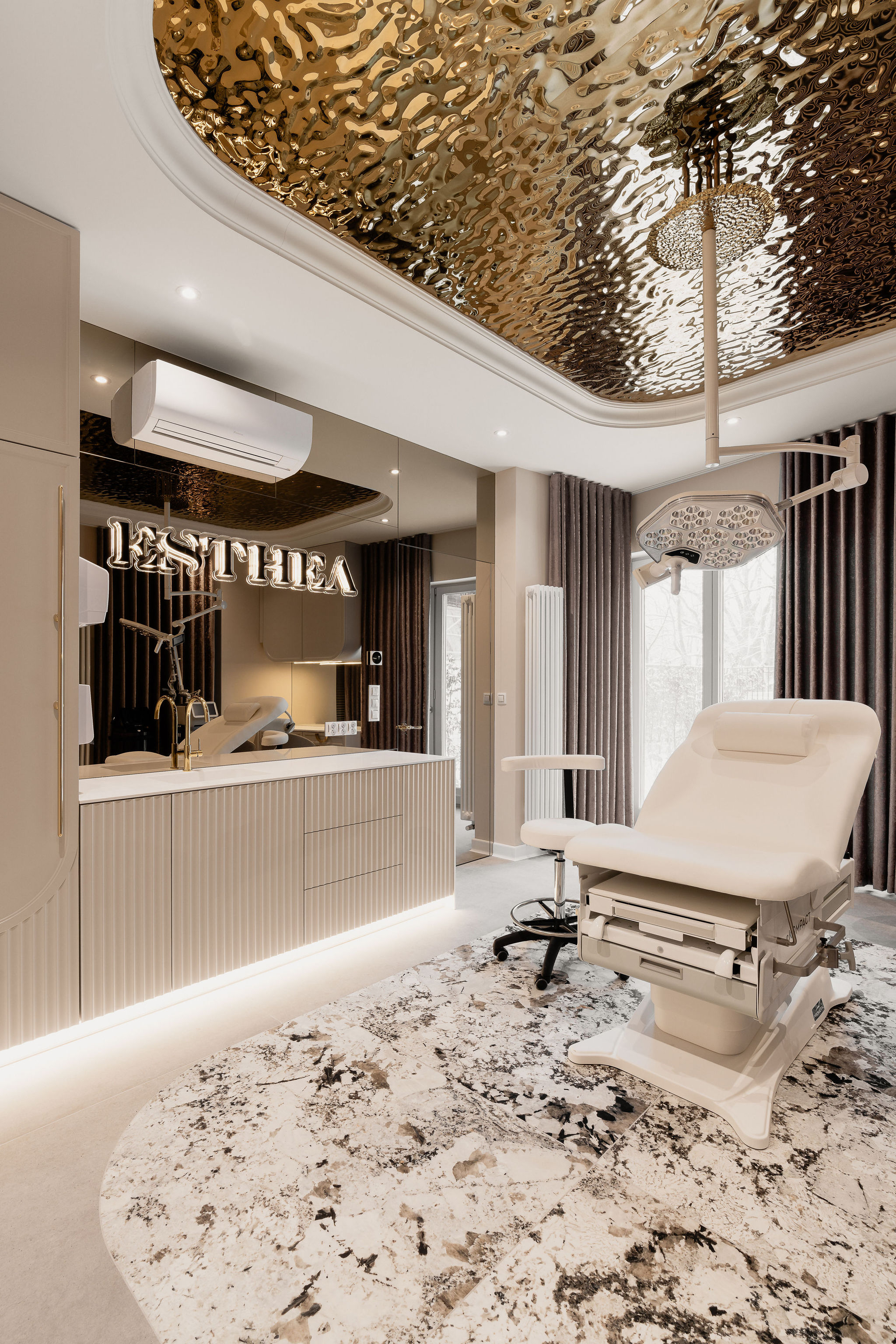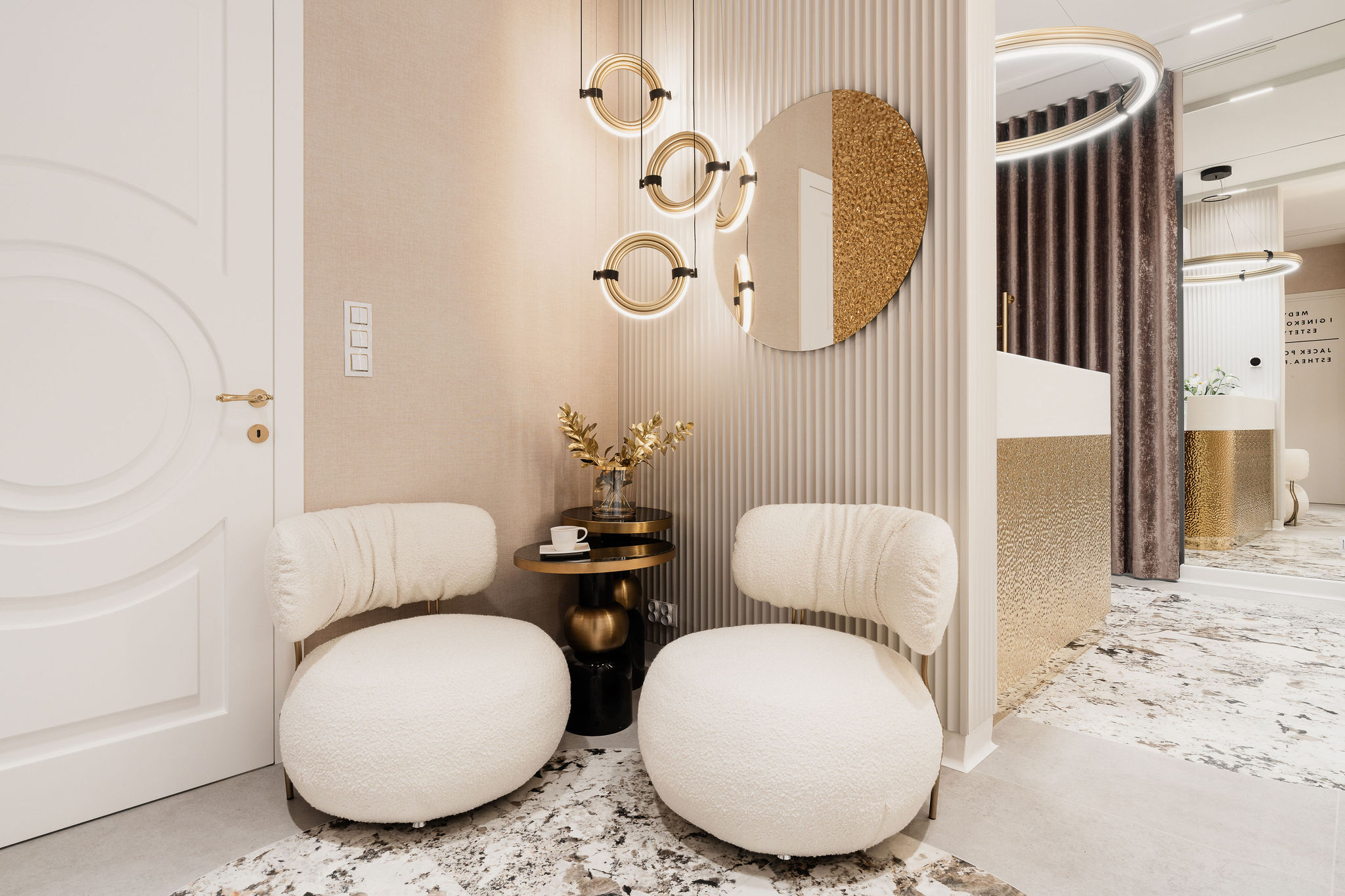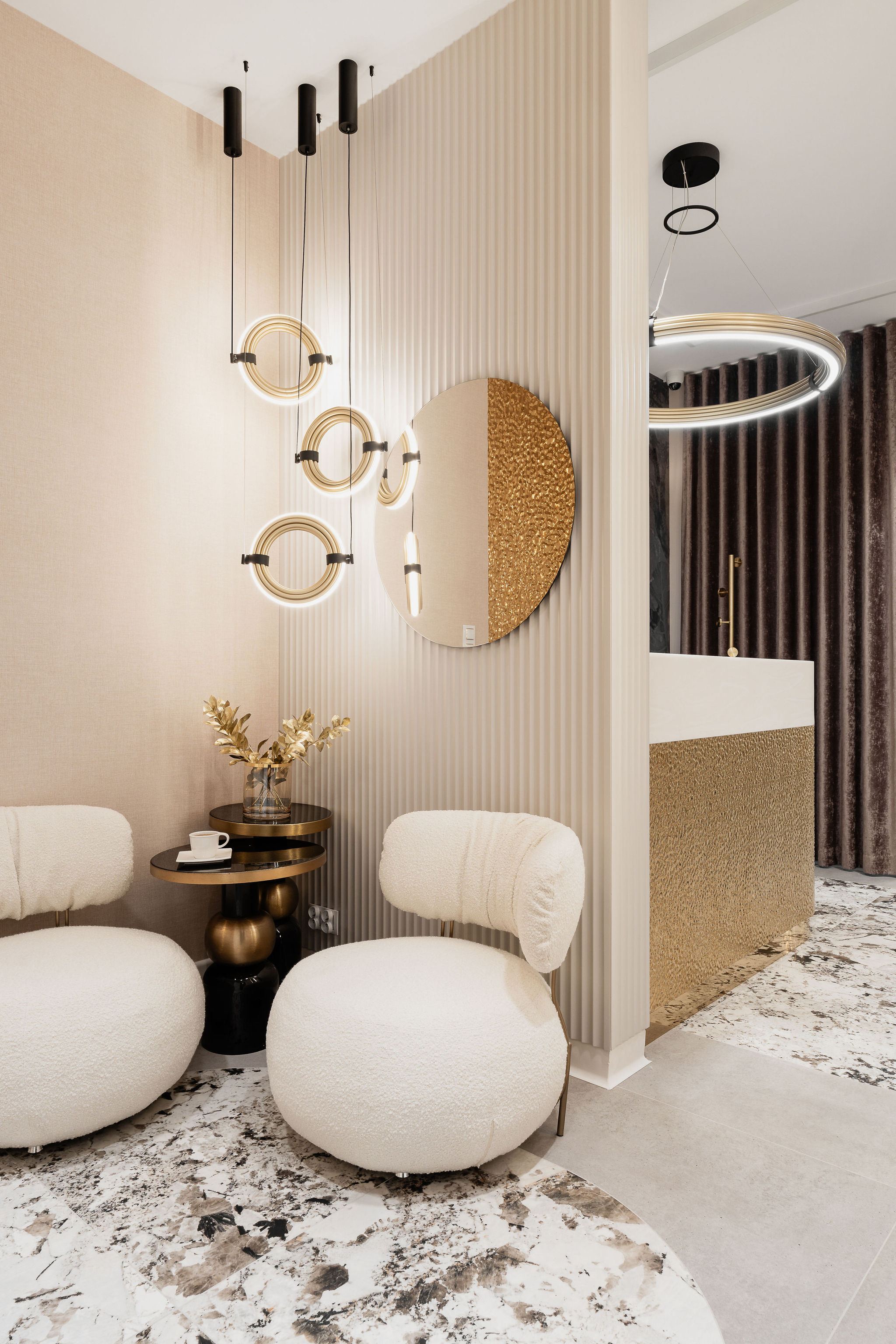 We try to ensure that our projects do not differ from the vision, and are always finally - PERFECT. And this is how the most luxurious, one-office clinic of Dr.Jacek Porada was created. It is located in a fashionable location - Perfumiarnia at Park Wilsona, Poznań. We knew from the very beginning that we wanted to create something unique - we started this process by selecting stoneware and ordering the floor tiles - to be cut into round, egg-shaped forms. We have 3 such a floorforms in this medical facility. In the main office, we transferred the shape of the floor to the suspended ceiling, finished with gold filling from Jelly design - the bent sheet metal with spectacular waves is impressive. Within the facility there is a reception, waiting room, office, relaxation room for the patient, bathroom and "dirty room" (the most luxurious dirty room in Poland). It's hard for me to count the number of mirror walls, but the most interesting of them is the wall covered with a brown mirror in the office. The rest remains silver so that the client can admire the effects at every point of our medical facility. A visit here is definitely an unforgettable experience!