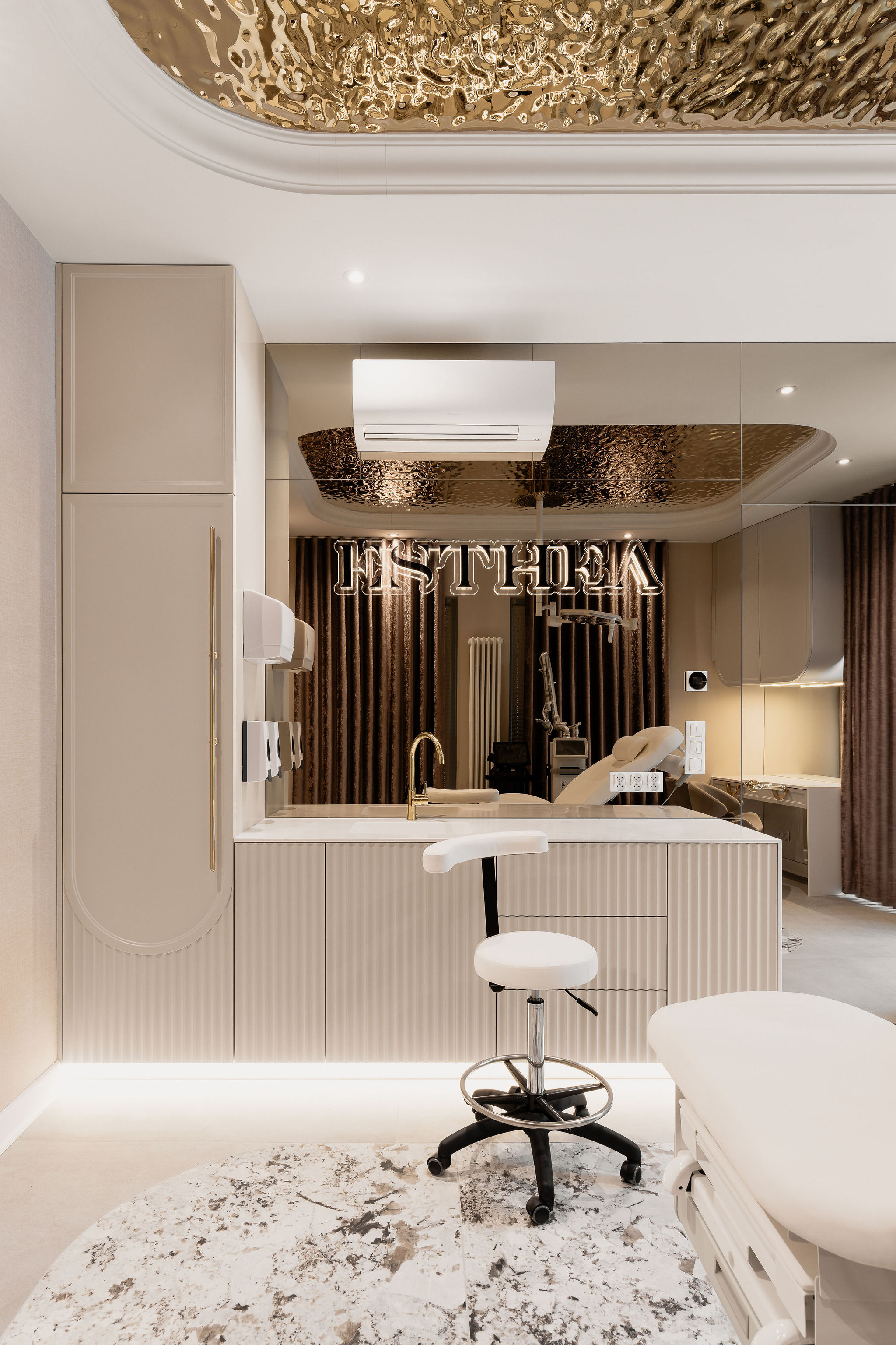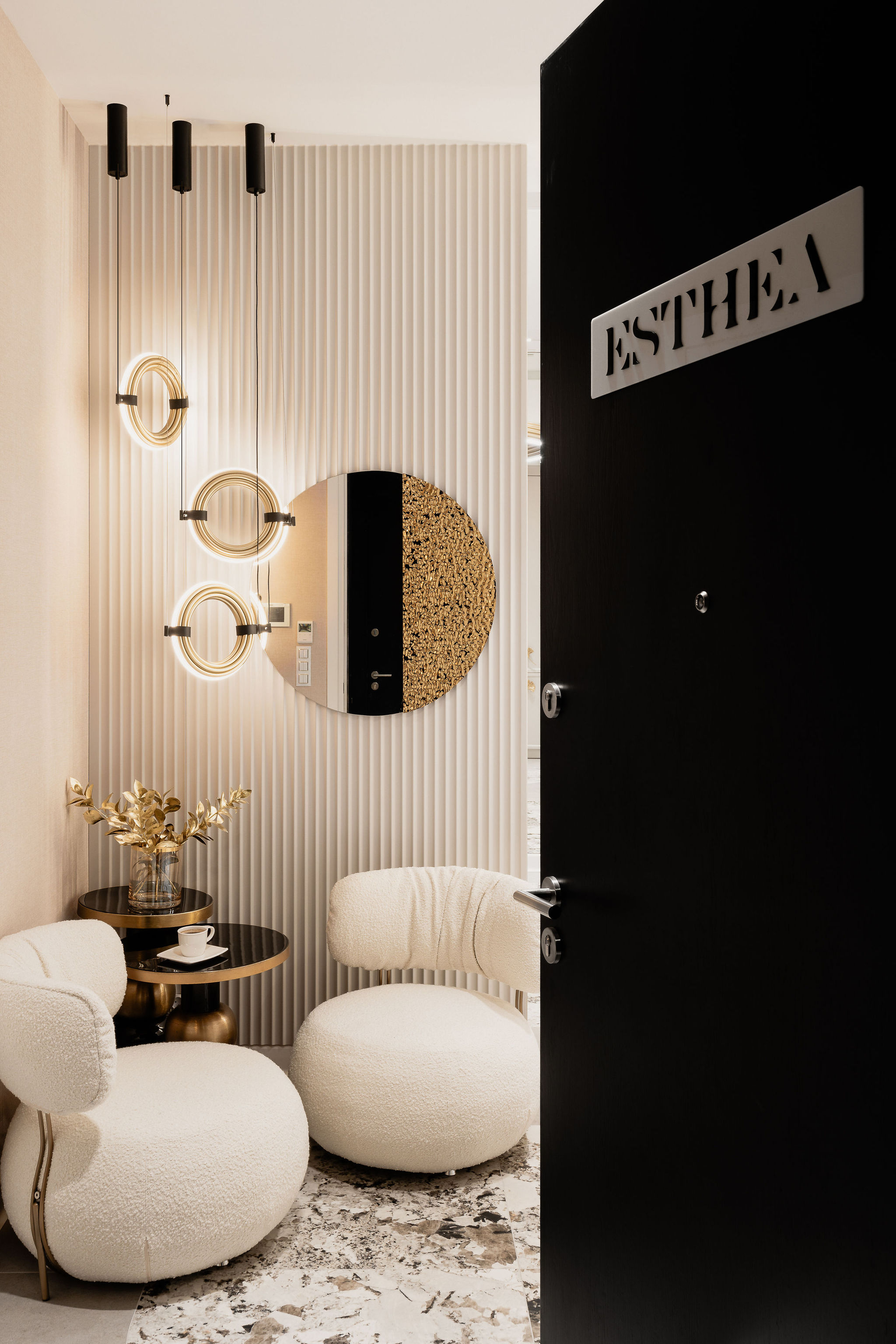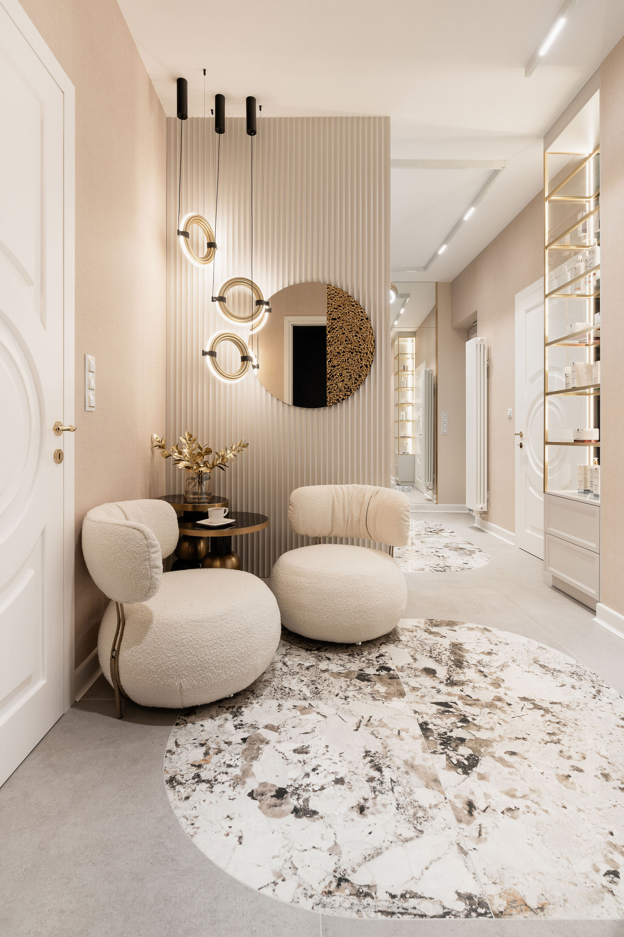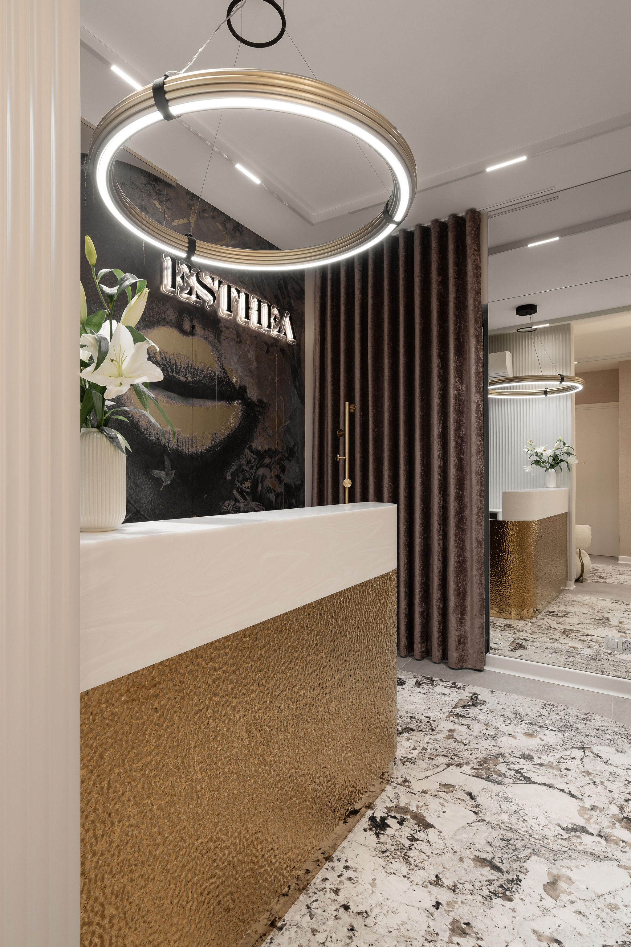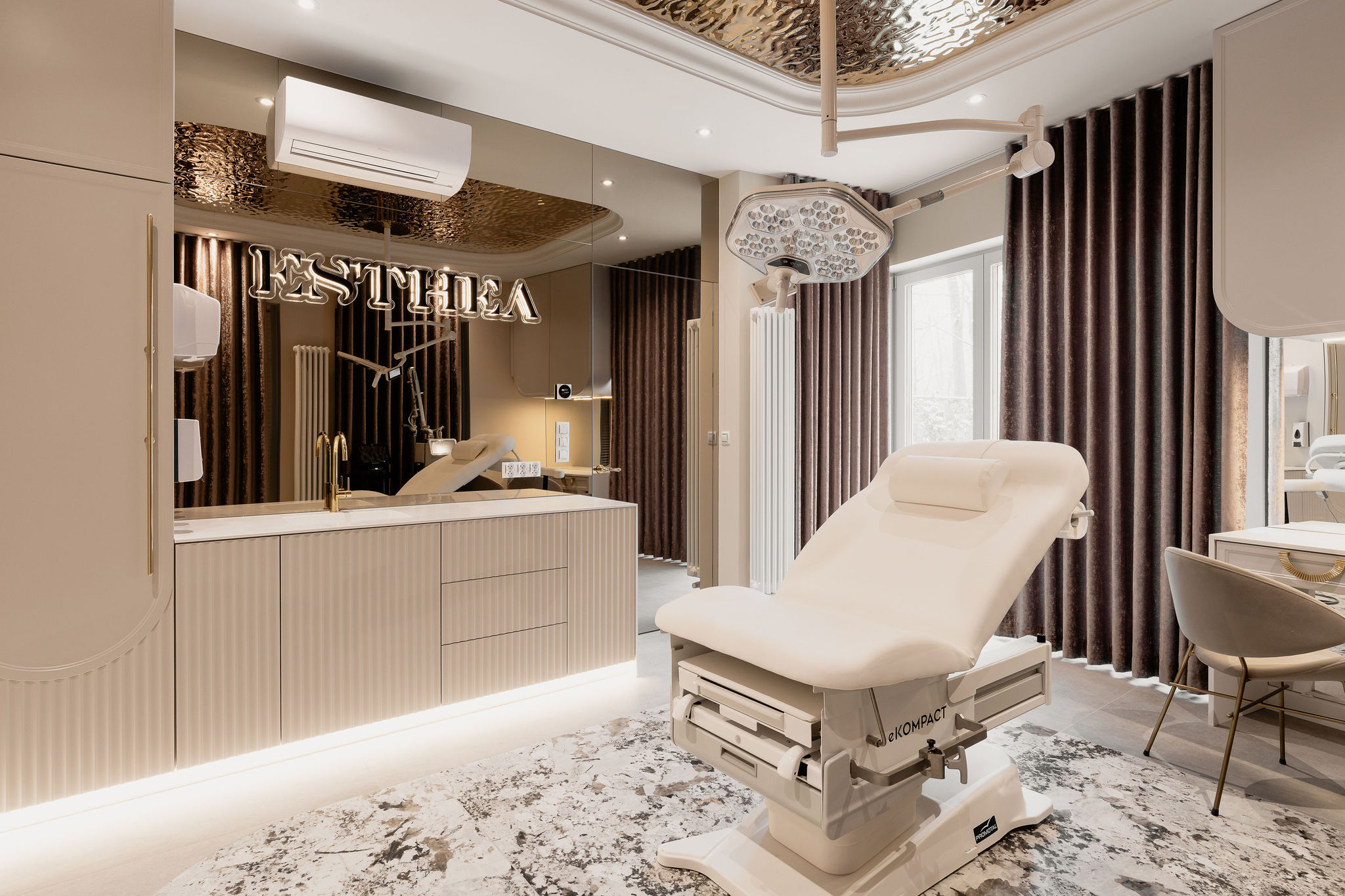 We try to ensure that our projects do not differ from the vision, and are always finally - PERFECT. And this is how the most luxurious, one-office clinic of Dr.Jacek Porada was created. It is located in a fashionable location - Perfumiarnia at Park Wilsona, Poznań. We knew from the very beginning that we wanted to create something unique - we started this process by selecting stoneware and ordering the floor tiles - to be cut into round, egg-shaped forms. We have 3 such a floorforms in this medical facility. In the main office, we transferred the shape of the floor to the suspended ceiling, finished with gold filling from Jelly design - the bent sheet metal with spectacular waves is impressive. Within the facility there is a reception, waiting room, office, relaxation room for the patient, bathroom and "dirty room" (the most luxurious dirty room in Poland). It's hard for me to count the number of mirror walls, but the most interesting of them is the wall covered with a brown mirror in the office. The rest remains silver so that the client can admire the effects at every point of our medical facility. A visit here is definitely an unforgettable experience!