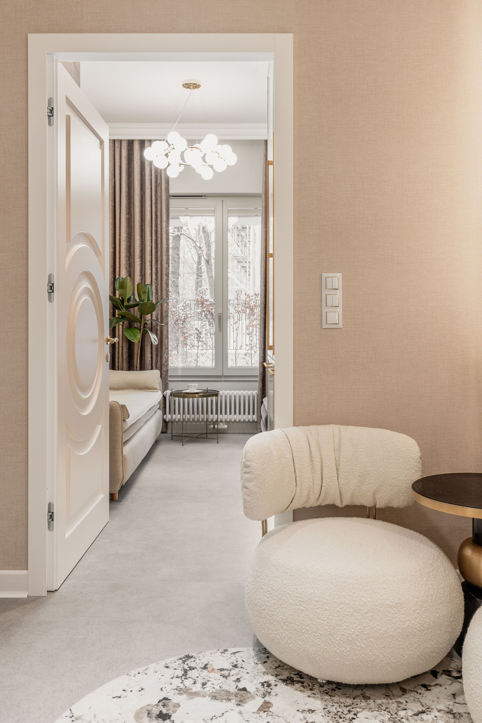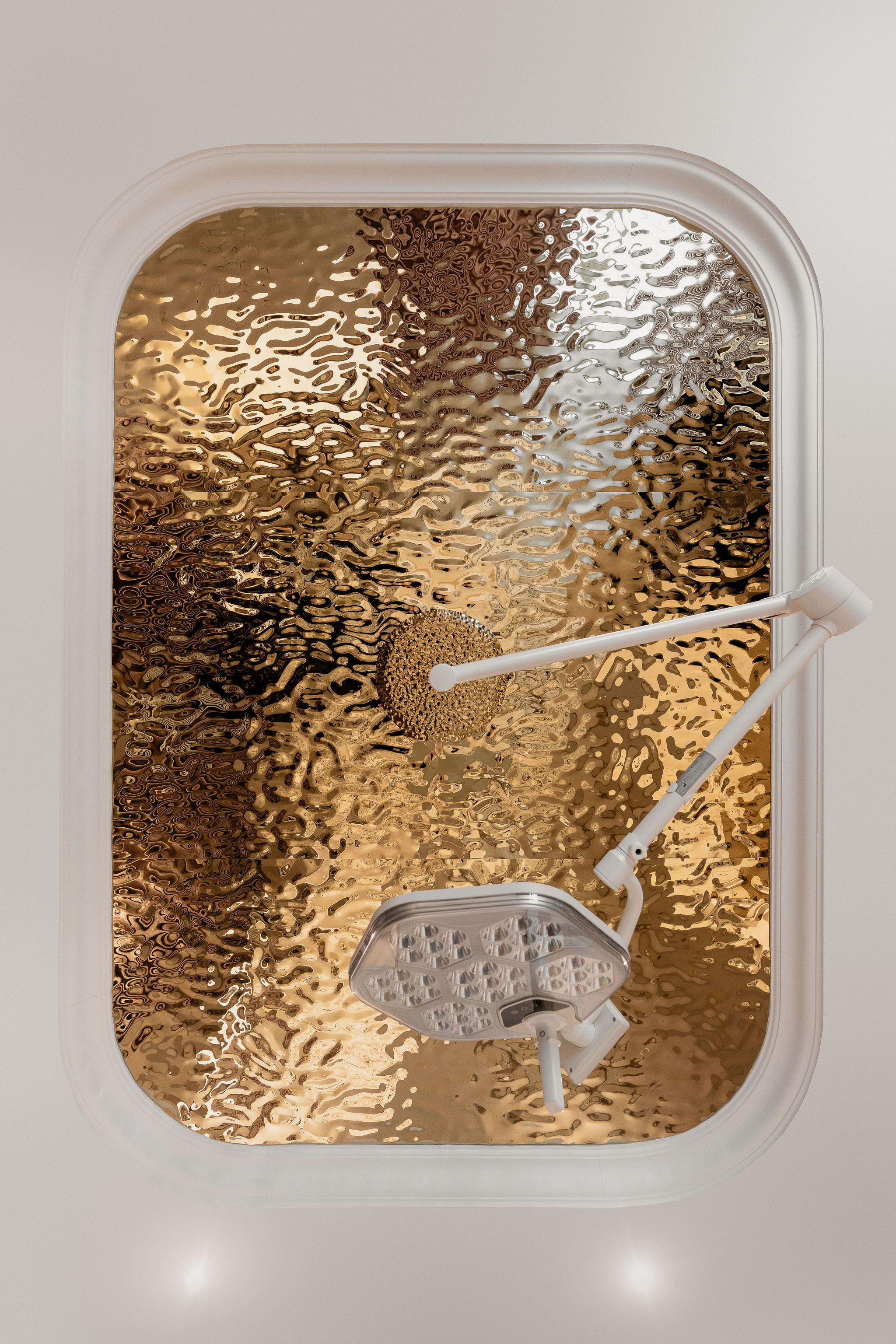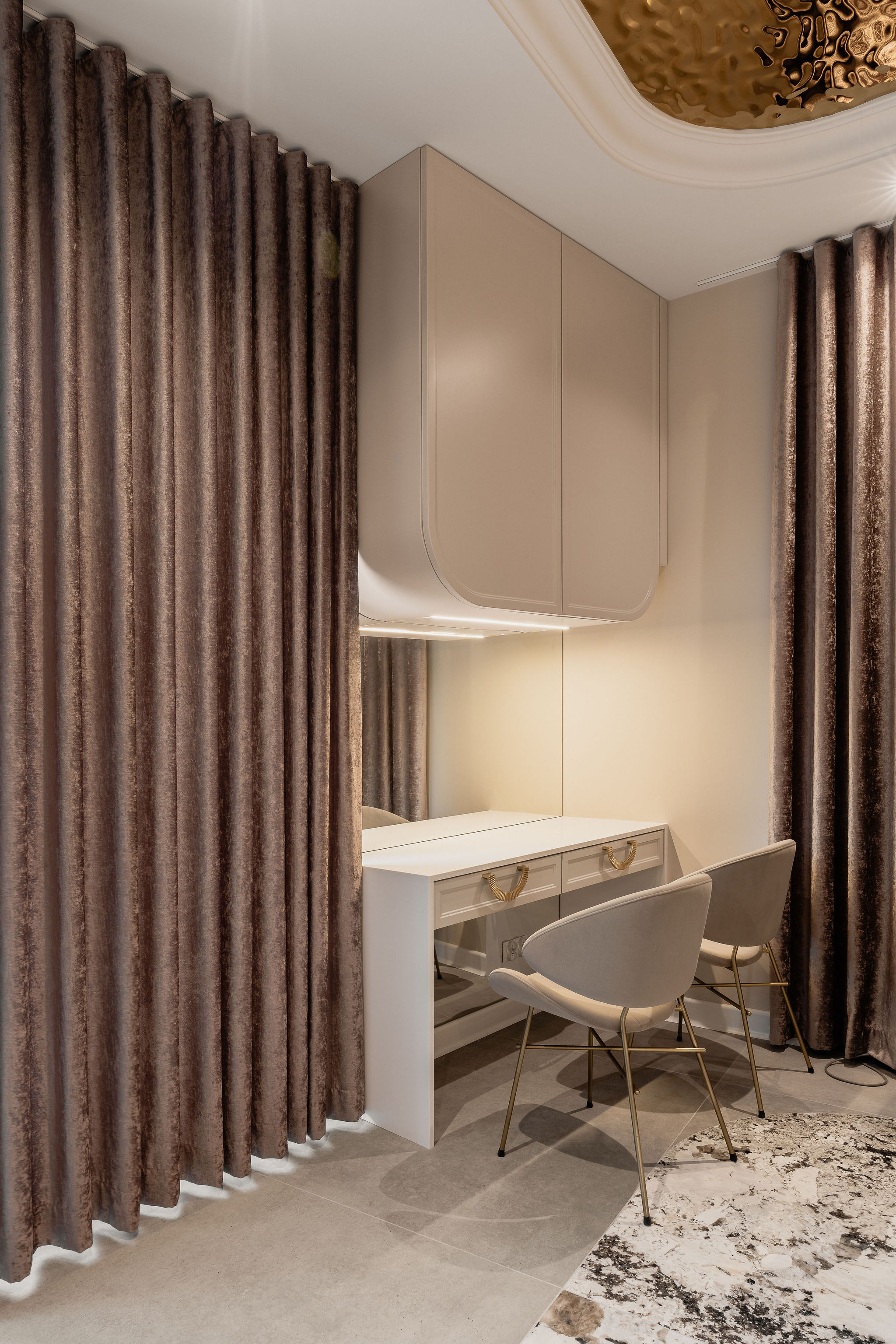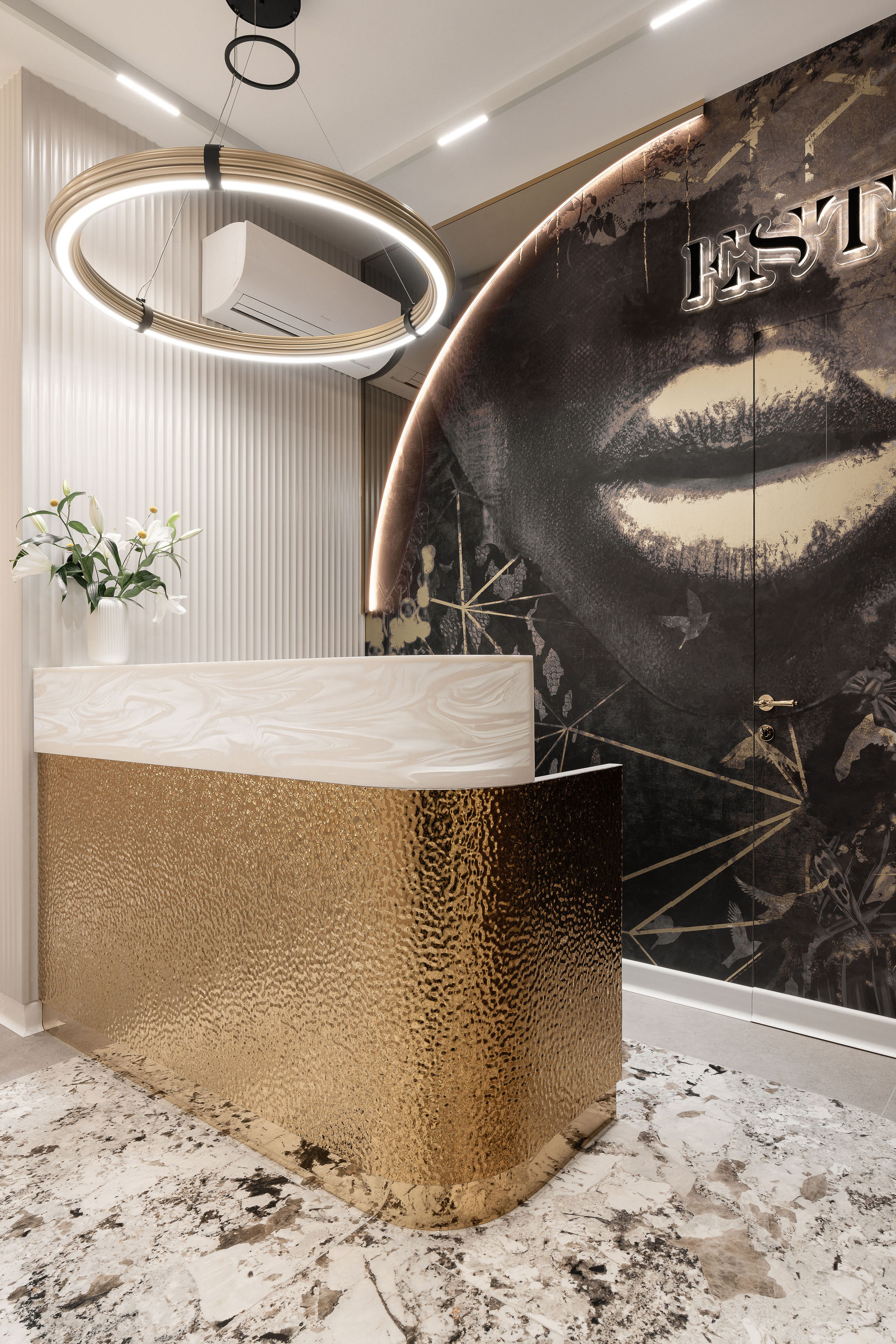 We try to ensure that our projects do not differ from the vision, and are always finally - PERFECT. And this is how the most luxurious, one-office clinic of Dr.Jacek Porada was created. It is located in a fashionable location - Perfumiarnia at Park Wilsona, Poznań. We knew from the very beginning that we wanted to create something unique - we started this process by selecting stoneware and ordering the floor tiles - to be cut into round, egg-shaped forms. We have 3 such a floorforms in this medical facility. In the main office, we transferred the shape of the floor to the suspended ceiling, finished with gold filling from Jelly design - the bent sheet metal with spectacular waves is impressive. Within the facility there is a reception, waiting room, office, relaxation room for the patient, bathroom and "dirty room" (the most luxurious dirty room in Poland). It's hard for me to count the number of mirror walls, but the most interesting of them is the wall covered with a brown mirror in the office. The rest remains silver so that the client can admire the effects at every point of our medical facility. A visit here is definitely an unforgettable experience!
