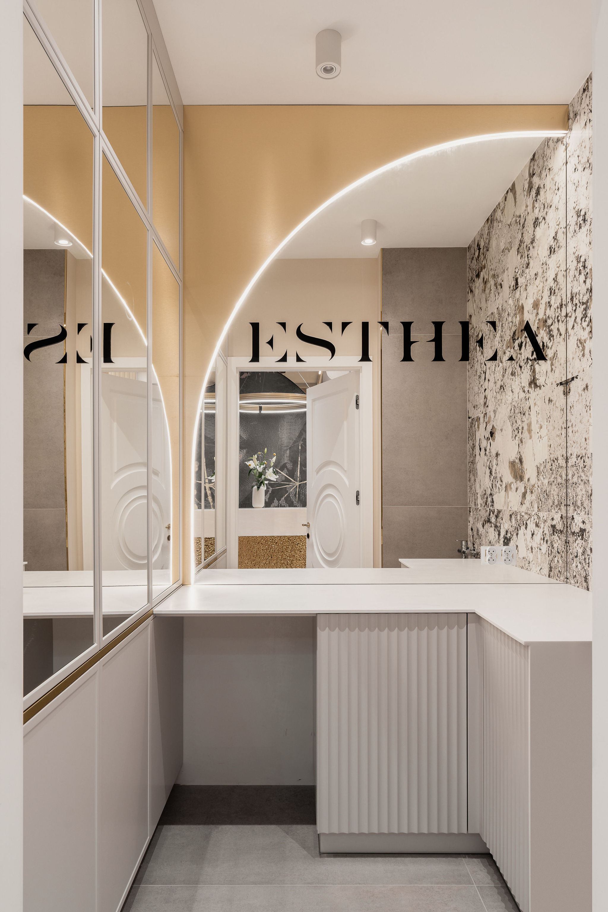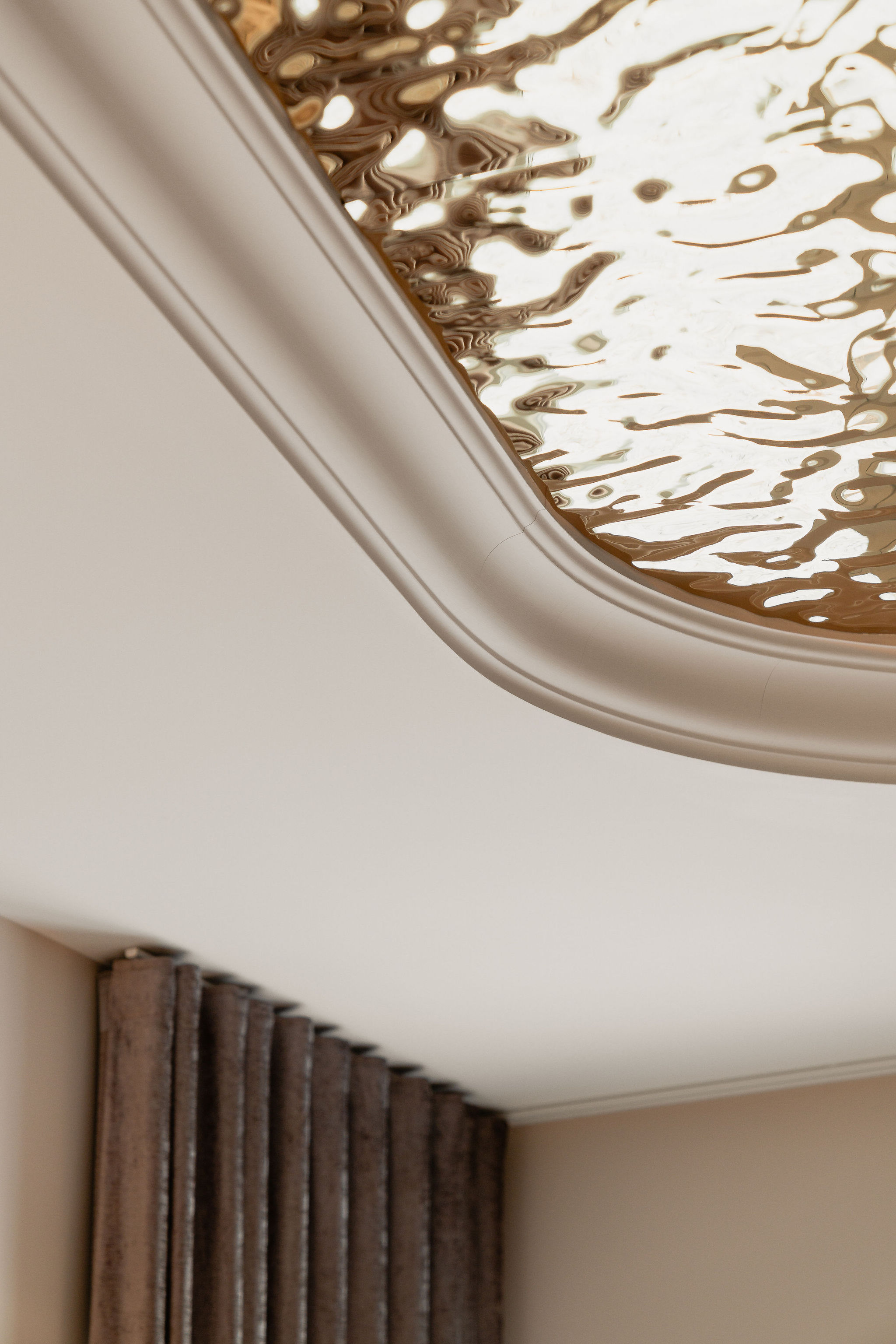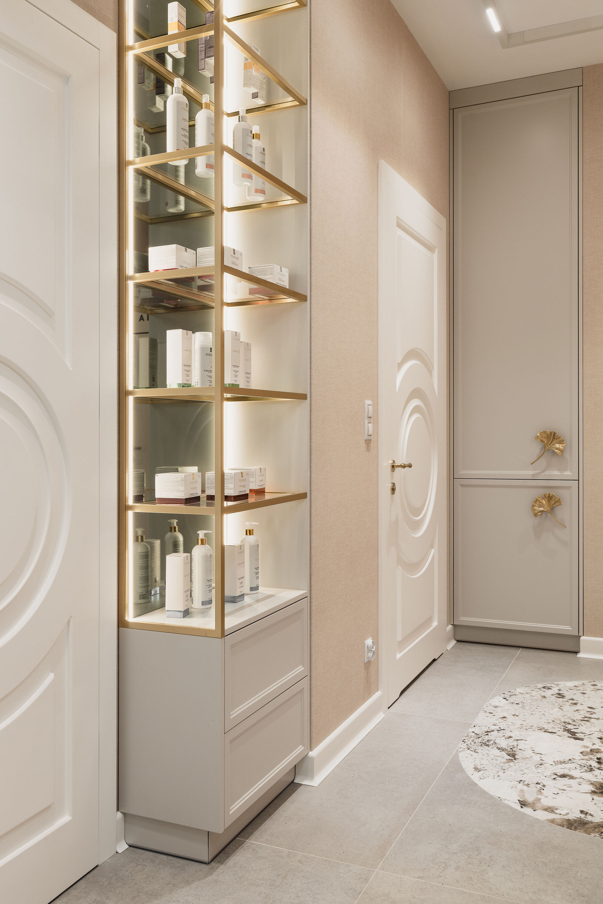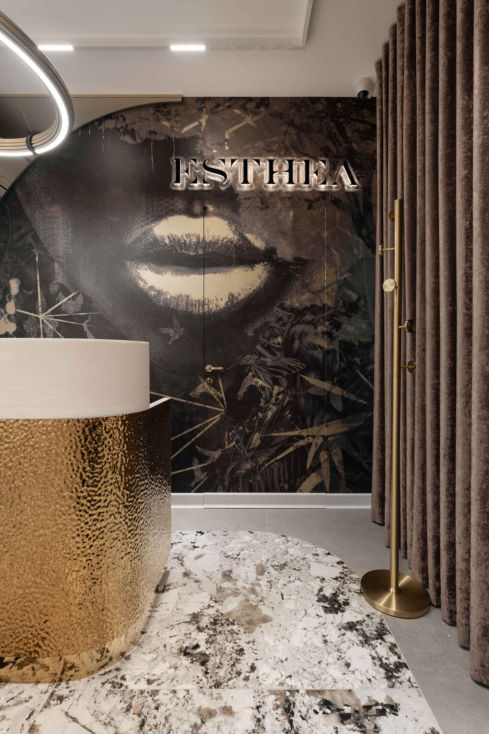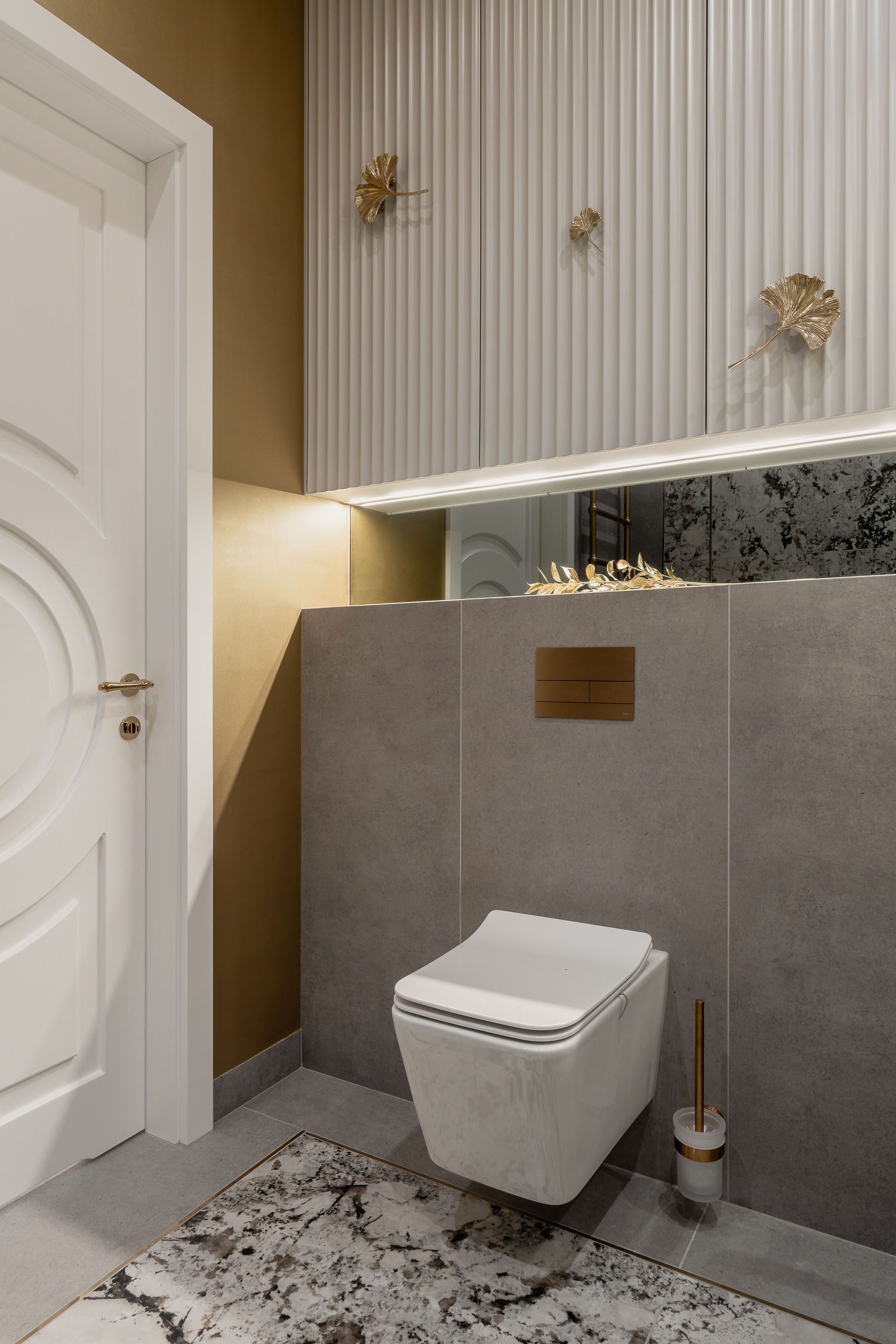 We try to ensure that our projects do not differ from the vision, and are always finally - PERFECT. And this is how the most luxurious, one-office clinic of Dr.Jacek Porada was created. It is located in a fashionable location - Perfumiarnia at Park Wilsona, Poznań. We knew from the very beginning that we wanted to create something unique - we started this process by selecting stoneware and ordering the floor tiles - to be cut into round, egg-shaped forms. We have 3 such a floorforms in this medical facility. In the main office, we transferred the shape of the floor to the suspended ceiling, finished with gold filling from Jelly design - the bent sheet metal with spectacular waves is impressive. Within the facility there is a reception, waiting room, office, relaxation room for the patient, bathroom and "dirty room" (the most luxurious dirty room in Poland). It's hard for me to count the number of mirror walls, but the most interesting of them is the wall covered with a brown mirror in the office. The rest remains silver so that the client can admire the effects at every point of our medical facility. A visit here is definitely an unforgettable experience!