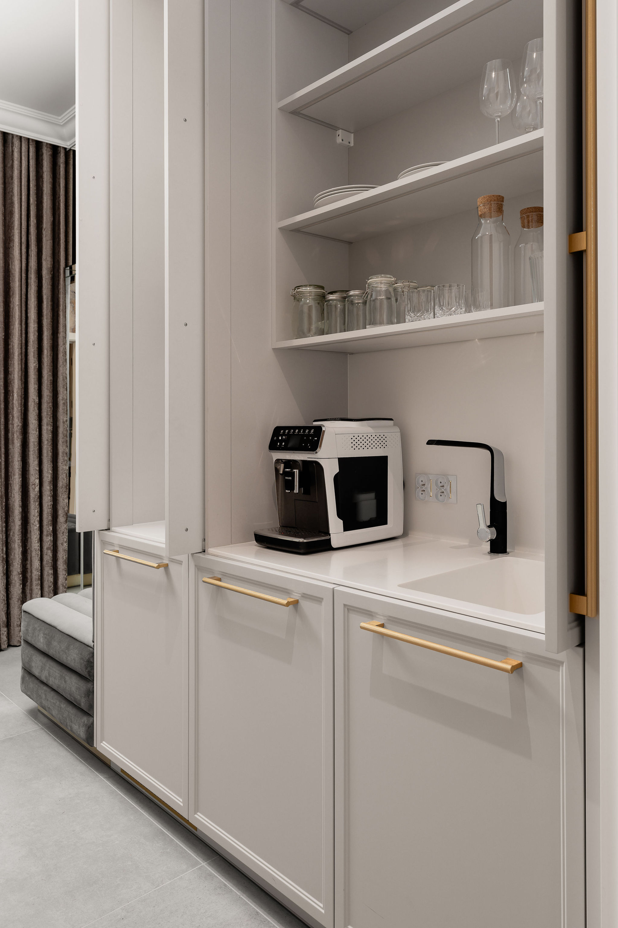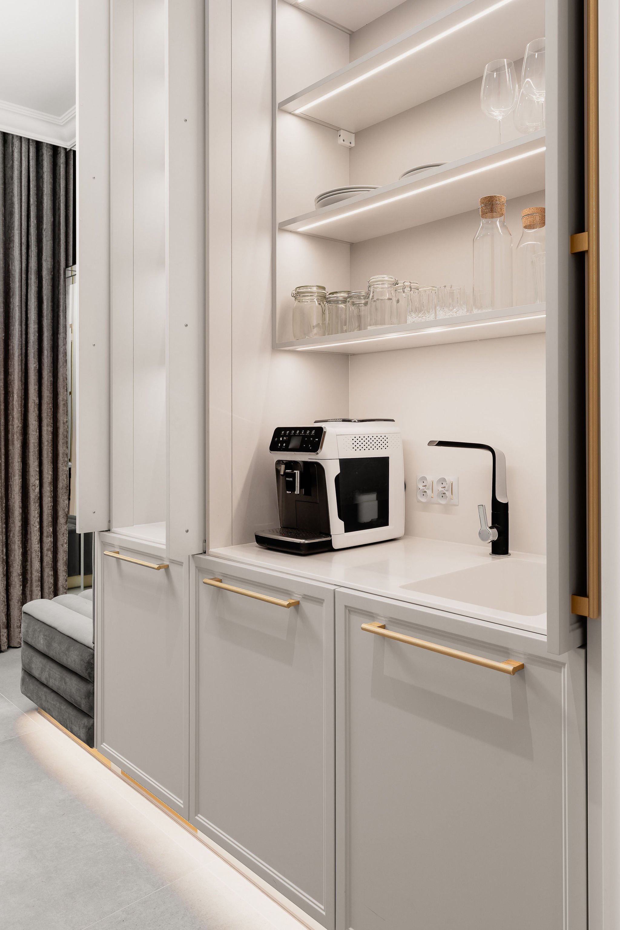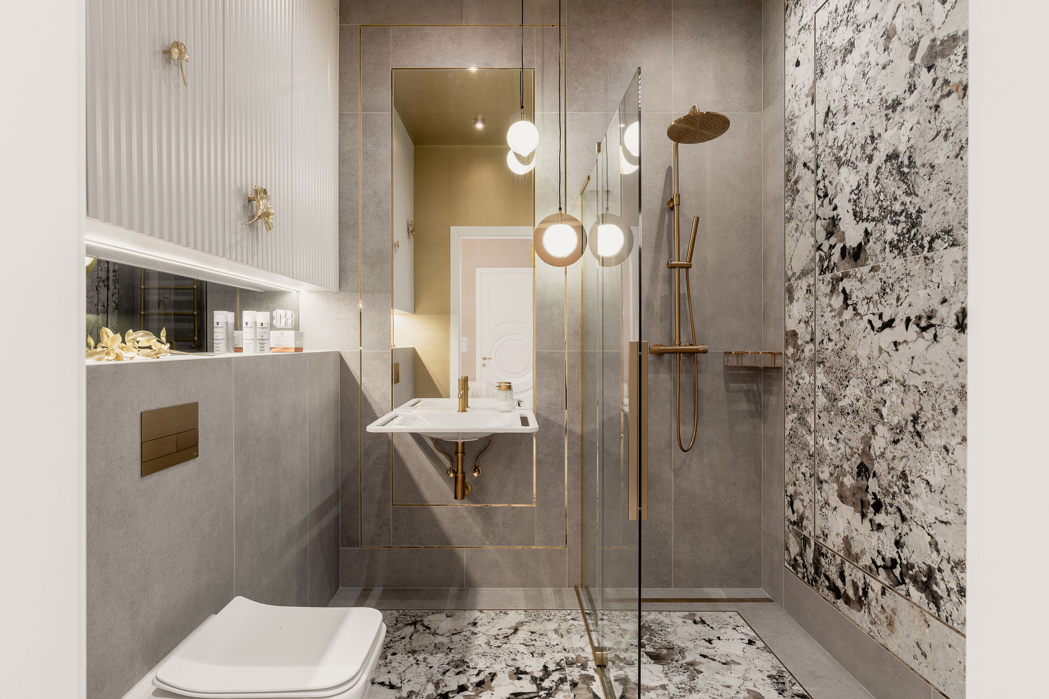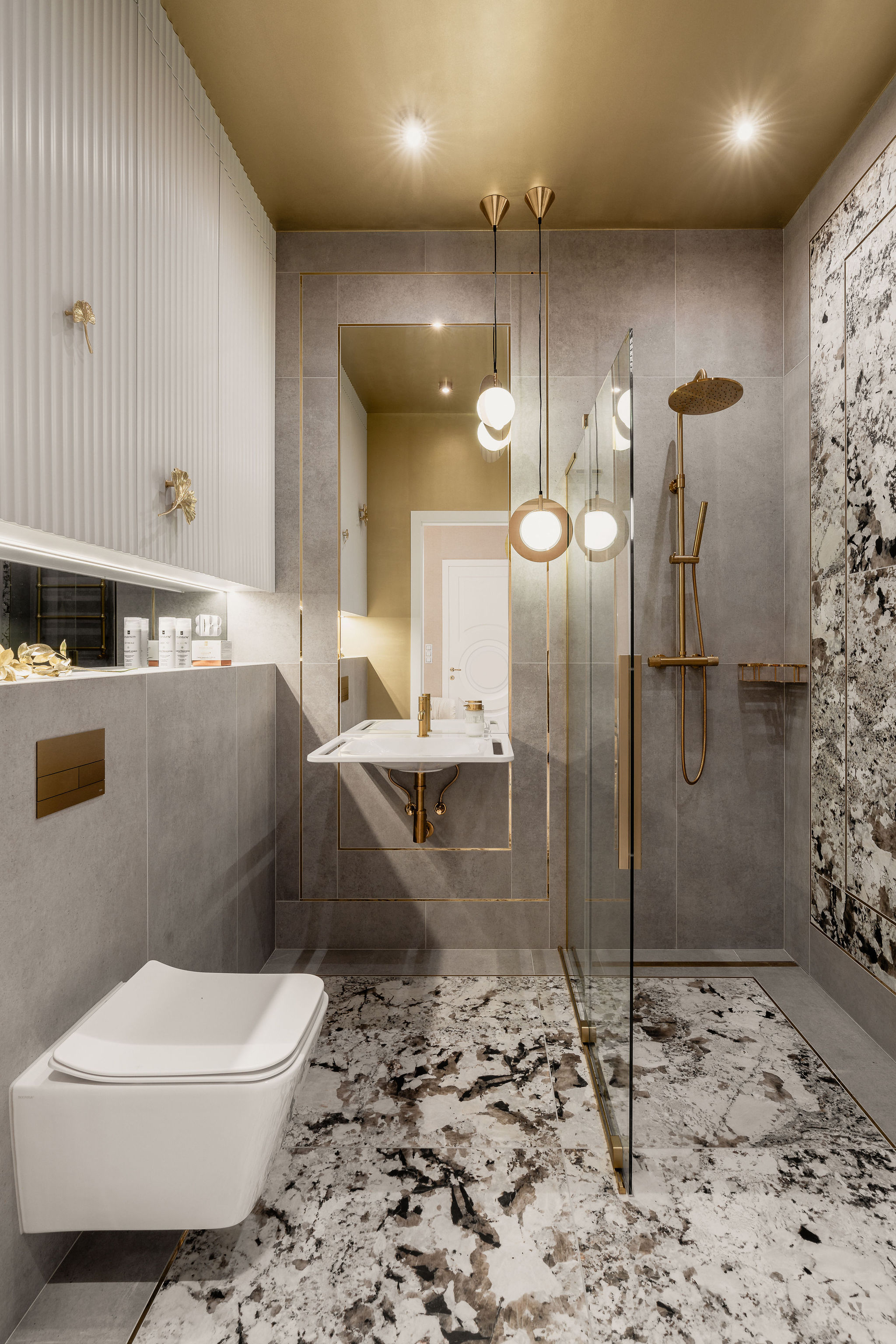 We try to ensure that our projects do not differ from the vision, and are always finally - PERFECT. And this is how the most luxurious, one-office clinic of Dr.Jacek Porada was created. It is located in a fashionable location - Perfumiarnia at Park Wilsona, Poznań. We knew from the very beginning that we wanted to create something unique - we started this process by selecting stoneware and ordering the floor tiles - to be cut into round, egg-shaped forms. We have 3 such a floorforms in this medical facility. In the main office, we transferred the shape of the floor to the suspended ceiling, finished with gold filling from Jelly design - the bent sheet metal with spectacular waves is impressive. Within the facility there is a reception, waiting room, office, relaxation room for the patient, bathroom and "dirty room" (the most luxurious dirty room in Poland). It's hard for me to count the number of mirror walls, but the most interesting of them is the wall covered with a brown mirror in the office. The rest remains silver so that the client can admire the effects at every point of our medical facility. A visit here is definitely an unforgettable experience!