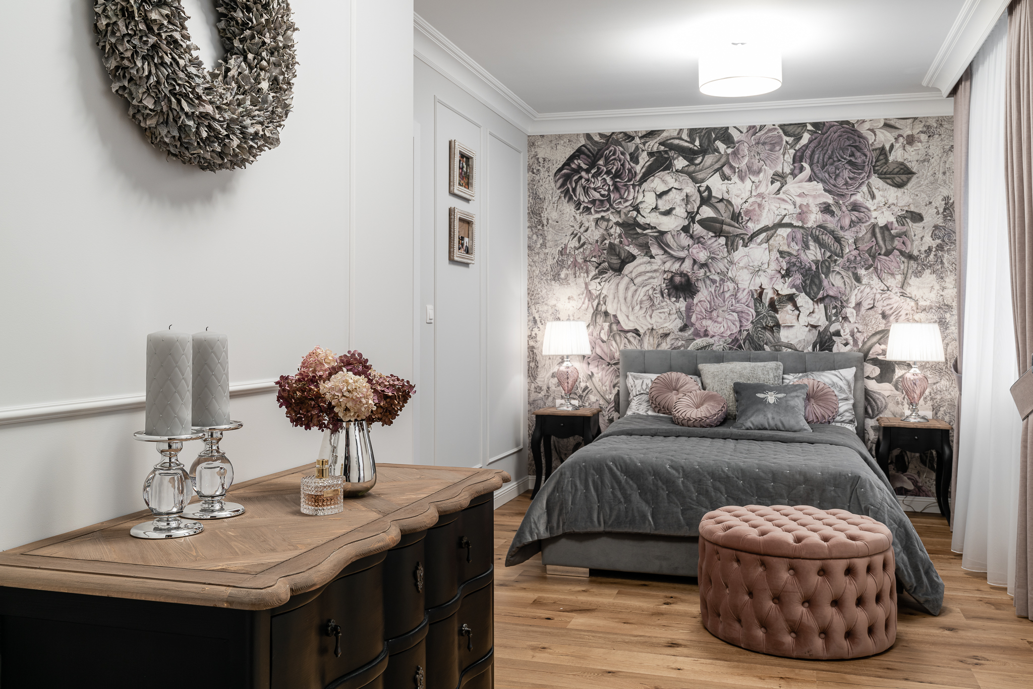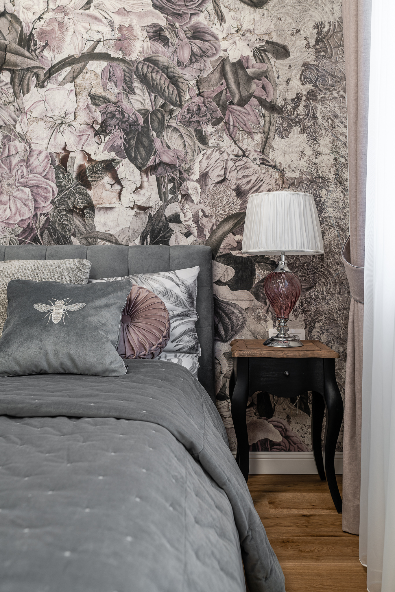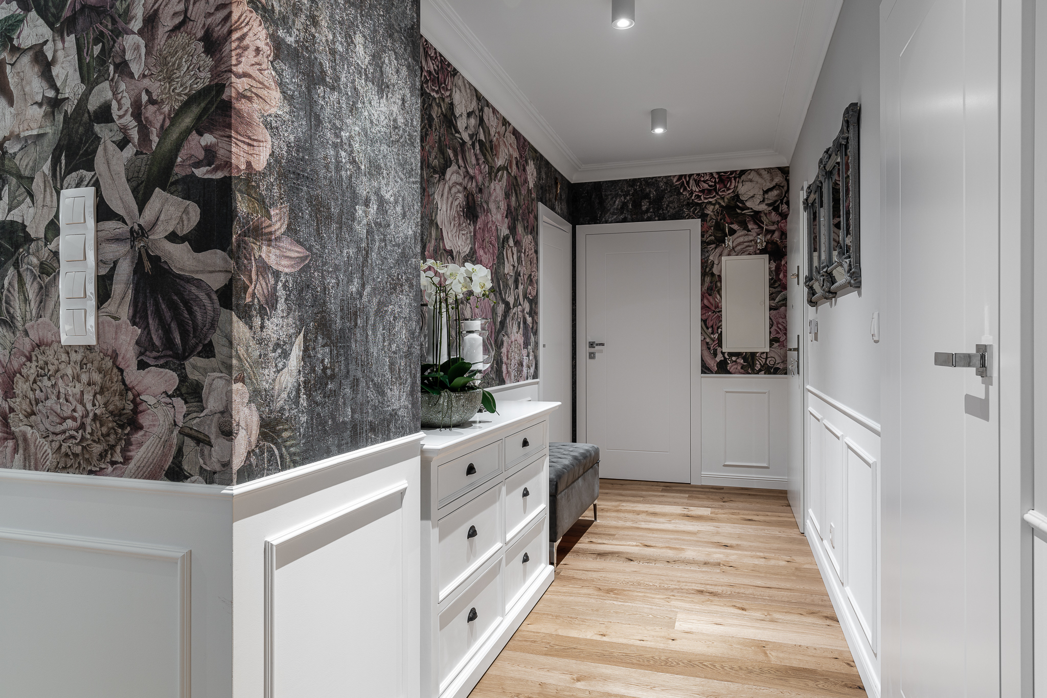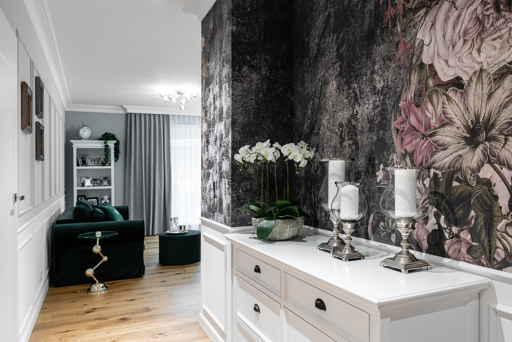 A unique element of this interior was the design of a bathing salon with an area of 15 m2 in relation to the total area (63 m2) apartment "in the block of flats". It was a brilliant idea, because nowadays every guest would like to move into our client's bathroom. We did not want to leave it either. Jewellery moldings, painted into two zones and fashionable wallpapers with a botanical motif add charm and a light, feminine note to the interior.