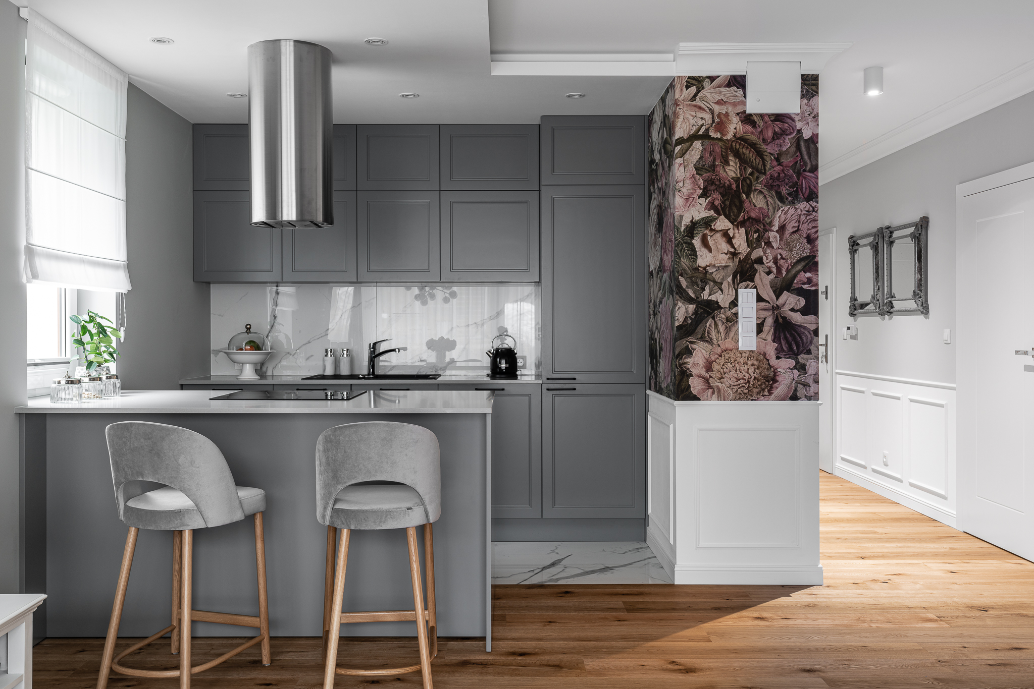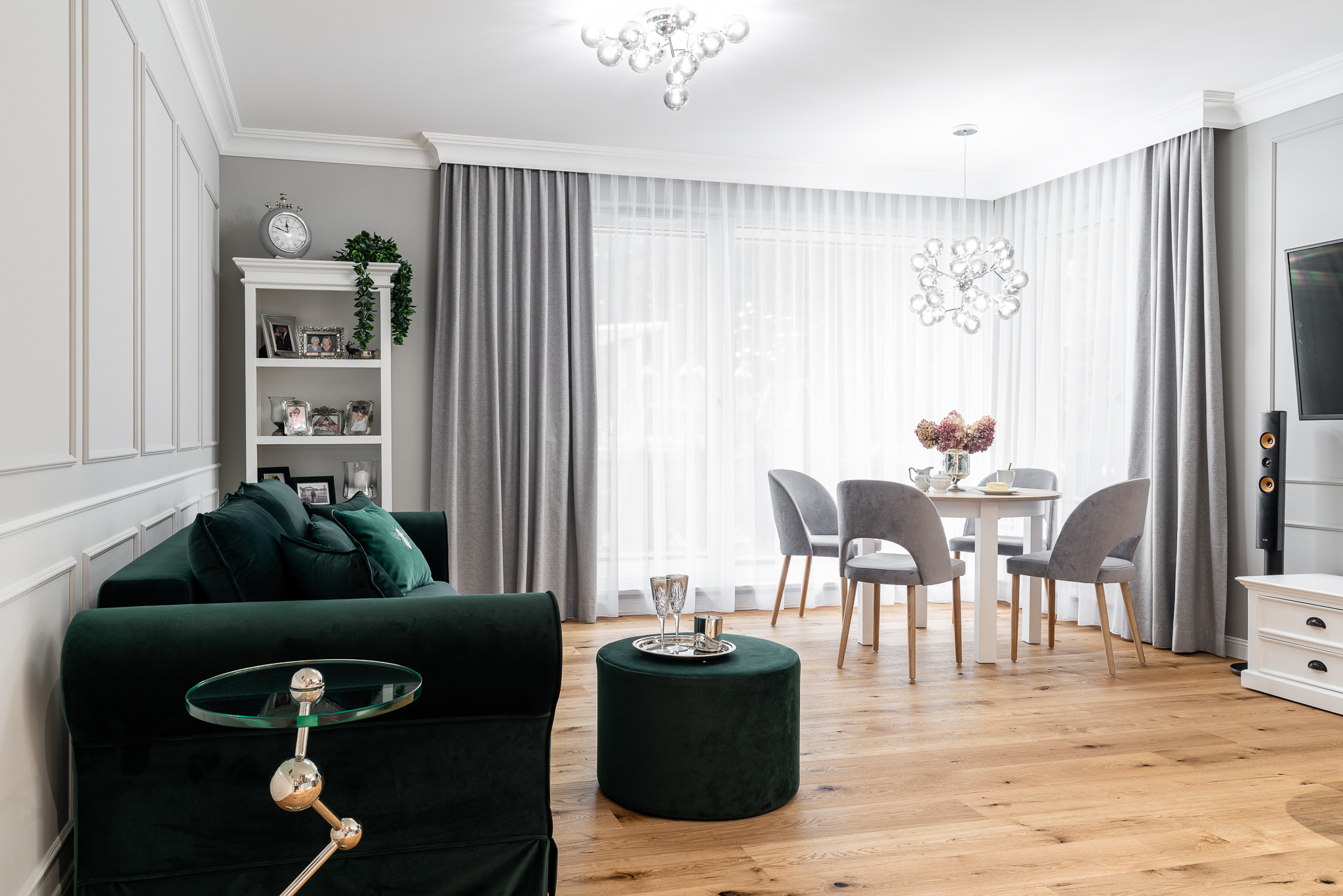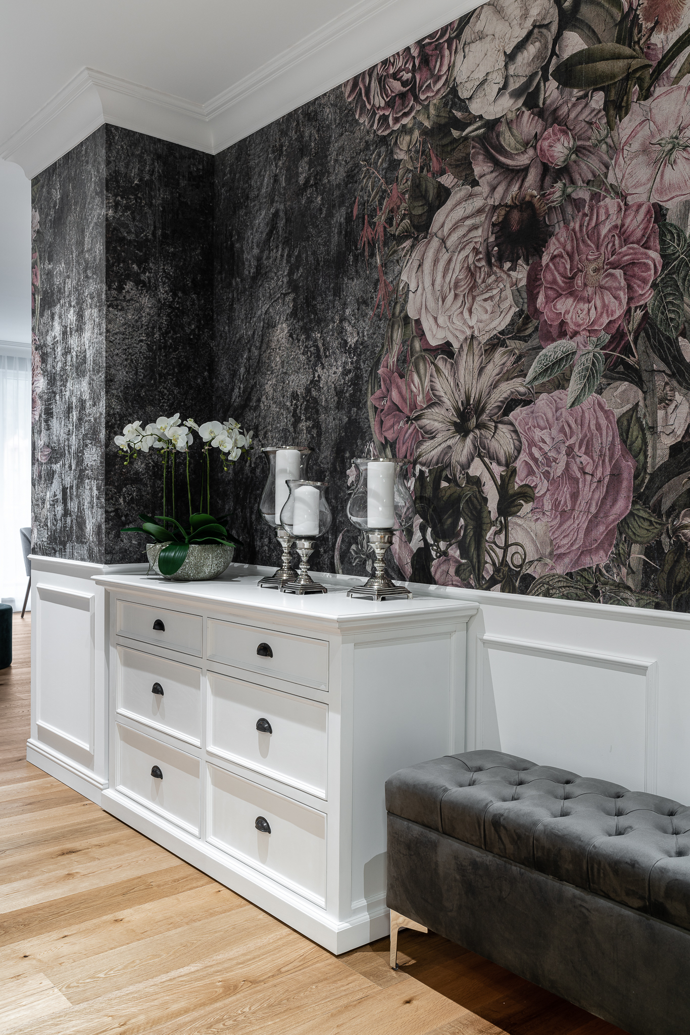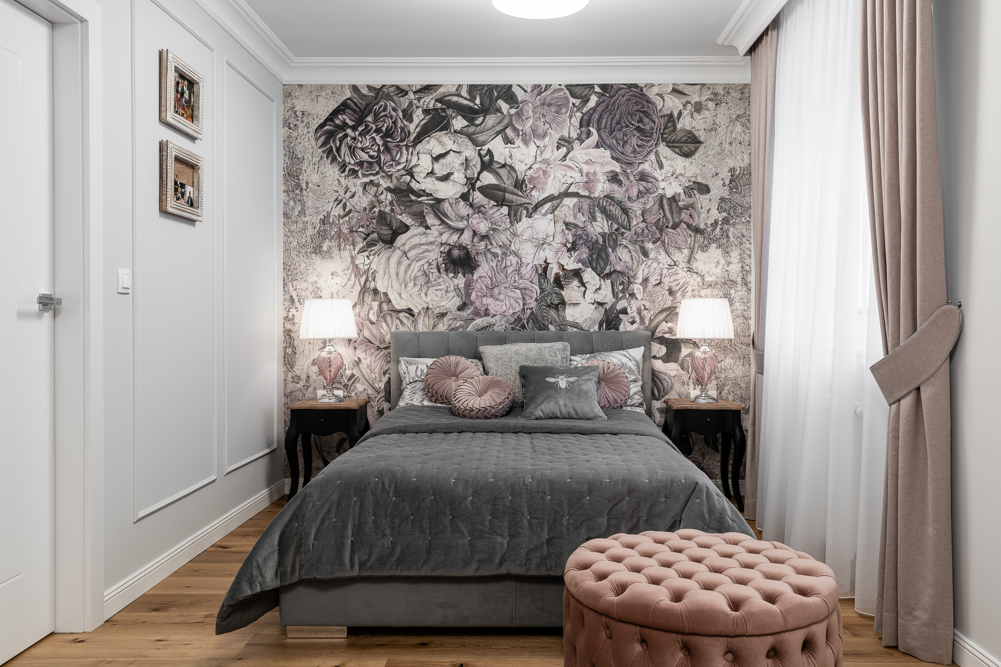A unique element of this interior was the design of a bathing salon with an area of 15 m2 in relation to the total area (63 m2) apartment "in the block of flats". It was a brilliant idea, because nowadays every guest would like to move into our client's bathroom. We did not want to leave it either. Jewellery moldings, painted into two zones and fashionable wallpapers with a botanical motif add charm and a light, feminine note to the interior.