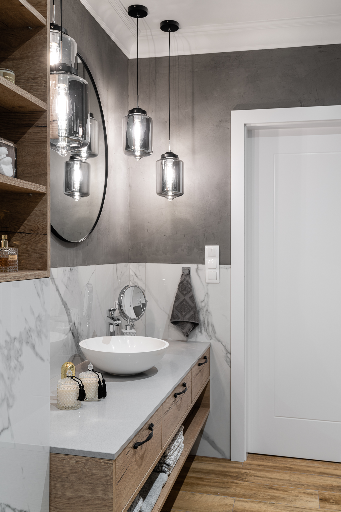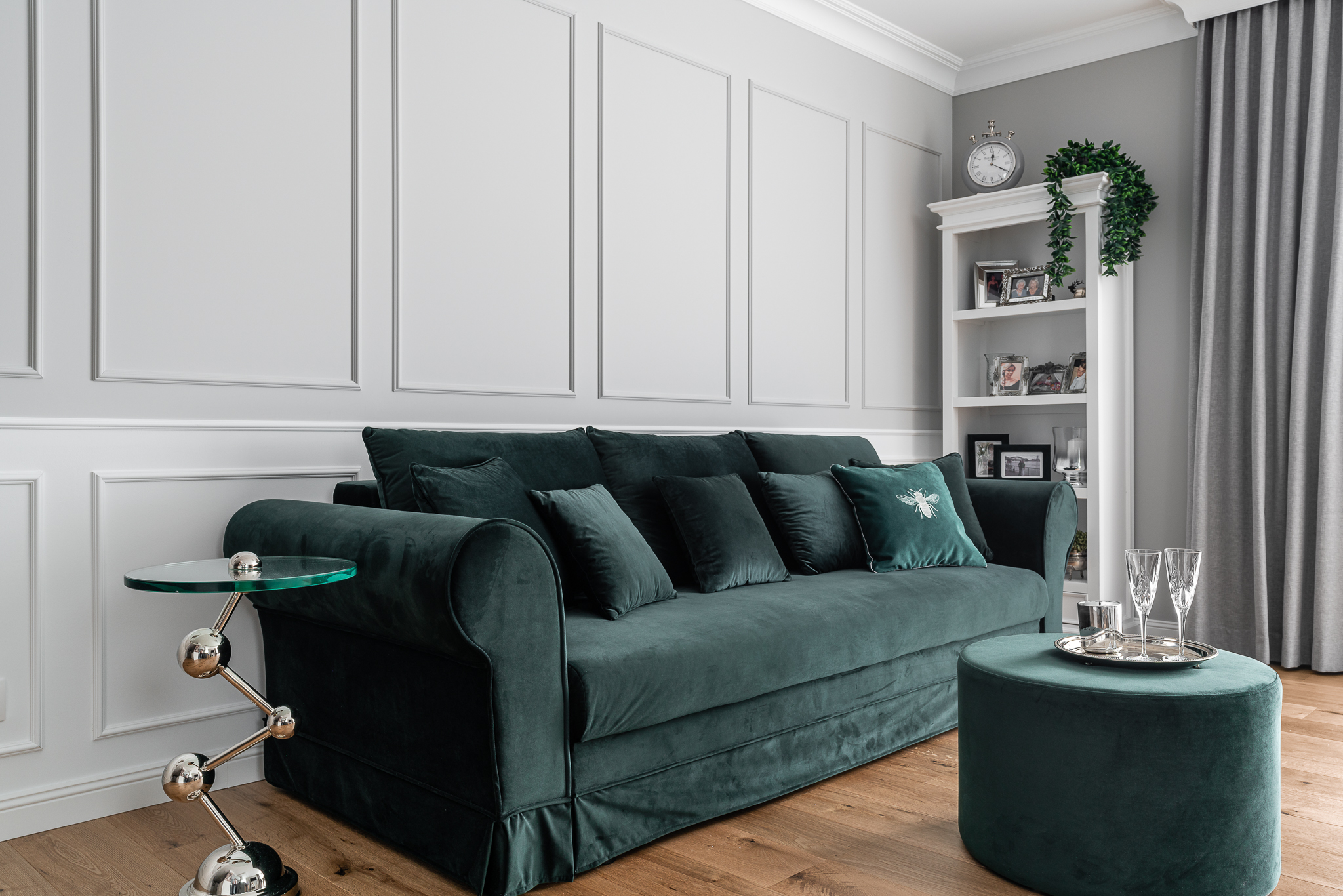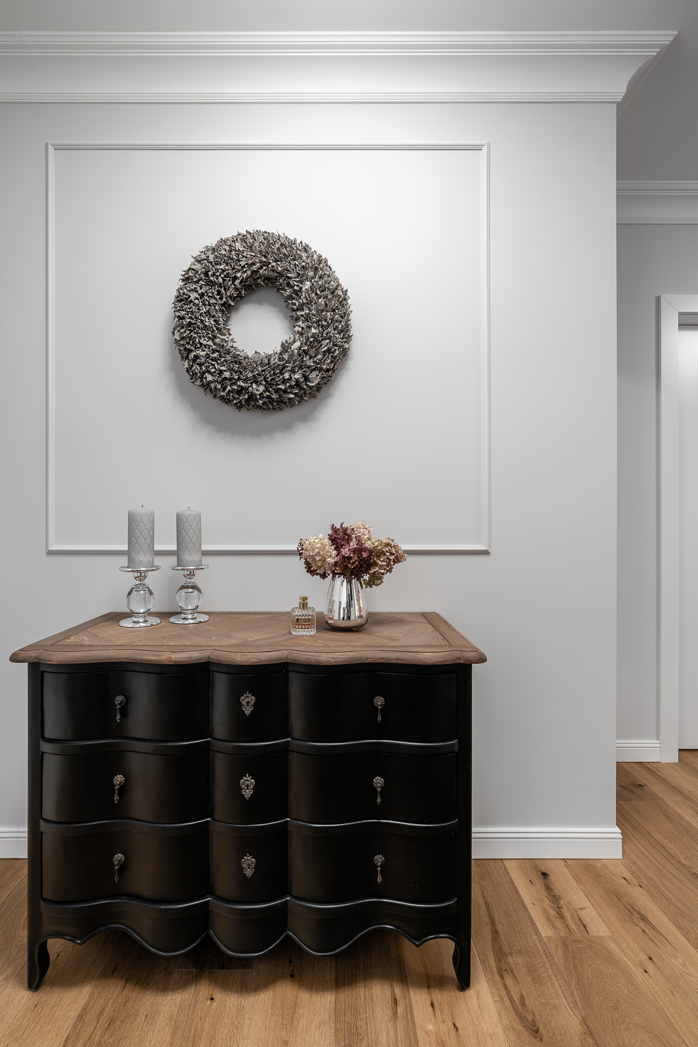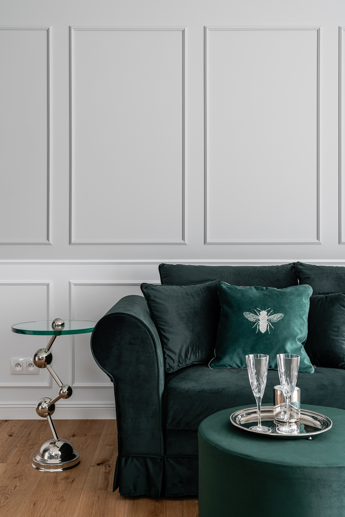 A unique element of this interior was the design of a bathing salon with an area of 15 m2 in relation to the total area (63 m2) apartment "in the block of flats". It was a brilliant idea, because nowadays every guest would like to move into our client's bathroom. We did not want to leave it either. Jewellery moldings, painted into two zones and fashionable wallpapers with a botanical motif add charm and a light, feminine note to the interior.