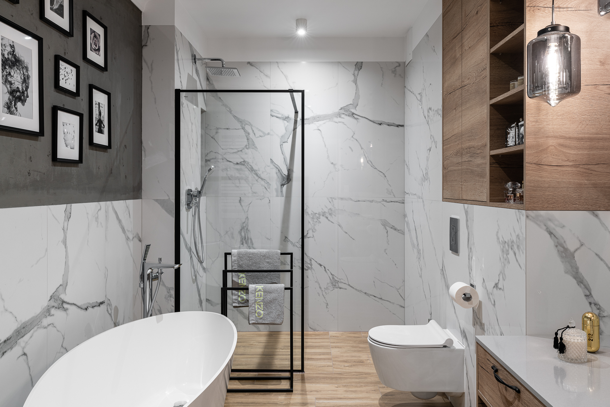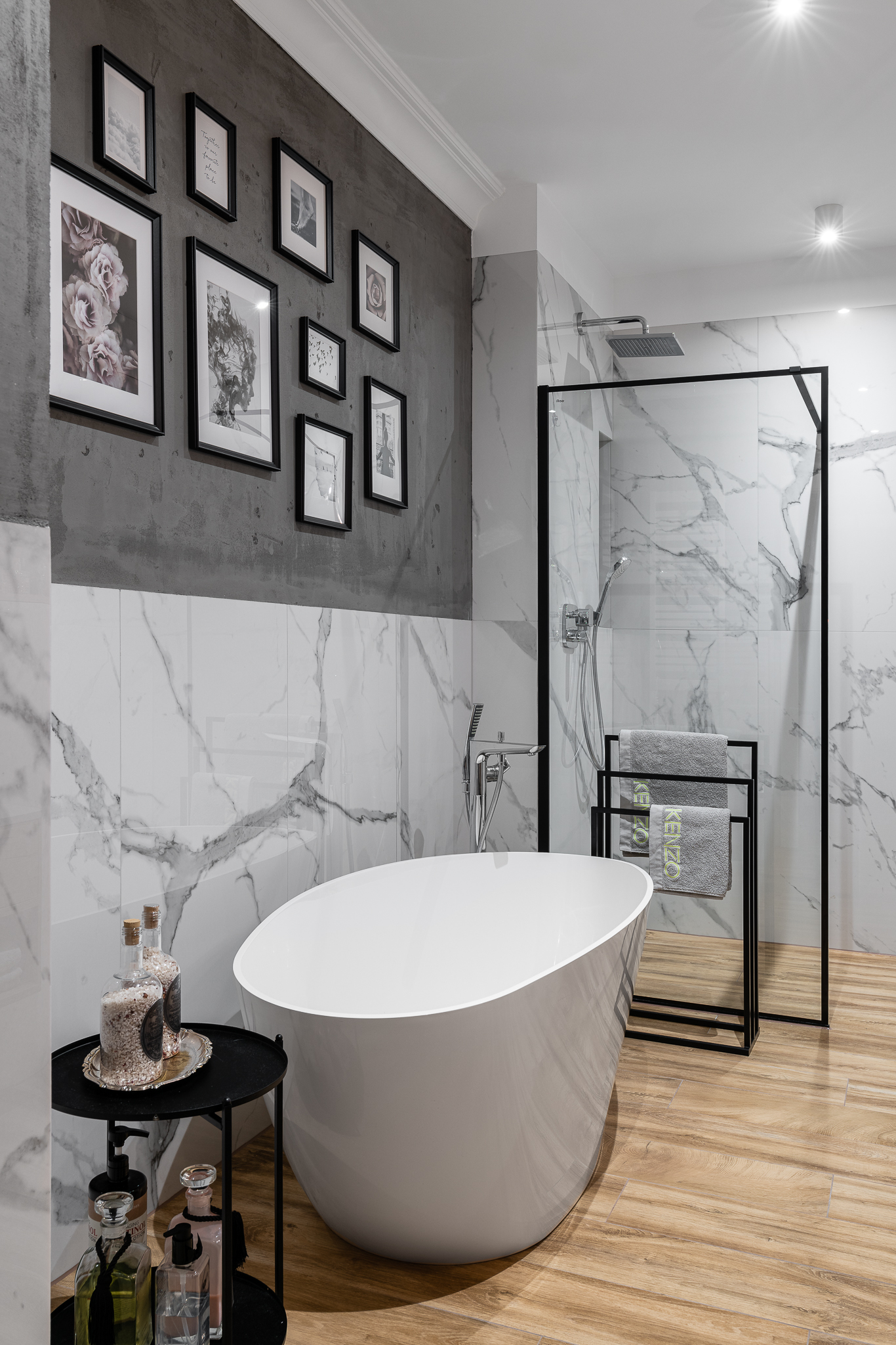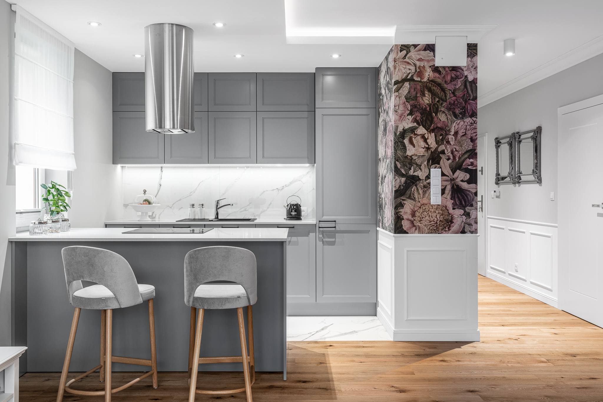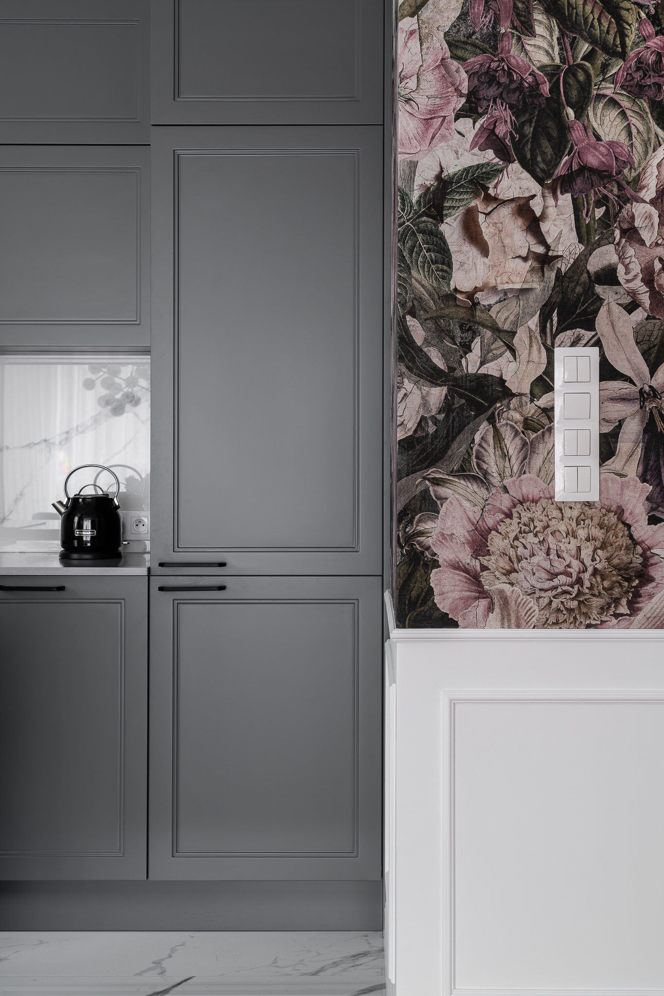 A unique element of this interior was the design of a bathing salon with an area of 15 m2 in relation to the total area (63 m2) apartment "in the block of flats". It was a brilliant idea, because nowadays every guest would like to move into our client's bathroom. We did not want to leave it either. Jewellery moldings, painted into two zones and fashionable wallpapers with a botanical motif add charm and a light, feminine note to the interior.