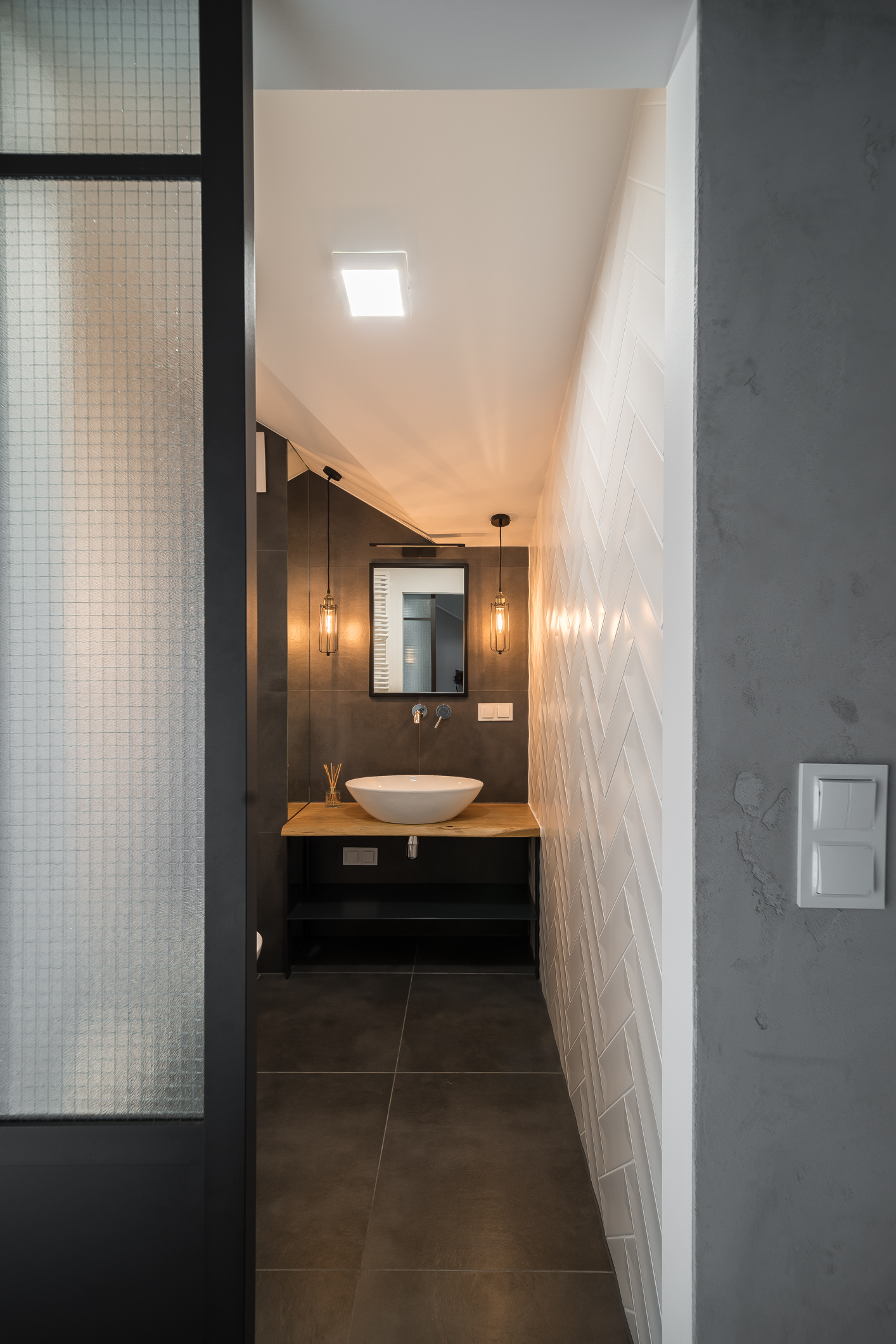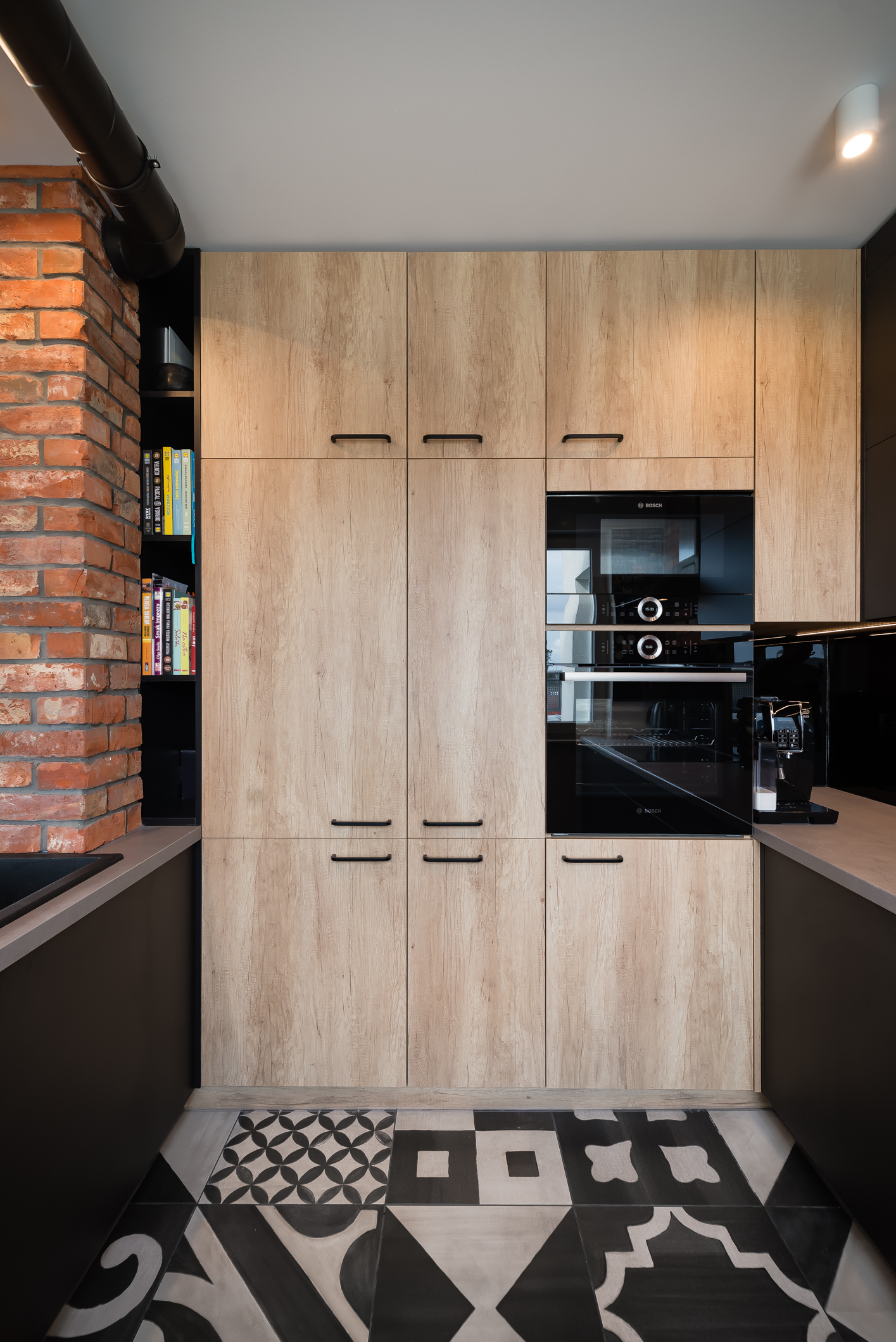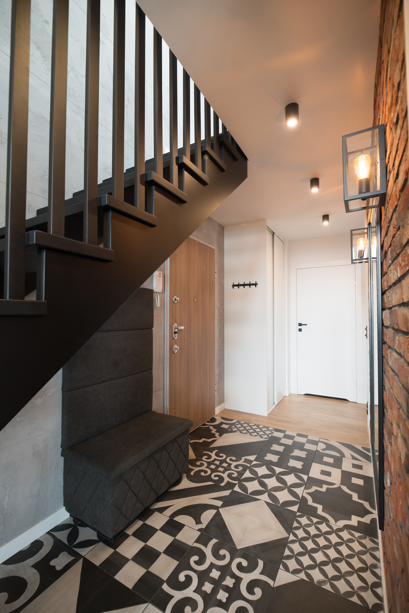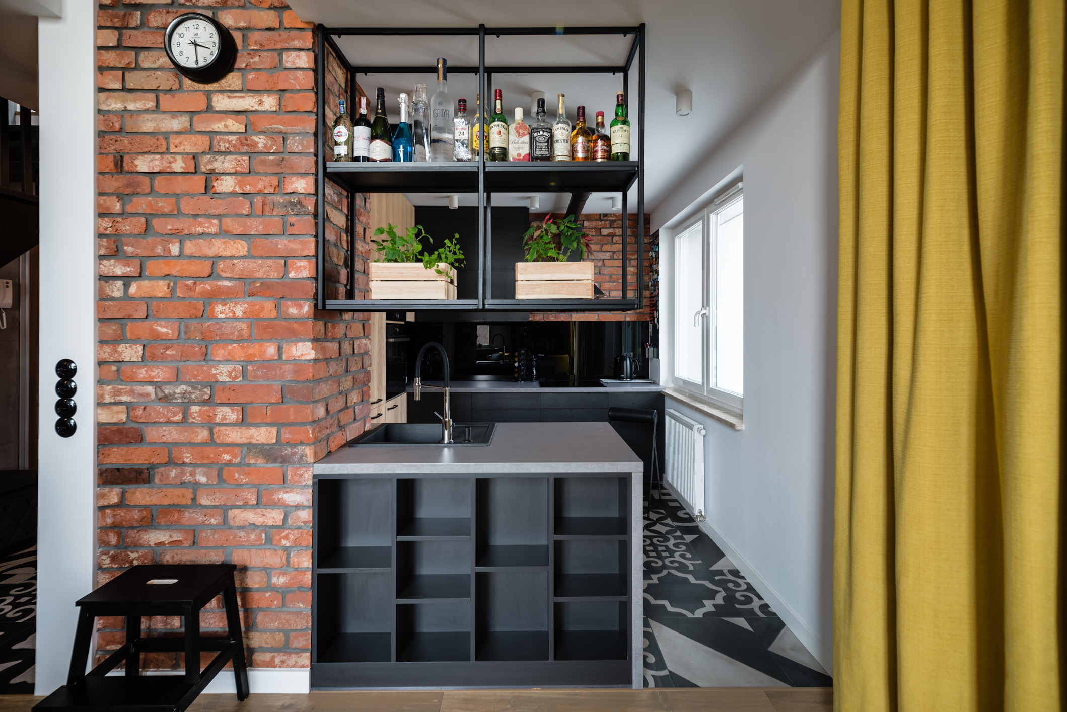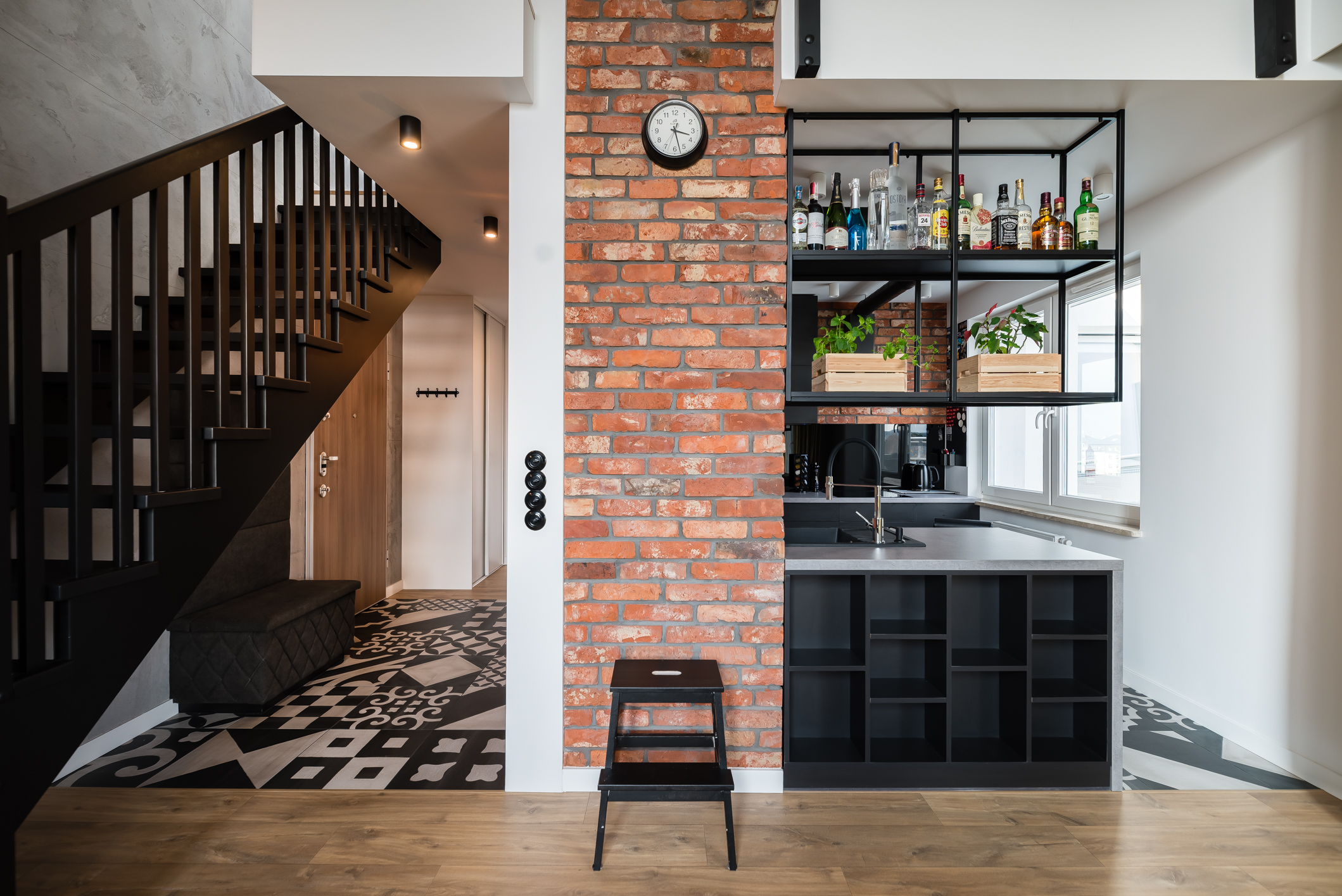 It is a two-level apartment, which was created on the basis of our "MOVE IN READY" package, and its realisation was done by our befriended construction team. Thanks to this form of cooperation, everything has been touched up to the last detail. From the very beginning, the interior was intended to be designed in loft style combined with the 80's. I tried to include a note of modernity in the project in the form of a beautiful kitchen with a peninsula and black lacobel on the wall, or in the form of beautiful Italian tiles by Iris Ceramica, which were used in the hall and in the kitchen. The project is more economical than most of our portfolio and is a proof that we are able to offer something unique and surprising in every budget.