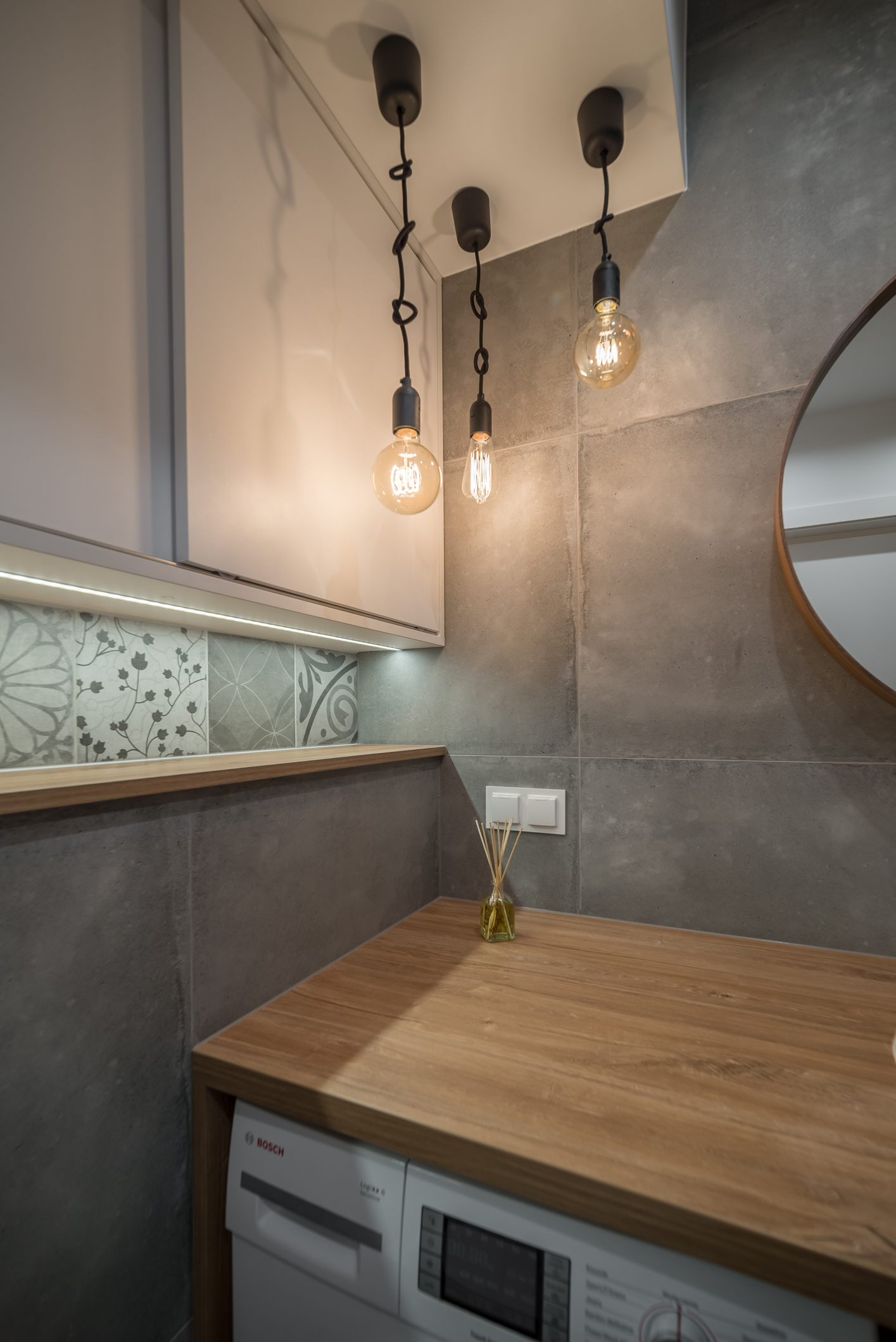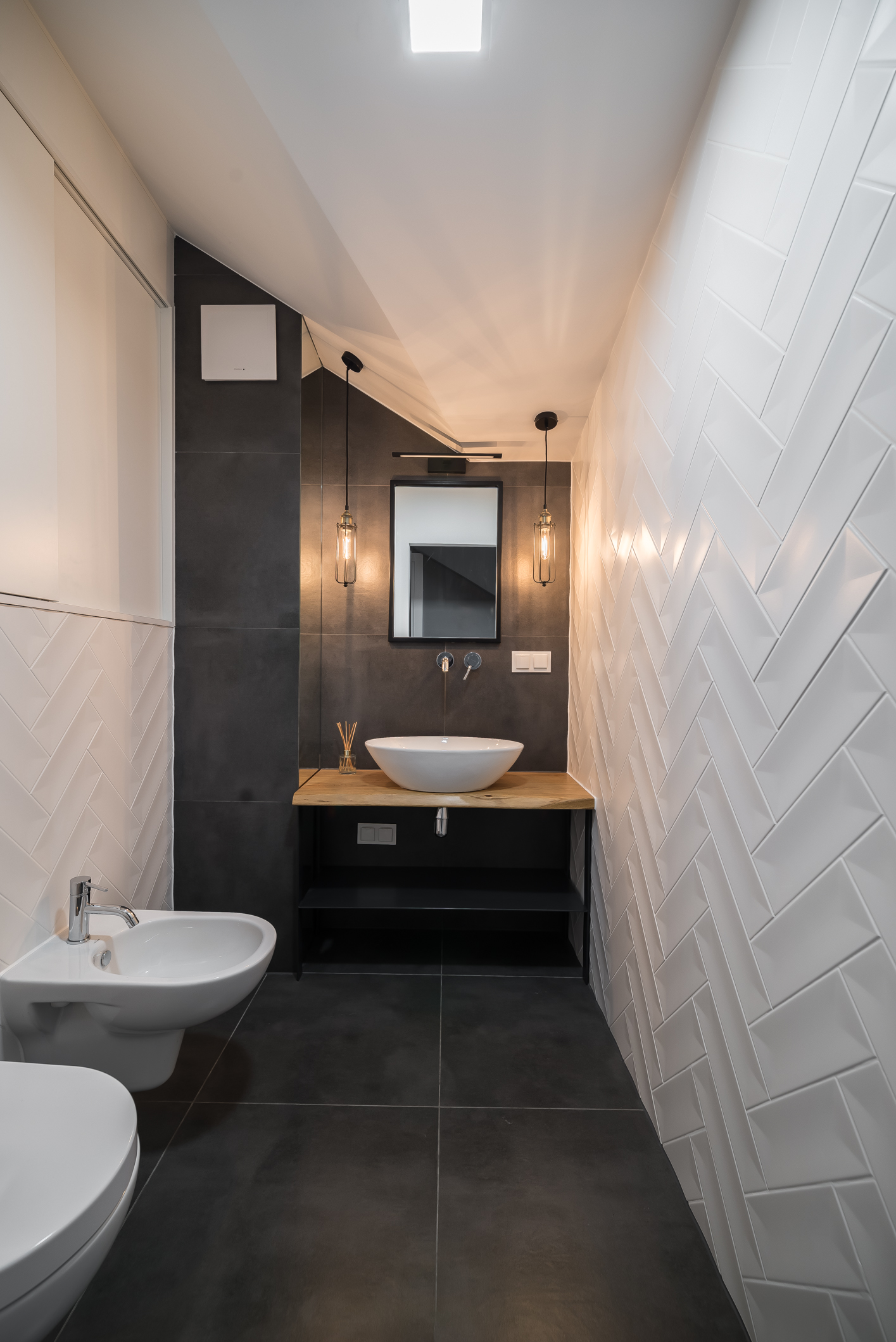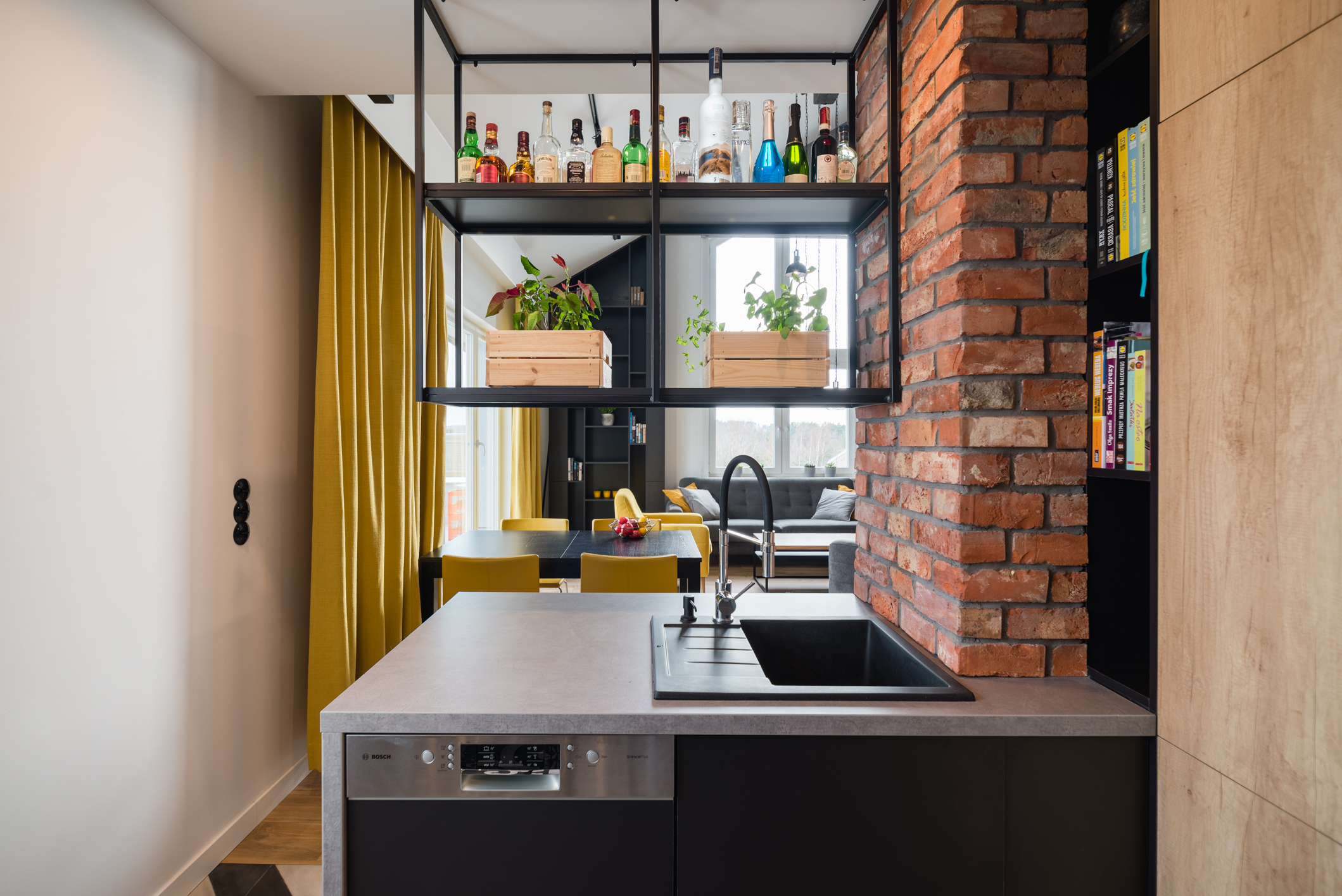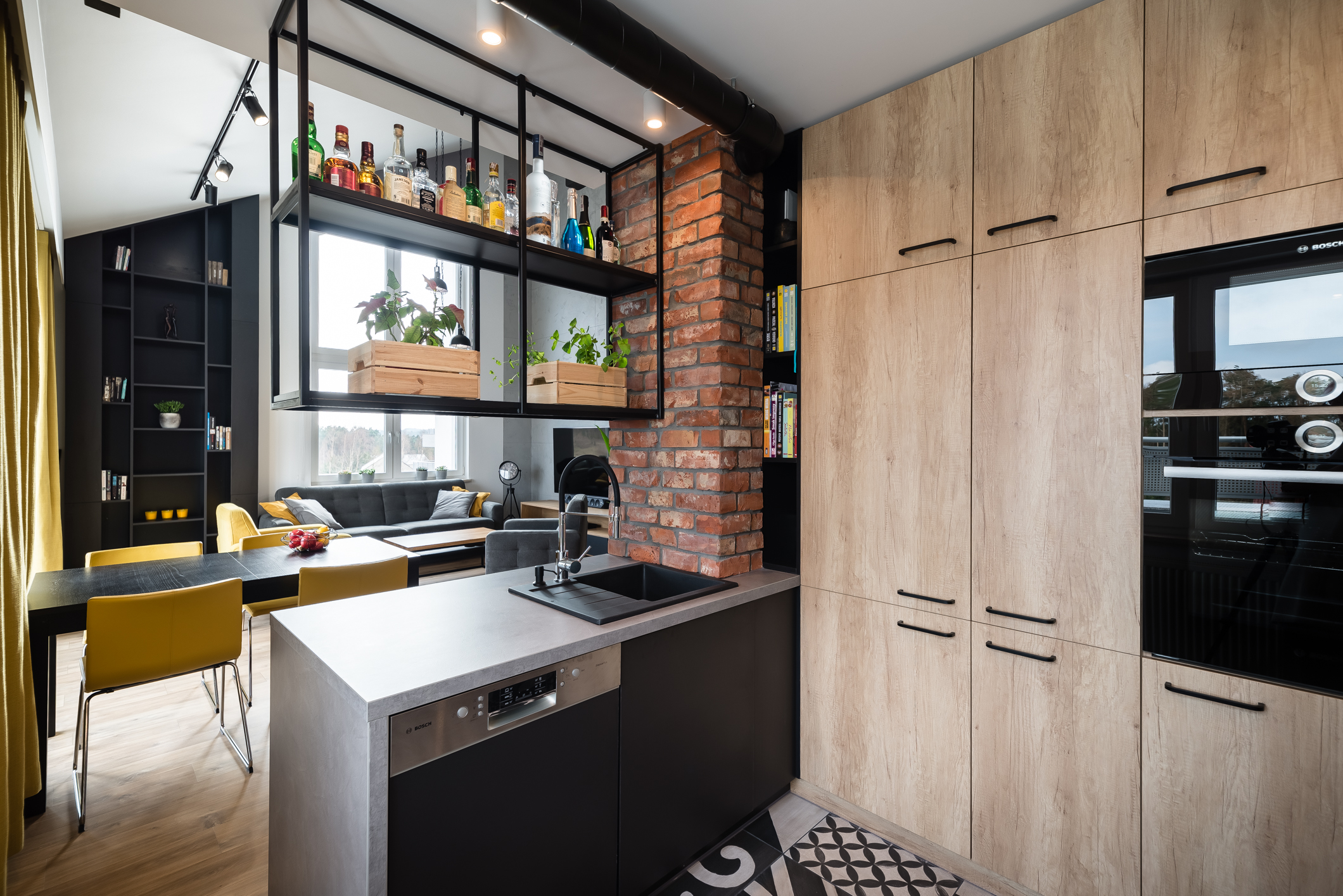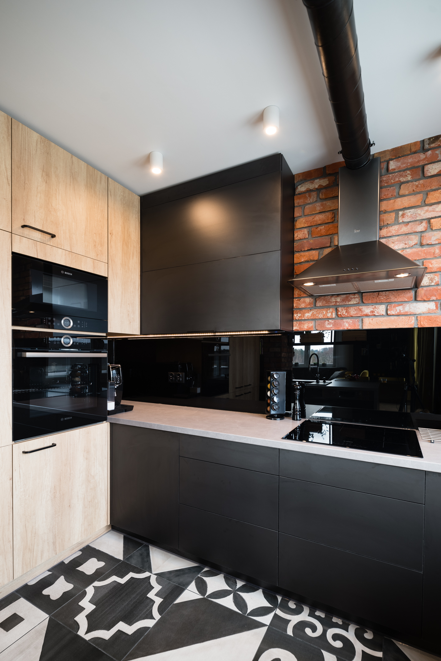It is a two-level apartment, which was created on the basis of our "MOVE IN READY" package, and its realisation was done by our befriended construction team. Thanks to this form of cooperation, everything has been touched up to the last detail. From the very beginning, the interior was intended to be designed in loft style combined with the 80's. I tried to include a note of modernity in the project in the form of a beautiful kitchen with a peninsula and black lacobel on the wall, or in the form of beautiful Italian tiles by Iris Ceramica, which were used in the hall and in the kitchen. The project is more economical than most of our portfolio and is a proof that we are able to offer something unique and surprising in every budget.