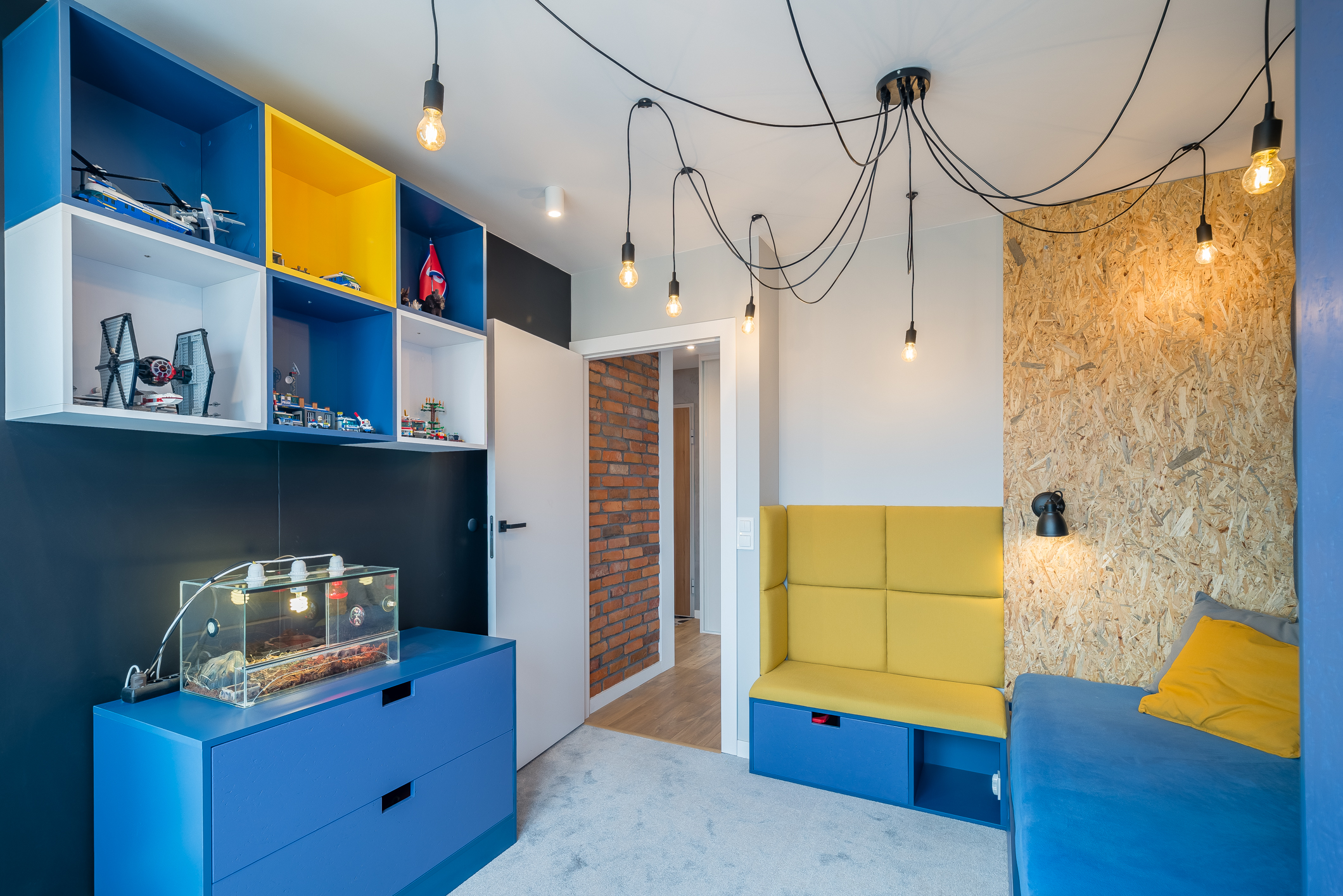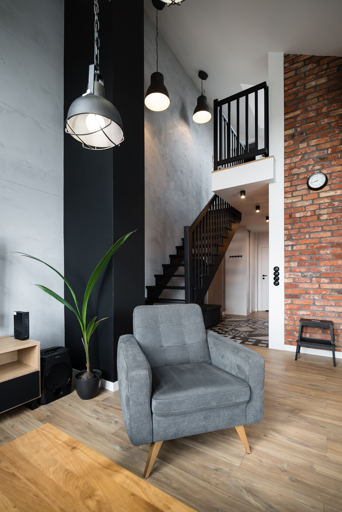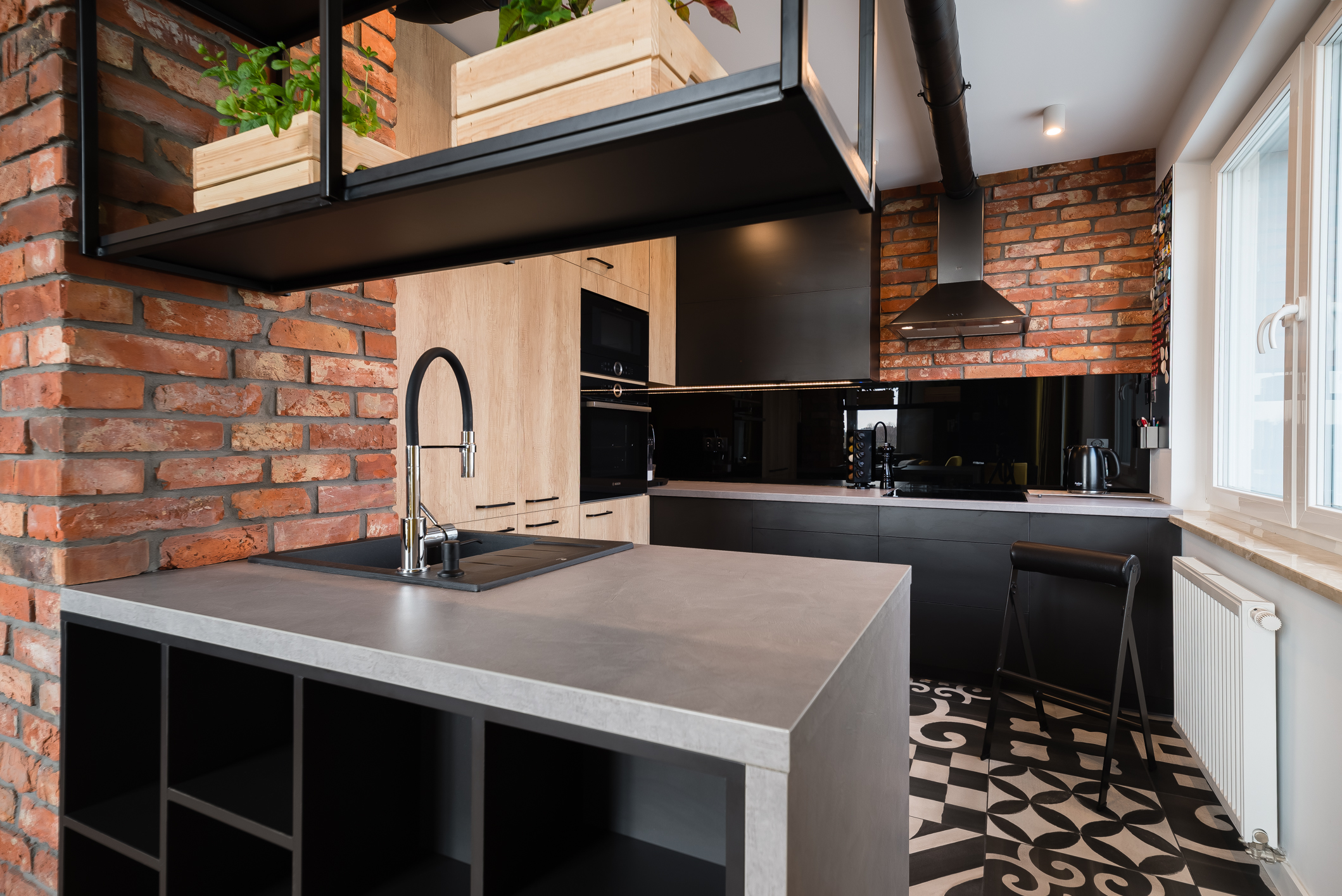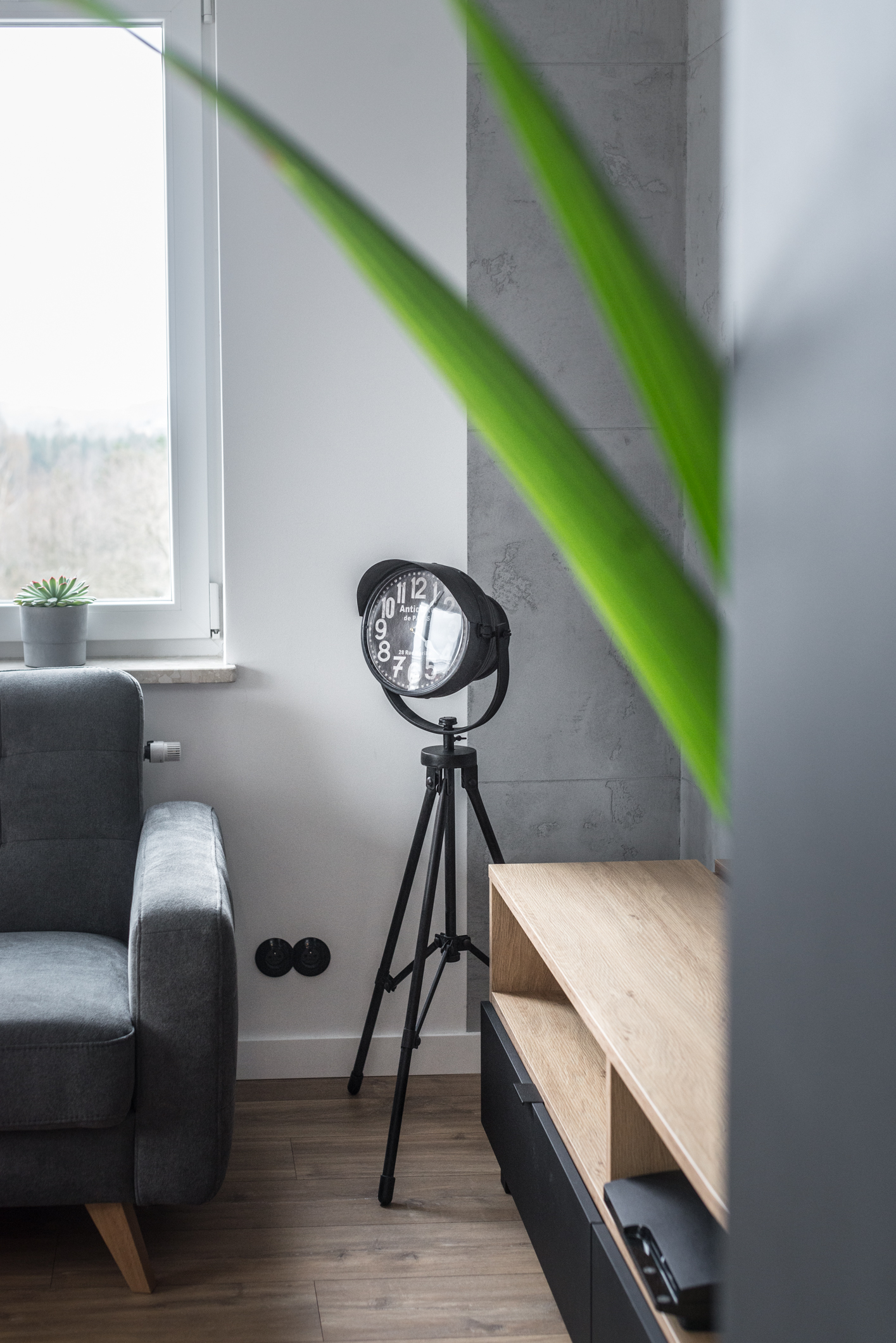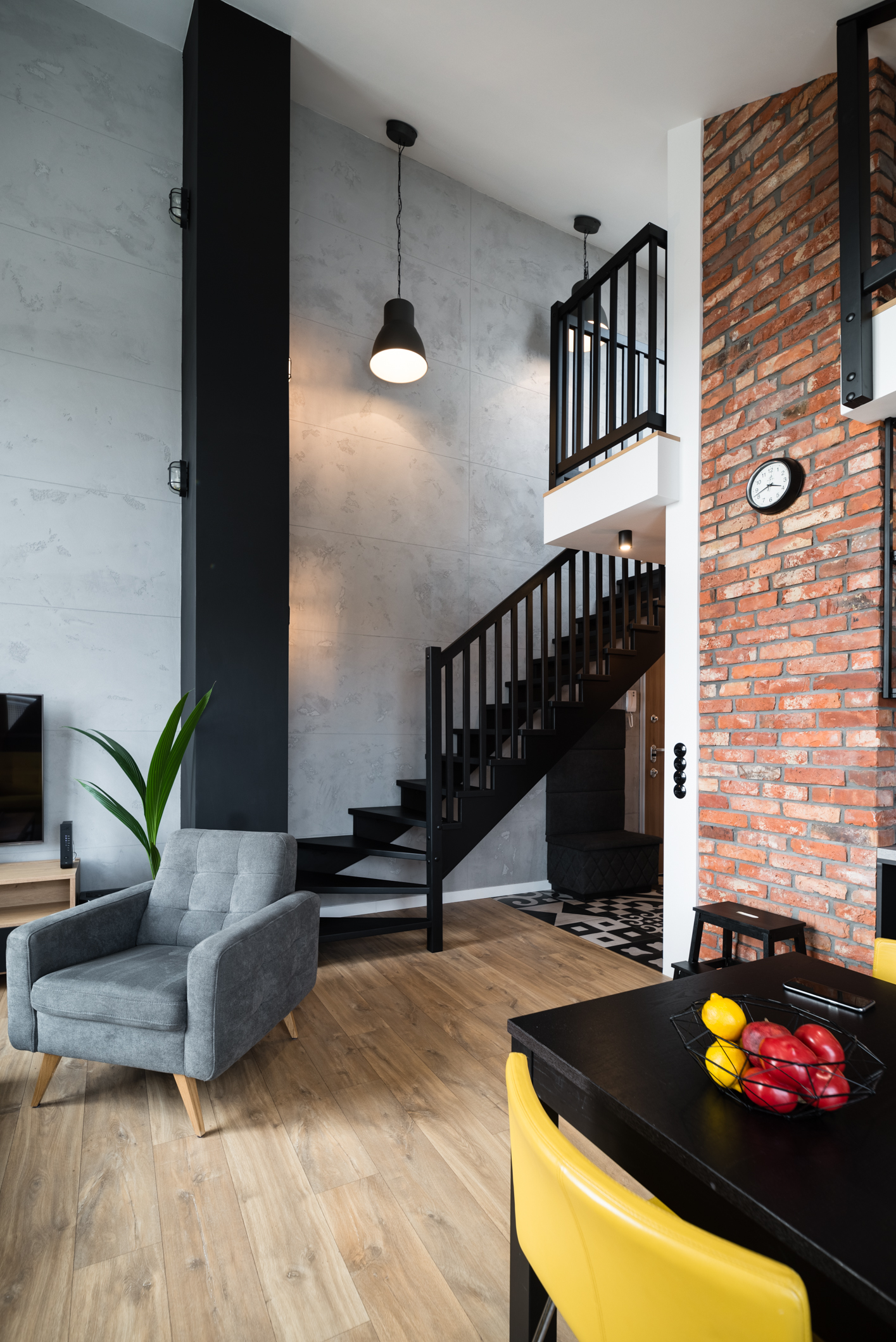 It is a two-level apartment, which was created on the basis of our "MOVE IN READY" package, and its realisation was done by our befriended construction team. Thanks to this form of cooperation, everything has been touched up to the last detail. From the very beginning, the interior was intended to be designed in loft style combined with the 80's. I tried to include a note of modernity in the project in the form of a beautiful kitchen with a peninsula and black lacobel on the wall, or in the form of beautiful Italian tiles by Iris Ceramica, which were used in the hall and in the kitchen. The project is more economical than most of our portfolio and is a proof that we are able to offer something unique and surprising in every budget.