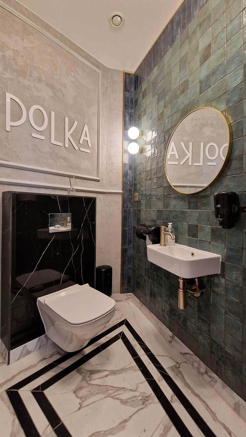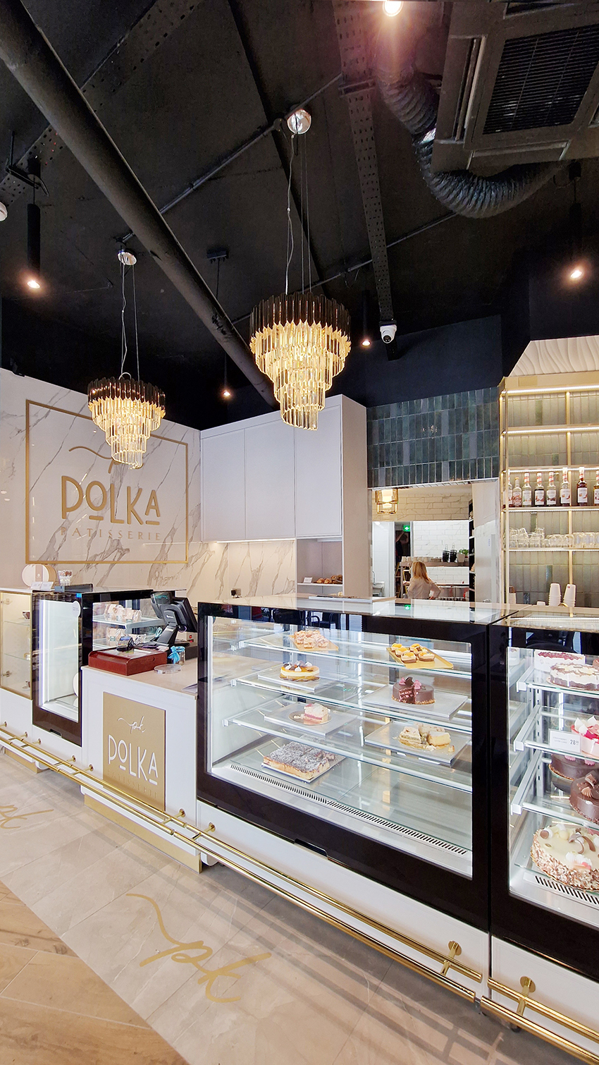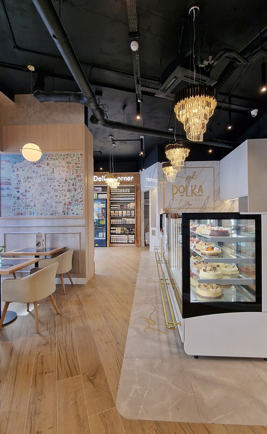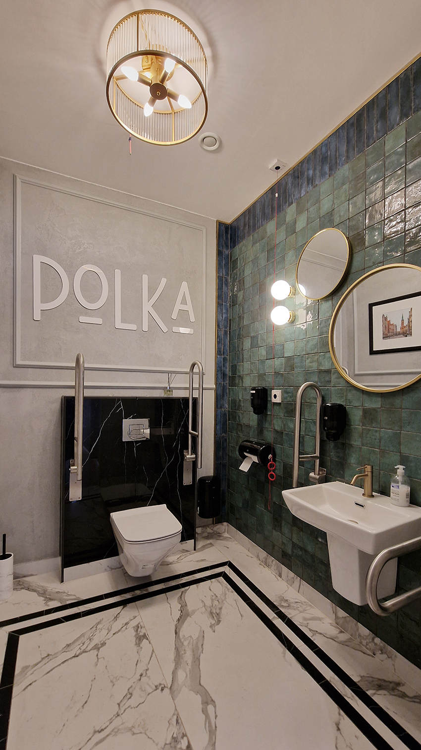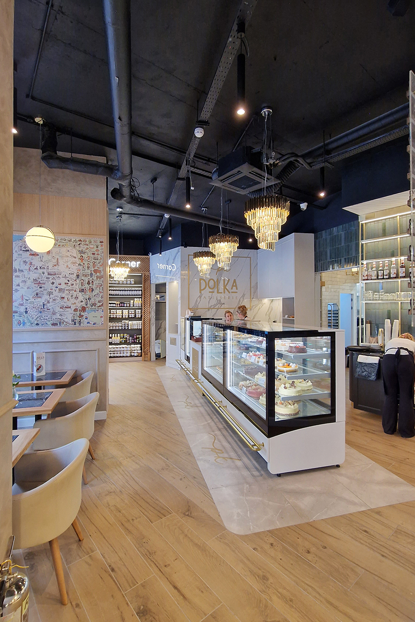 The New/Old restaurant in Ealing in East London is a real treat for locals. One of them said "From EALING to Hollywood" because he was surprised by the high level of interior furnishings. Clients asked me to move and rebrand old restaurant "Sowa Restaurant" into new, much larger premises (300 m2) in the same district of London. The place was supposed to make the WOW effect, encourage taking photos and tagging in social media as well as being distinctive and functional. From the beginning, with the participation of customers, we gave great importance to the number of seats inside and outside because this is the key to this business! A functional kitchen, storage spaces, as well as designer toilets are also our work. Dining room remains the heart of course. The main space was divided for the POLKA PATISSERIE confectionery section (formerly Sowa Patisserie) and the POLKA KITCHEN restaurant area with a bar, serving colourful drinks. Right behind it we designed the "live kitchen" – a station where dumplings (one of the most important and distinguishing Polish dish) are made. The colour scheme of the interior was kept in bottle greens, wood and white and black marble. We made this place elegant and timeless.