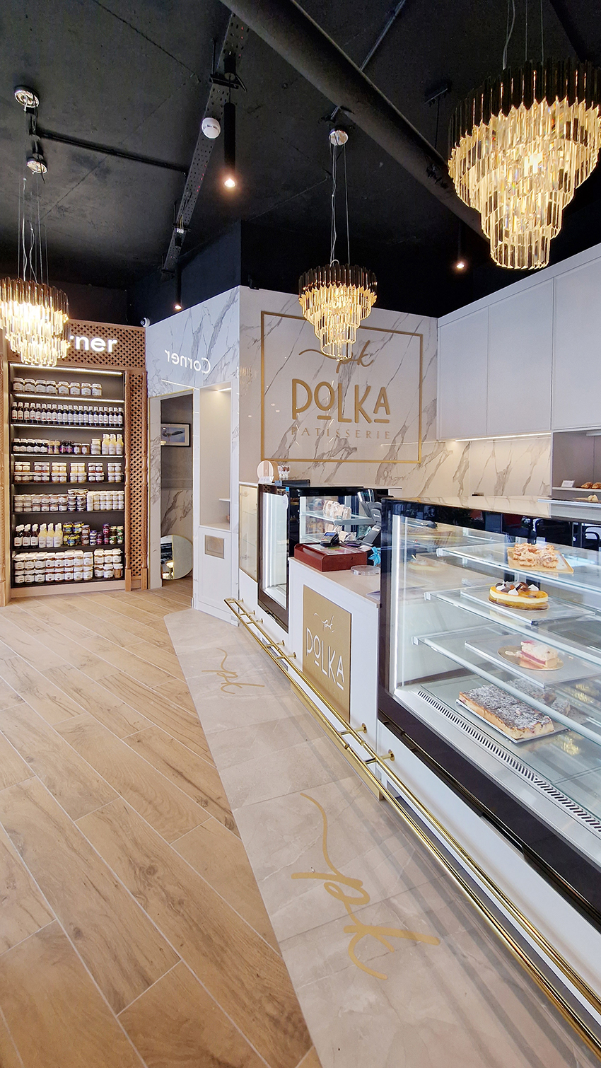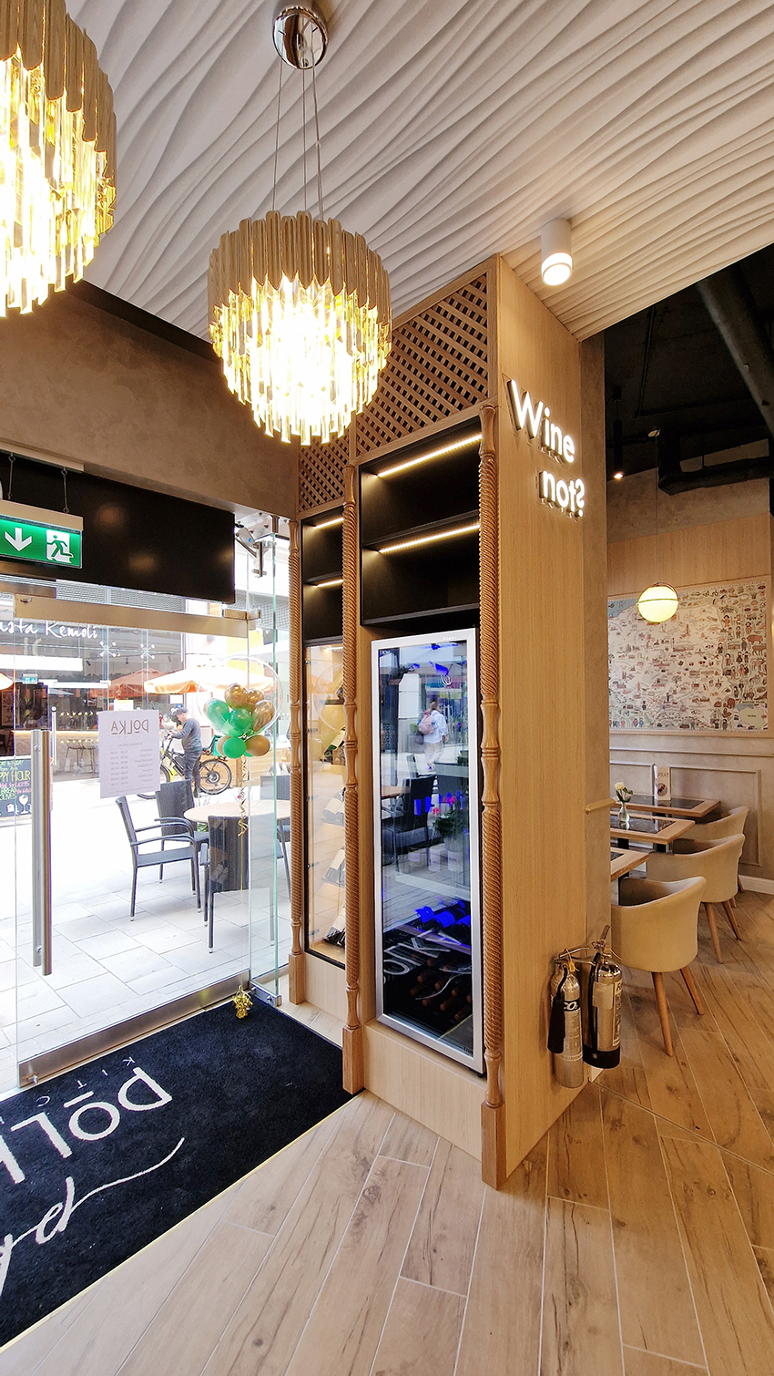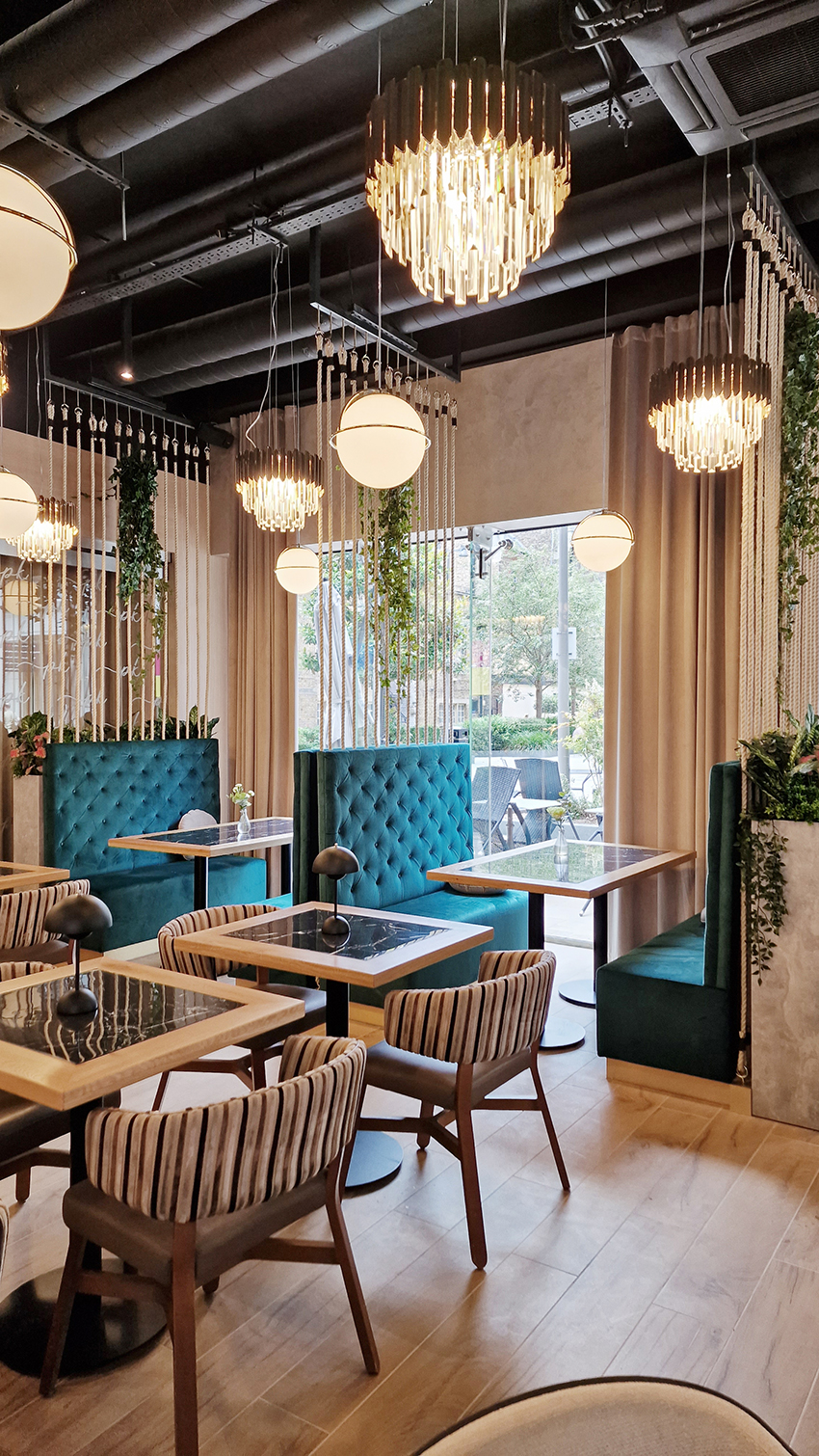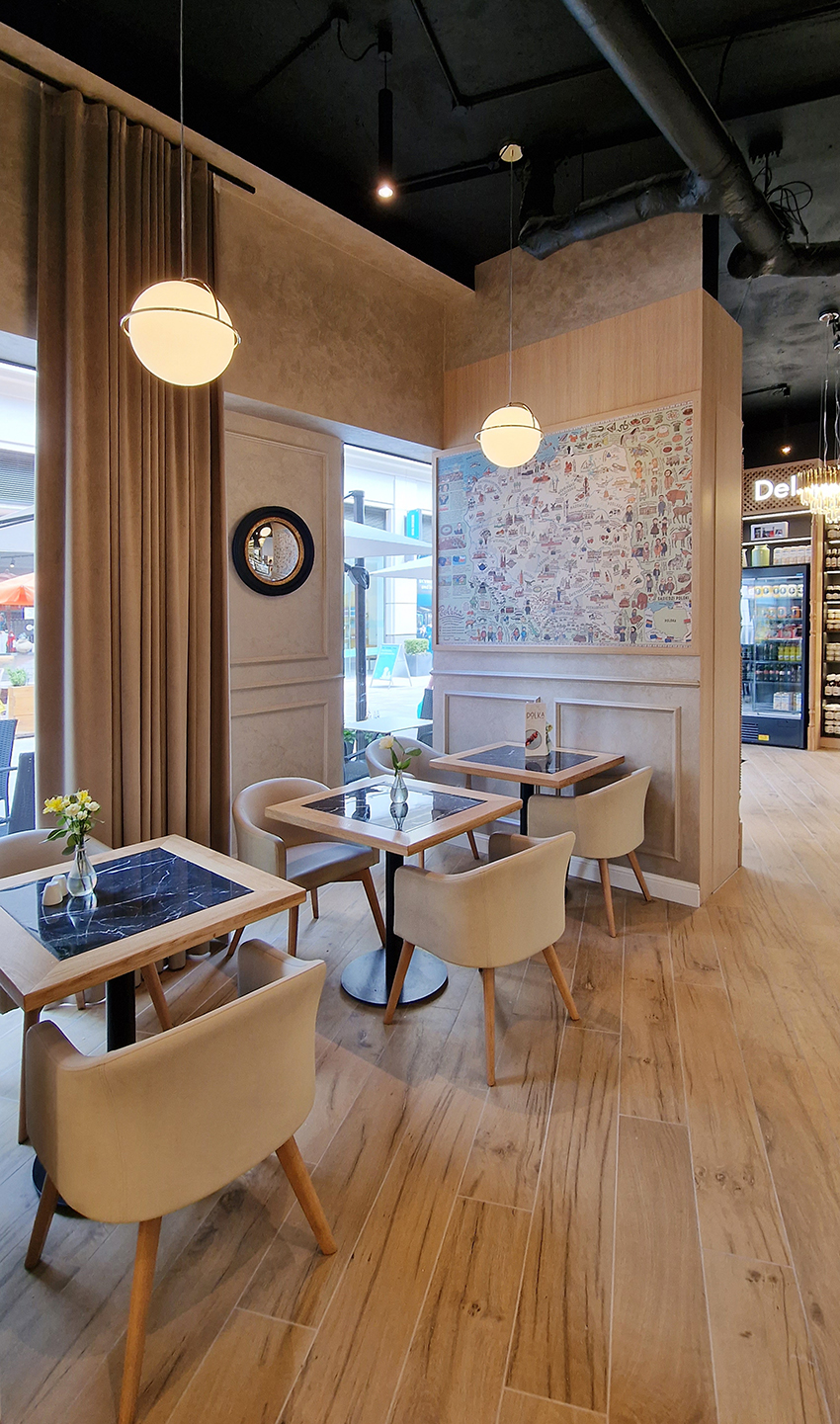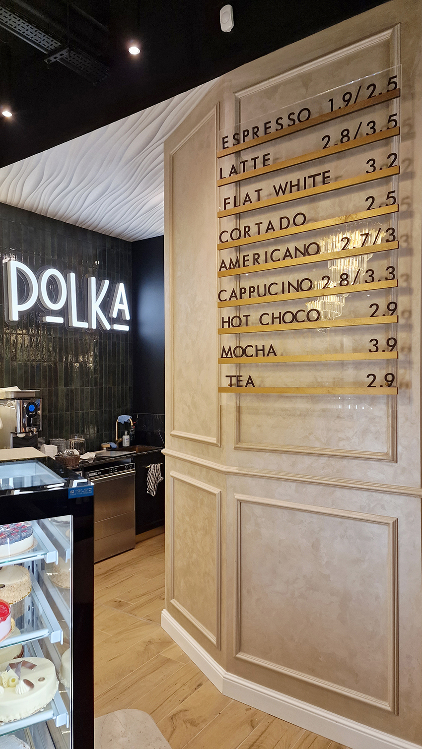 The New/Old restaurant in Ealing in East London is a real treat for locals. One of them said "From EALING to Hollywood" because he was surprised by the high level of interior furnishings. Clients asked me to move and rebrand old restaurant "Sowa Restaurant" into new, much larger premises (300 m2) in the same district of London. The place was supposed to make the WOW effect, encourage taking photos and tagging in social media as well as being distinctive and functional. From the beginning, with the participation of customers, we gave great importance to the number of seats inside and outside because this is the key to this business! A functional kitchen, storage spaces, as well as designer toilets are also our work. Dining room remains the heart of course. The main space was divided for the POLKA PATISSERIE confectionery section (formerly Sowa Patisserie) and the POLKA KITCHEN restaurant area with a bar, serving colourful drinks. Right behind it we designed the "live kitchen" – a station where dumplings (one of the most important and distinguishing Polish dish) are made. The colour scheme of the interior was kept in bottle greens, wood and white and black marble. We made this place elegant and timeless.