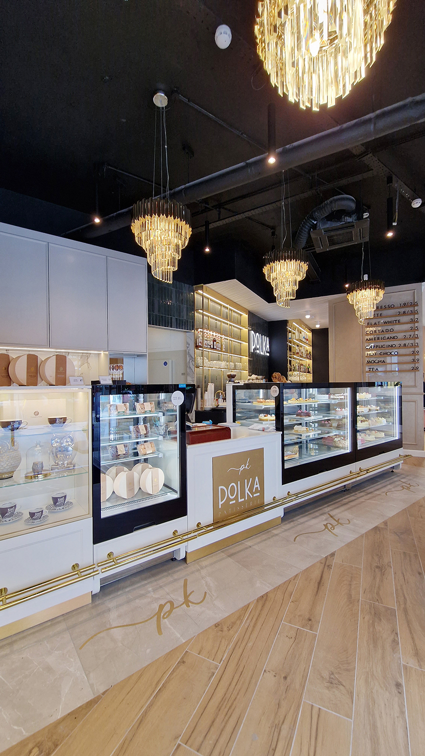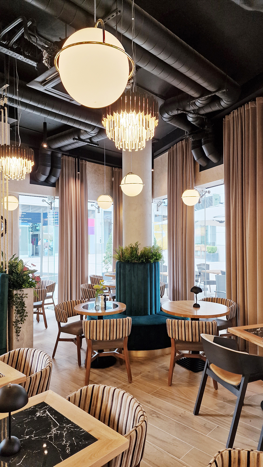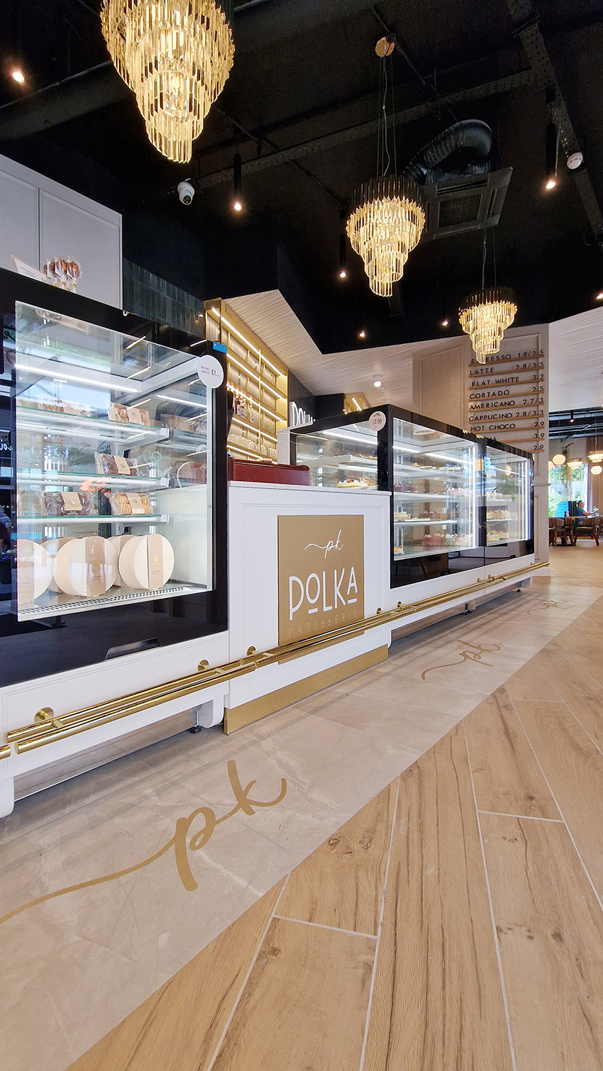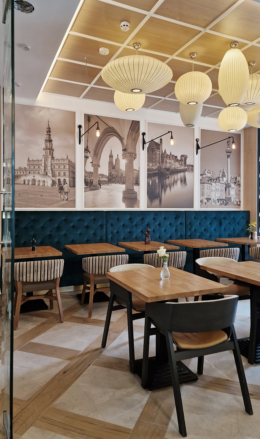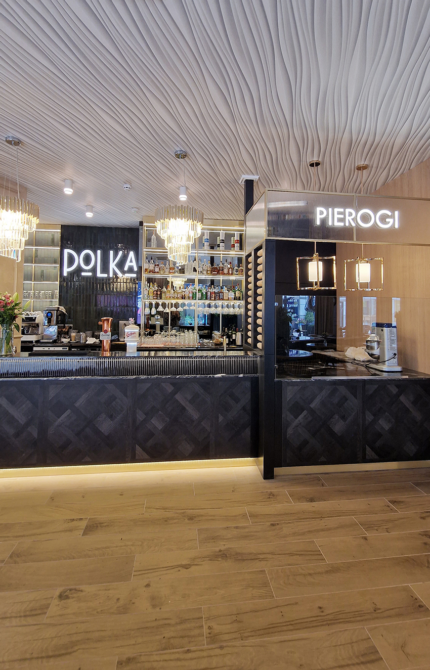 The New/Old restaurant in Ealing in East London is a real treat for locals. One of them said "From EALING to Hollywood" because he was surprised by the high level of interior furnishings. Clients asked me to move and rebrand old restaurant "Sowa Restaurant" into new, much larger premises (300 m2) in the same district of London. The place was supposed to make the WOW effect, encourage taking photos and tagging in social media as well as being distinctive and functional. From the beginning, with the participation of customers, we gave great importance to the number of seats inside and outside because this is the key to this business! A functional kitchen, storage spaces, as well as designer toilets are also our work. Dining room remains the heart of course. The main space was divided for the POLKA PATISSERIE confectionery section (formerly Sowa Patisserie) and the POLKA KITCHEN restaurant area with a bar, serving colourful drinks. Right behind it we designed the "live kitchen" – a station where dumplings (one of the most important and distinguishing Polish dish) are made. The colour scheme of the interior was kept in bottle greens, wood and white and black marble. We made this place elegant and timeless.