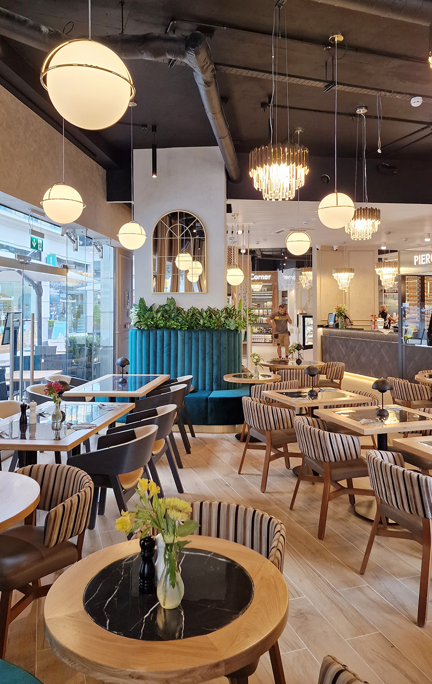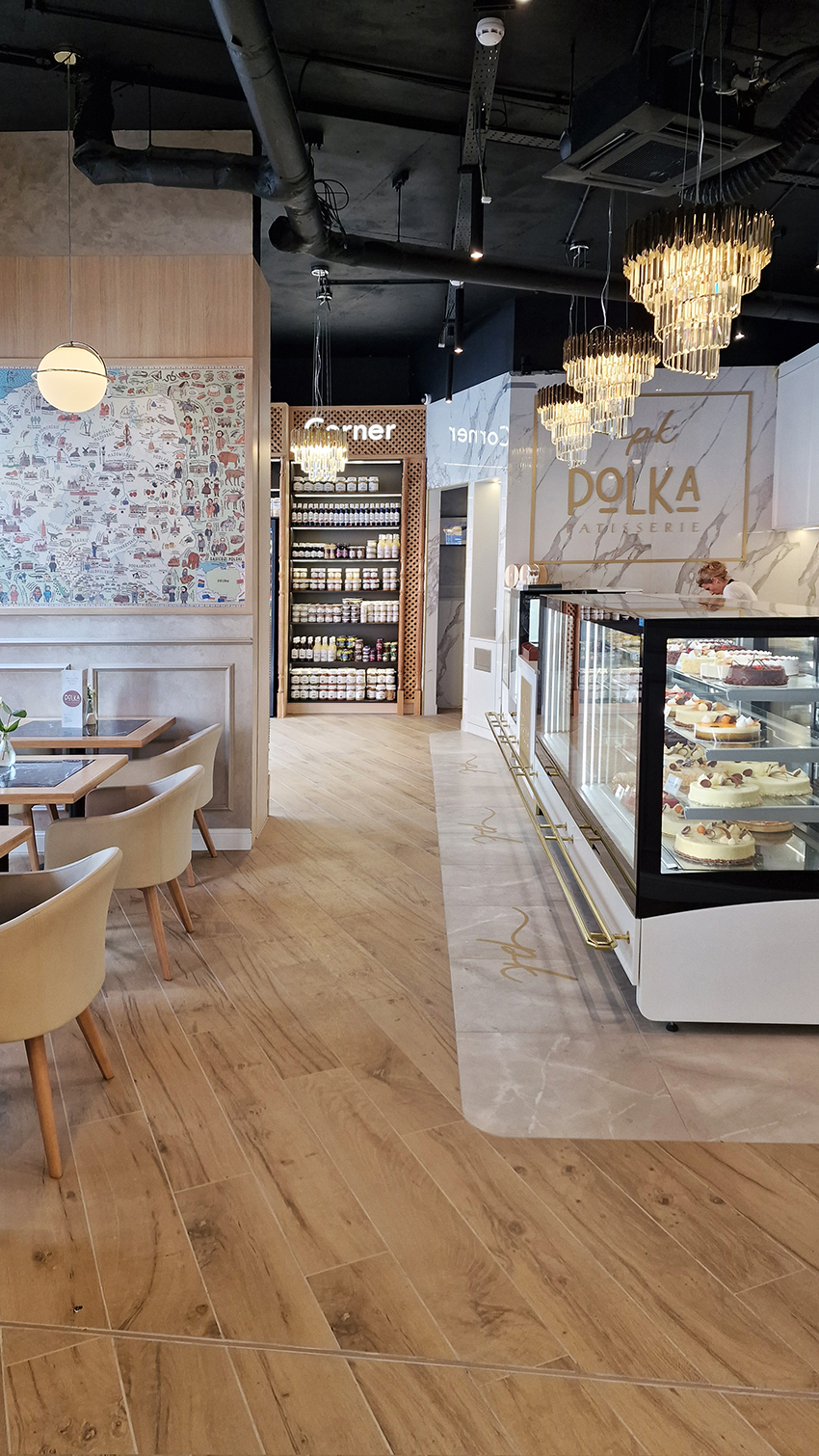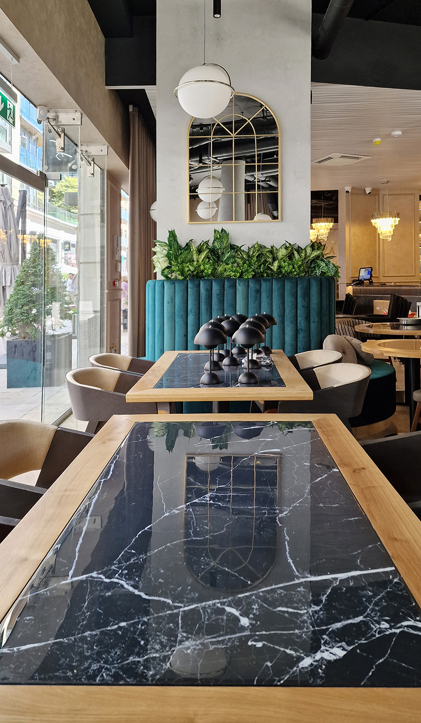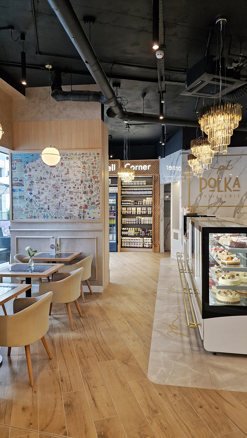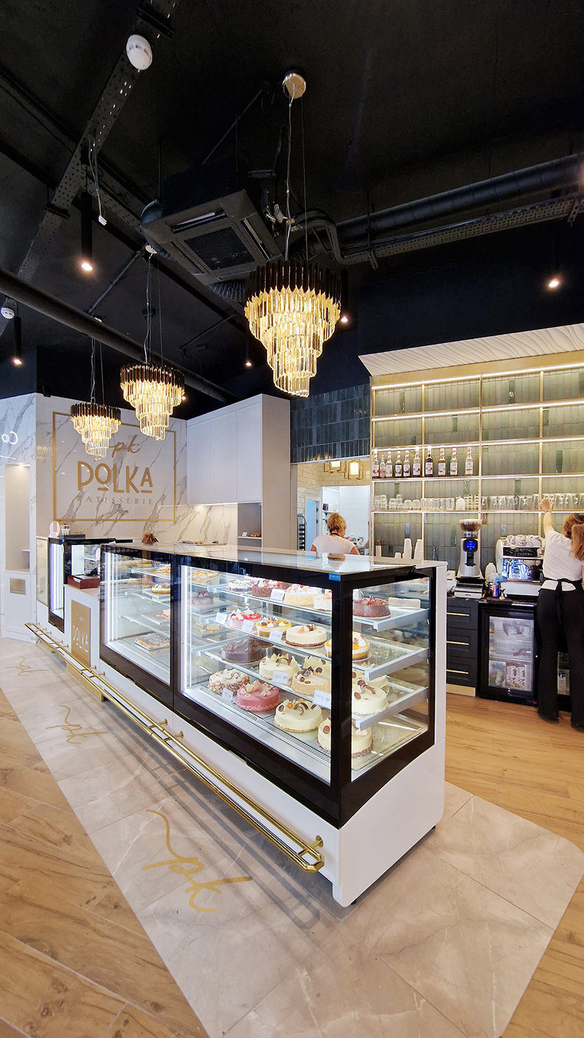 The New/Old restaurant in Ealing in East London is a real treat for locals. One of them said "From EALING to Hollywood" because he was surprised by the high level of interior furnishings. Clients asked me to move and rebrand old restaurant "Sowa Restaurant" into new, much larger premises (300 m2) in the same district of London. The place was supposed to make the WOW effect, encourage taking photos and tagging in social media as well as being distinctive and functional. From the beginning, with the participation of customers, we gave great importance to the number of seats inside and outside because this is the key to this business! A functional kitchen, storage spaces, as well as designer toilets are also our work. Dining room remains the heart of course. The main space was divided for the POLKA PATISSERIE confectionery section (formerly Sowa Patisserie) and the POLKA KITCHEN restaurant area with a bar, serving colourful drinks. Right behind it we designed the "live kitchen" – a station where dumplings (one of the most important and distinguishing Polish dish) are made. The colour scheme of the interior was kept in bottle greens, wood and white and black marble. We made this place elegant and timeless.