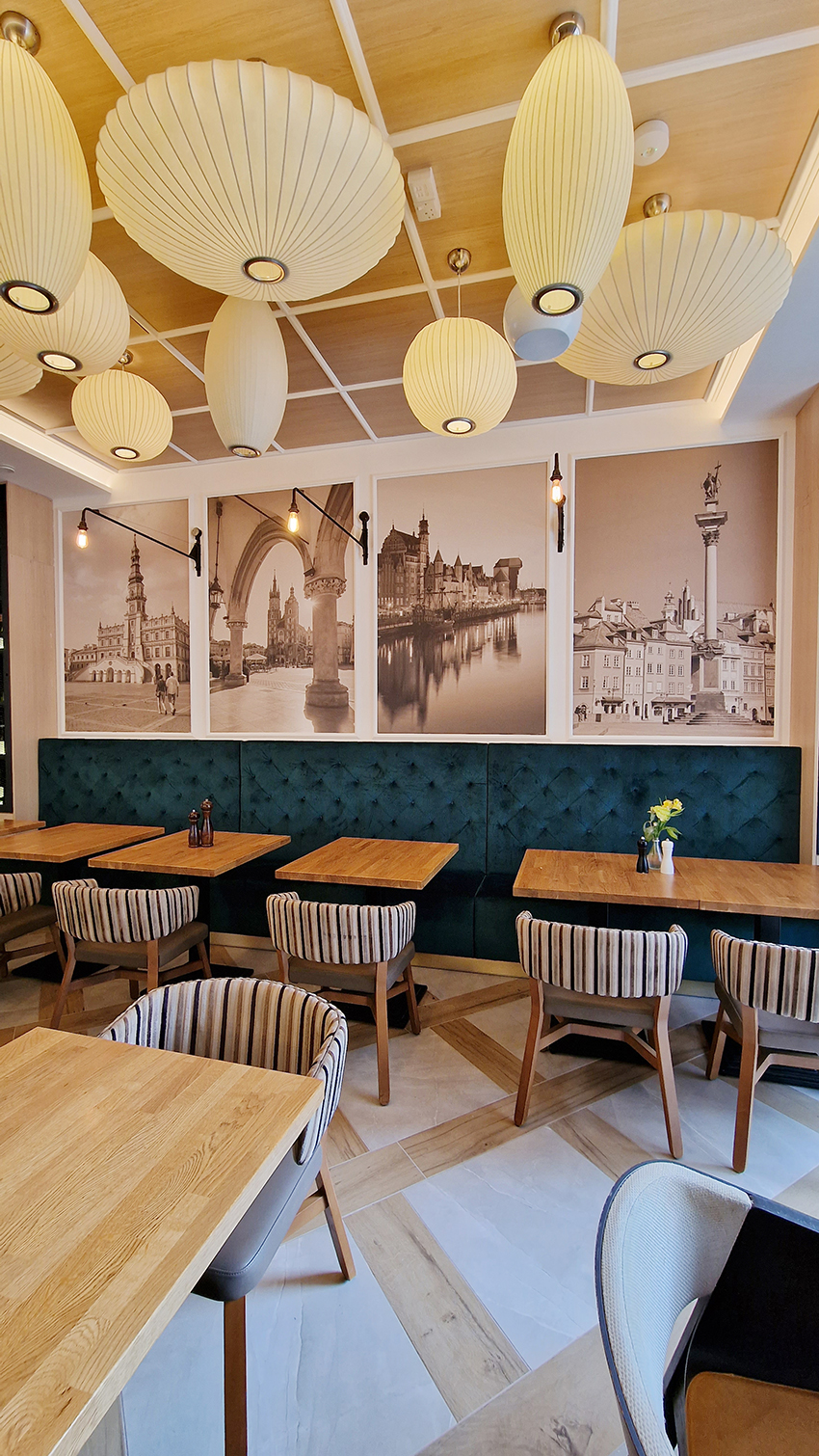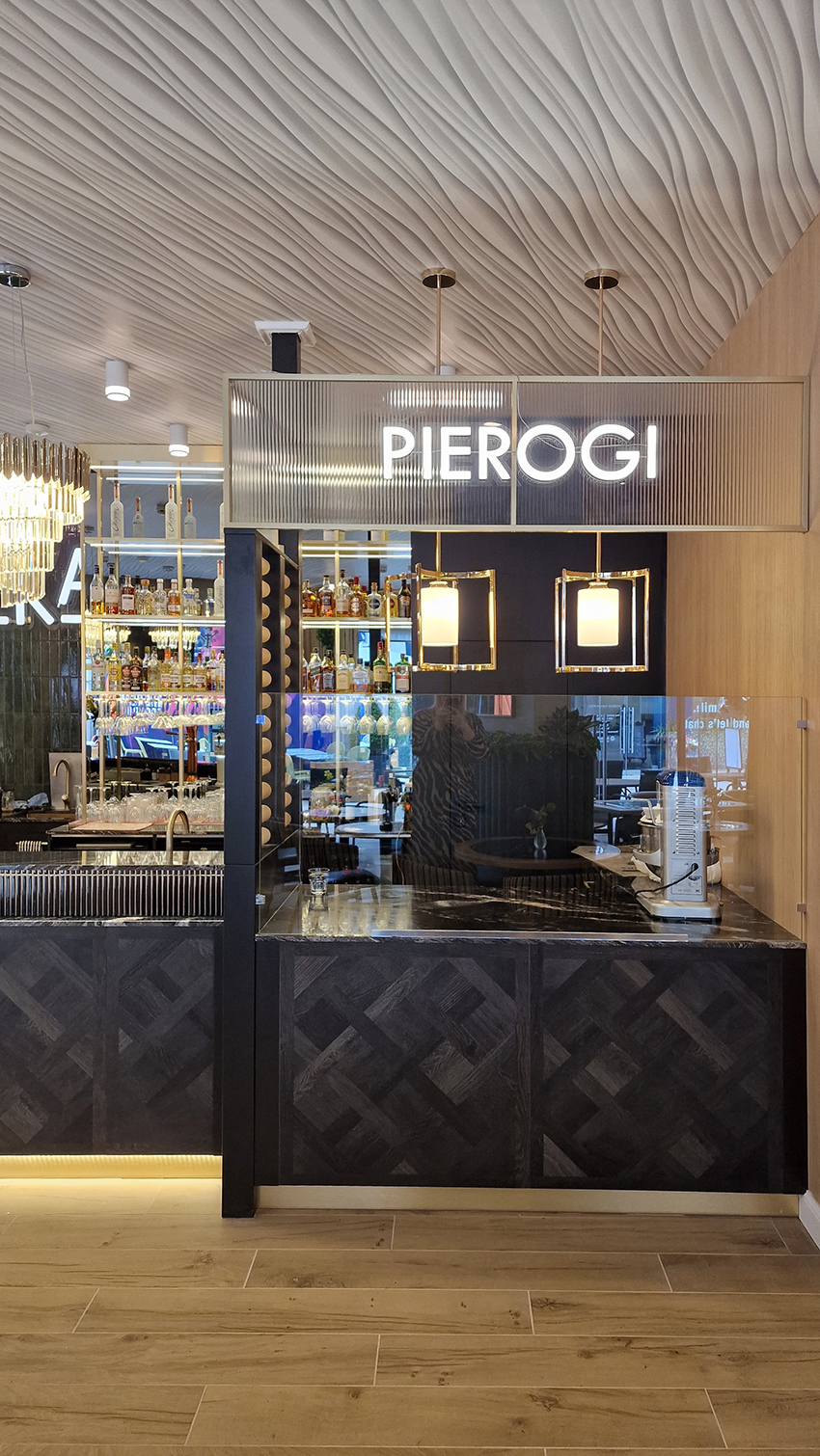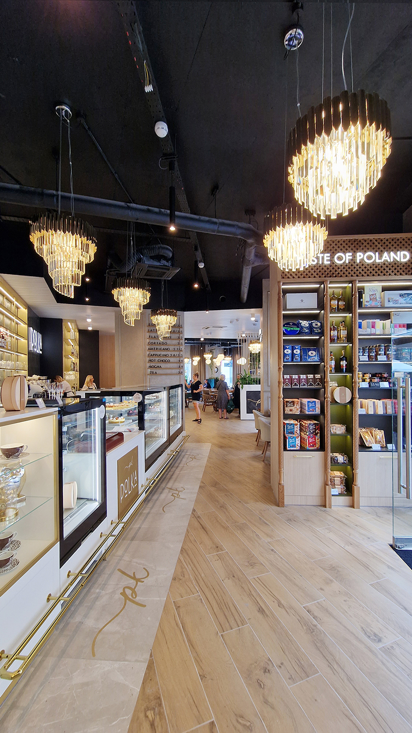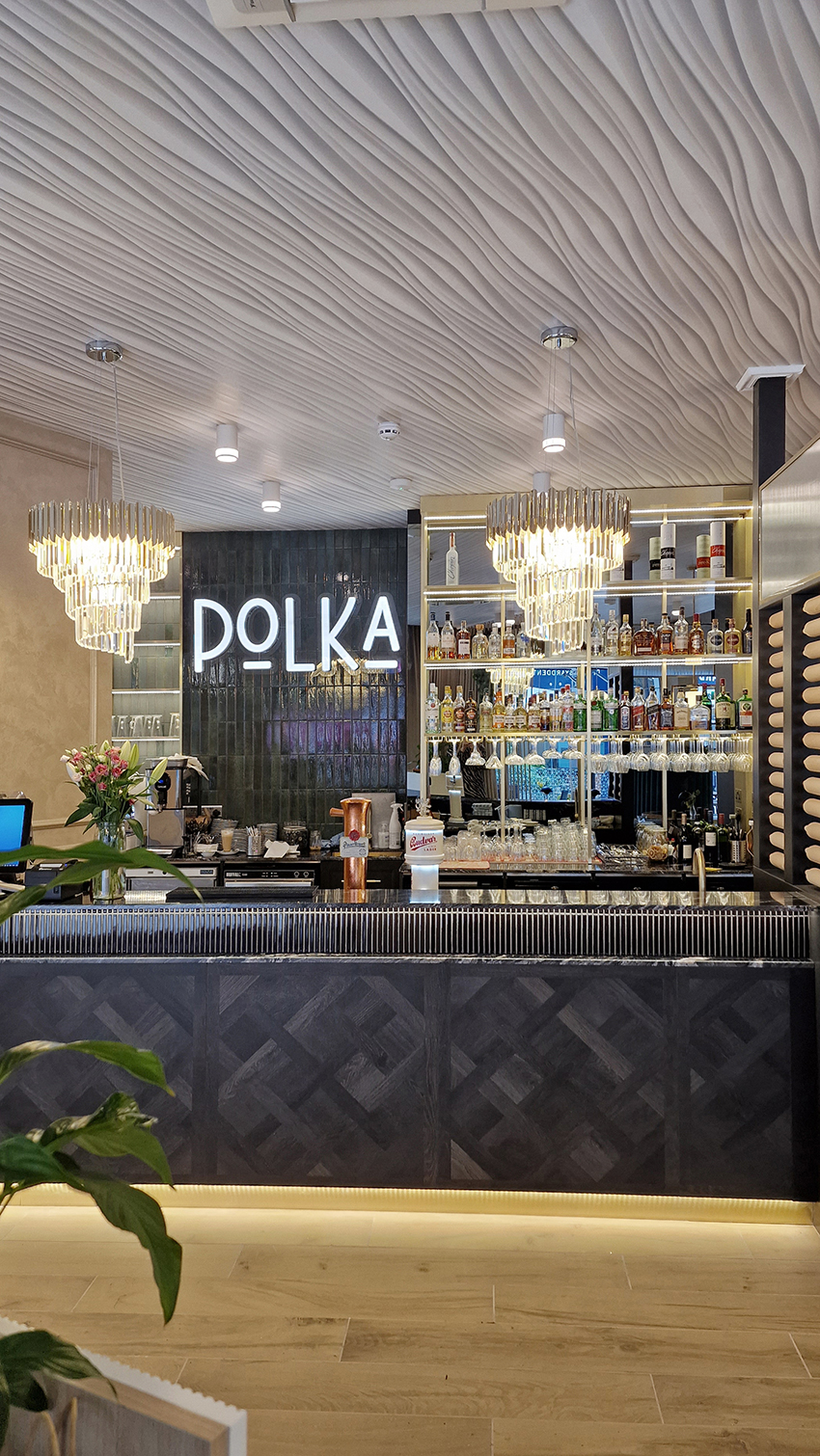 The New/Old restaurant in Ealing in East London is a real treat for locals. One of them said "From EALING to Hollywood" because he was surprised by the high level of interior furnishings. Clients asked me to move and rebrand old restaurant "Sowa Restaurant" into new, much larger premises (300 m2) in the same district of London. The place was supposed to make the WOW effect, encourage taking photos and tagging in social media as well as being distinctive and functional. From the beginning, with the participation of customers, we gave great importance to the number of seats inside and outside because this is the key to this business! A functional kitchen, storage spaces, as well as designer toilets are also our work. Dining room remains the heart of course. The main space was divided for the POLKA PATISSERIE confectionery section (formerly Sowa Patisserie) and the POLKA KITCHEN restaurant area with a bar, serving colourful drinks. Right behind it we designed the "live kitchen" – a station where dumplings (one of the most important and distinguishing Polish dish) are made. The colour scheme of the interior was kept in bottle greens, wood and white and black marble. We made this place elegant and timeless.