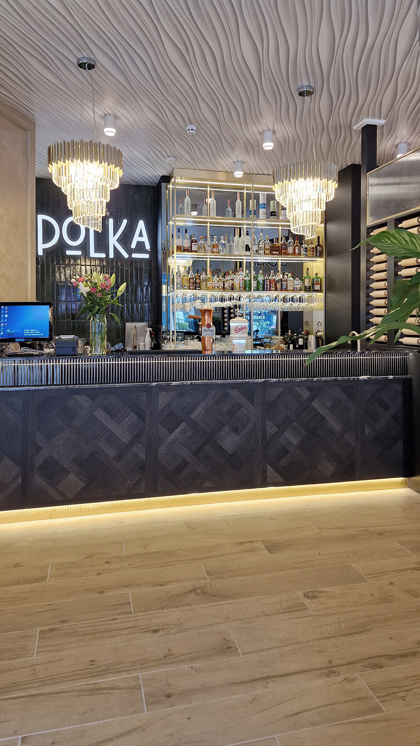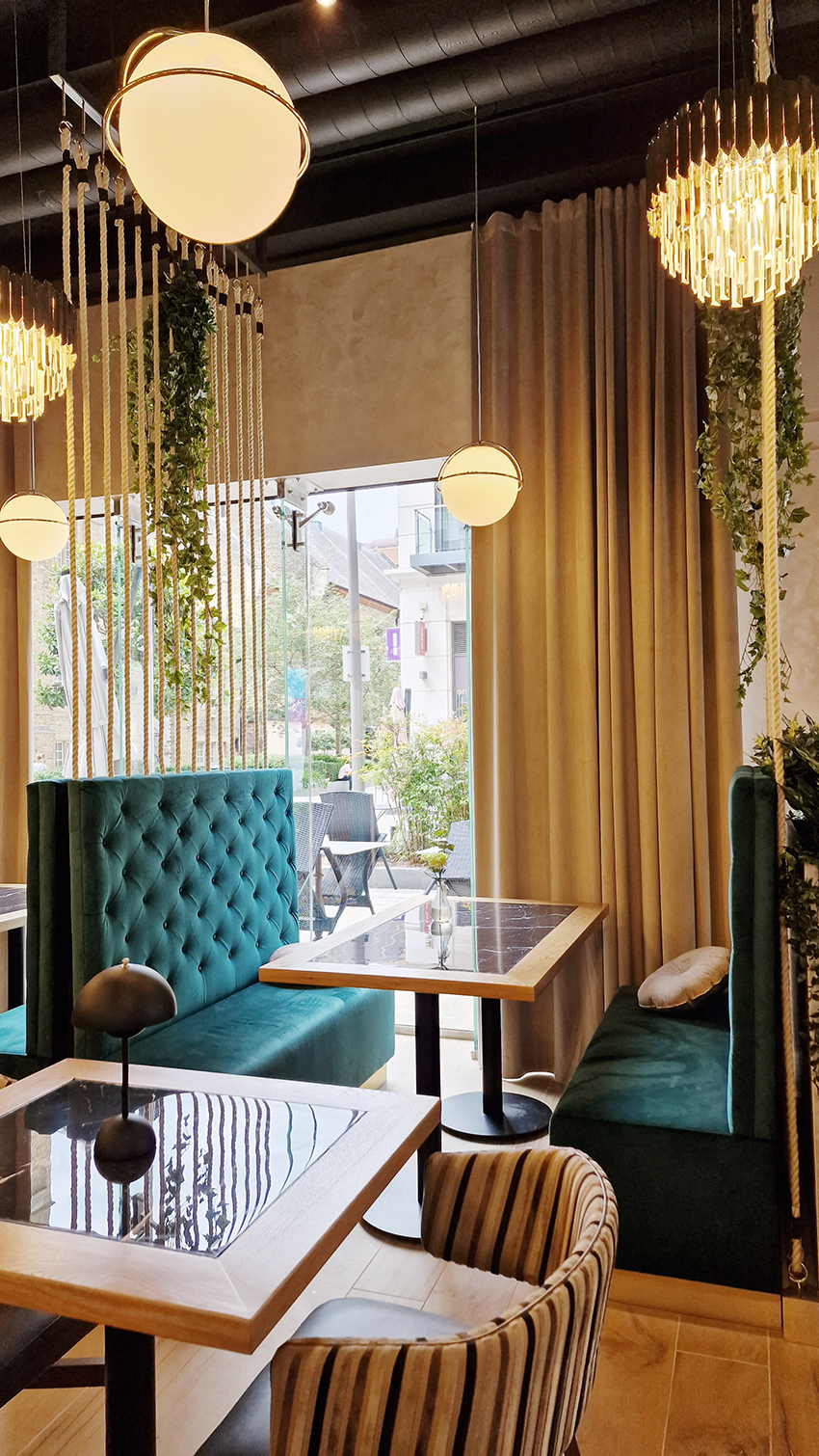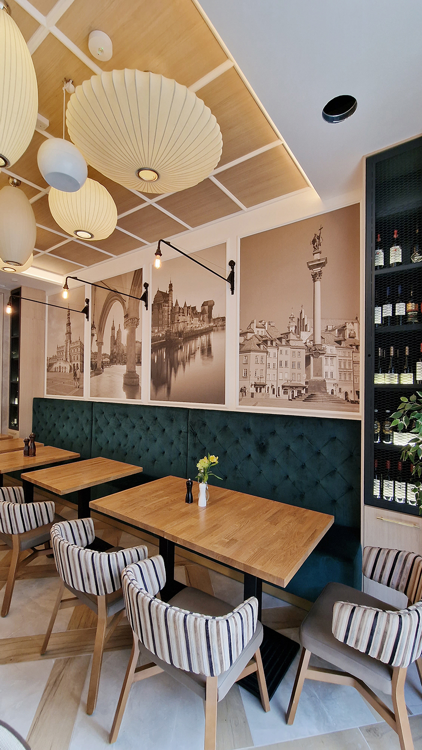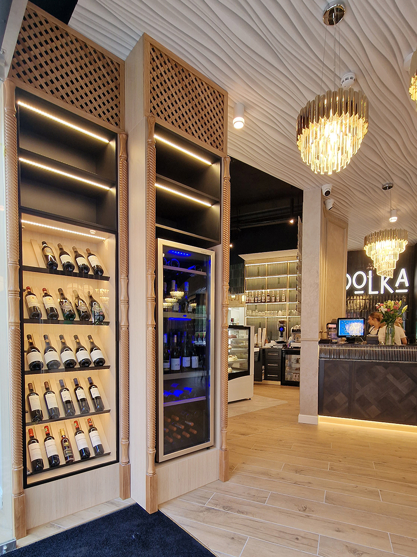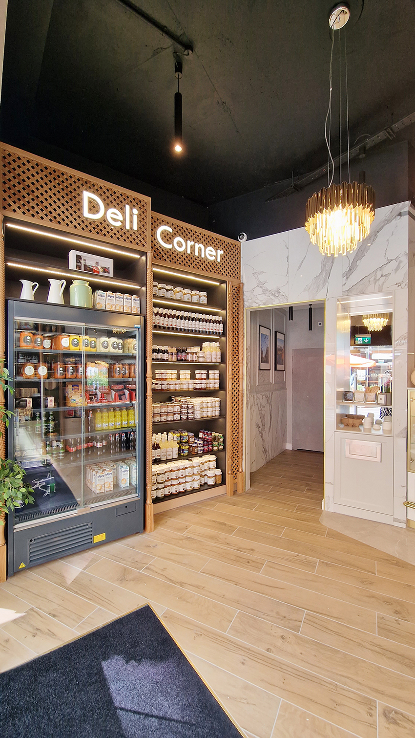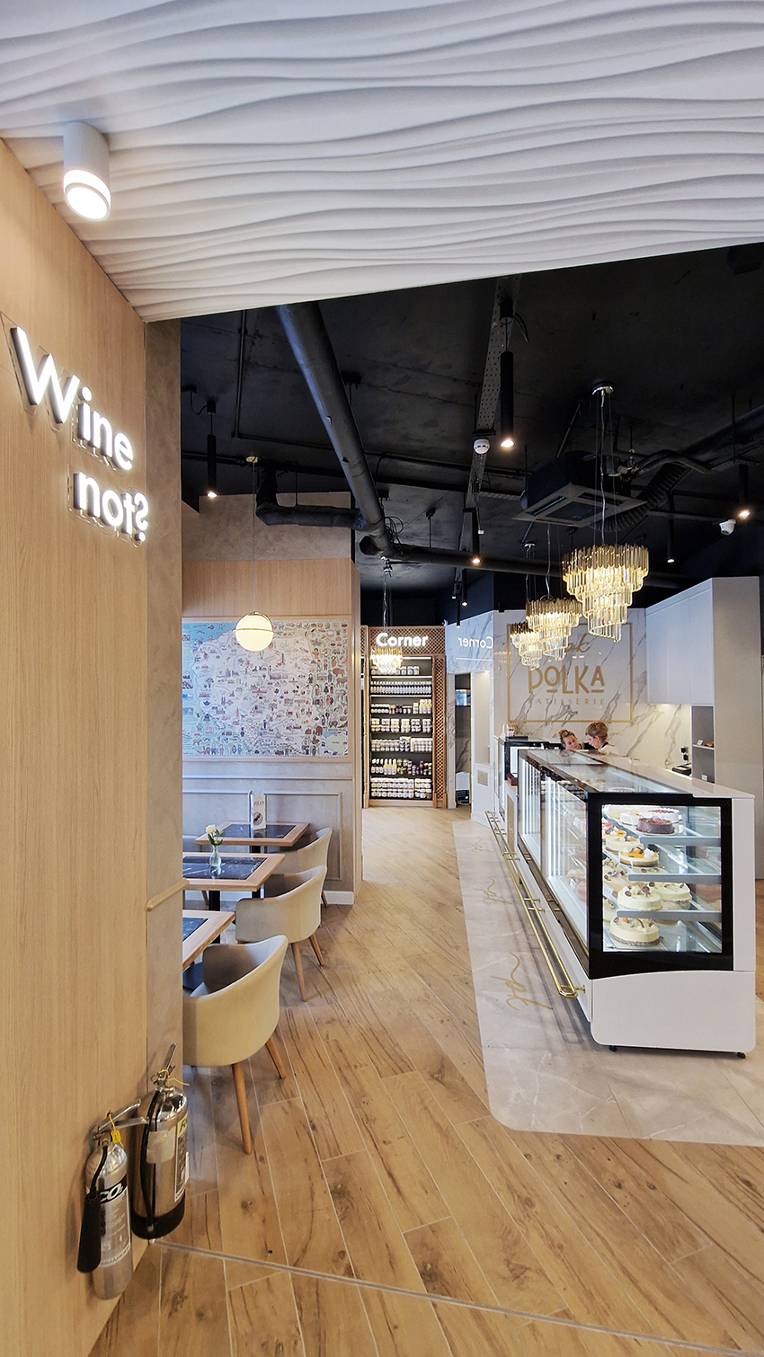 The New/Old restaurant in Ealing in East London is a real treat for locals. One of them said "From EALING to Hollywood" because he was surprised by the high level of interior furnishings. Clients asked me to move and rebrand old restaurant "Sowa Restaurant" into new, much larger premises (300 m2) in the same district of London. The place was supposed to make the WOW effect, encourage taking photos and tagging in social media as well as being distinctive and functional. From the beginning, with the participation of customers, we gave great importance to the number of seats inside and outside because this is the key to this business! A functional kitchen, storage spaces, as well as designer toilets are also our work. Dining room remains the heart of course. The main space was divided for the POLKA PATISSERIE confectionery section (formerly Sowa Patisserie) and the POLKA KITCHEN restaurant area with a bar, serving colourful drinks. Right behind it we designed the "live kitchen" – a station where dumplings (one of the most important and distinguishing Polish dish) are made. The colour scheme of the interior was kept in bottle greens, wood and white and black marble. We made this place elegant and timeless.