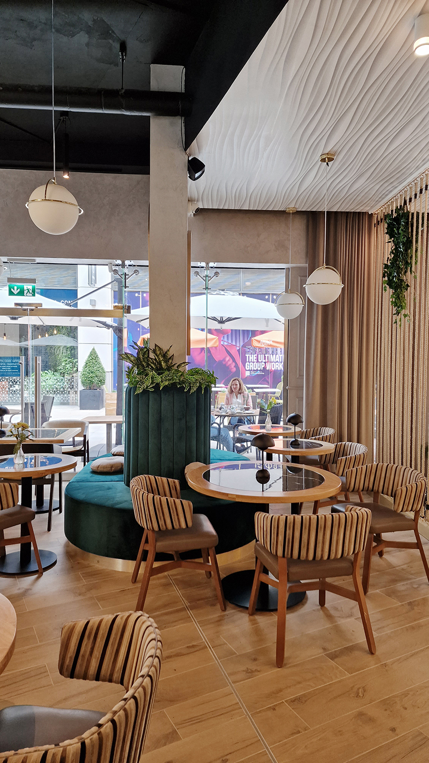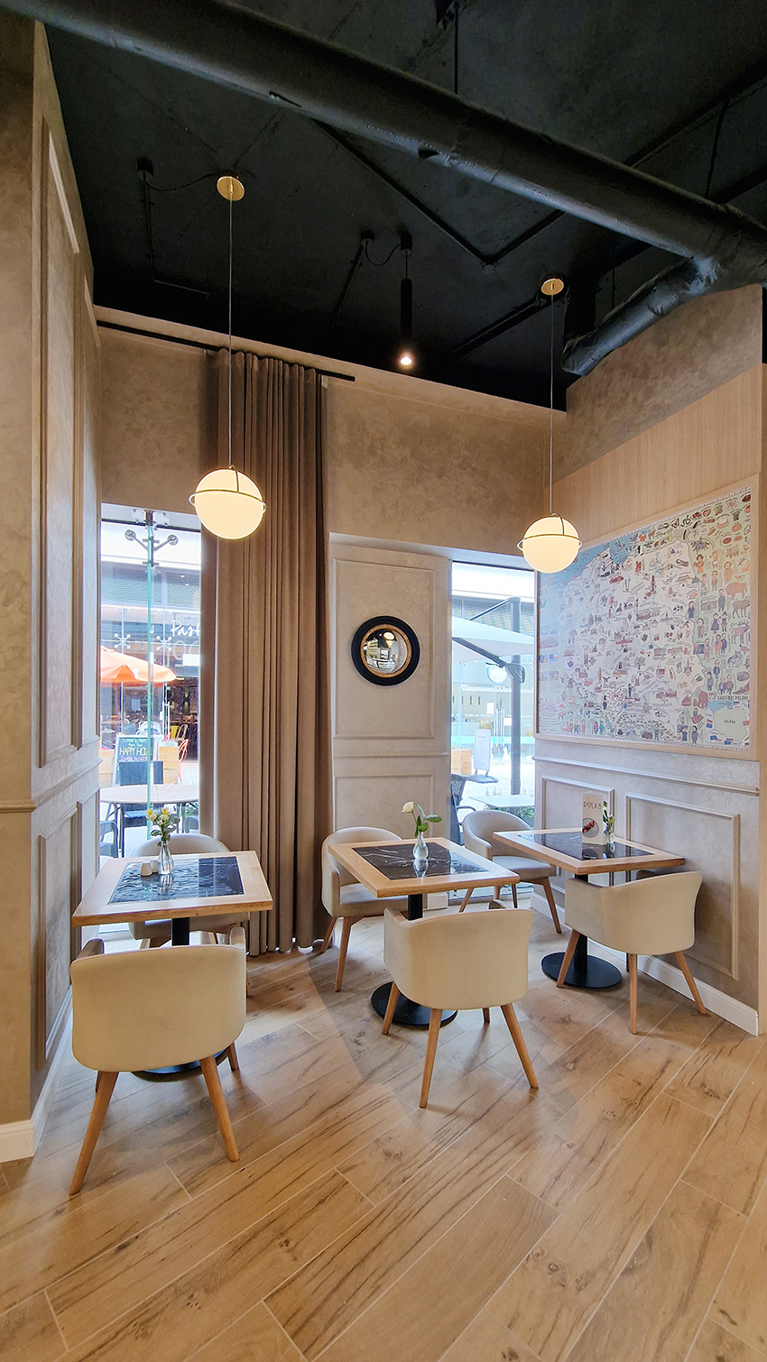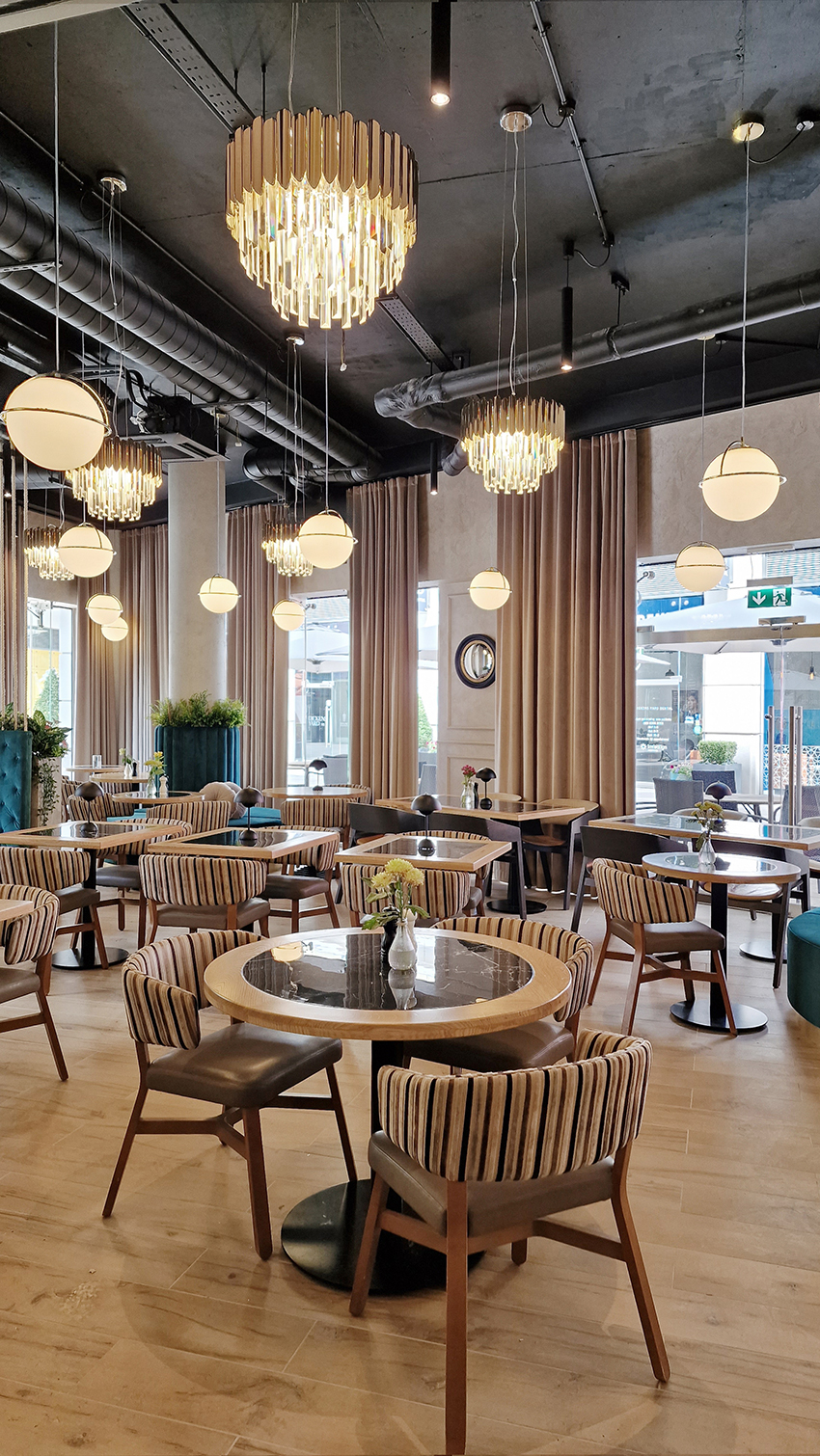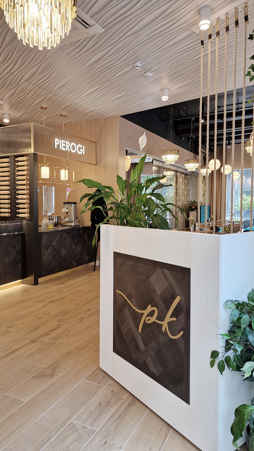 The New/Old restaurant in Ealing in East London is a real treat for locals. One of them said "From EALING to Hollywood" because he was surprised by the high level of interior furnishings. Clients asked me to move and rebrand old restaurant "Sowa Restaurant" into new, much larger premises (300 m2) in the same district of London. The place was supposed to make the WOW effect, encourage taking photos and tagging in social media as well as being distinctive and functional. From the beginning, with the participation of customers, we gave great importance to the number of seats inside and outside because this is the key to this business! A functional kitchen, storage spaces, as well as designer toilets are also our work. Dining room remains the heart of course. The main space was divided for the POLKA PATISSERIE confectionery section (formerly Sowa Patisserie) and the POLKA KITCHEN restaurant area with a bar, serving colourful drinks. Right behind it we designed the "live kitchen" – a station where dumplings (one of the most important and distinguishing Polish dish) are made. The colour scheme of the interior was kept in bottle greens, wood and white and black marble. We made this place elegant and timeless.