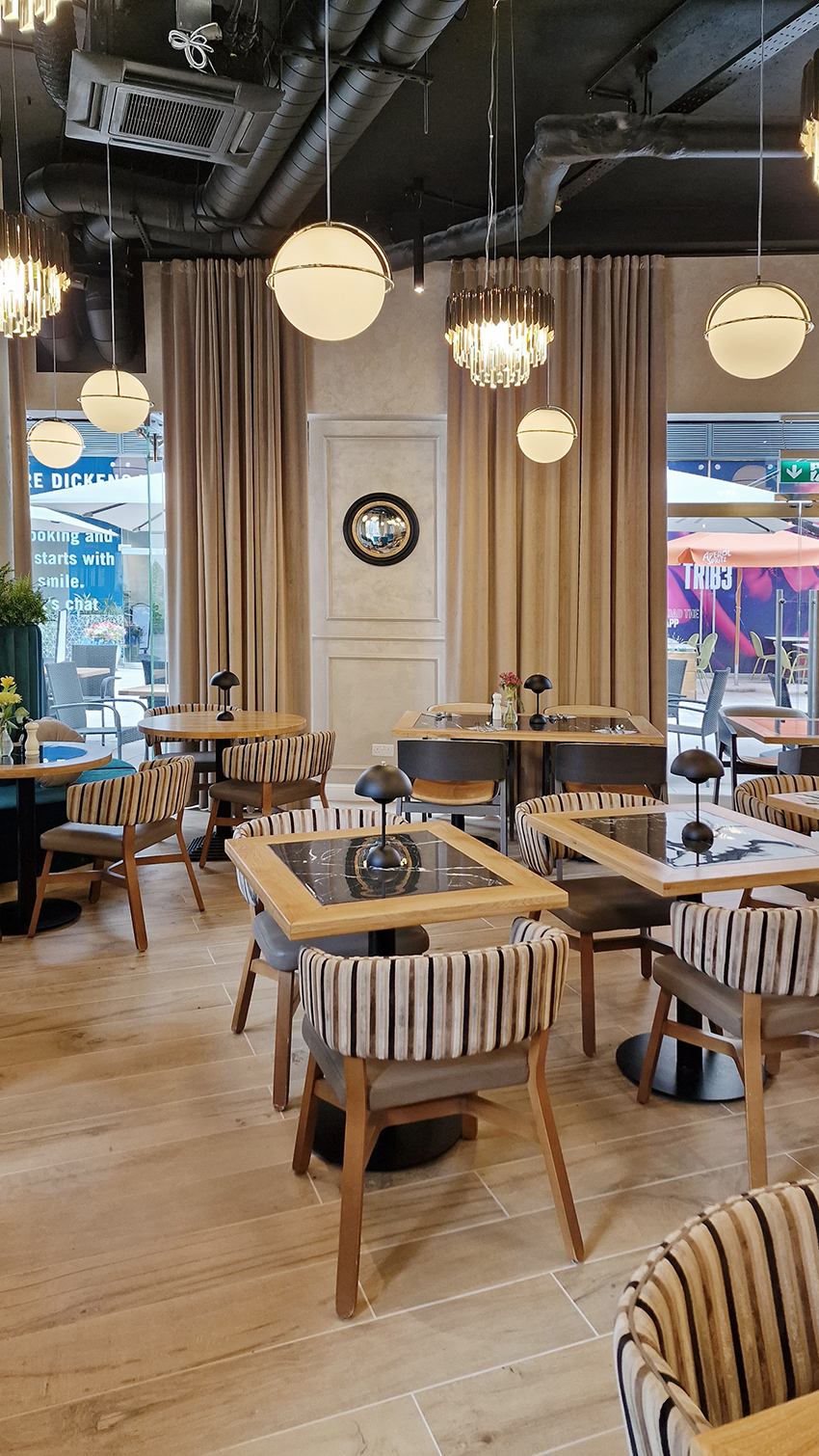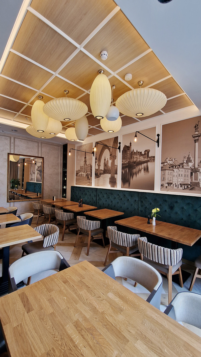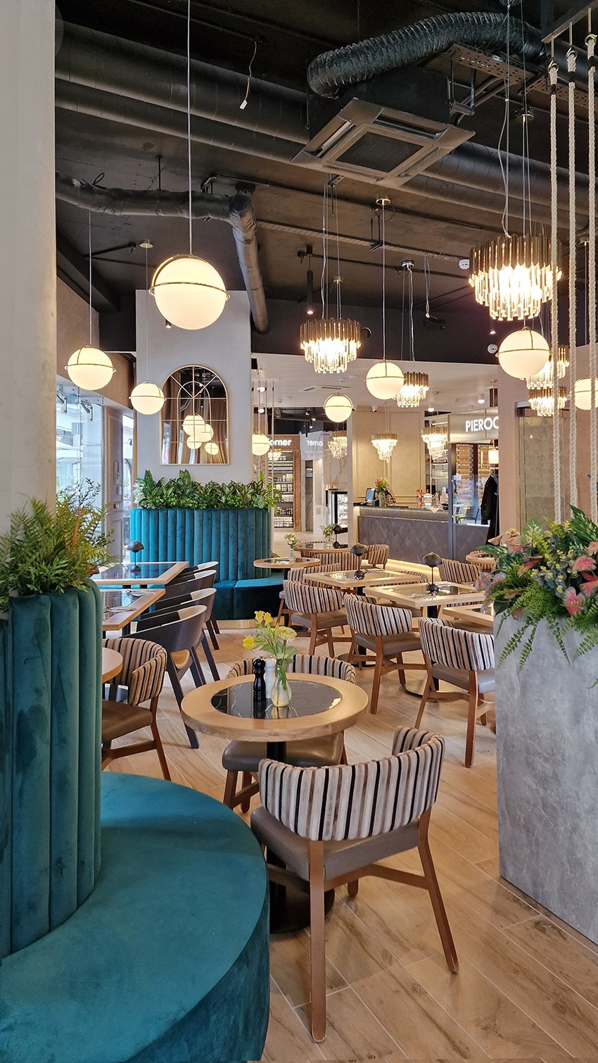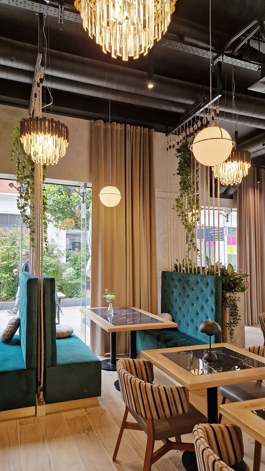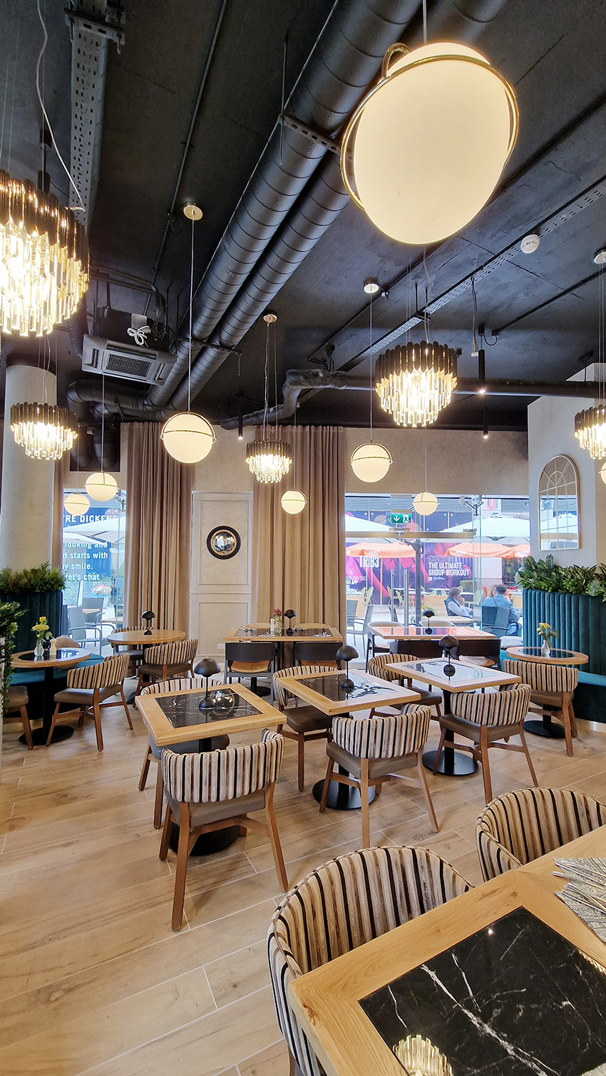 The New/Old restaurant in Ealing in East London is a real treat for locals. One of them said "From EALING to Hollywood" because he was surprised by the high level of interior furnishings. Clients asked me to move and rebrand old restaurant "Sowa Restaurant" into new, much larger premises (300 m2) in the same district of London. The place was supposed to make the WOW effect, encourage taking photos and tagging in social media as well as being distinctive and functional. From the beginning, with the participation of customers, we gave great importance to the number of seats inside and outside because this is the key to this business! A functional kitchen, storage spaces, as well as designer toilets are also our work. Dining room remains the heart of course. The main space was divided for the POLKA PATISSERIE confectionery section (formerly Sowa Patisserie) and the POLKA KITCHEN restaurant area with a bar, serving colourful drinks. Right behind it we designed the "live kitchen" – a station where dumplings (one of the most important and distinguishing Polish dish) are made. The colour scheme of the interior was kept in bottle greens, wood and white and black marble. We made this place elegant and timeless.