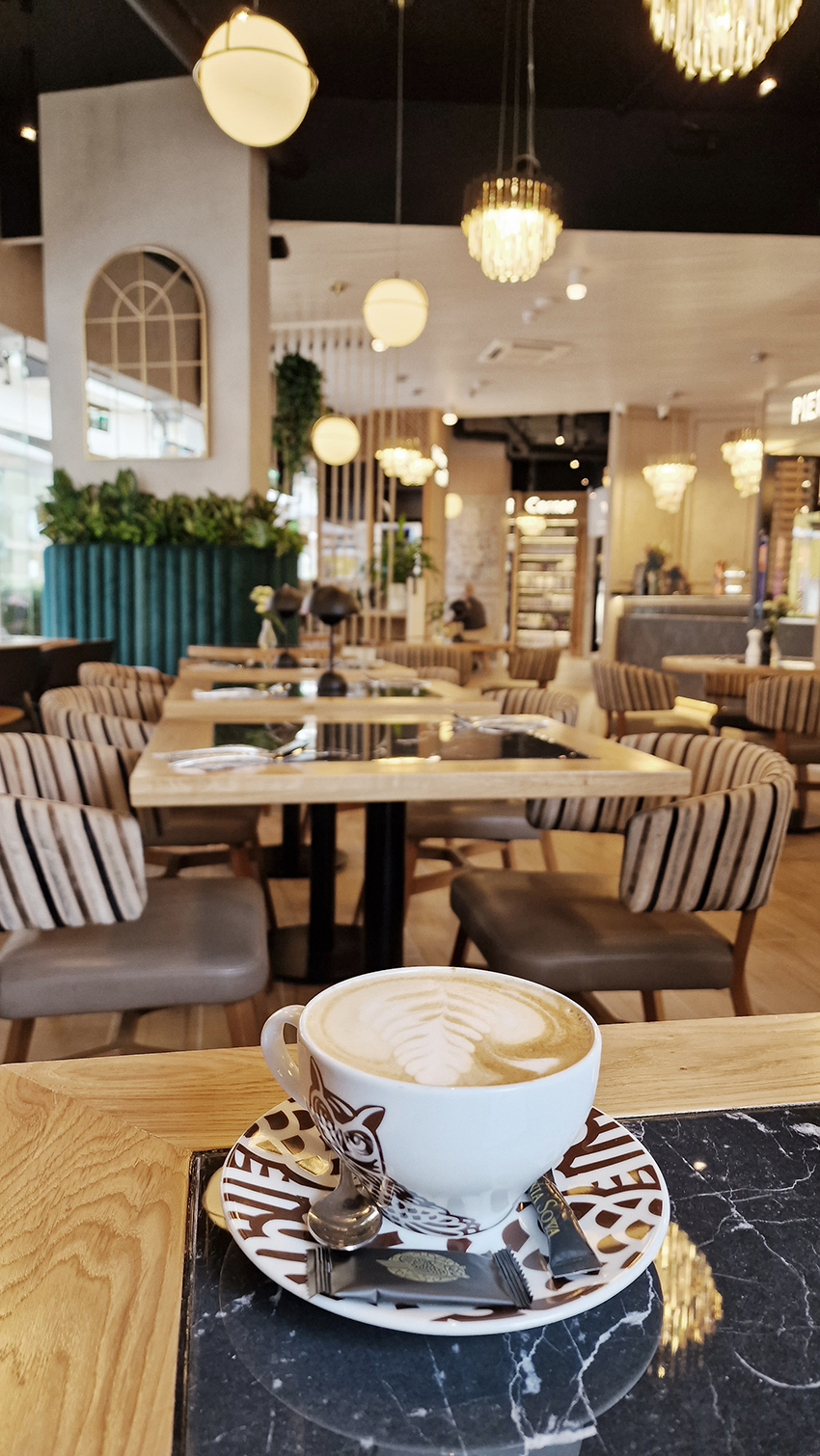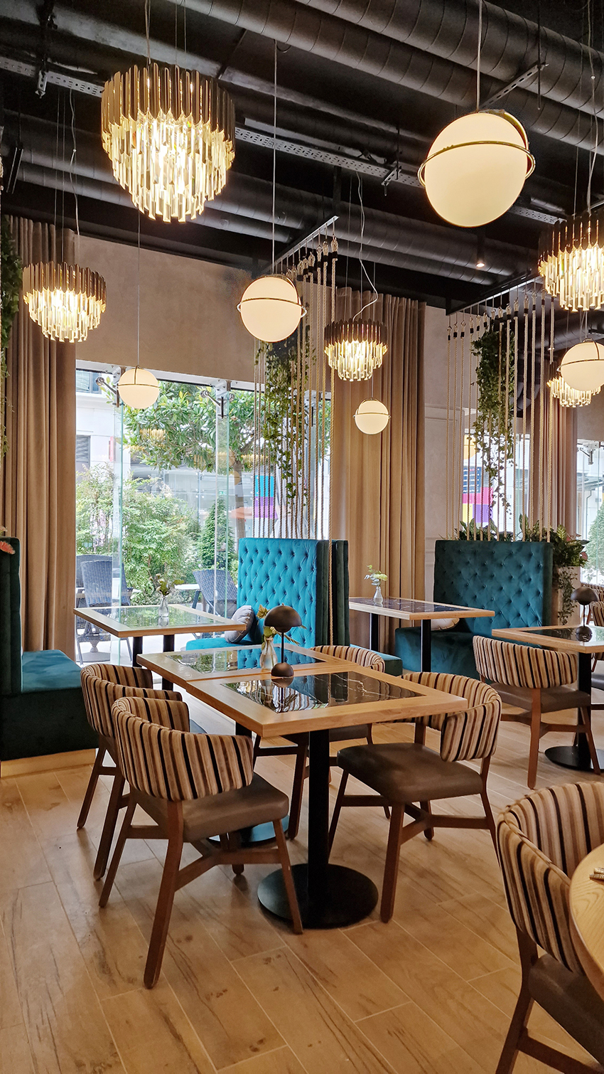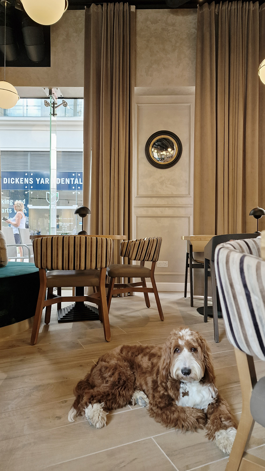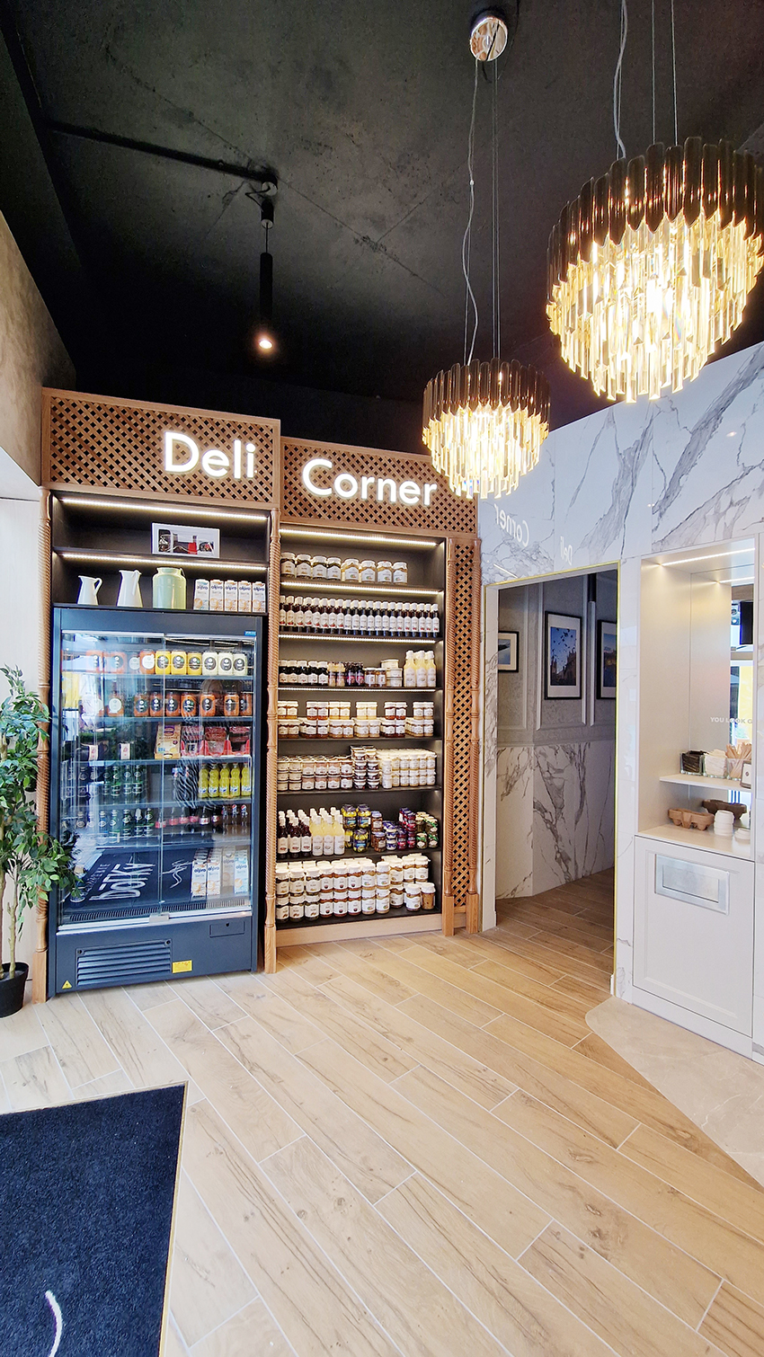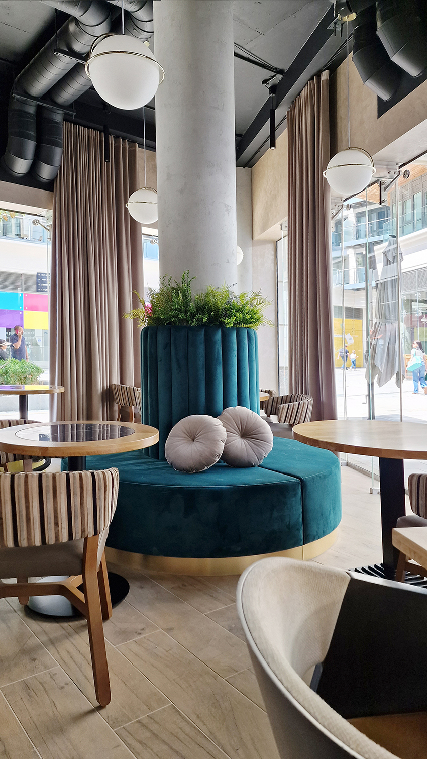 The New/Old restaurant in Ealing in East London is a real treat for locals. One of them said "From EALING to Hollywood" because he was surprised by the high level of interior furnishings. Clients asked me to move and rebrand old restaurant "Sowa Restaurant" into new, much larger premises (300 m2) in the same district of London. The place was supposed to make the WOW effect, encourage taking photos and tagging in social media as well as being distinctive and functional. From the beginning, with the participation of customers, we gave great importance to the number of seats inside and outside because this is the key to this business! A functional kitchen, storage spaces, as well as designer toilets are also our work. Dining room remains the heart of course. The main space was divided for the POLKA PATISSERIE confectionery section (formerly Sowa Patisserie) and the POLKA KITCHEN restaurant area with a bar, serving colourful drinks. Right behind it we designed the "live kitchen" – a station where dumplings (one of the most important and distinguishing Polish dish) are made. The colour scheme of the interior was kept in bottle greens, wood and white and black marble. We made this place elegant and timeless.