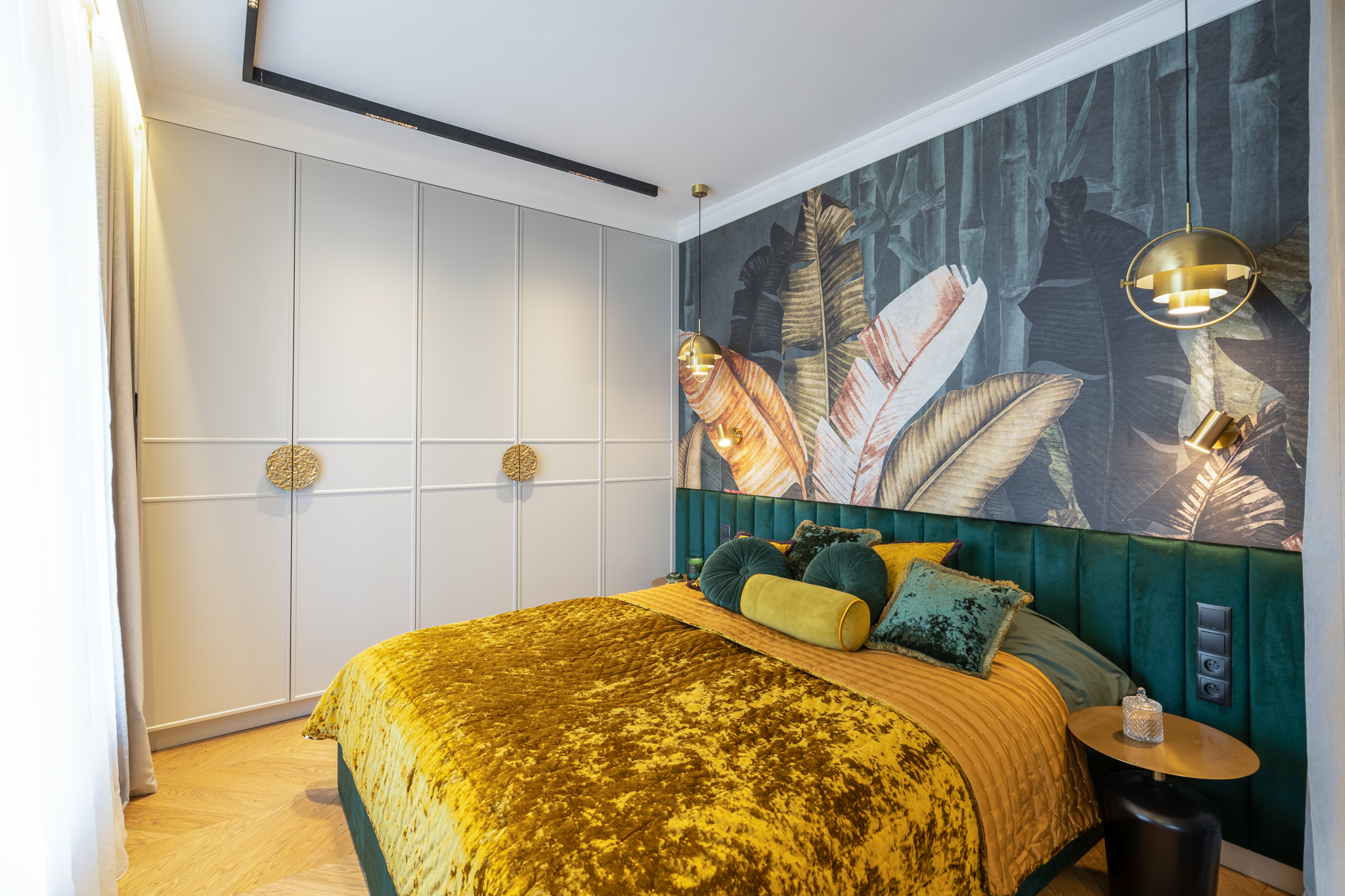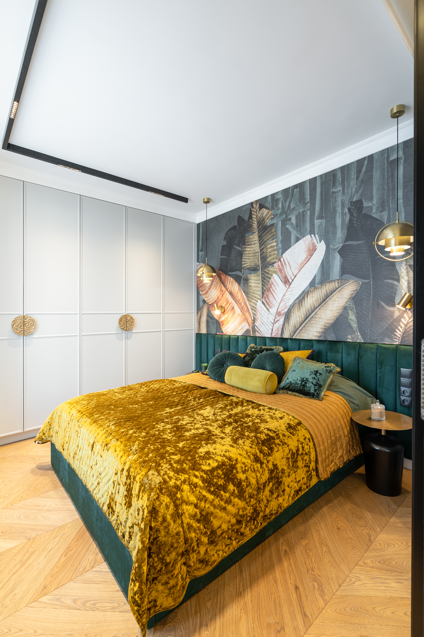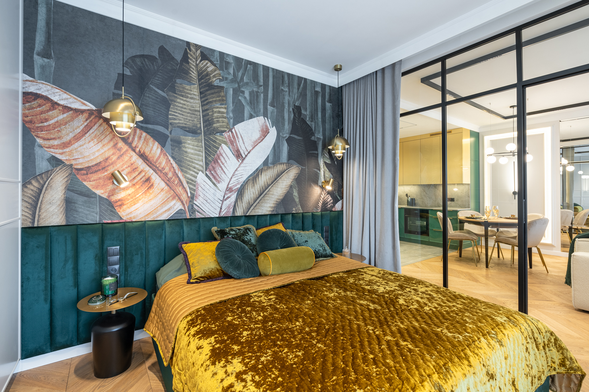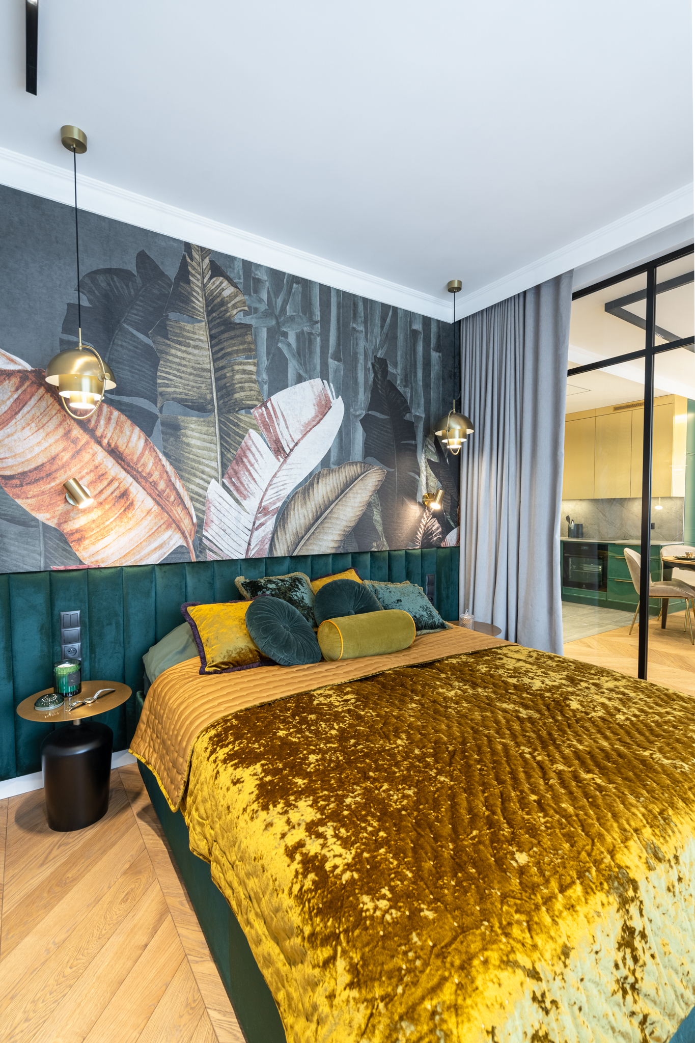 The apartment in PORTOVA is our 5th realisation of the interior in this INVEST KOMFORT devloper investment in Gdynia. We try to make each interior unique, which is why this apartment has been decorated in gold and bottle green. The wallpapers that completed the design in the bedroom and in the shower perfectly represent the "jungle" trend and the name of this project. The area of the apartment is a living room with a kitchenette, a hall, a bathroom, and a bedroom which