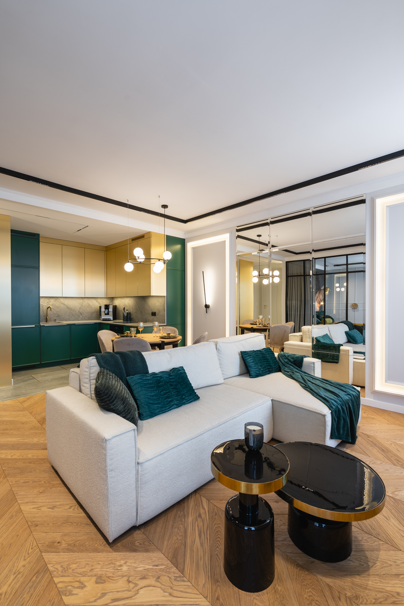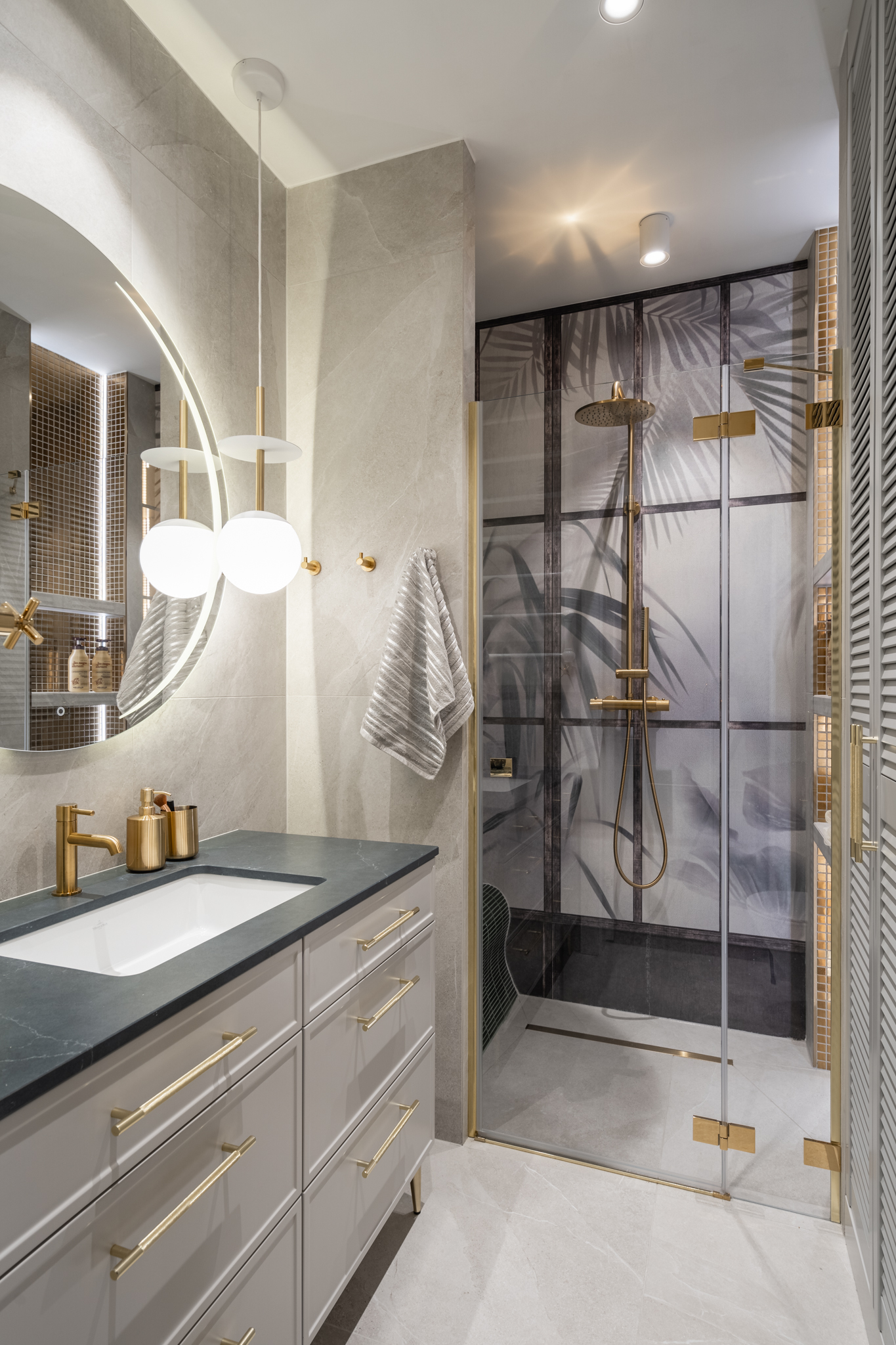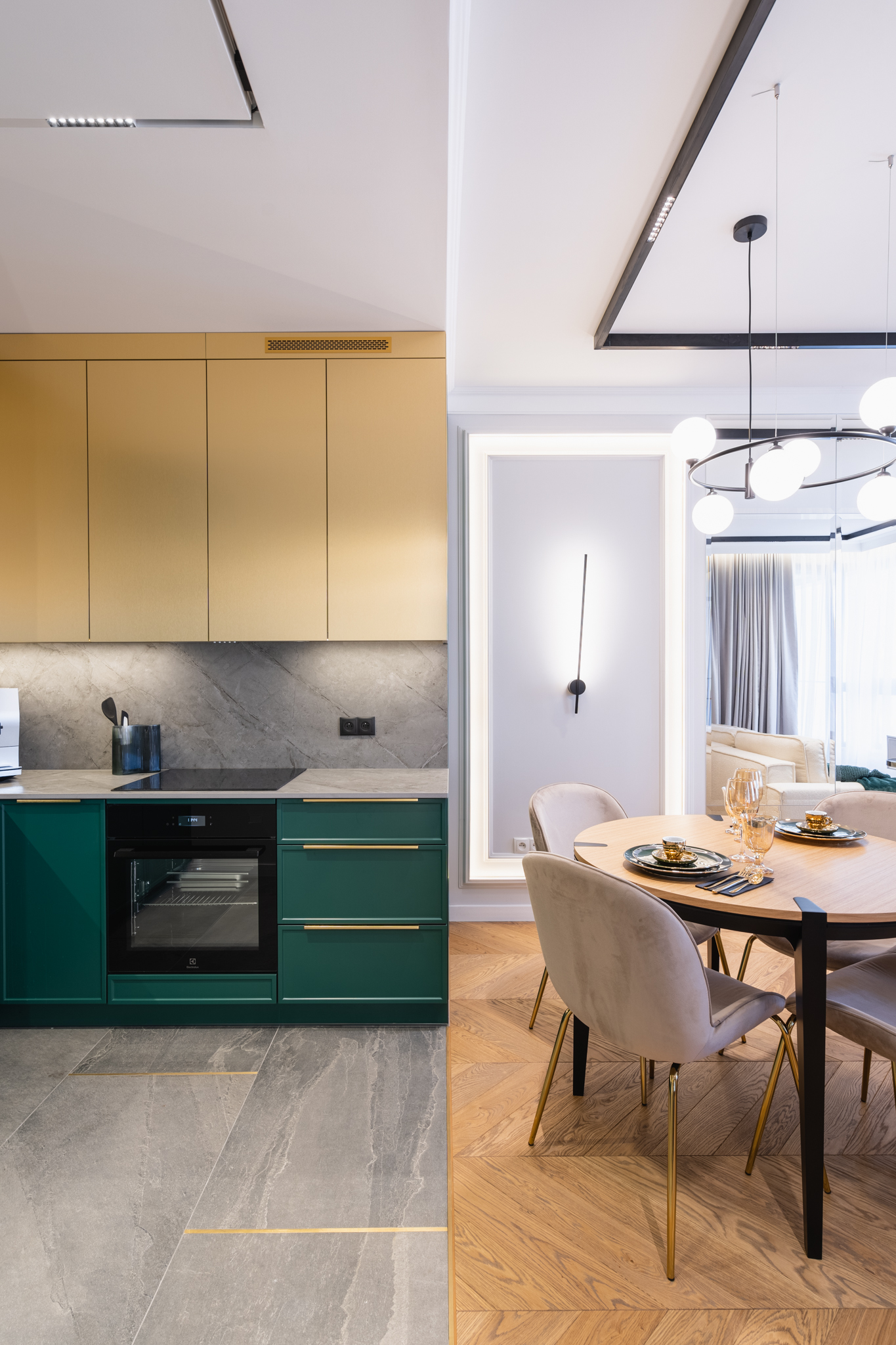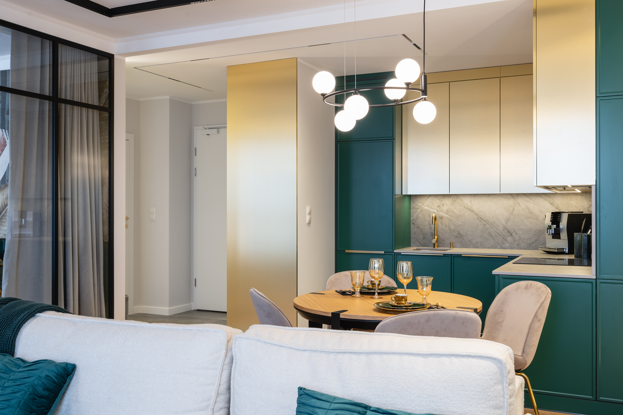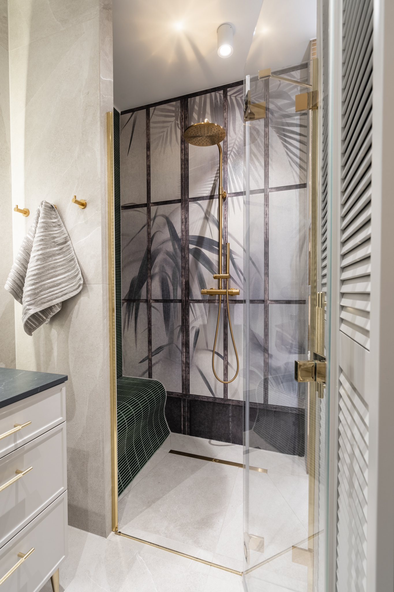 The apartment in PORTOVA is our 5th realisation of the interior in this INVEST KOMFORT devloper investment in Gdynia. We try to make each interior unique, which is why this apartment has been decorated in gold and bottle green. The wallpapers that completed the design in the bedroom and in the shower perfectly represent the "jungle" trend and the name of this project. The area of the apartment is a living room with a kitchenette, a hall, a bathroom, and a bedroom which