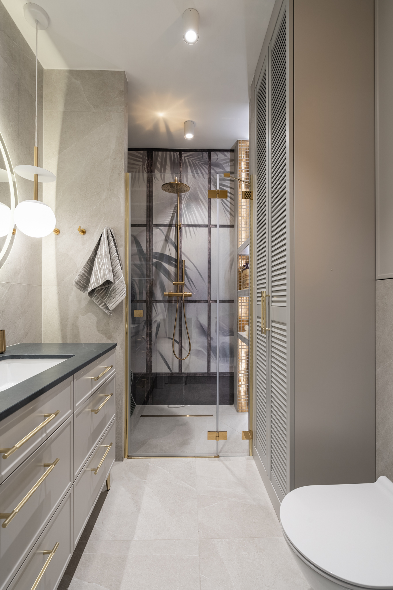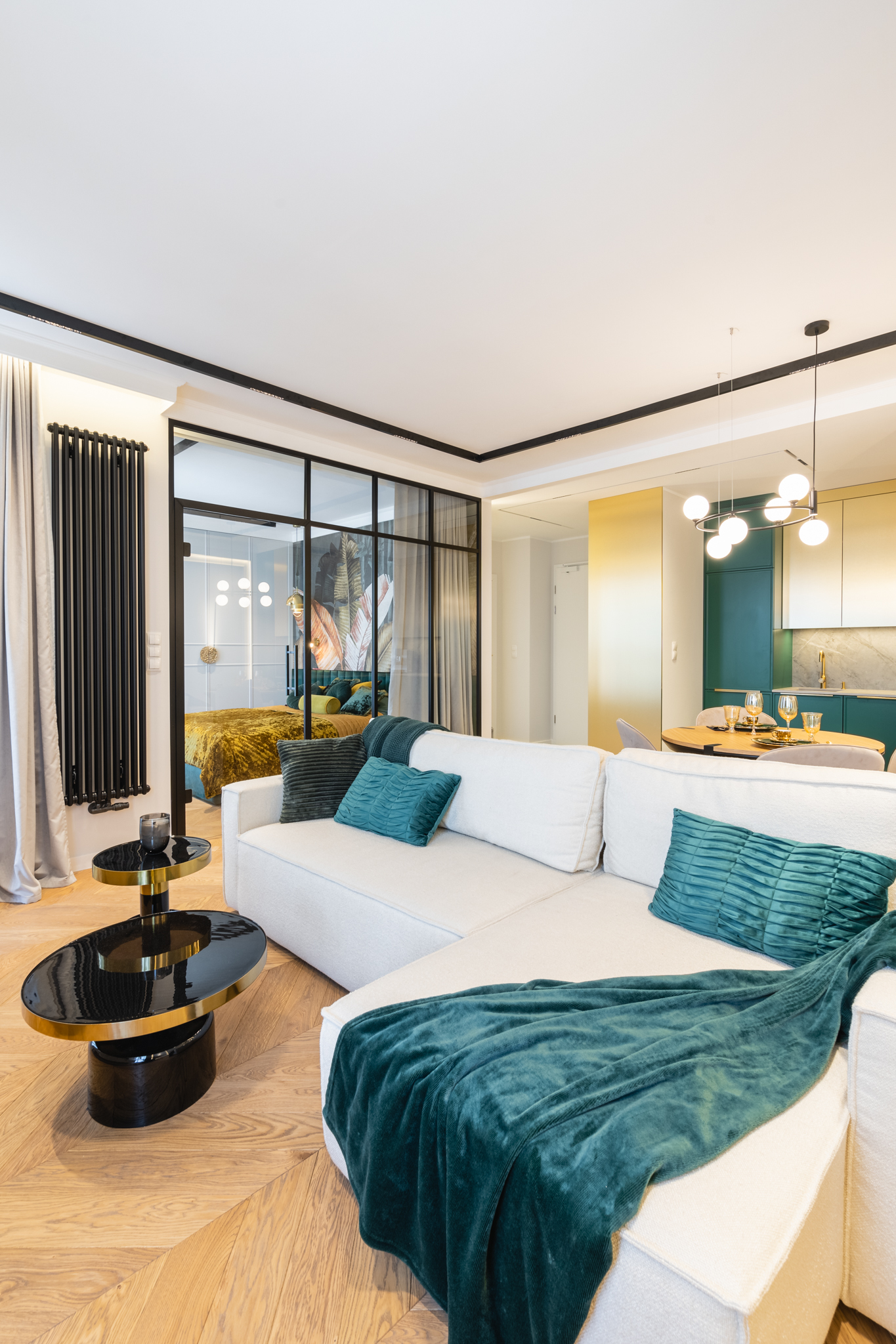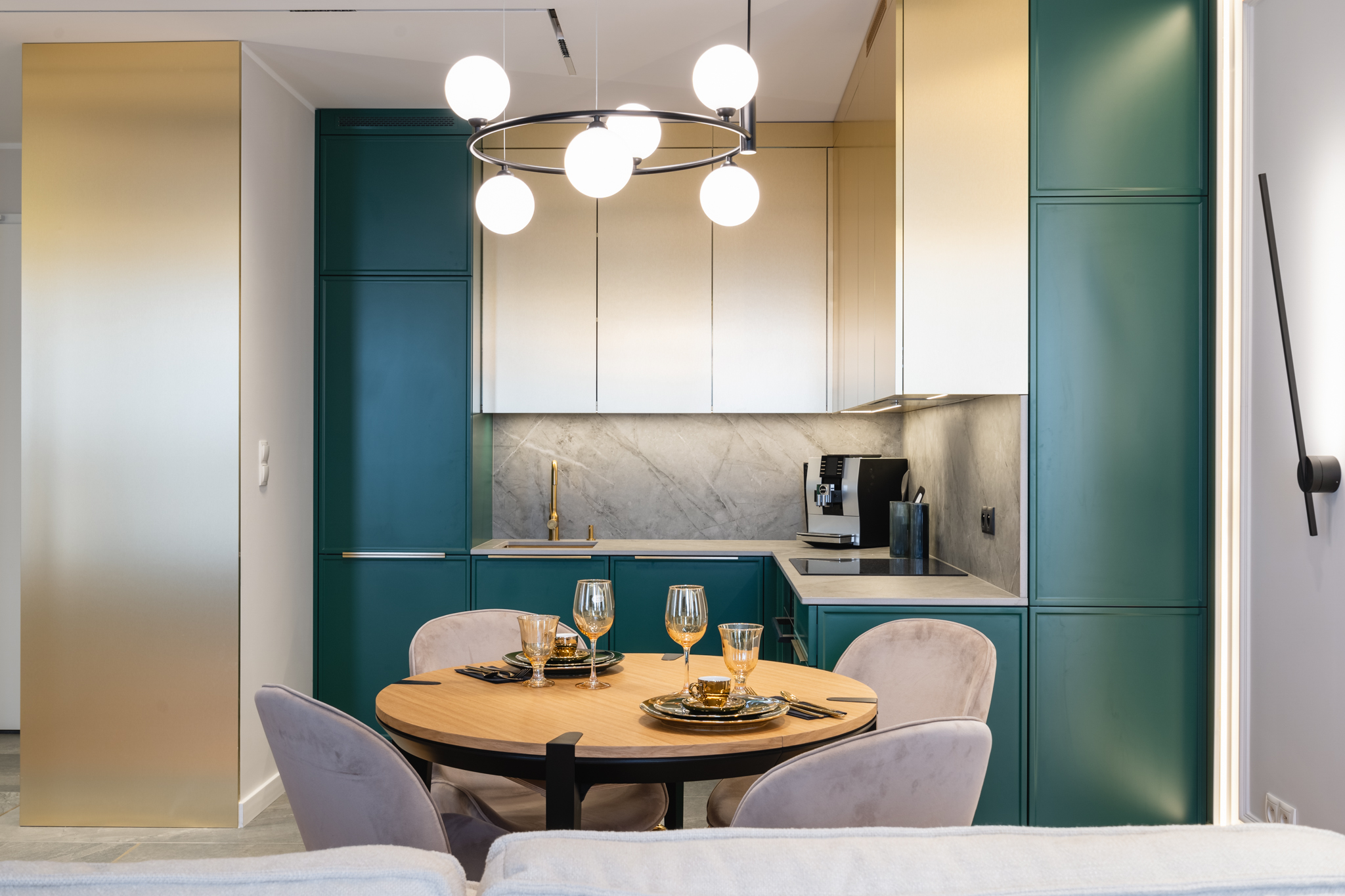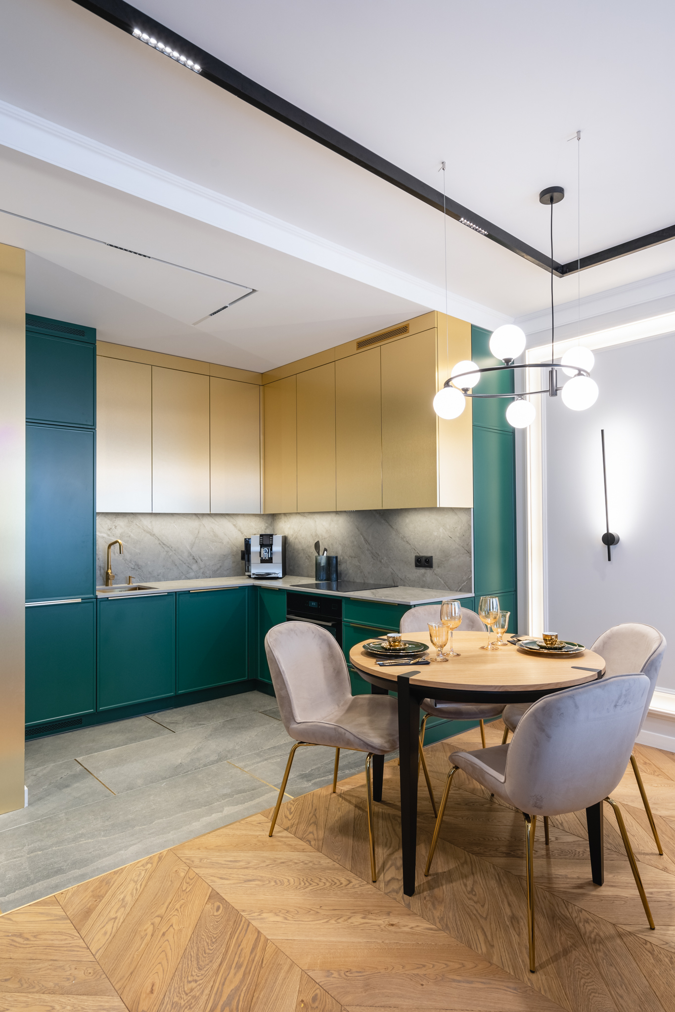 The apartment in PORTOVA is our 5th realisation of the interior in this INVEST KOMFORT devloper investment in Gdynia. We try to make each interior unique, which is why this apartment has been decorated in gold and bottle green. The wallpapers that completed the design in the bedroom and in the shower perfectly represent the "jungle" trend and the name of this project. The area of the apartment is a living room with a kitchenette, a hall, a bathroom, and a bedroom which