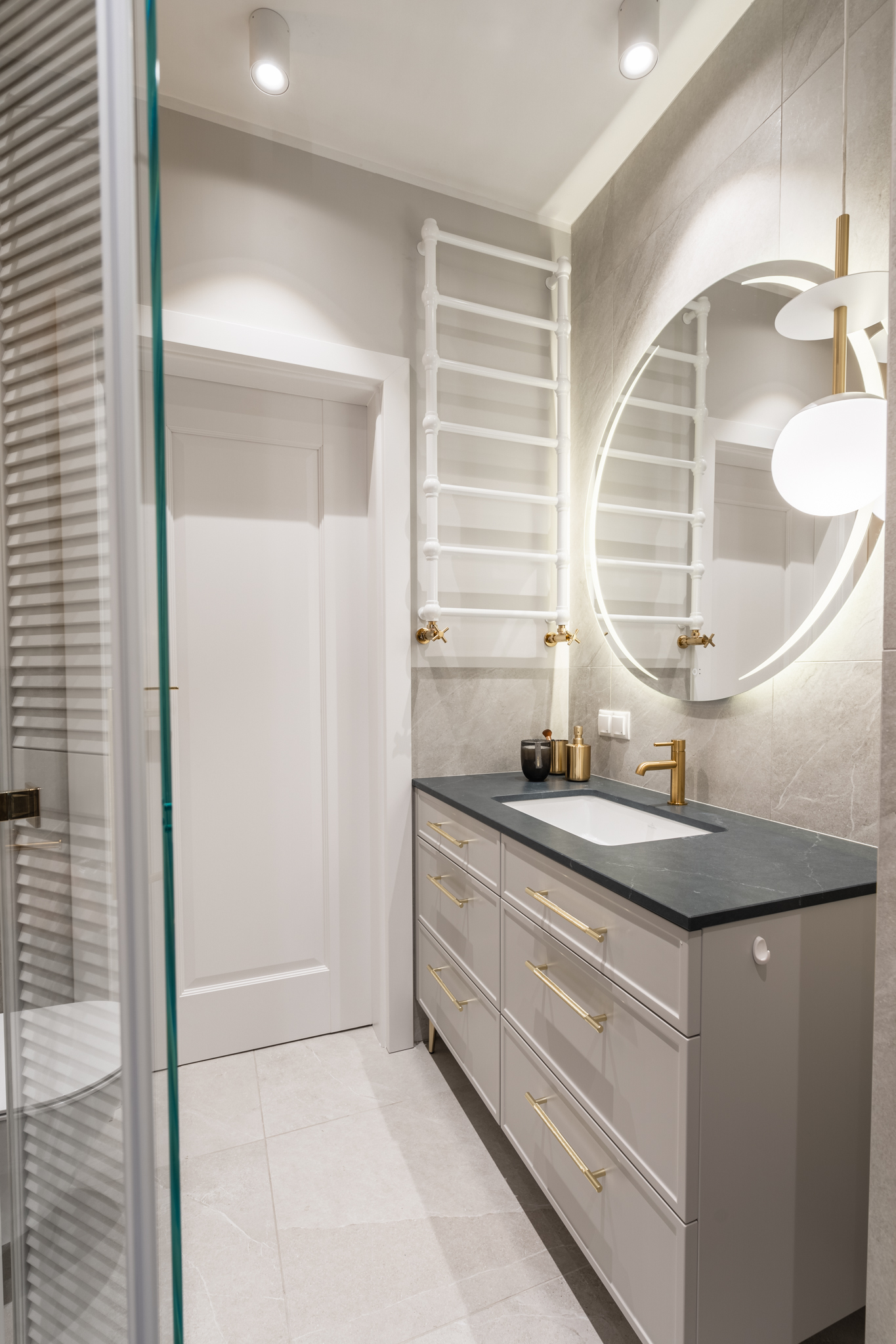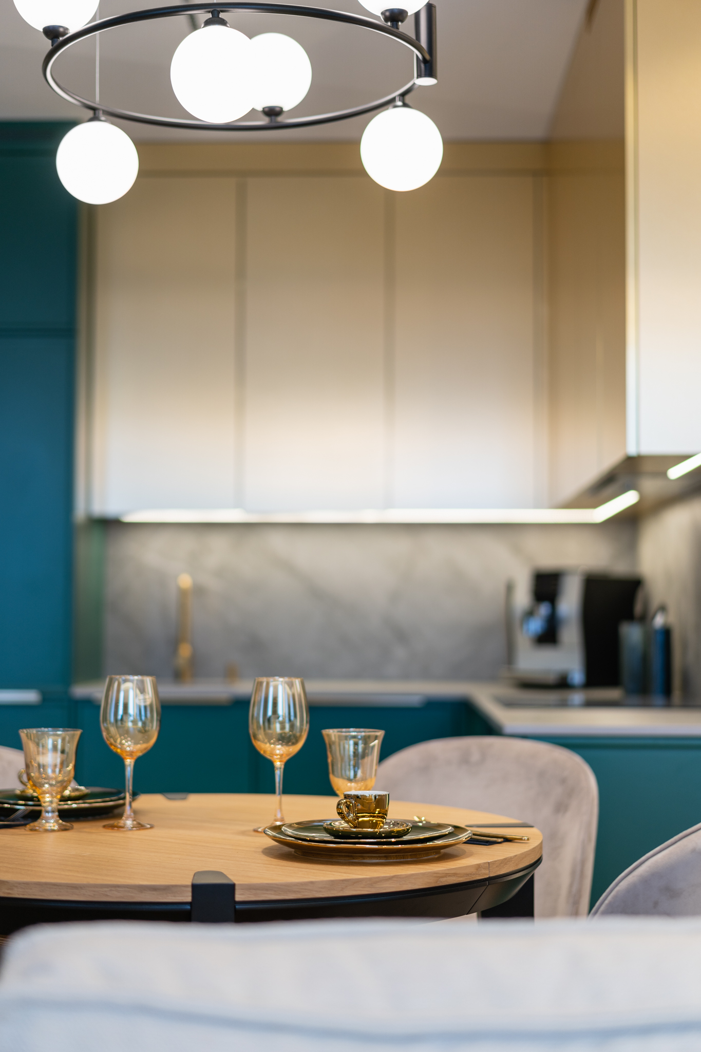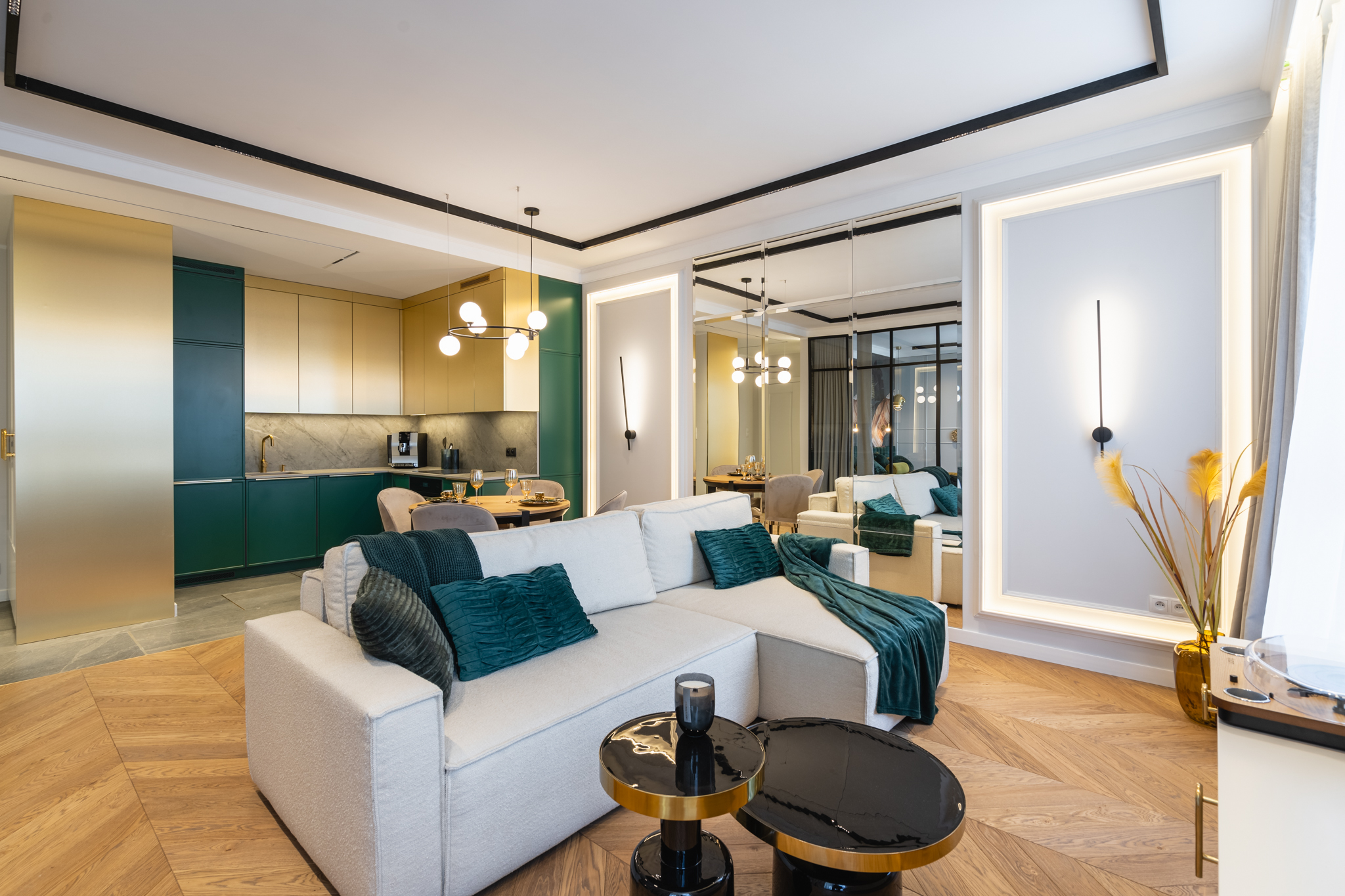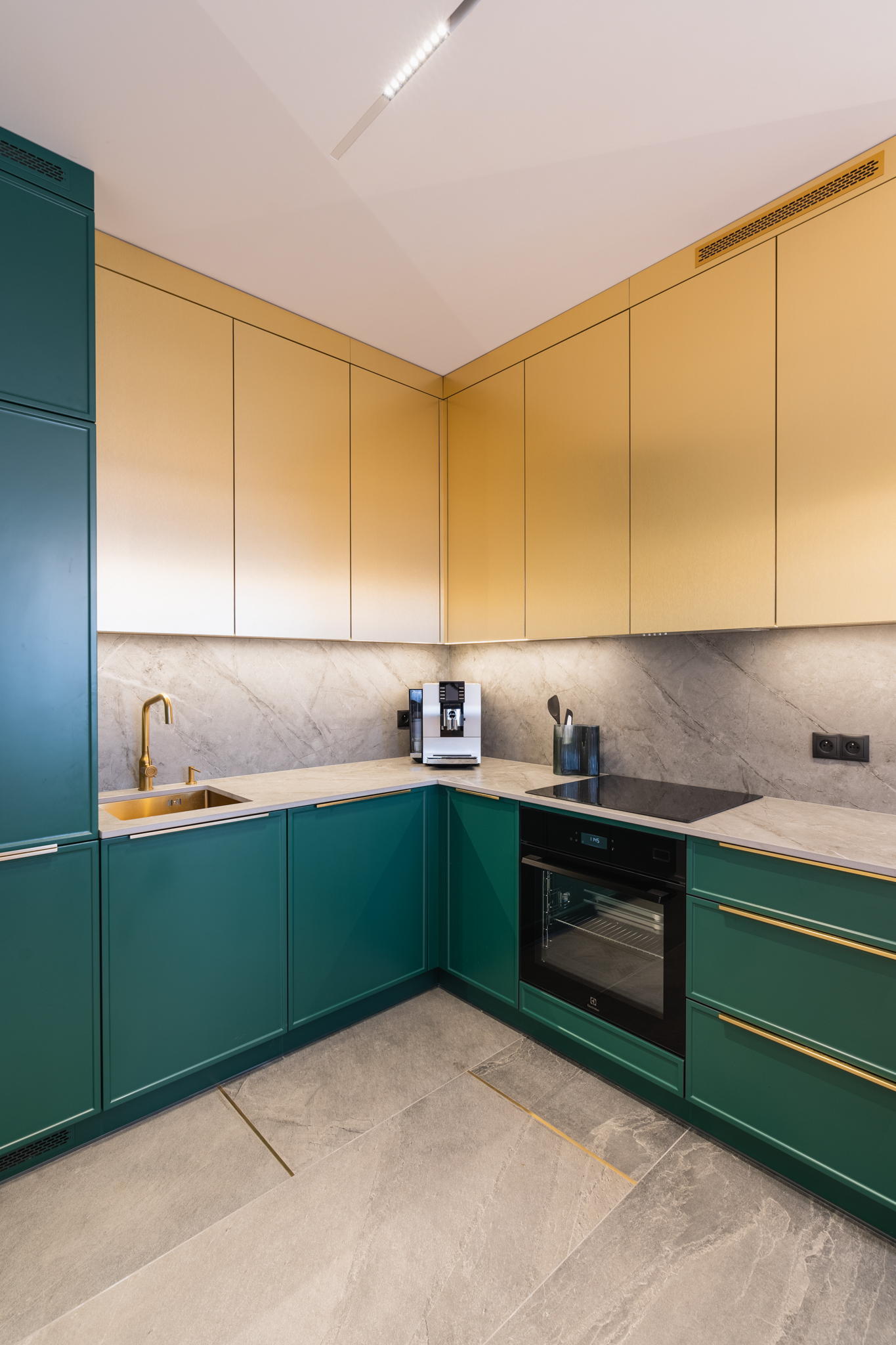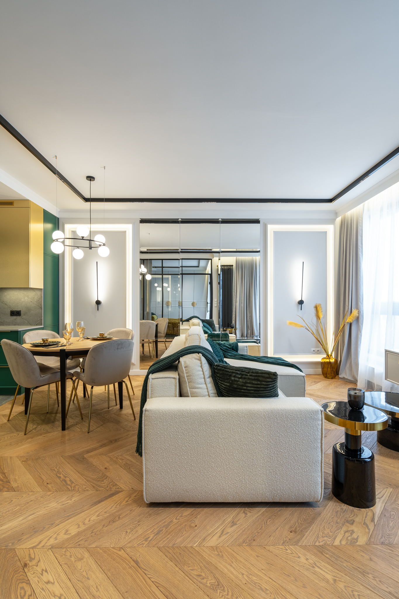 The apartment in PORTOVA is our 5th realisation of the interior in this INVEST KOMFORT devloper investment in Gdynia. We try to make each interior unique, which is why this apartment has been decorated in gold and bottle green. The wallpapers that completed the design in the bedroom and in the shower perfectly represent the "jungle" trend and the name of this project. The area of the apartment is a living room with a kitchenette, a hall, a bathroom, and a bedroom which