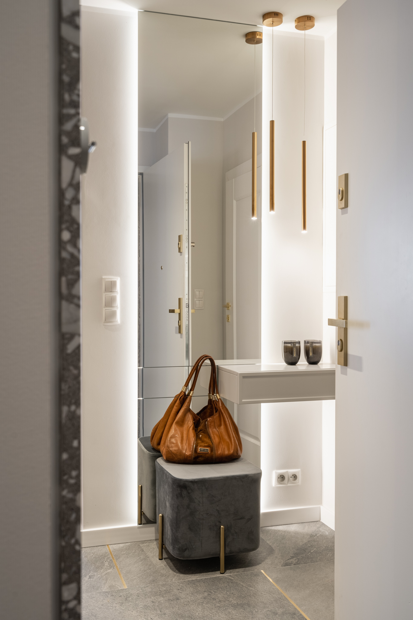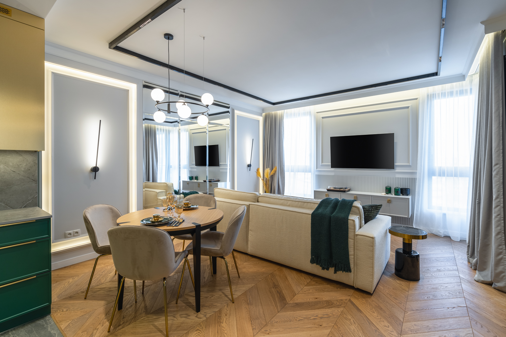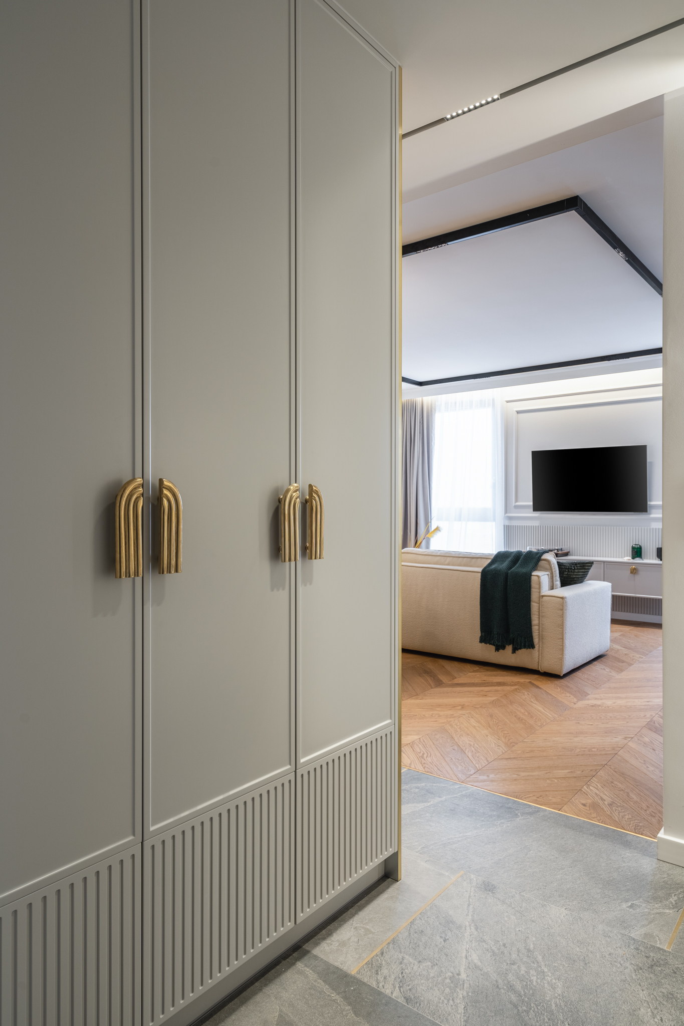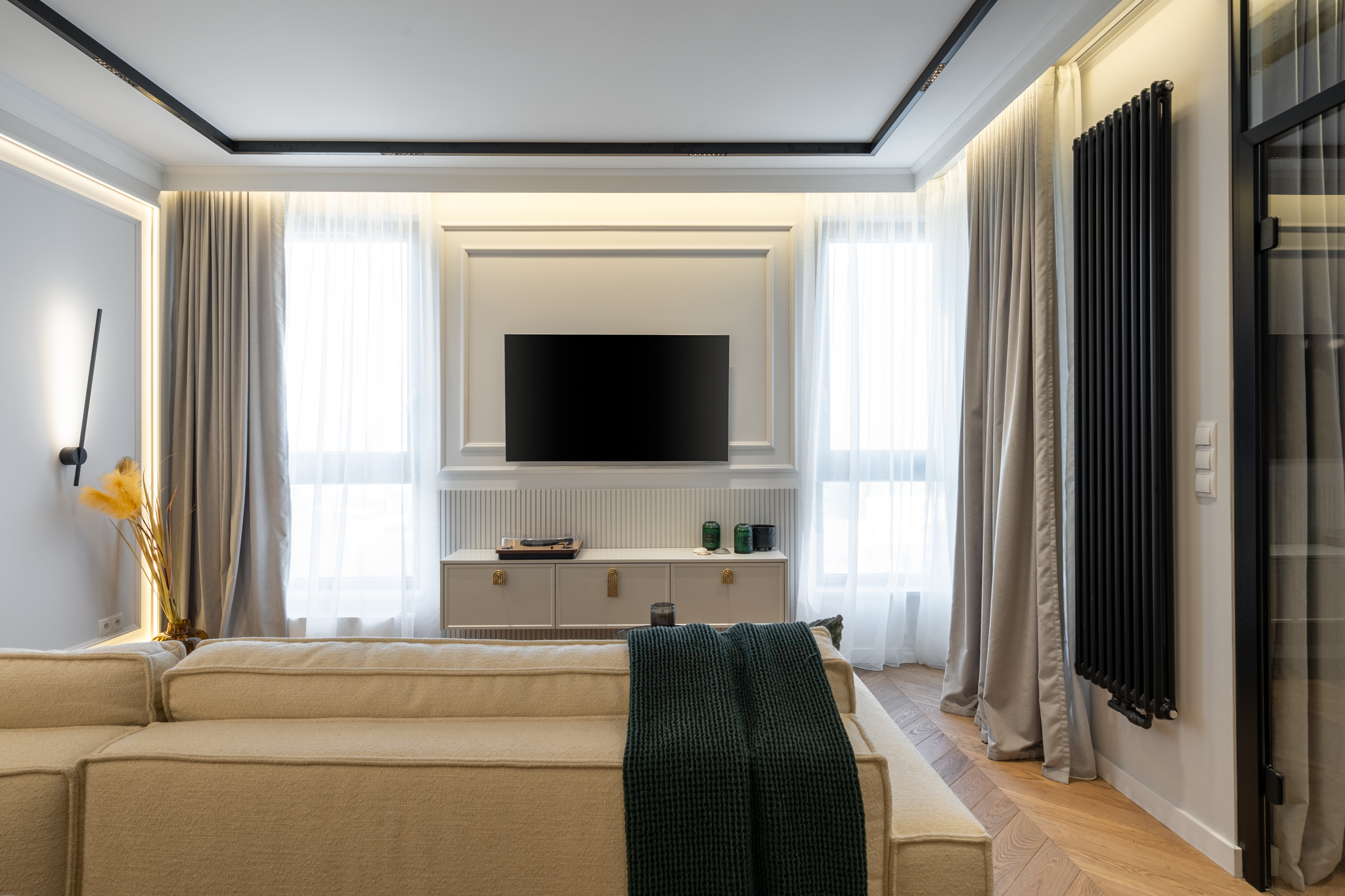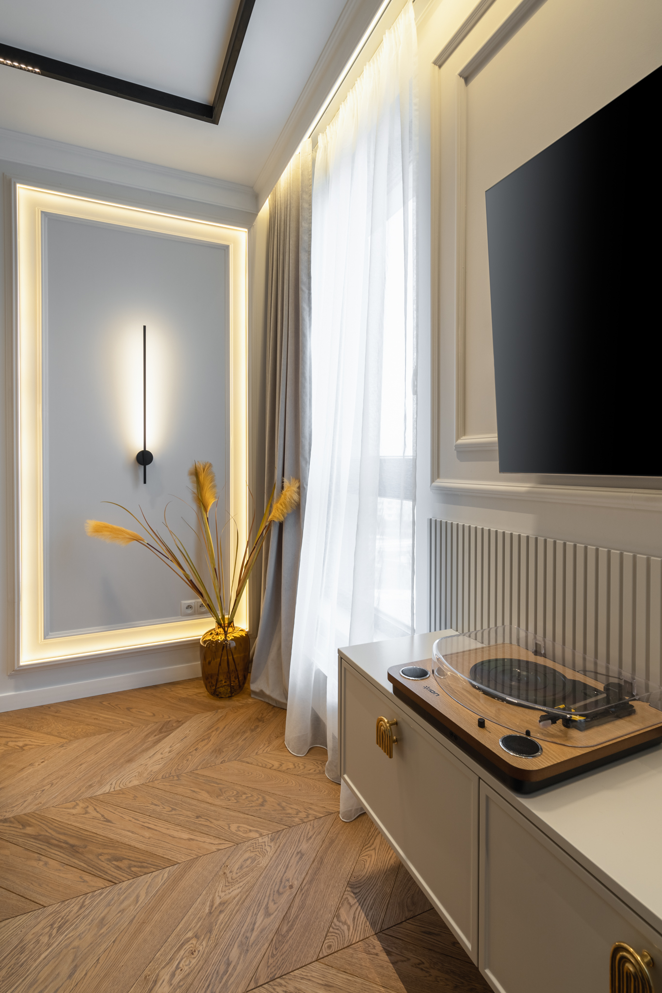 has been exposed to the living room area. Our first action was to demolish the bedroom wall and change its functional layout in relation to the basic version. Along with this wall, the location of the TV zone in the living room has also changed. We like shambles! :) It often leads to the best possible solutions for a given property.