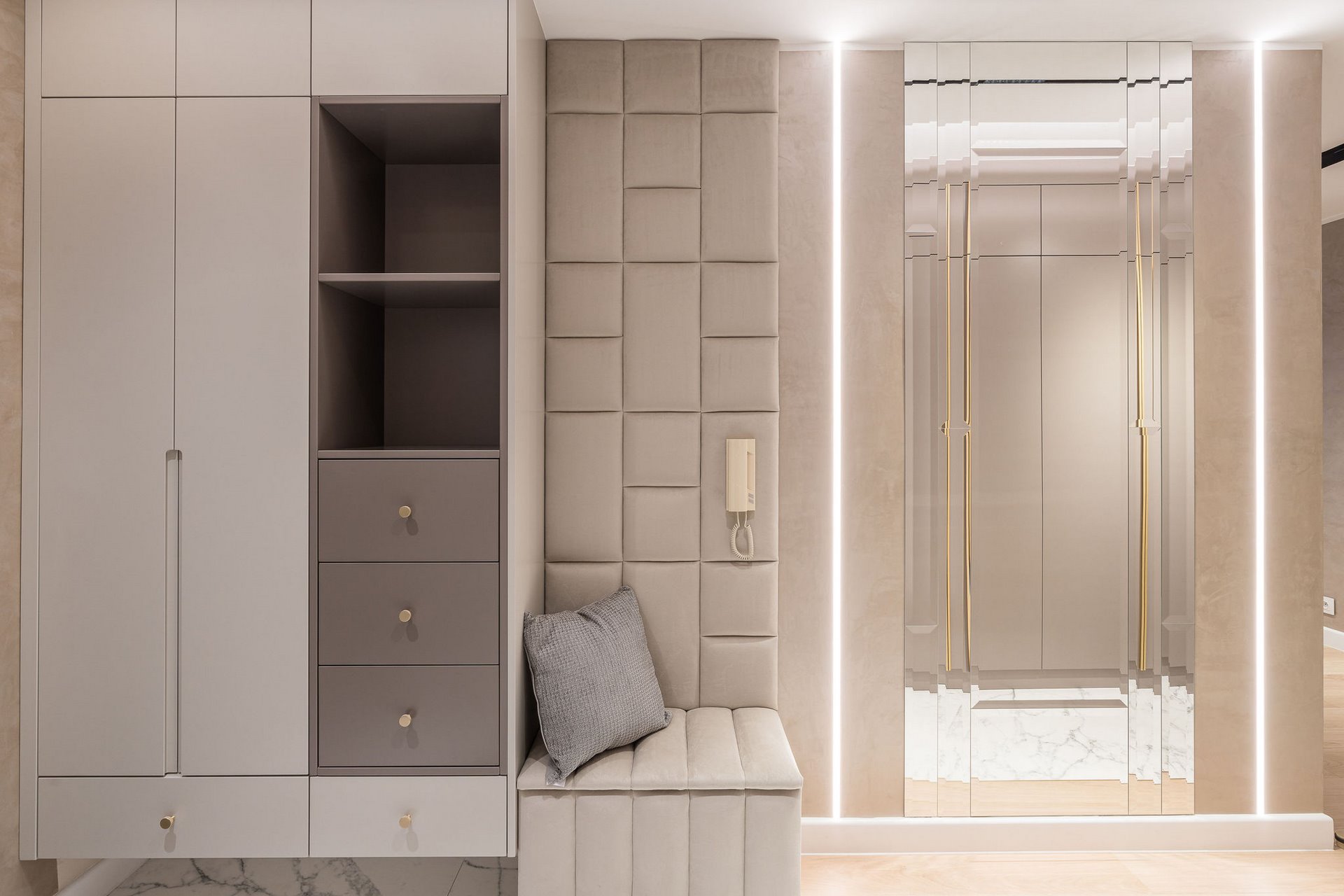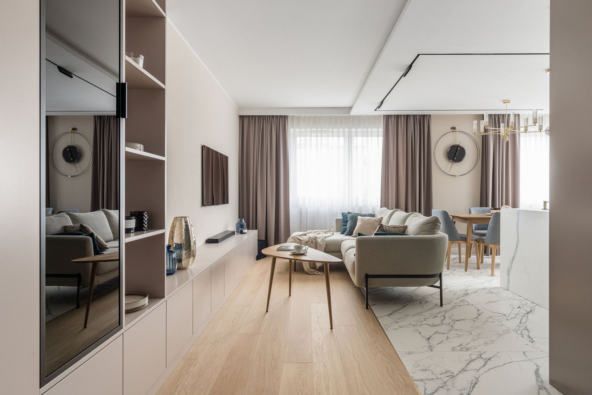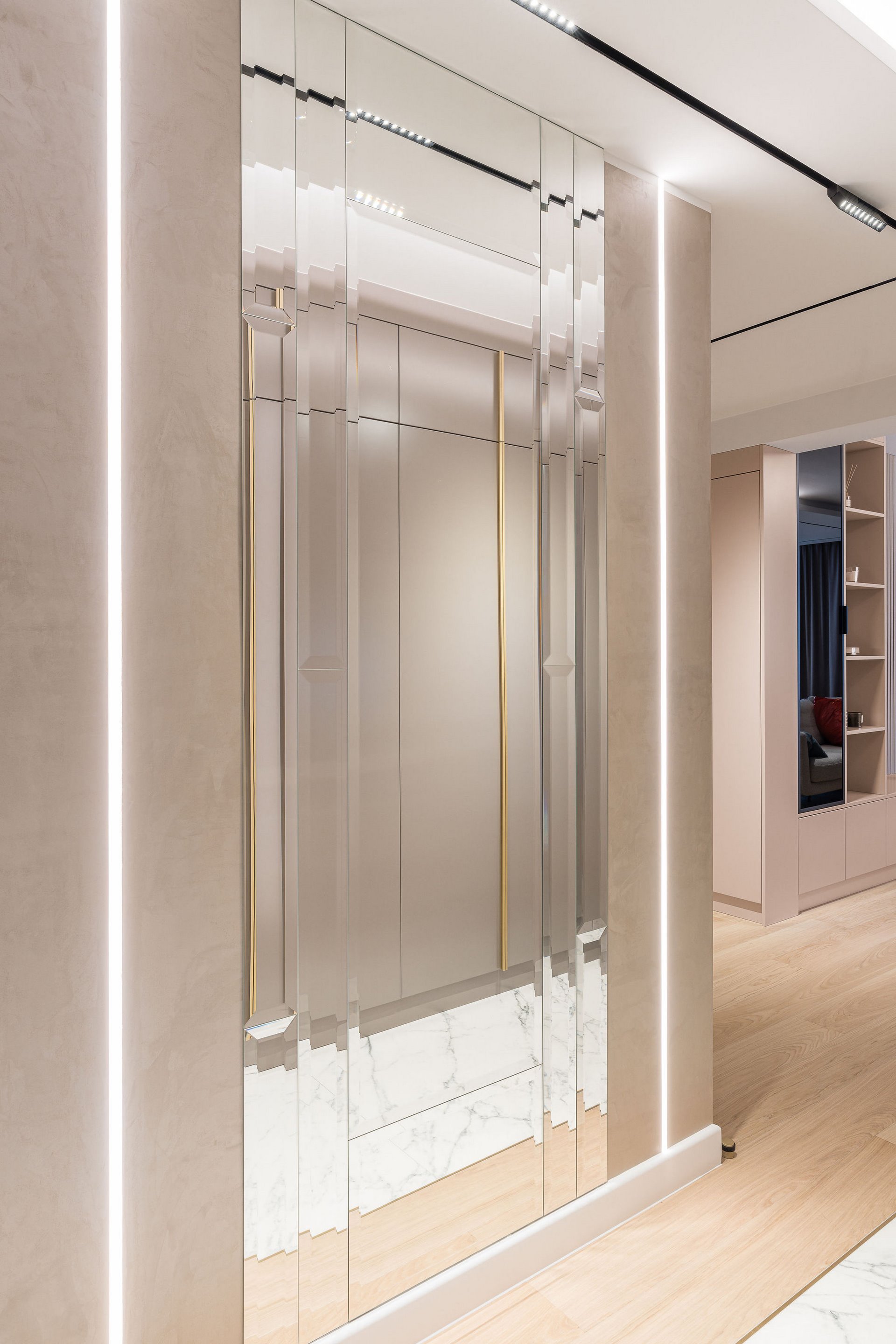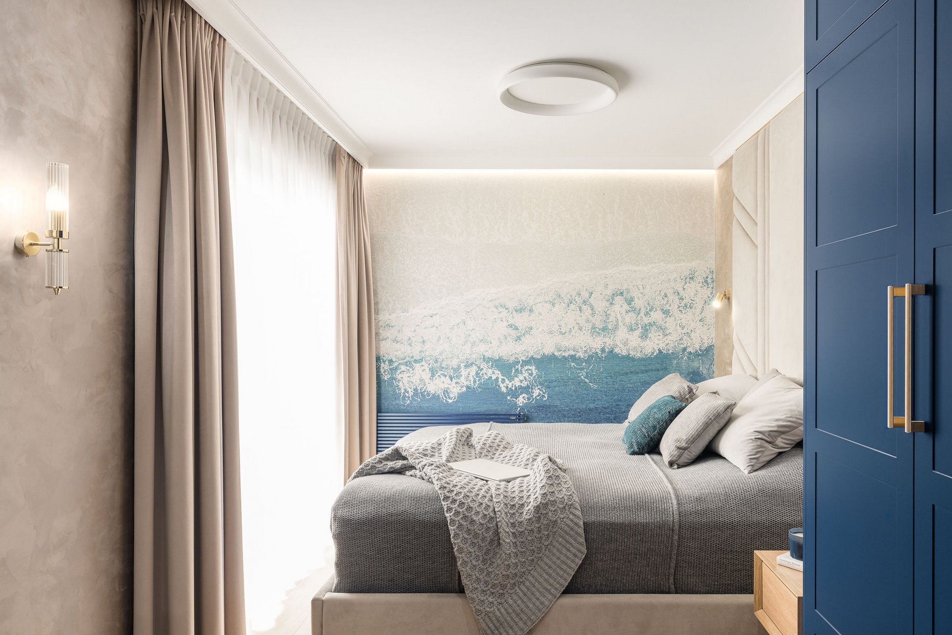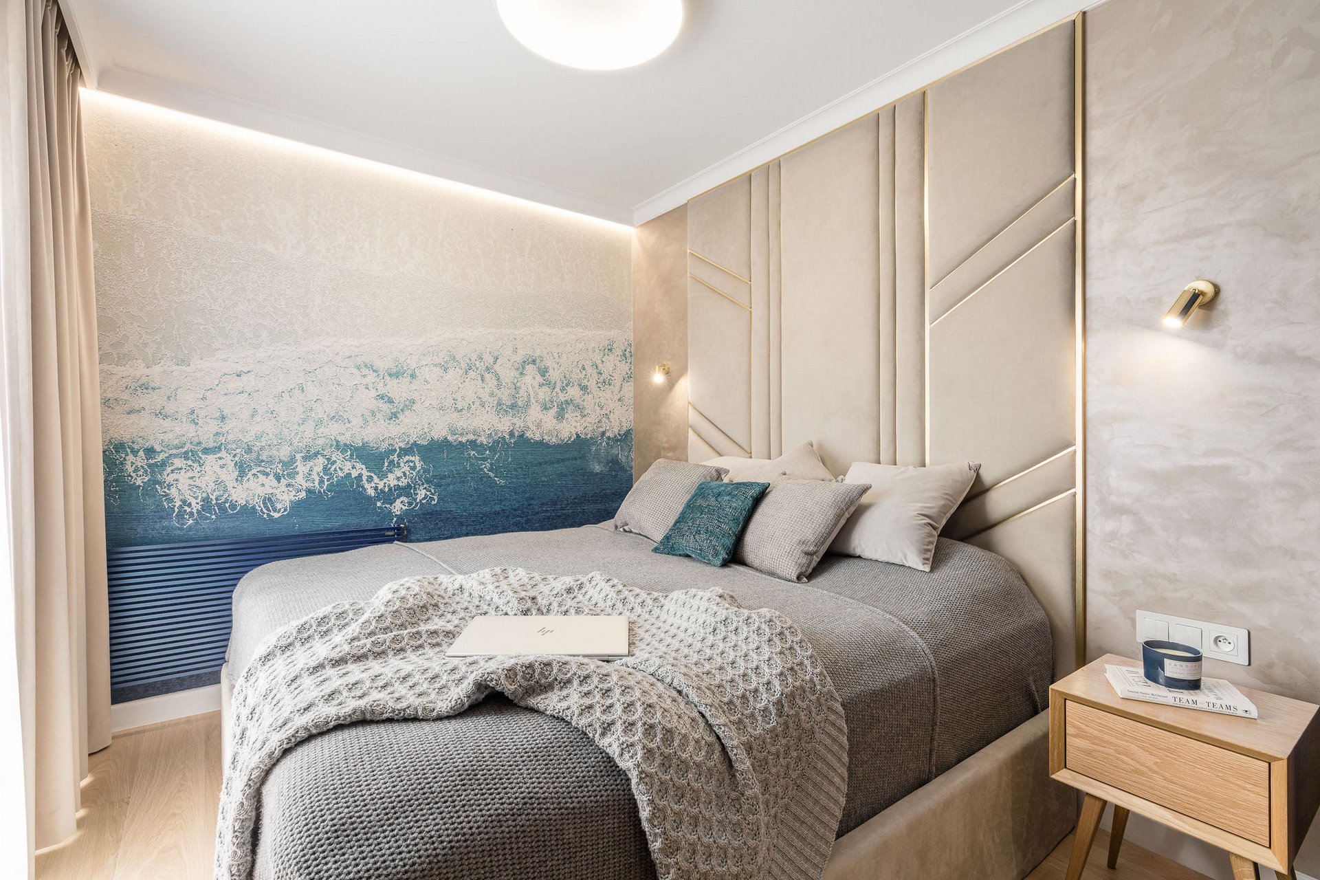 Family Apartment with Sea View. Our aim for this project was to create a bright and cozy atmosphere. The apartment was supposed to give a feeling of warmth and comfort. The combination of beige and gray can also be sophisticated. We are further accompanied by glamor accents in the form of decorative lamps, beveled mirrors or LED backlights. The bedroom has been kept in coastal climate, and the colour of the decorative radiator has been matched to the colour of the coastal wallpaper. Buttoned up to the last detail!