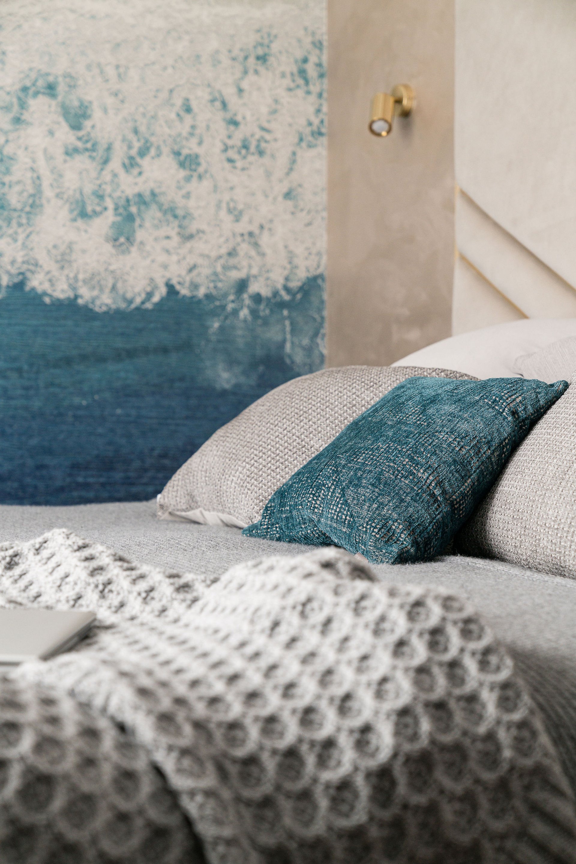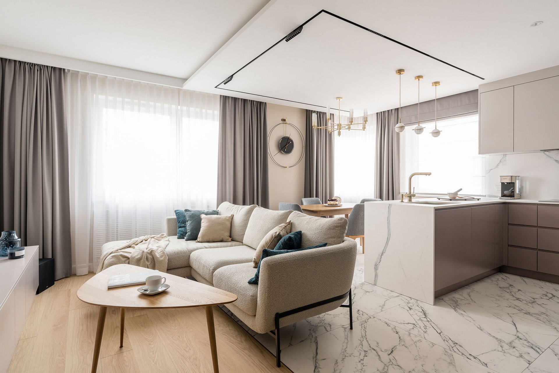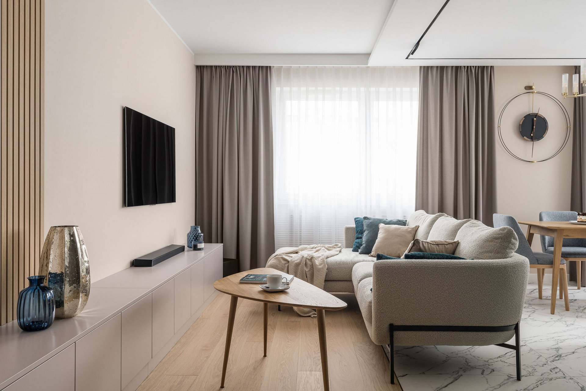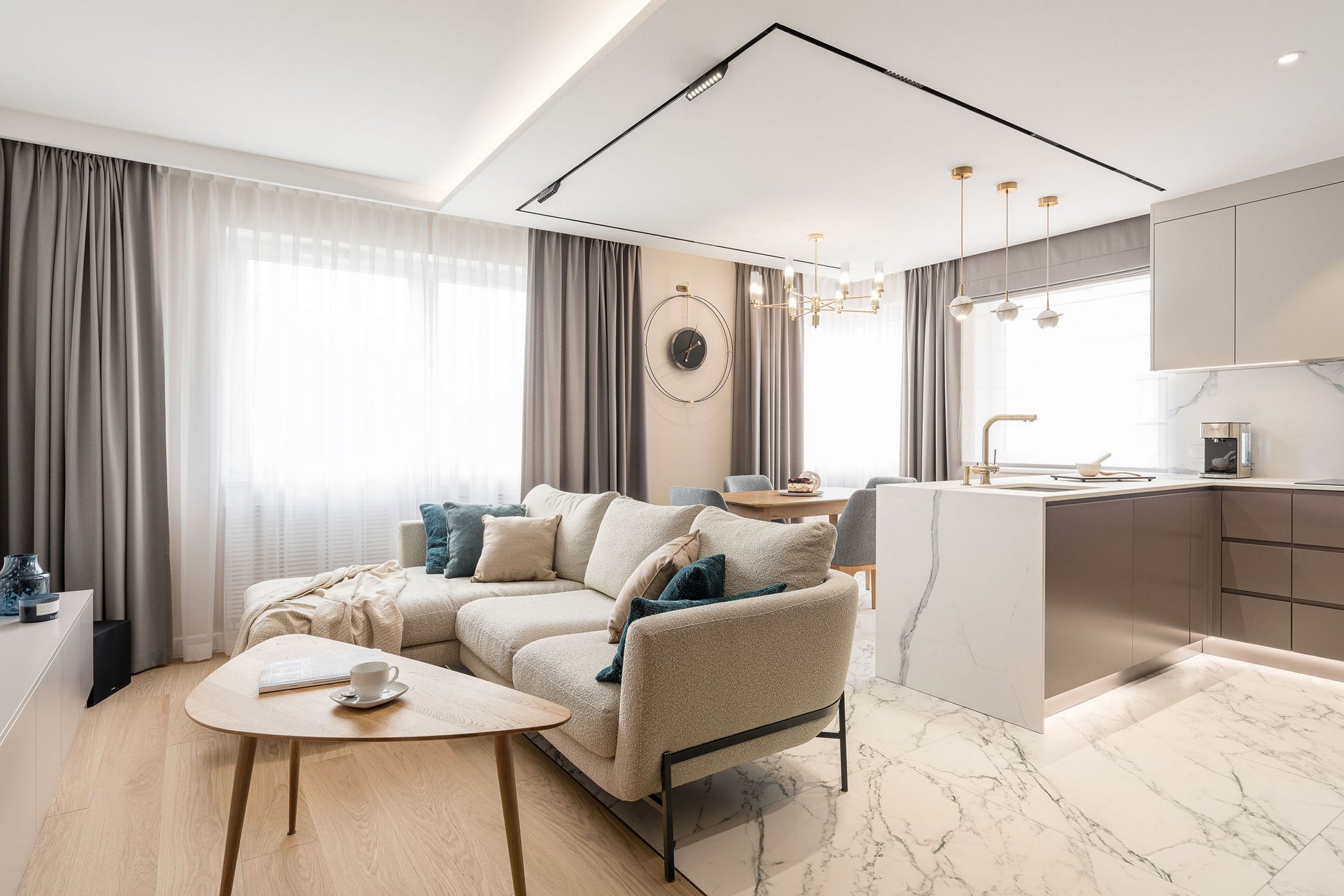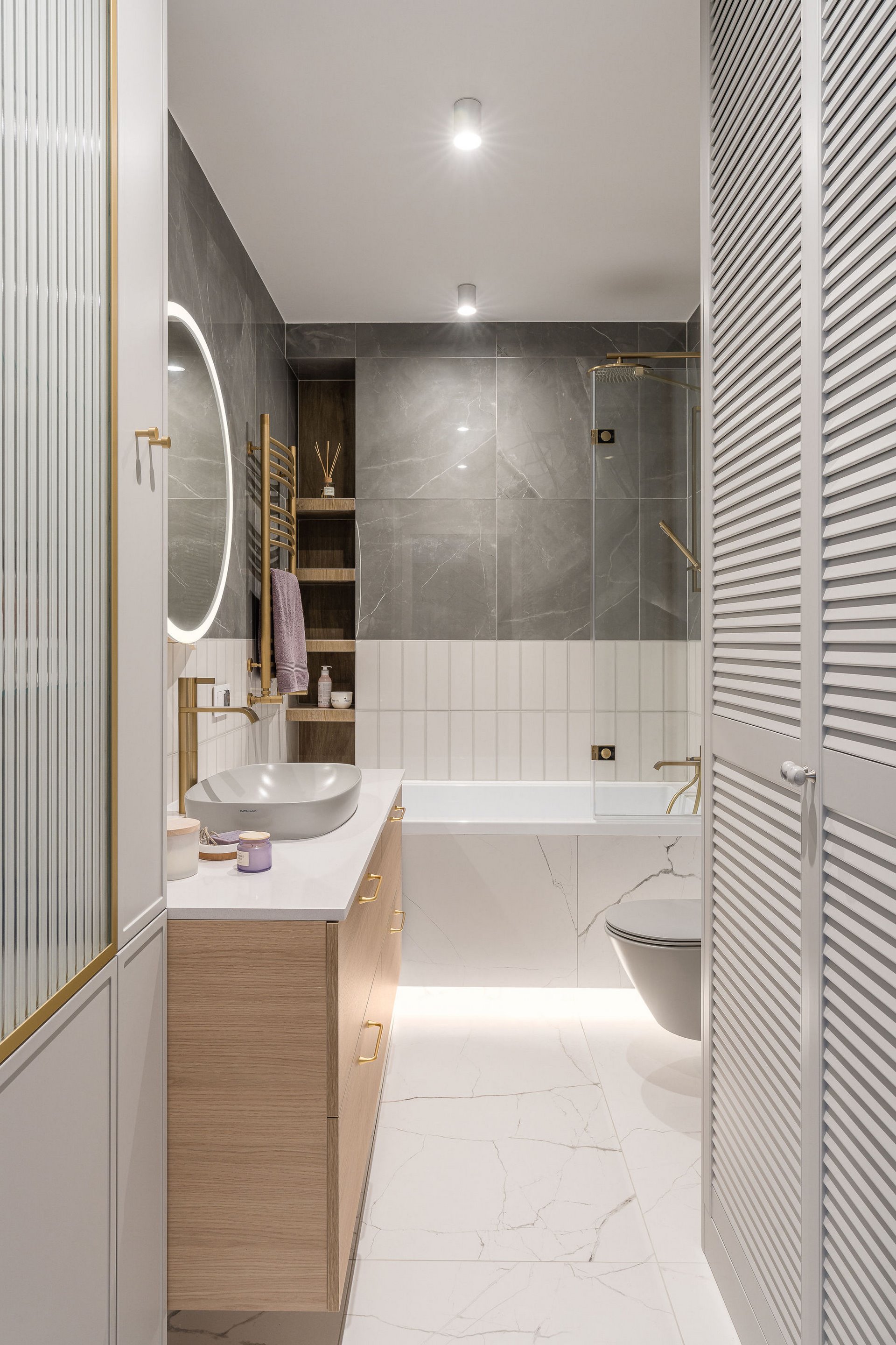 Family Apartment with Sea View. Our aim for this project was to create a bright and cozy atmosphere. The apartment was supposed to give a feeling of warmth and comfort. The combination of beige and gray can also be sophisticated. We are further accompanied by glamor accents in the form of decorative lamps, beveled mirrors or LED backlights. The bedroom has been kept in coastal climate, and the colour of the decorative radiator has been matched to the colour of the coastal wallpaper. Buttoned up to the last detail!