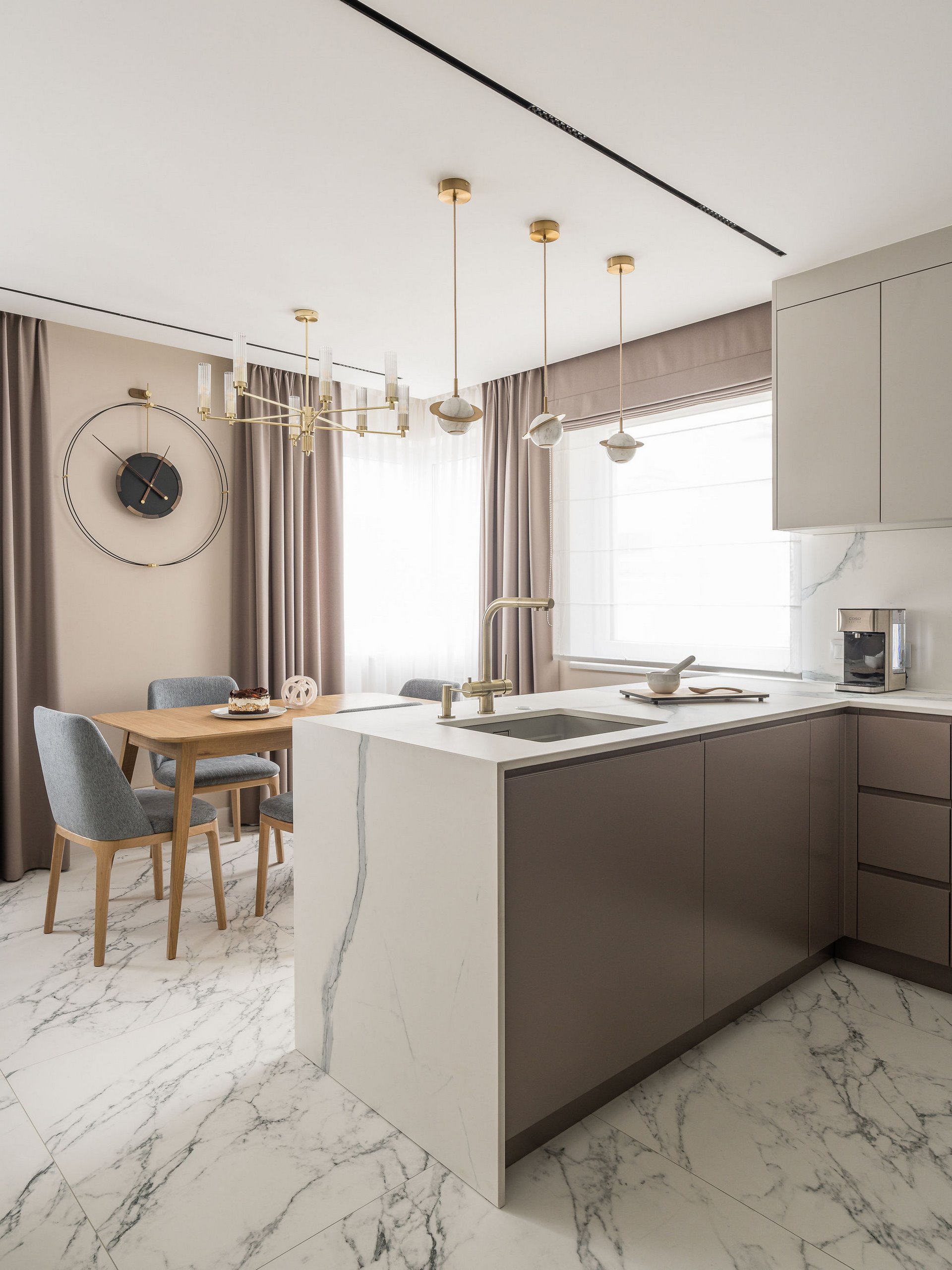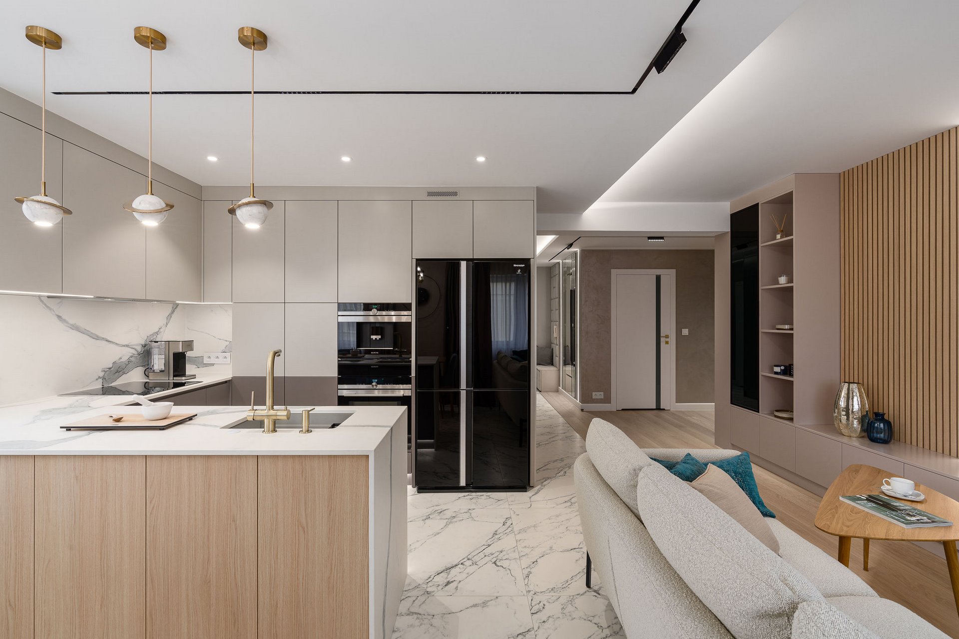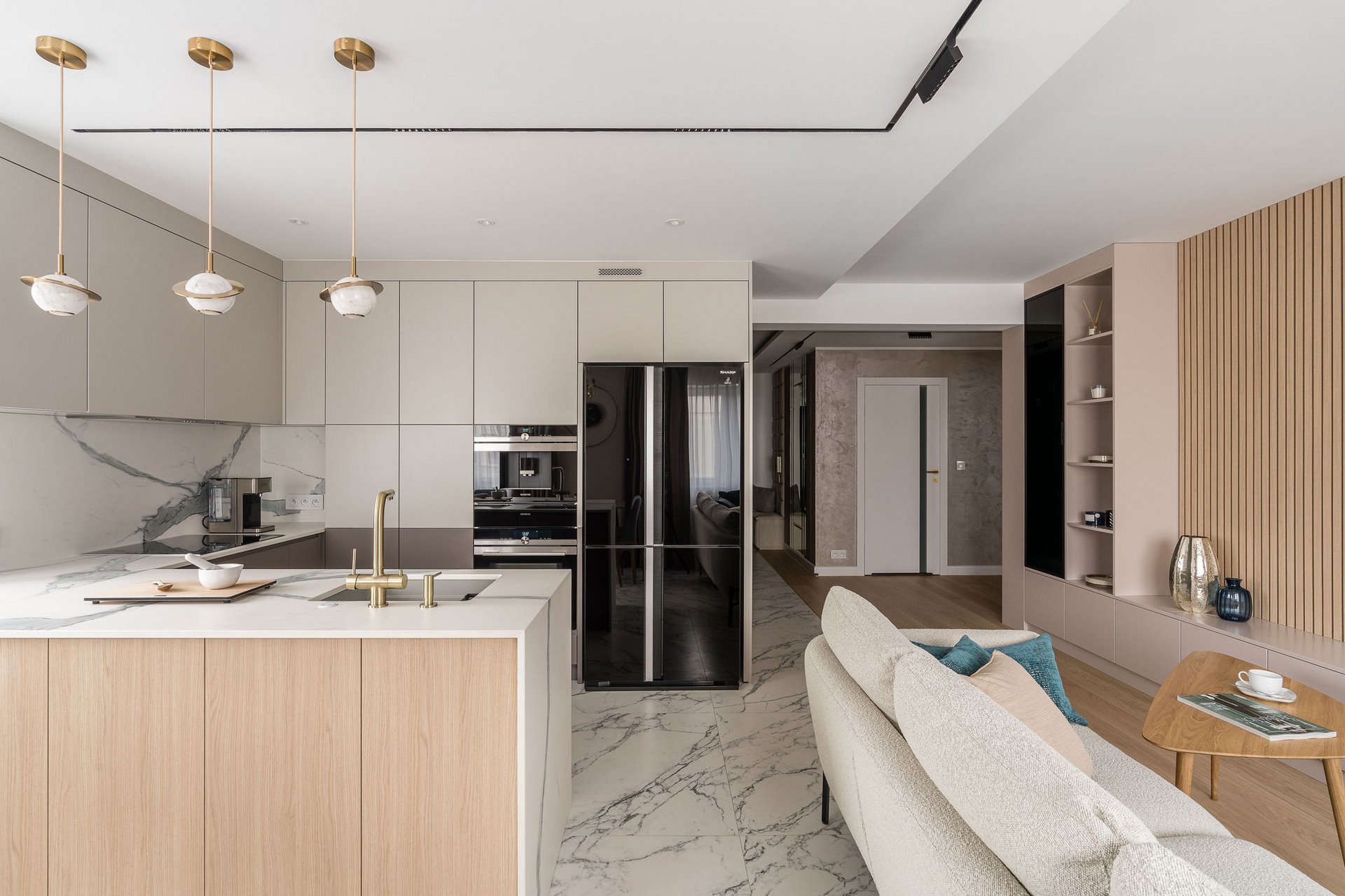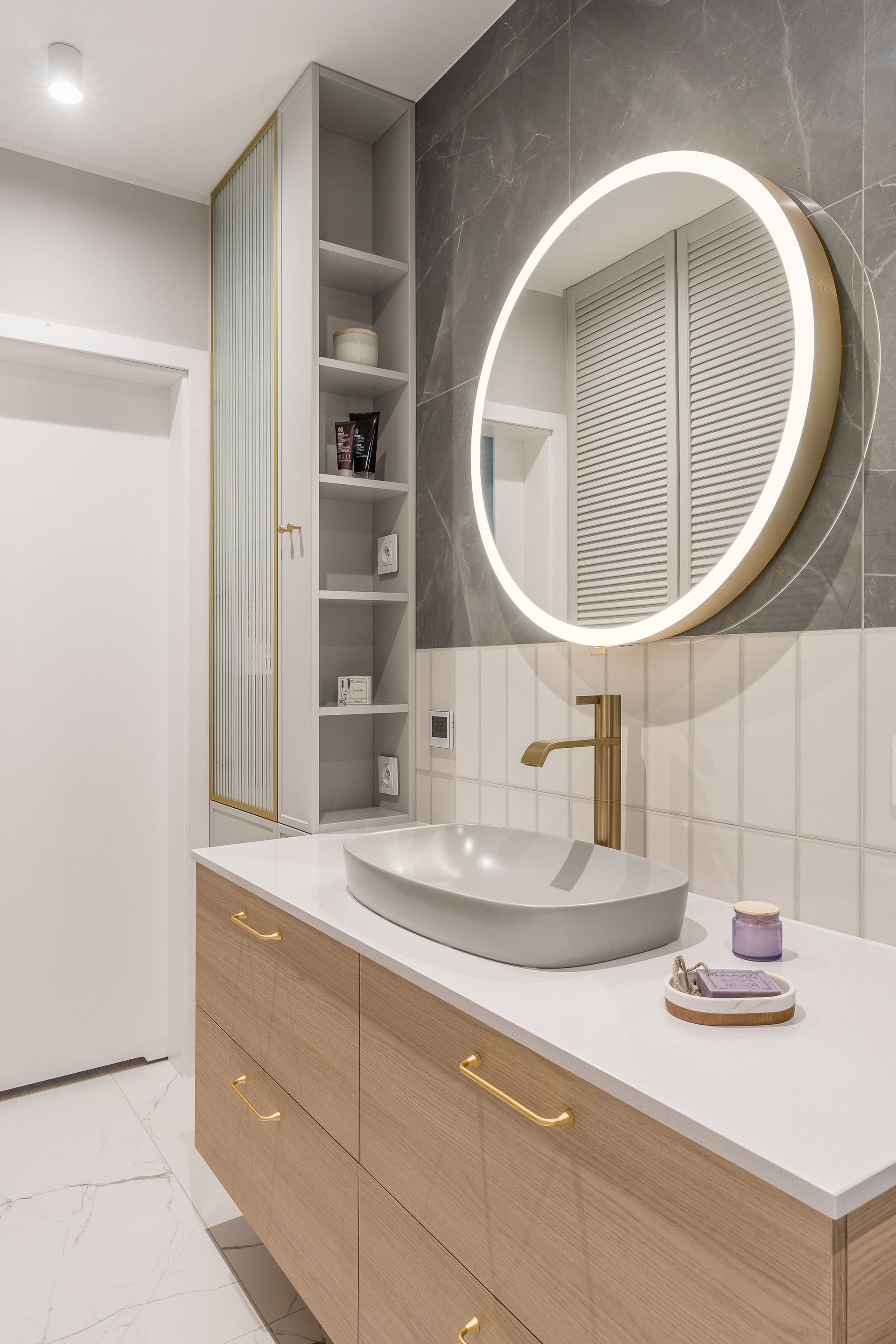 Family Apartment with Sea View. Our aim for this project was to create a bright and cozy atmosphere. The apartment was supposed to give a feeling of warmth and comfort. The combination of beige and gray can also be sophisticated. We are further accompanied by glamor accents in the form of decorative lamps, beveled mirrors or LED backlights. The bedroom has been kept in coastal climate, and the colour of the decorative radiator has been matched to the colour of the coastal wallpaper. Buttoned up to the last detail!