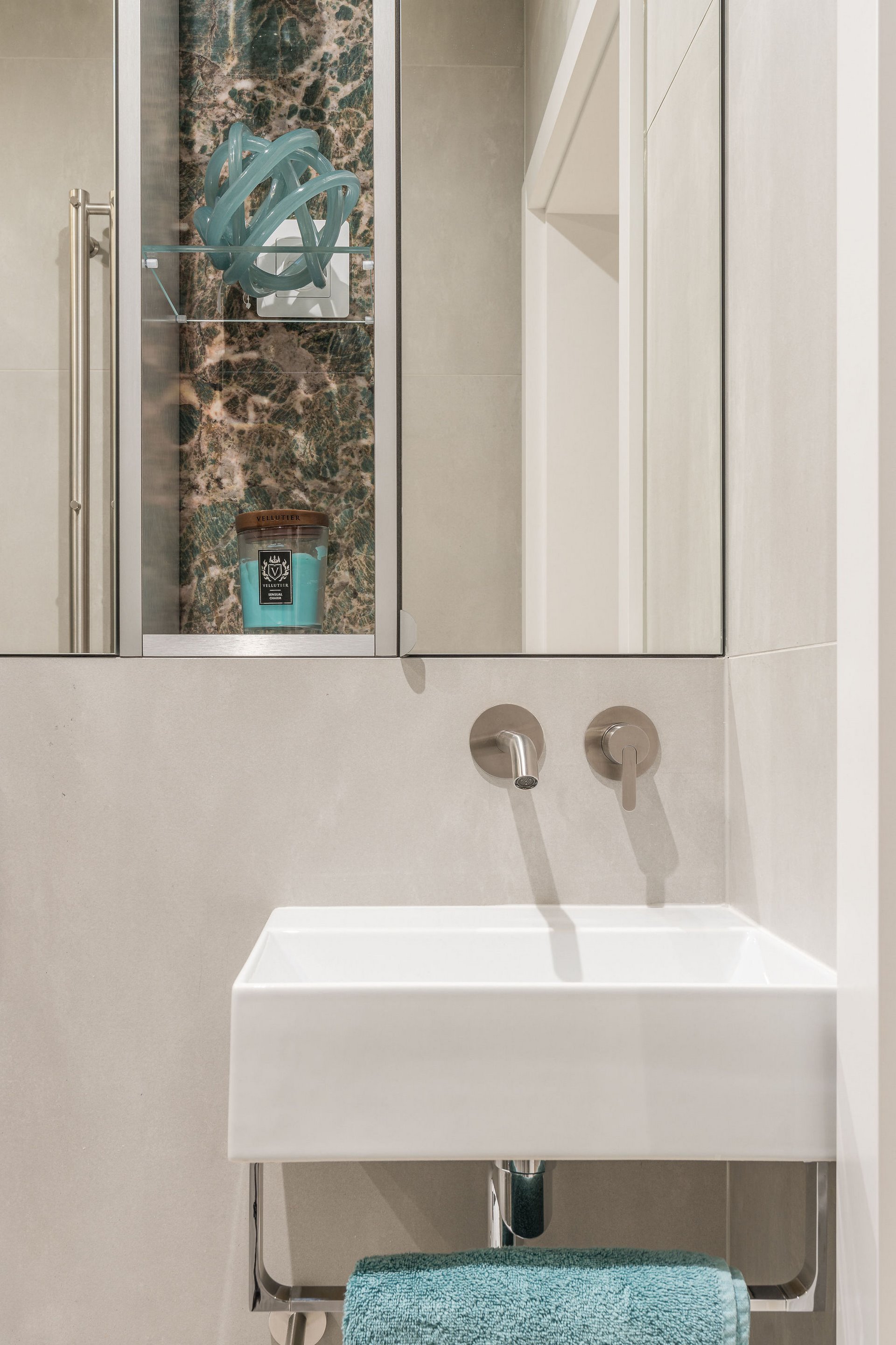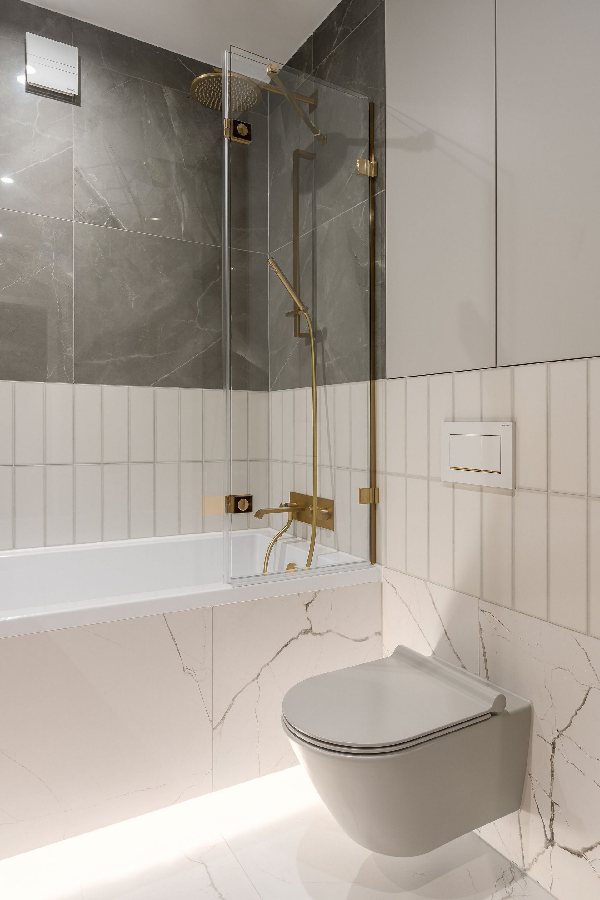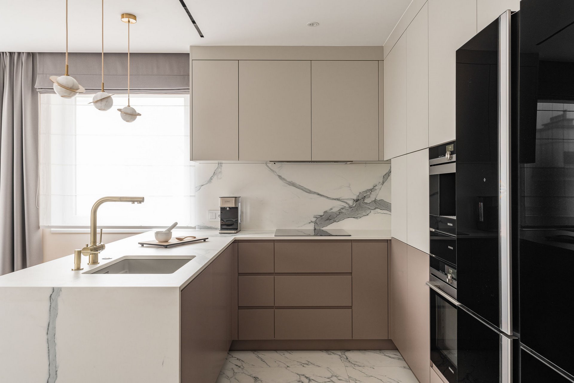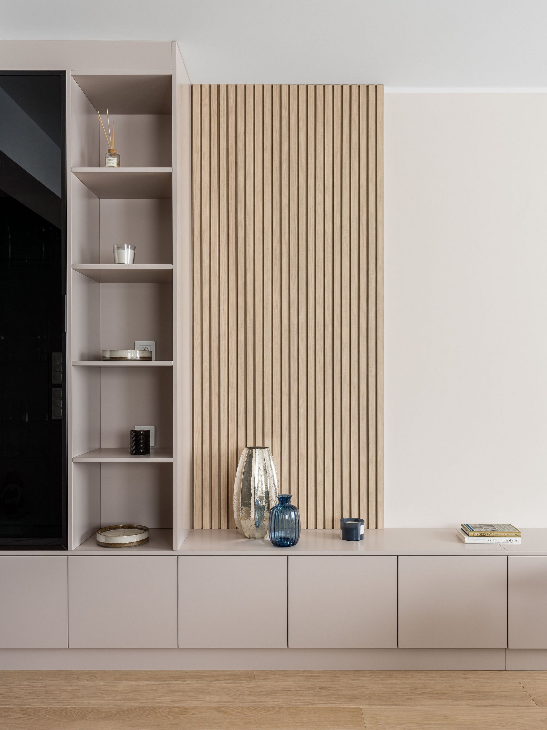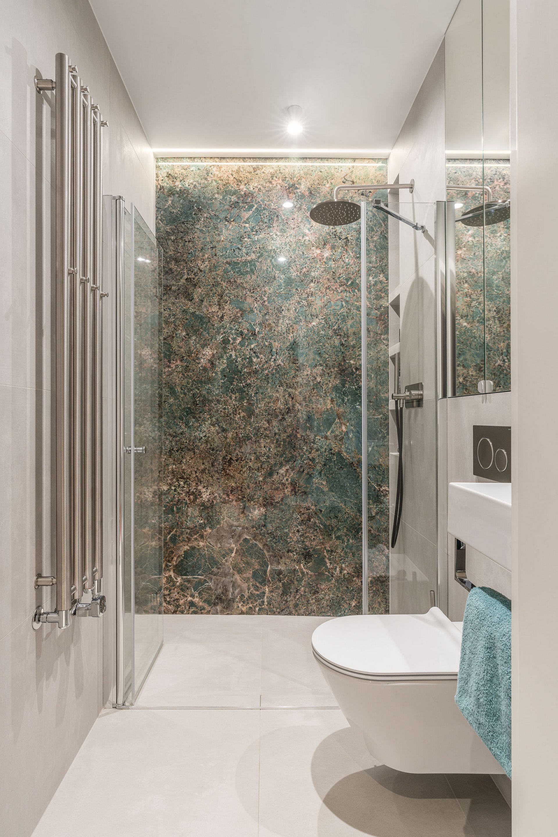 Family Apartment with Sea View. Our aim for this project was to create a bright and cozy atmosphere. The apartment was supposed to give a feeling of warmth and comfort. The combination of beige and gray can also be sophisticated. We are further accompanied by glamor accents in the form of decorative lamps, beveled mirrors or LED backlights. The bedroom has been kept in coastal climate, and the colour of the decorative radiator has been matched to the colour of the coastal wallpaper. Buttoned up to the last detail!