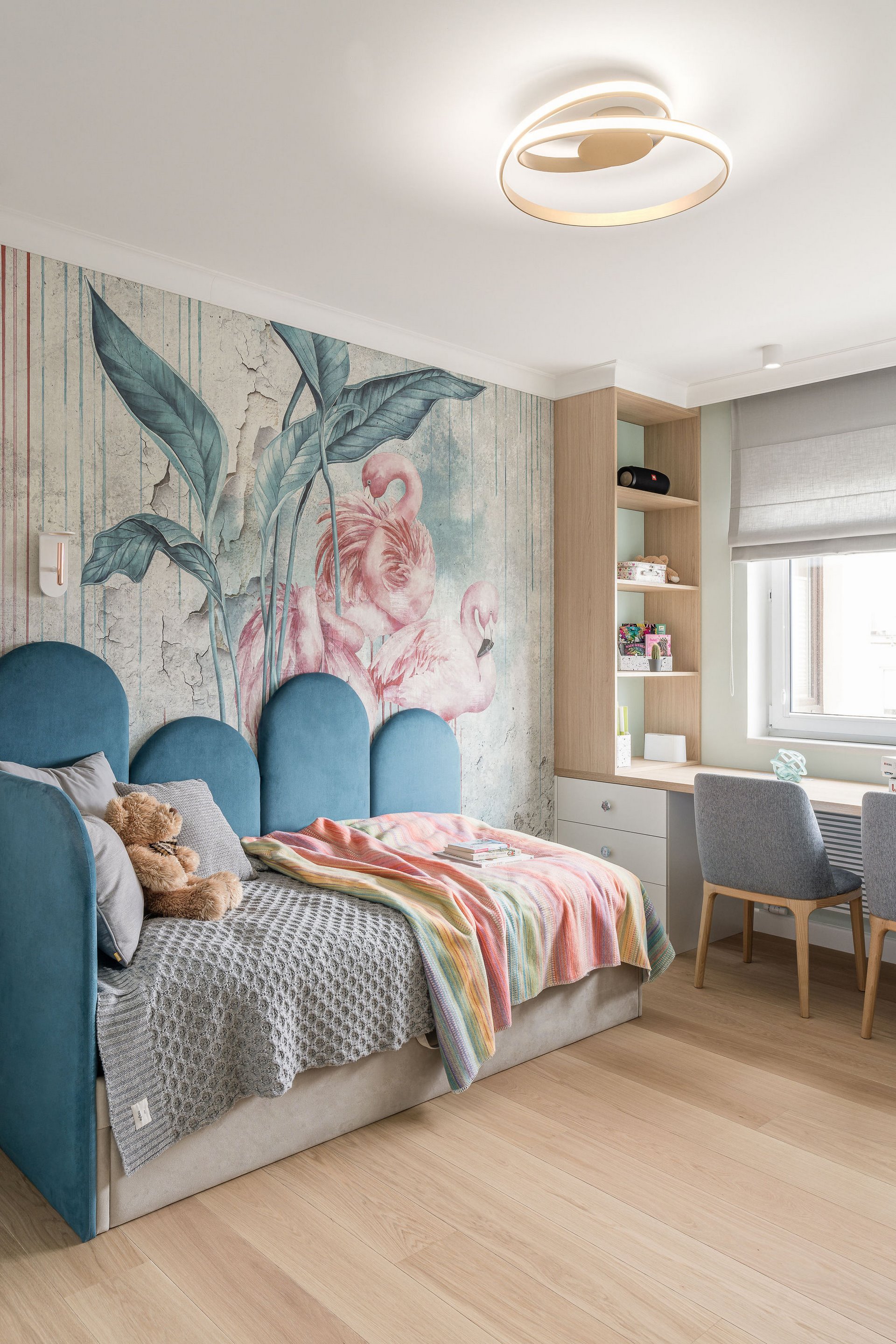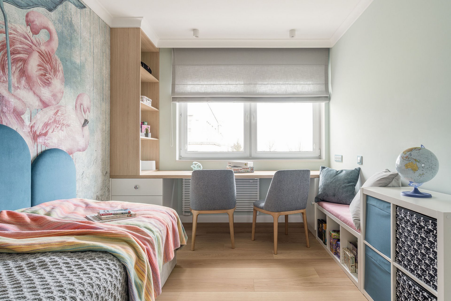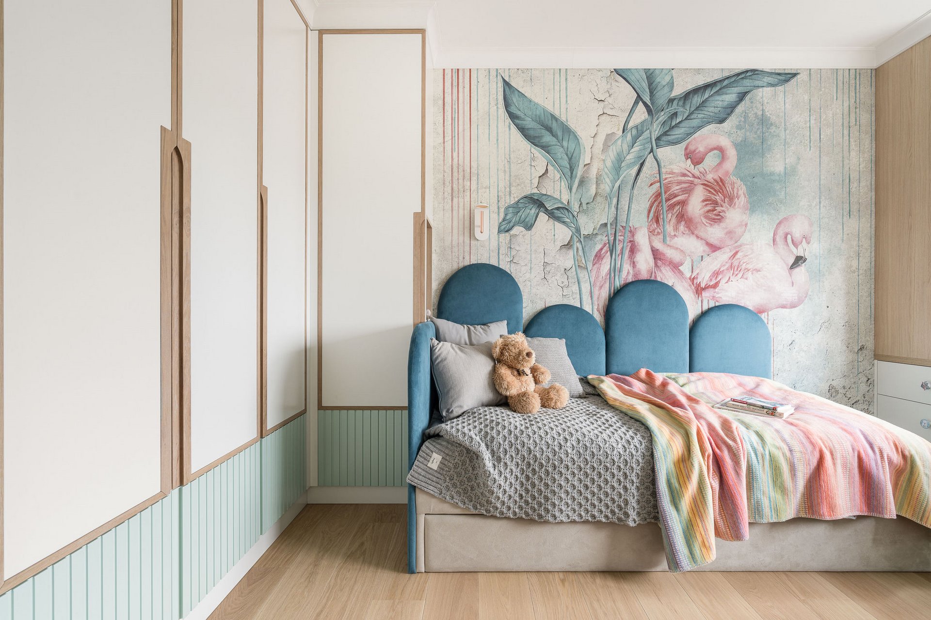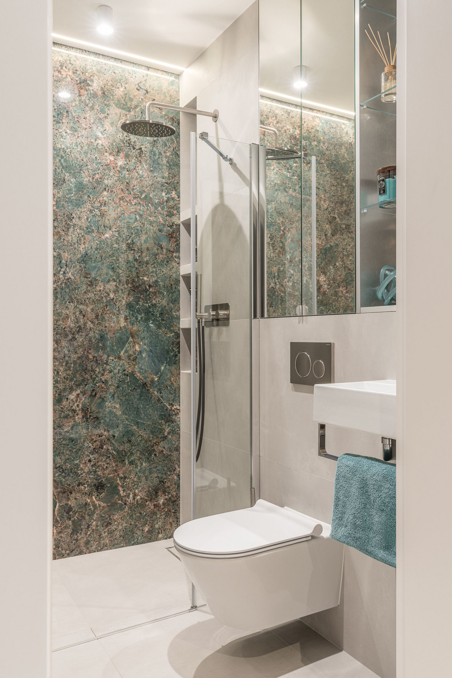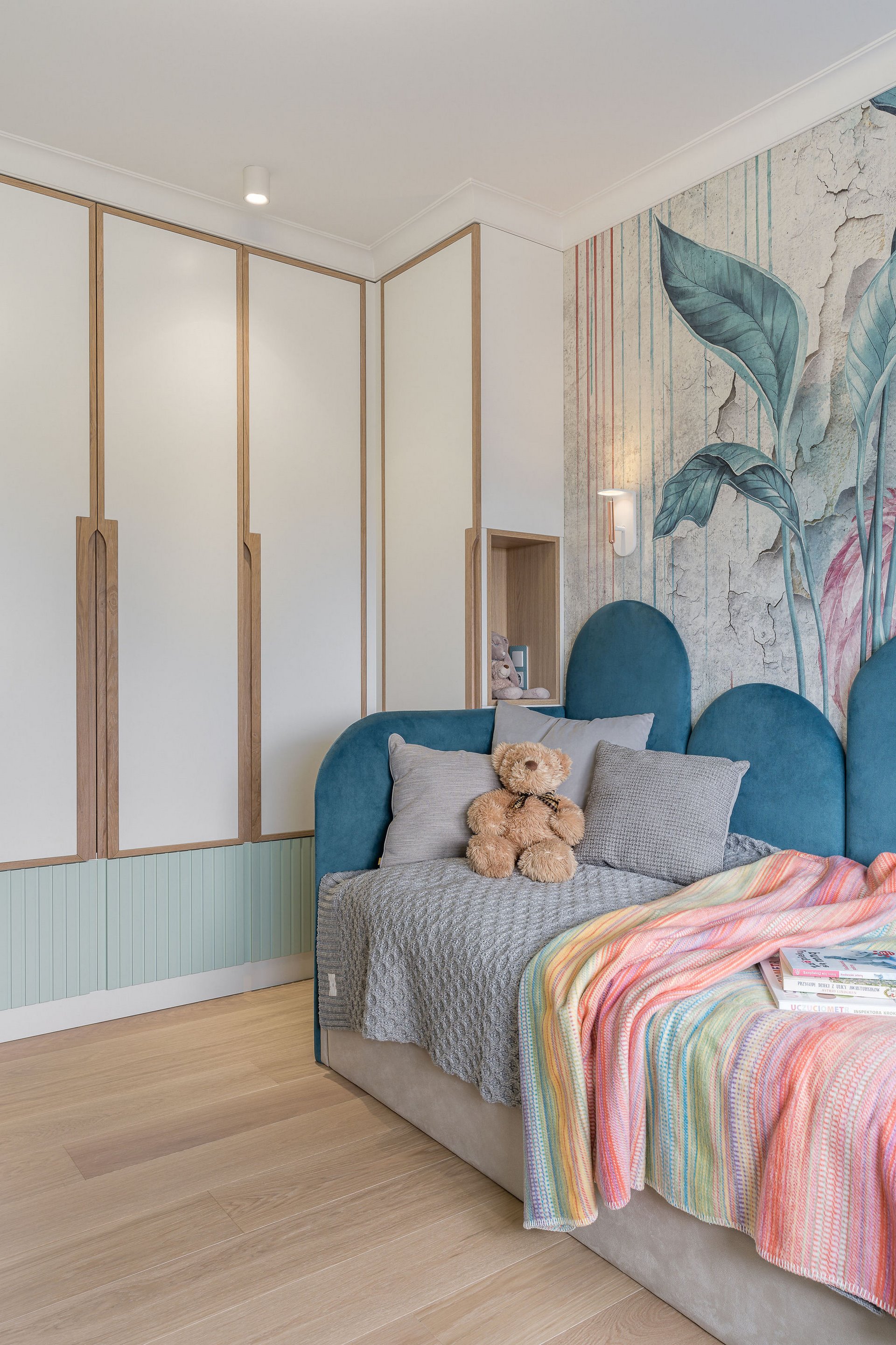 Family Apartment with Sea View. Our aim for this project was to create a bright and cozy atmosphere. The apartment was supposed to give a feeling of warmth and comfort. The combination of beige and gray can also be sophisticated. We are further accompanied by glamor accents in the form of decorative lamps, beveled mirrors or LED backlights. The bedroom has been kept in coastal climate, and the colour of the decorative radiator has been matched to the colour of the coastal wallpaper. Buttoned up to the last detail!