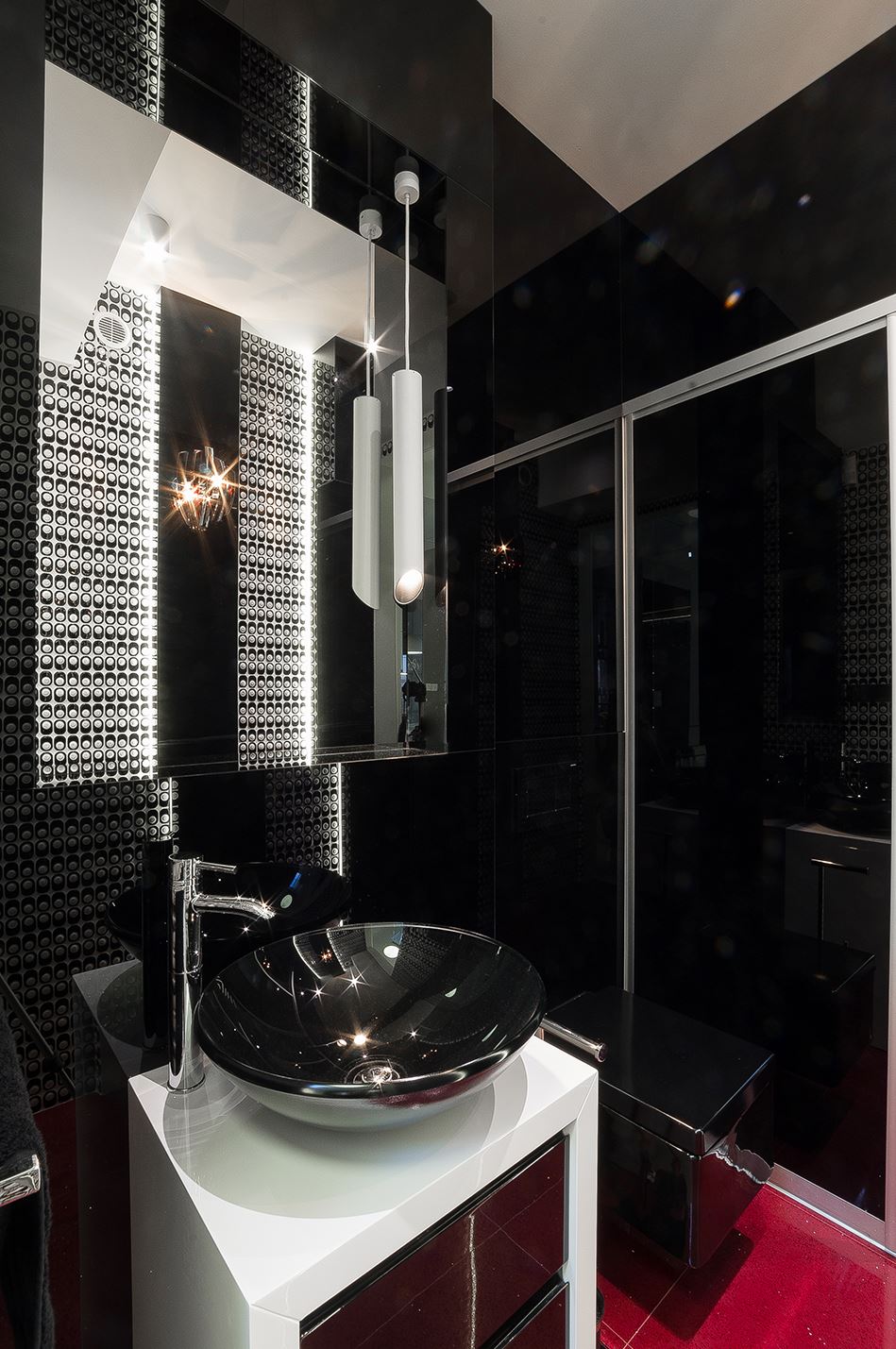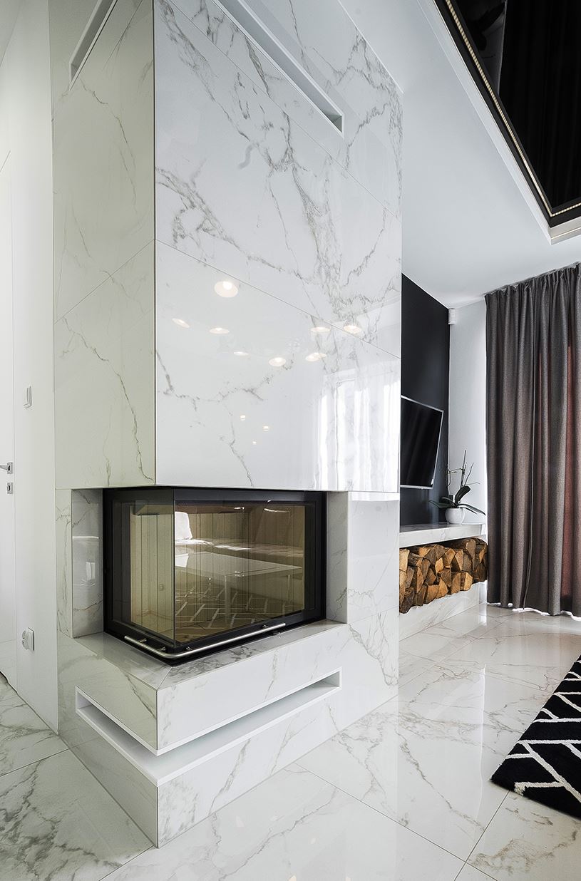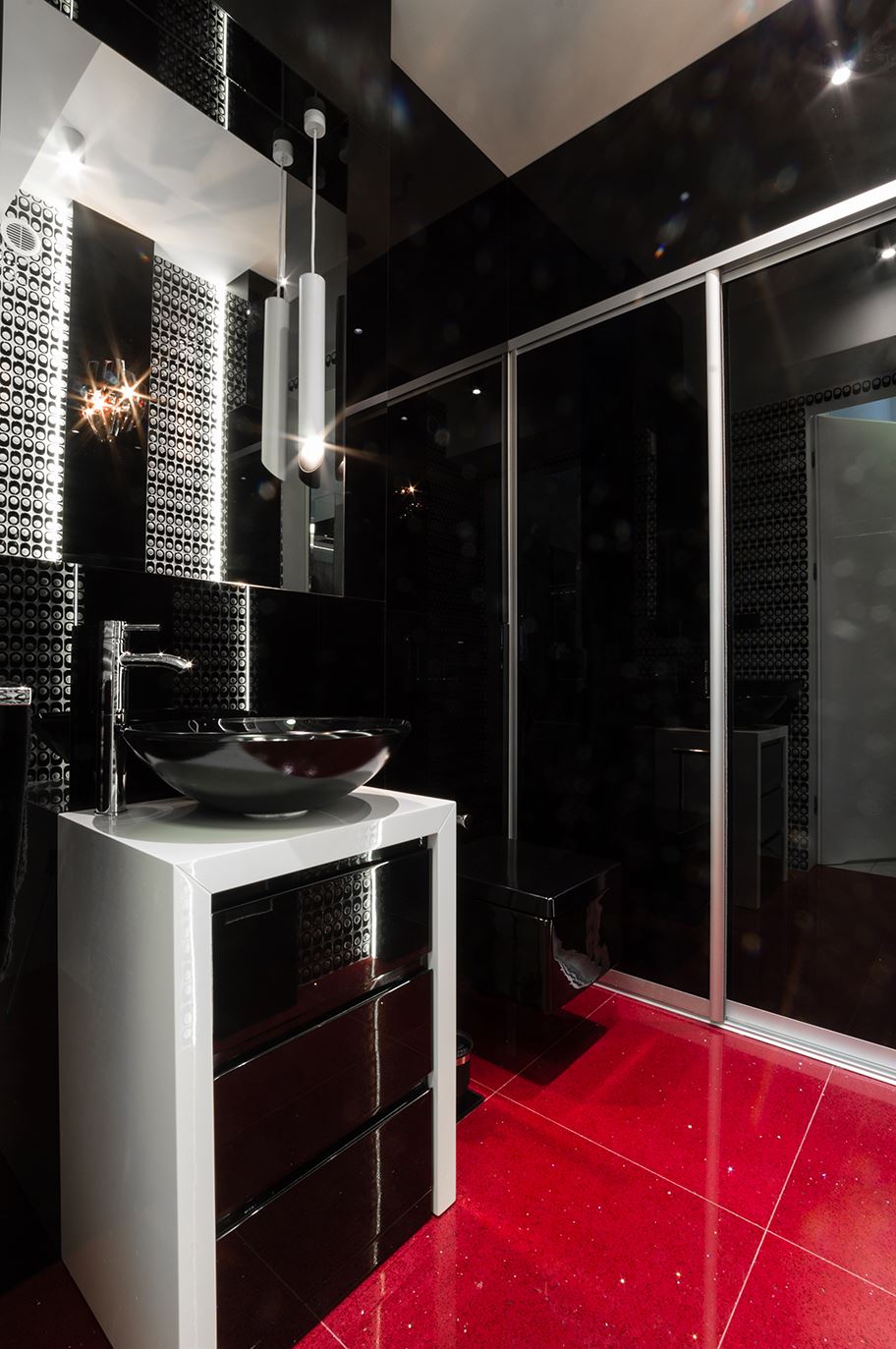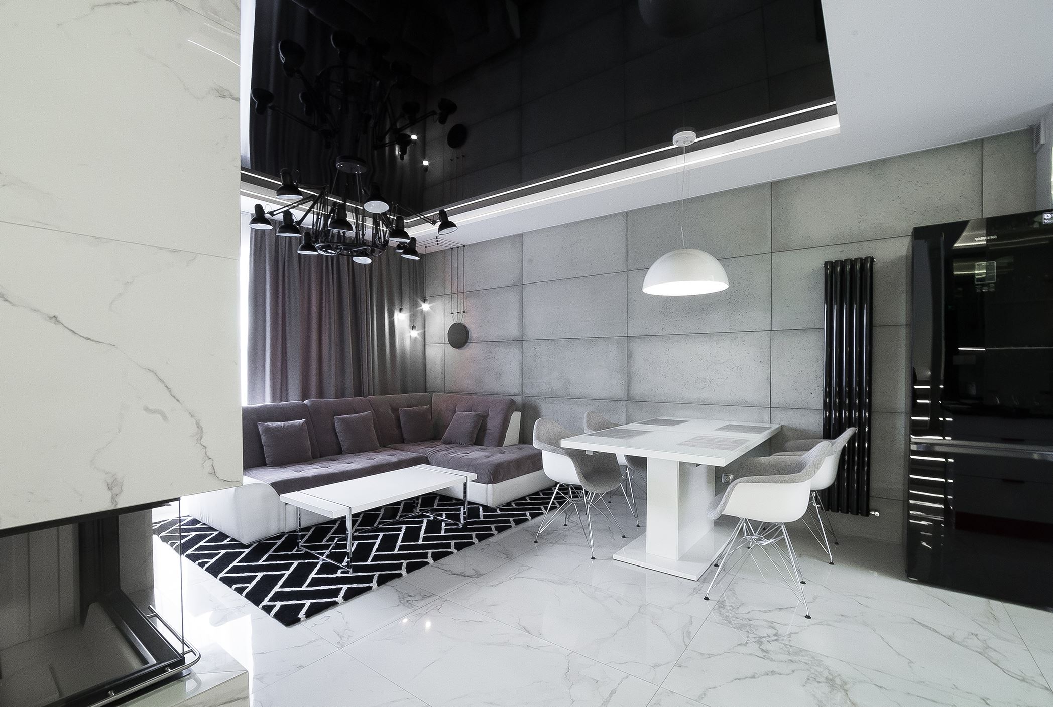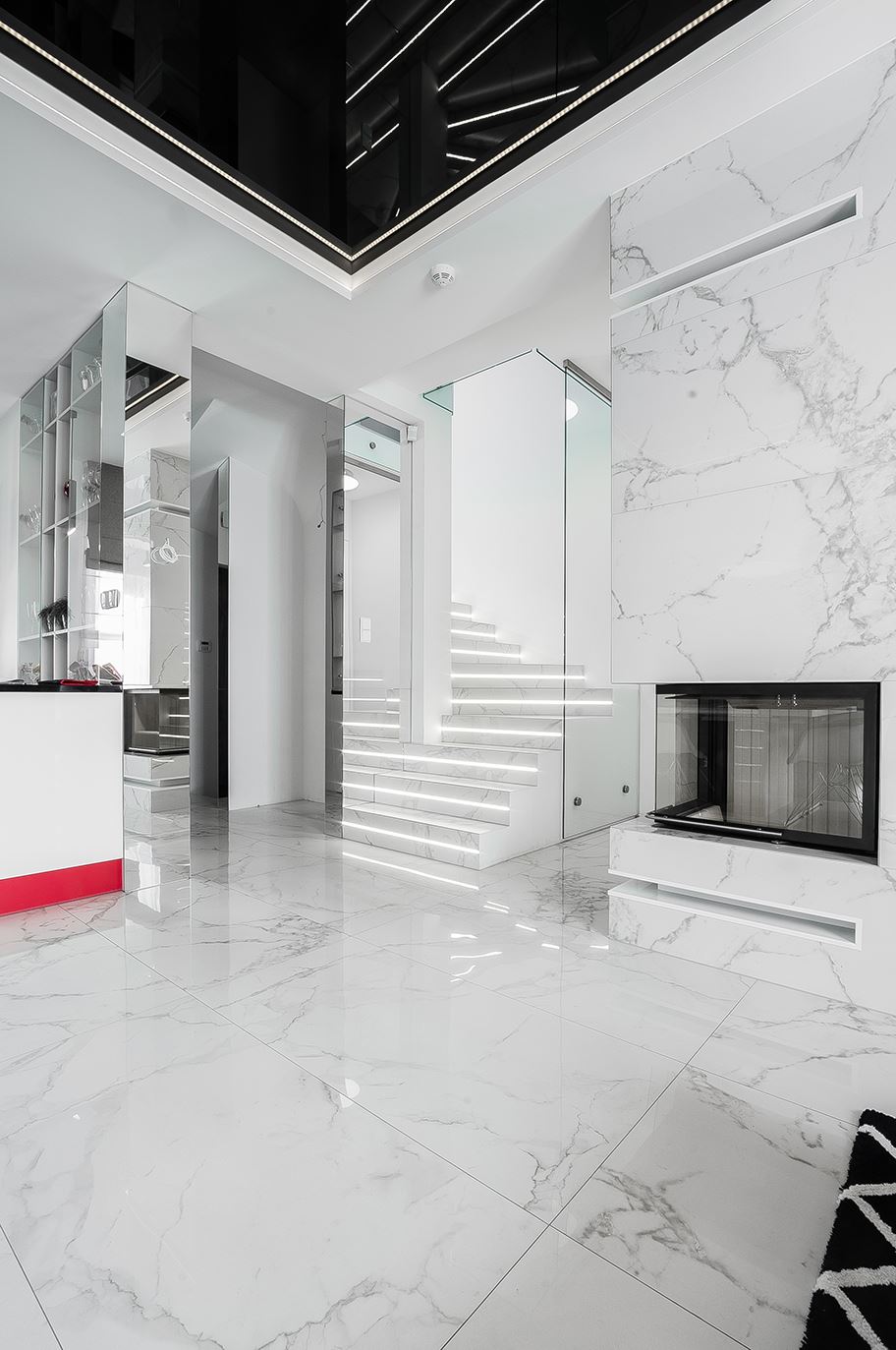 A cult project from IDEAL Interior Design Studio designed in an eclectic style combining elements of modernity and glamour. This is my first realisation using tiles that perfectly imitate marble, even before it became so fashionable. One thing is certain, untill I use exactly this model of tiles when designing marble surfaces. The living room makes a great impression in this investment, and all thanks to the combination of concrete slabs and "marble" tiles with a black mirror stretch ceiling. This space is completed by a beautiful Eichholtz carpet and lighting (spider lamp + Skygarden lamp). The guest bathroom is the next revolution! We combine red quartzite with a beautiful mosaic from Ardea Arte. Original and innovative stairs with LED lights in the middle of the tread lead us to the first floor, where another bathroom and rooms do not differ in character from the rest of the house.