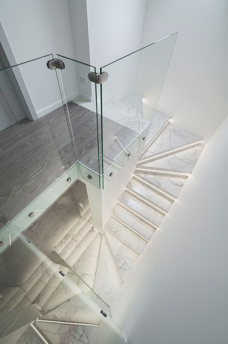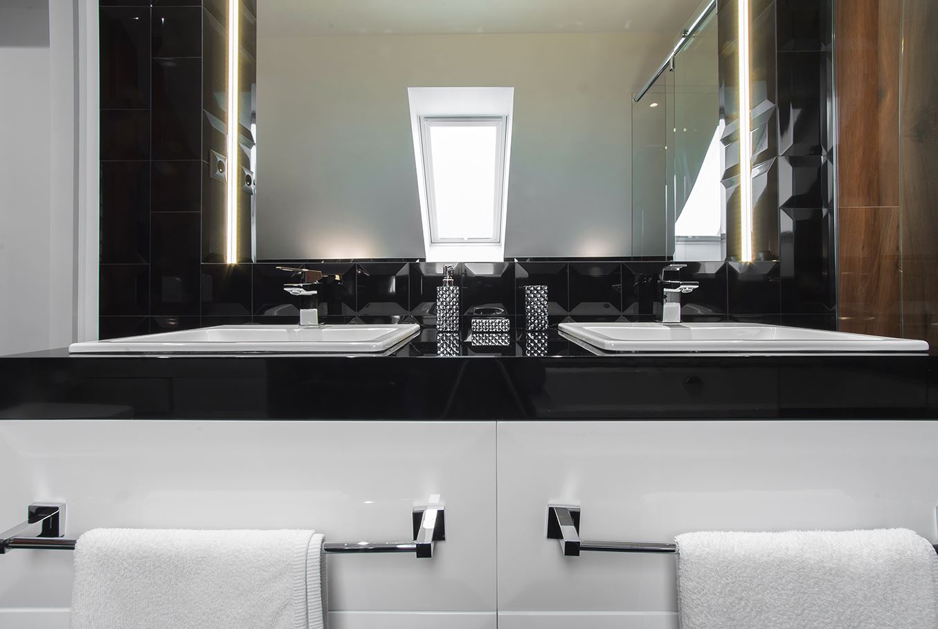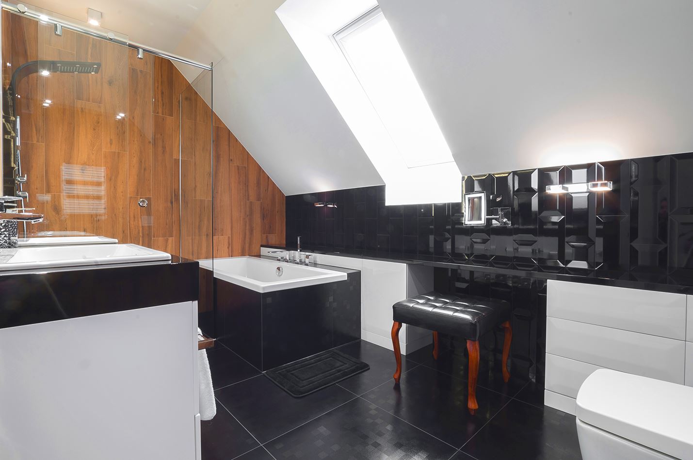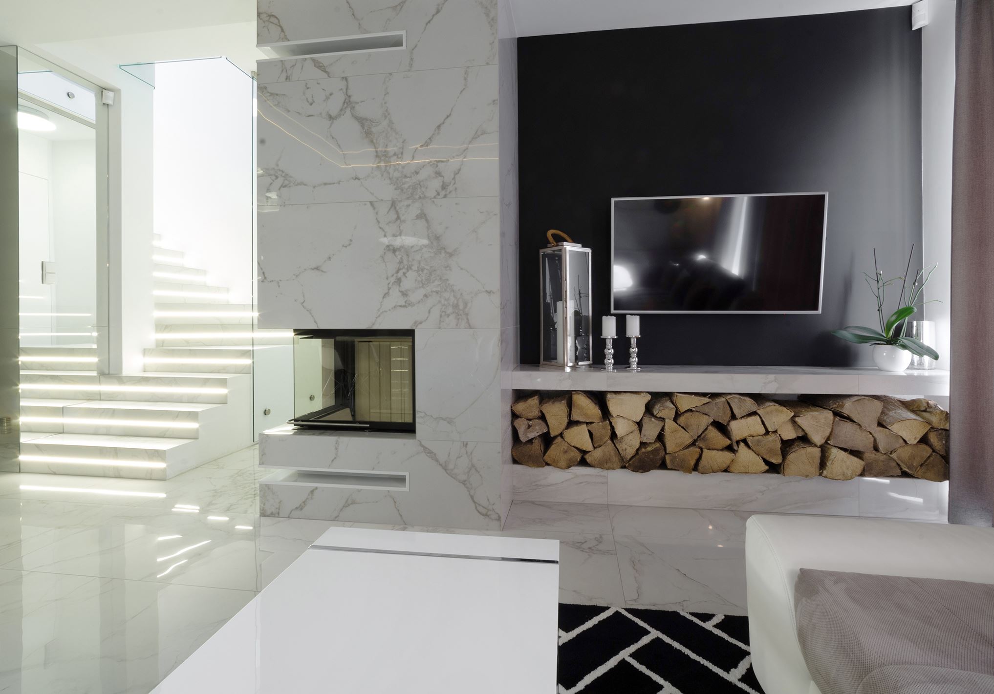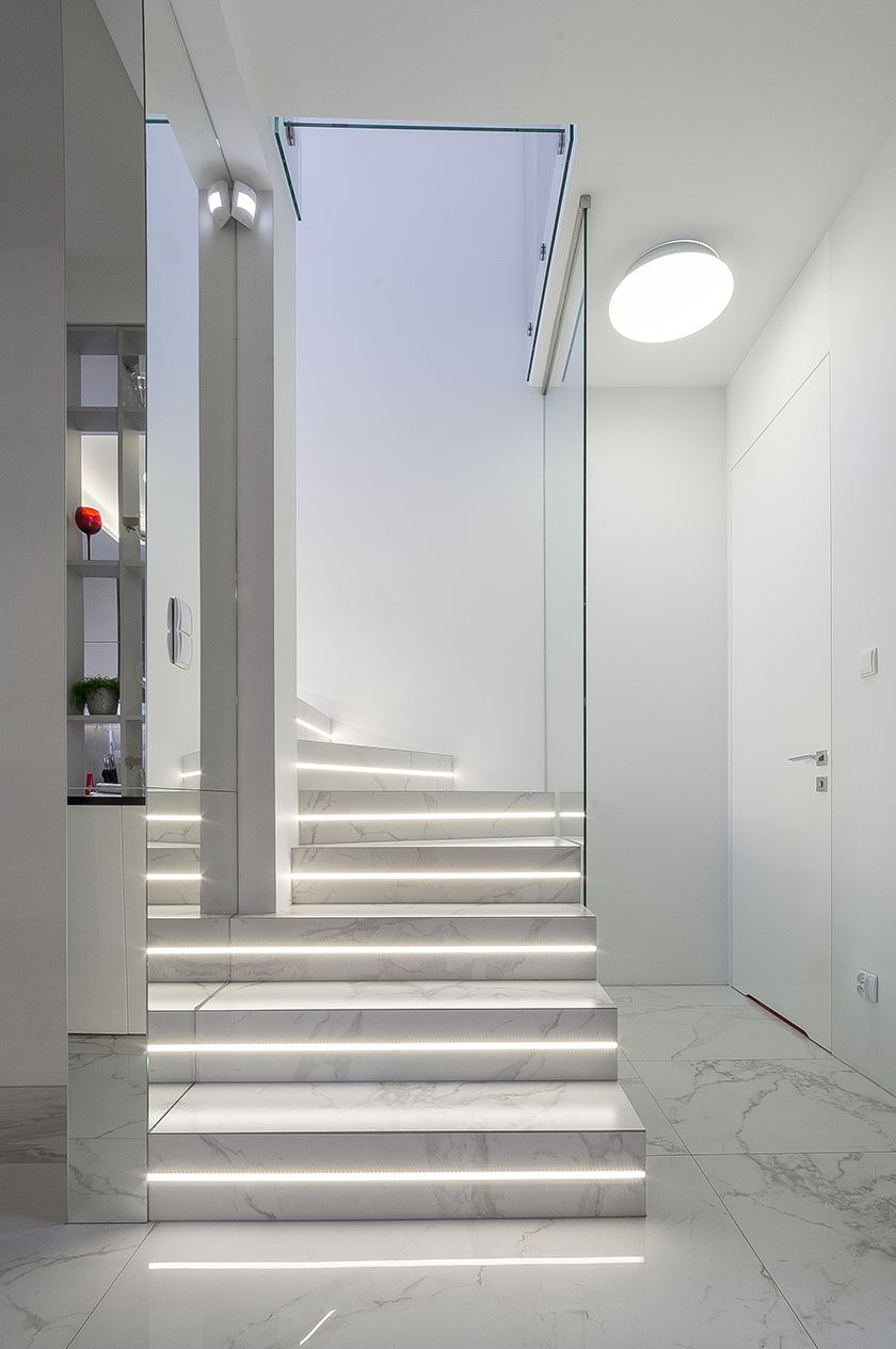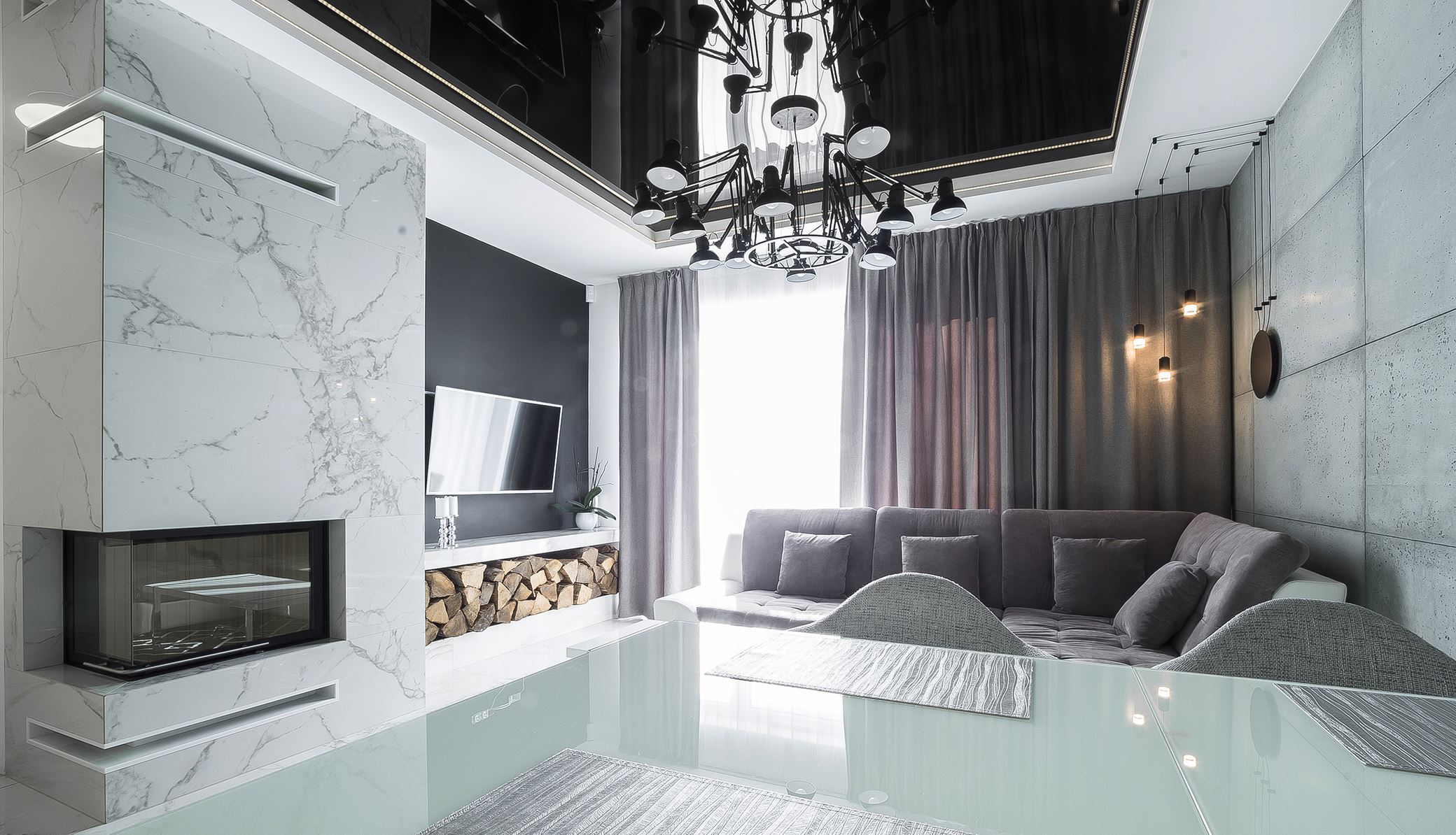 A cult project from IDEAL Interior Design Studio designed in an eclectic style combining elements of modernity and glamour. This is my first realisation using tiles that perfectly imitate marble, even before it became so fashionable. One thing is certain, untill I use exactly this model of tiles when designing marble surfaces. The living room makes a great impression in this investment, and all thanks to the combination of concrete slabs and "marble" tiles with a black mirror stretch ceiling. This space is completed by a beautiful Eichholtz carpet and lighting (spider lamp + Skygarden lamp). The guest bathroom is the next revolution! We combine red quartzite with a beautiful mosaic from Ardea Arte. Original and innovative stairs with LED lights in the middle of the tread lead us to the first floor, where another bathroom and rooms do not differ in character from the rest of the house.