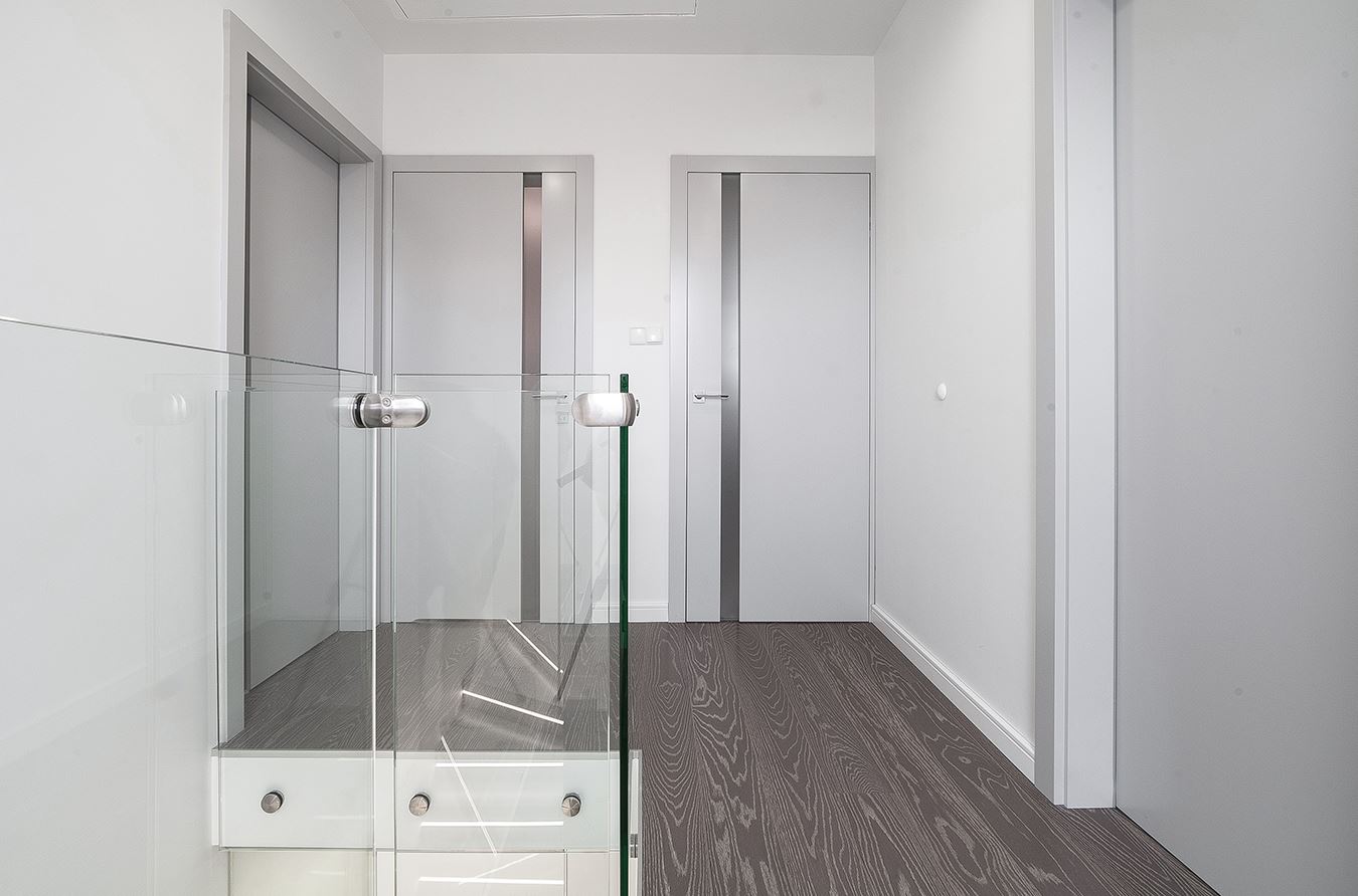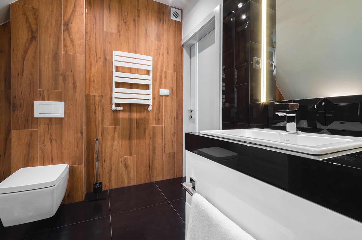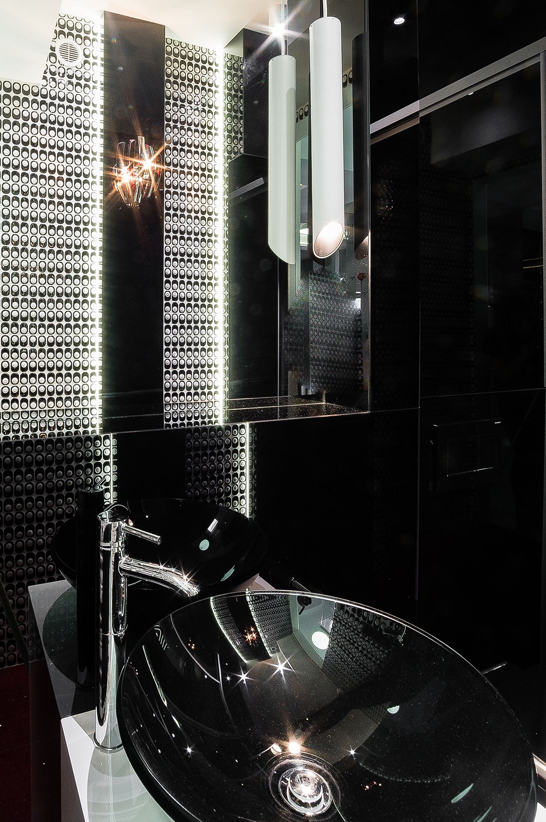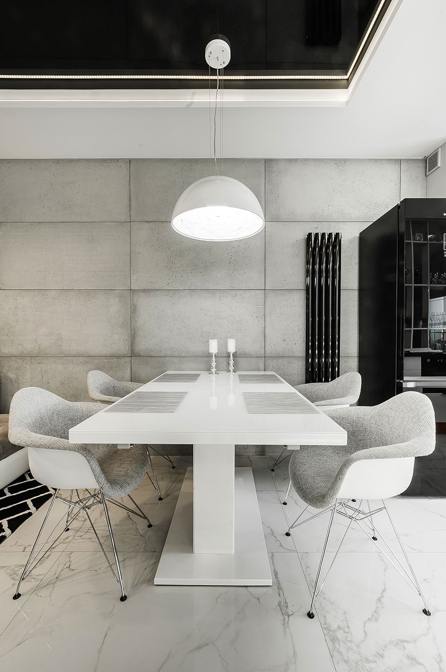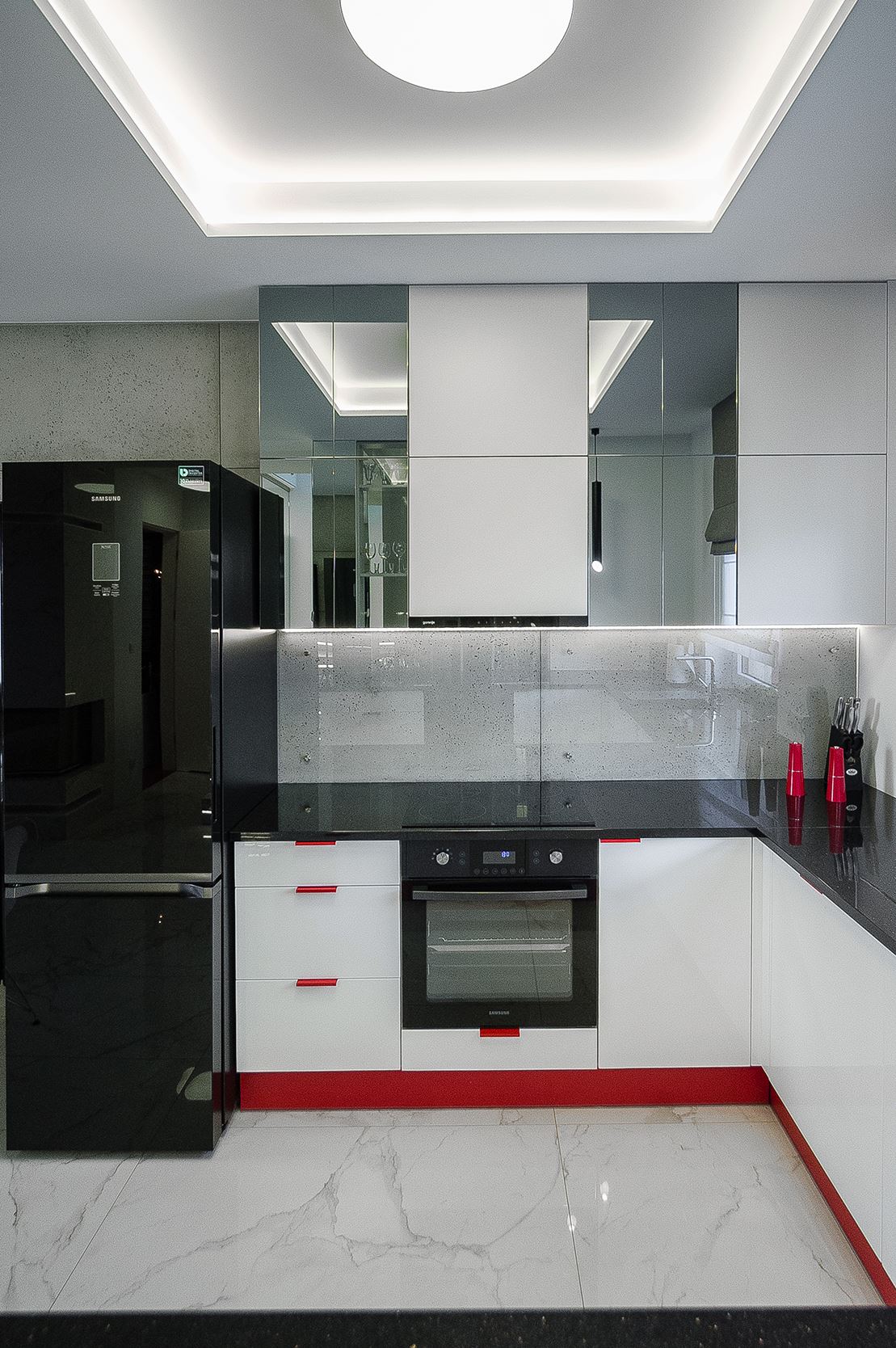 A cult project from IDEAL Interior Design Studio designed in an eclectic style combining elements of modernity and glamour. This is my first realisation using tiles that perfectly imitate marble, even before it became so fashionable. One thing is certain, untill I use exactly this model of tiles when designing marble surfaces. The living room makes a great impression in this investment, and all thanks to the combination of concrete slabs and "marble" tiles with a black mirror stretch ceiling. This space is completed by a beautiful Eichholtz carpet and lighting (spider lamp + Skygarden lamp). The guest bathroom is the next revolution! We combine red quartzite with a beautiful mosaic from Ardea Arte. Original and innovative stairs with LED lights in the middle of the tread lead us to the first floor, where another bathroom and rooms do not differ in character from the rest of the house.