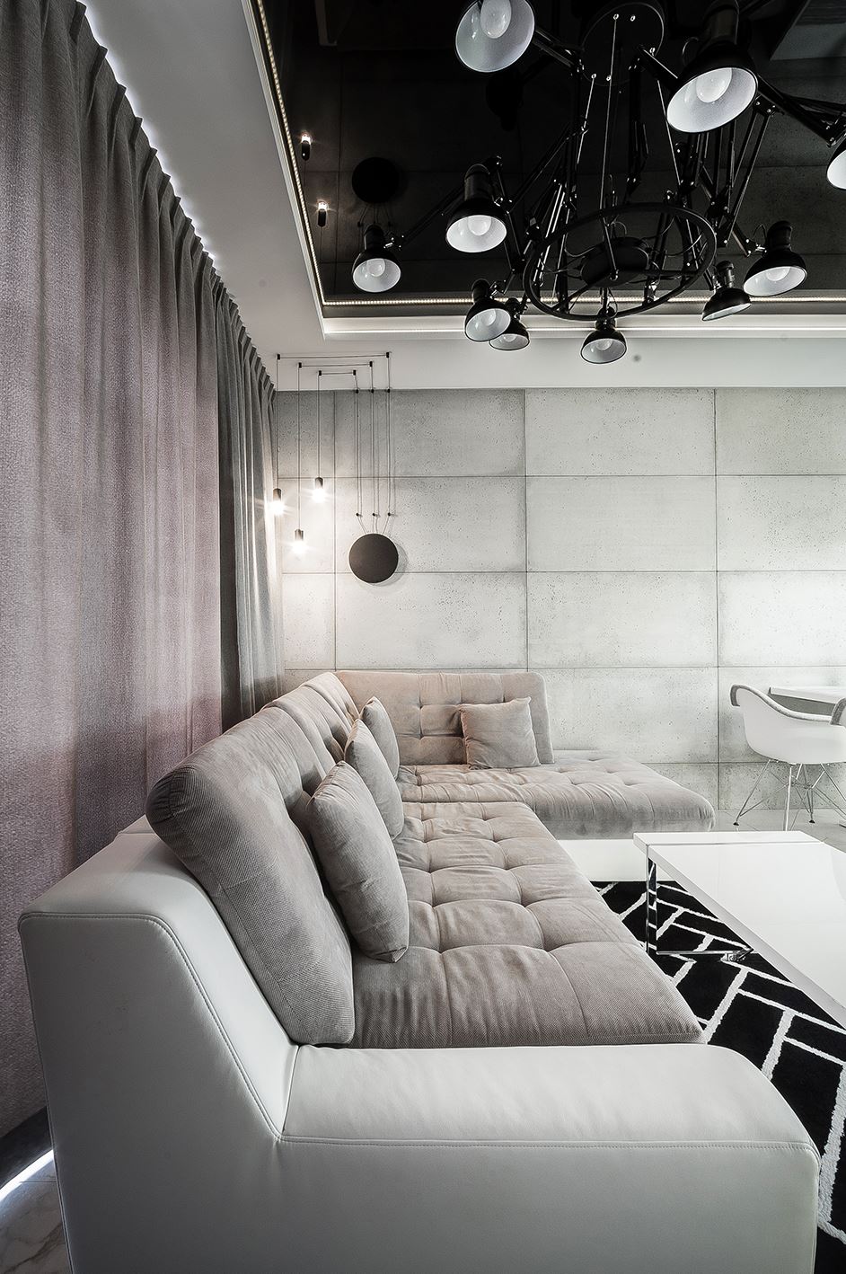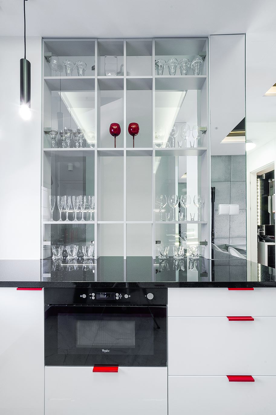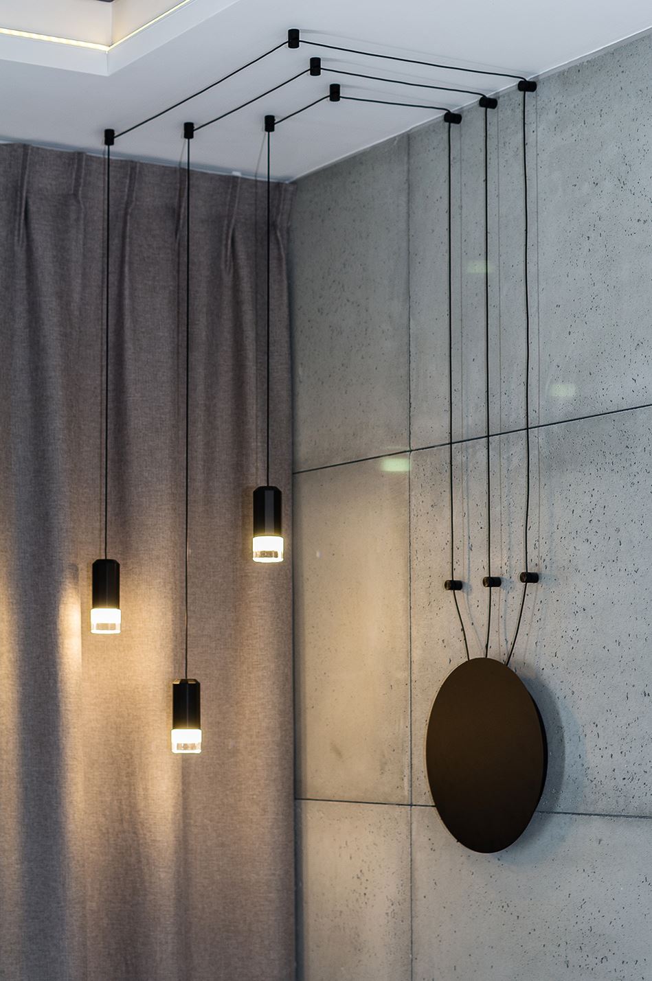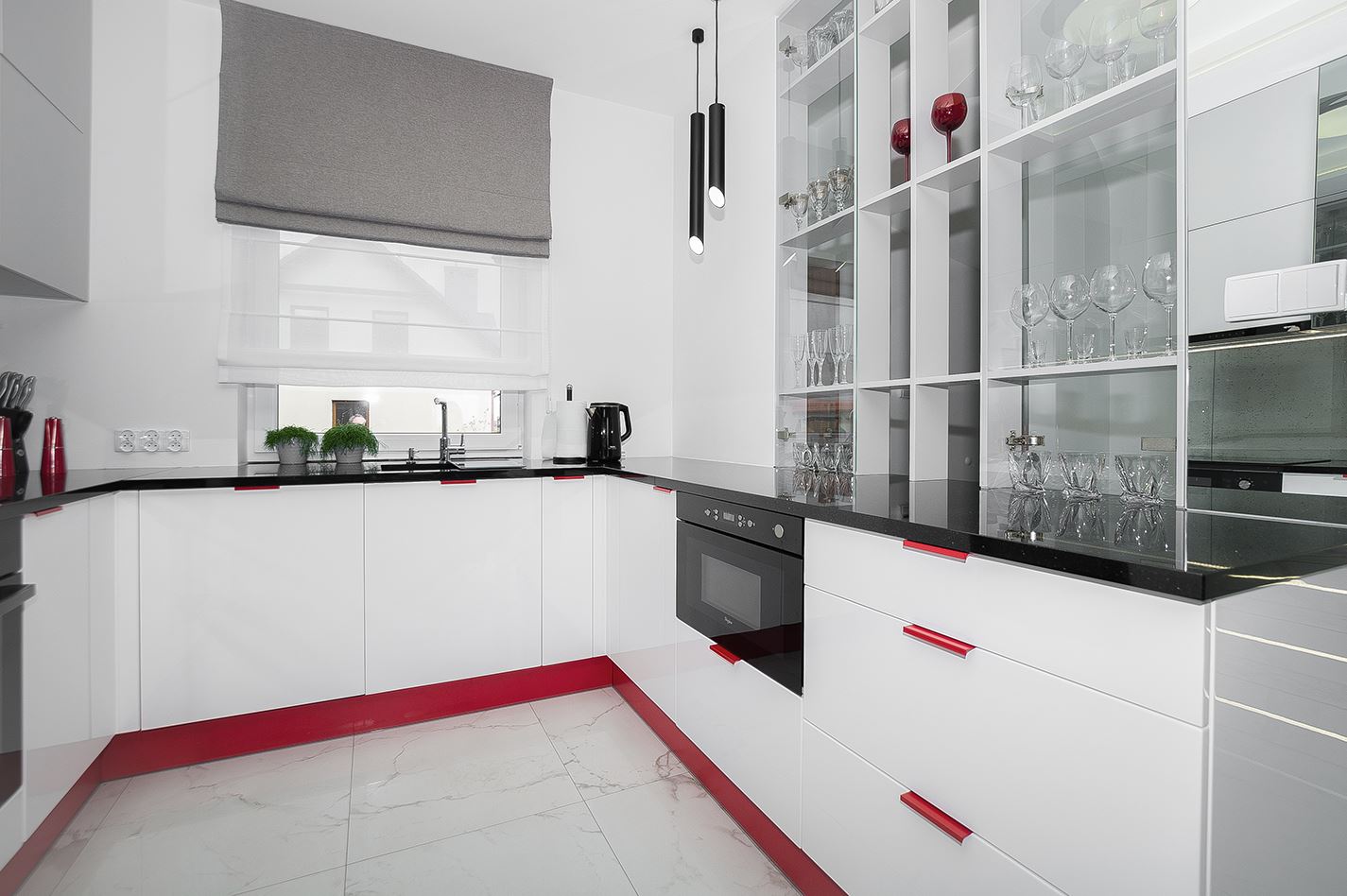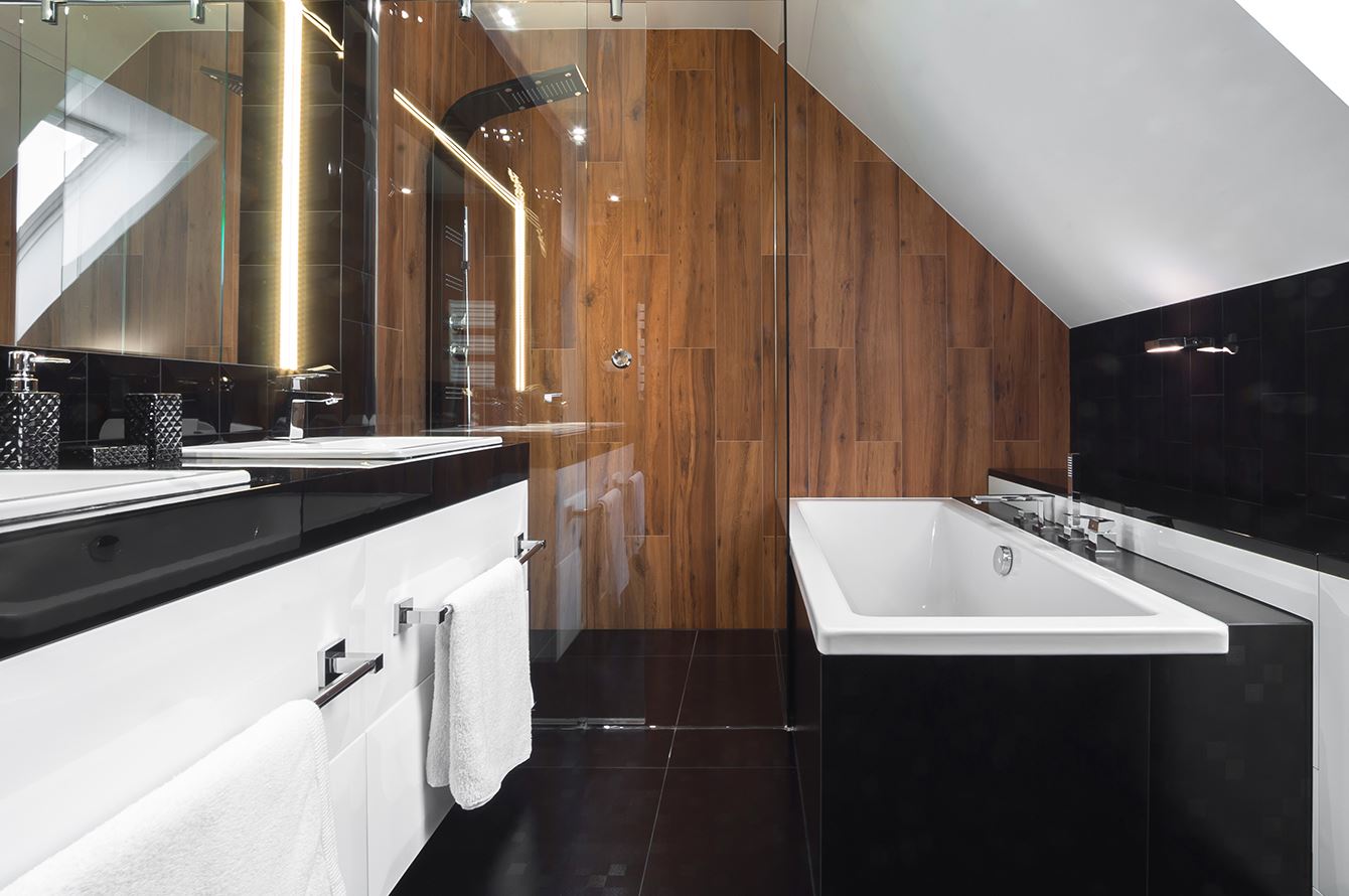 A cult project from IDEAL Interior Design Studio designed in an eclectic style combining elements of modernity and glamour. This is my first realisation using tiles that perfectly imitate marble, even before it became so fashionable. One thing is certain, untill I use exactly this model of tiles when designing marble surfaces. The living room makes a great impression in this investment, and all thanks to the combination of concrete slabs and "marble" tiles with a black mirror stretch ceiling. This space is completed by a beautiful Eichholtz carpet and lighting (spider lamp + Skygarden lamp). The guest bathroom is the next revolution! We combine red quartzite with a beautiful mosaic from Ardea Arte. Original and innovative stairs with LED lights in the middle of the tread lead us to the first floor, where another bathroom and rooms do not differ in character from the rest of the house.