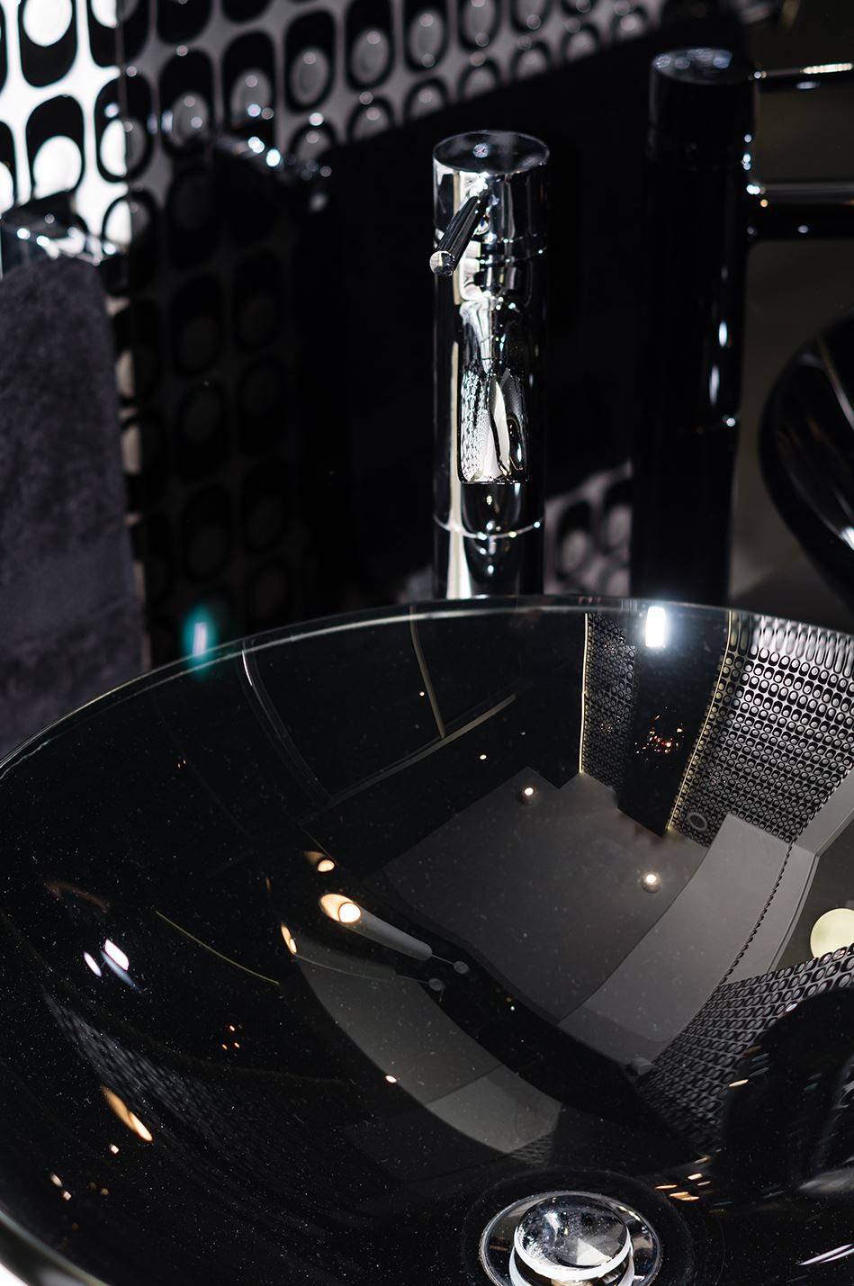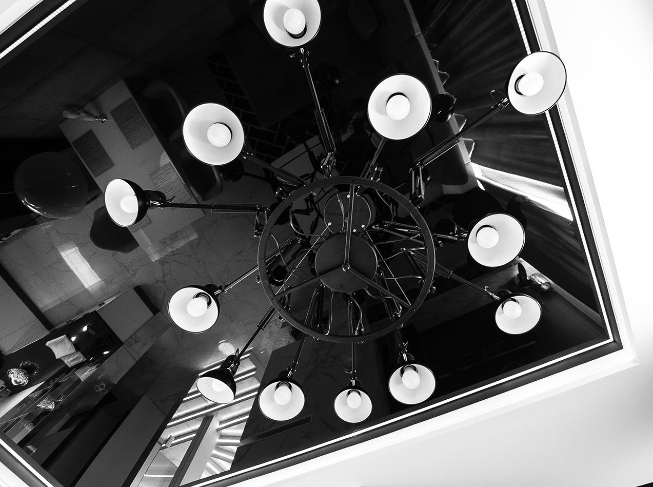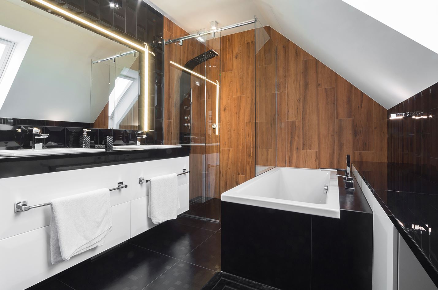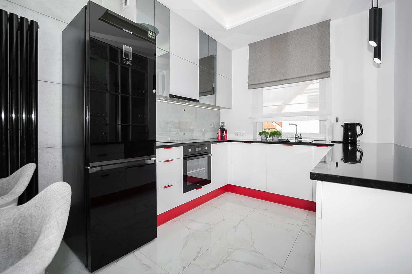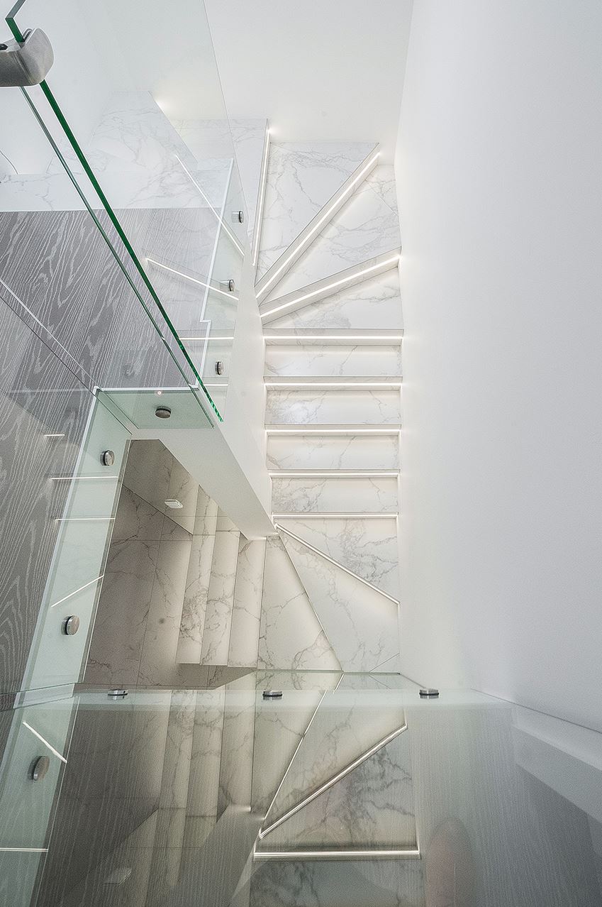 A cult project from IDEAL Interior Design Studio designed in an eclectic style combining elements of modernity and glamour. This is my first realisation using tiles that perfectly imitate marble, even before it became so fashionable. One thing is certain, untill I use exactly this model of tiles when designing marble surfaces. The living room makes a great impression in this investment, and all thanks to the combination of concrete slabs and "marble" tiles with a black mirror stretch ceiling. This space is completed by a beautiful Eichholtz carpet and lighting (spider lamp + Skygarden lamp). The guest bathroom is the next revolution! We combine red quartzite with a beautiful mosaic from Ardea Arte. Original and innovative stairs with LED lights in the middle of the tread lead us to the first floor, where another bathroom and rooms do not differ in character from the rest of the house.