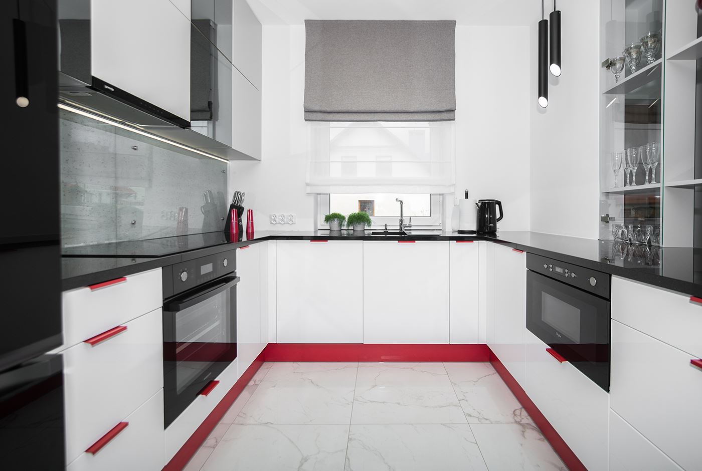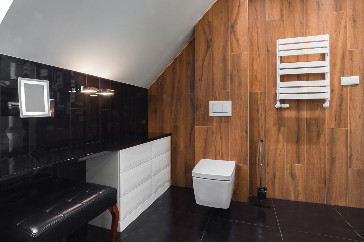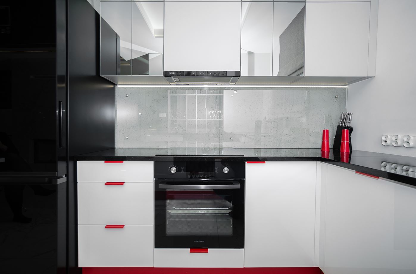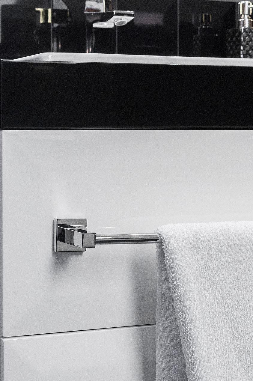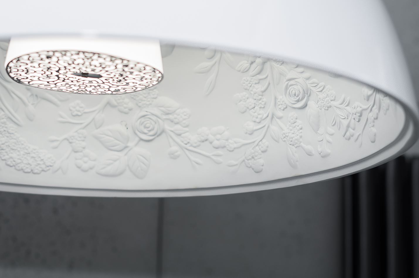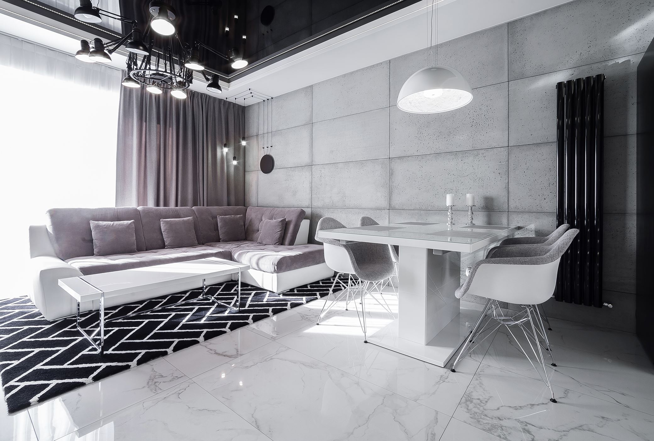 A cult project from IDEAL Interior Design Studio designed in an eclectic style combining elements of modernity and glamour. This is my first realisation using tiles that perfectly imitate marble, even before it became so fashionable. One thing is certain, untill I use exactly this model of tiles when designing marble surfaces. The living room makes a great impression in this investment, and all thanks to the combination of concrete slabs and "marble" tiles with a black mirror stretch ceiling. This space is completed by a beautiful Eichholtz carpet and lighting (spider lamp + Skygarden lamp). The guest bathroom is the next revolution! We combine red quartzite with a beautiful mosaic from Ardea Arte. Original and innovative stairs with LED lights in the middle of the tread lead us to the first floor, where another bathroom and rooms do not differ in character from the rest of the house.