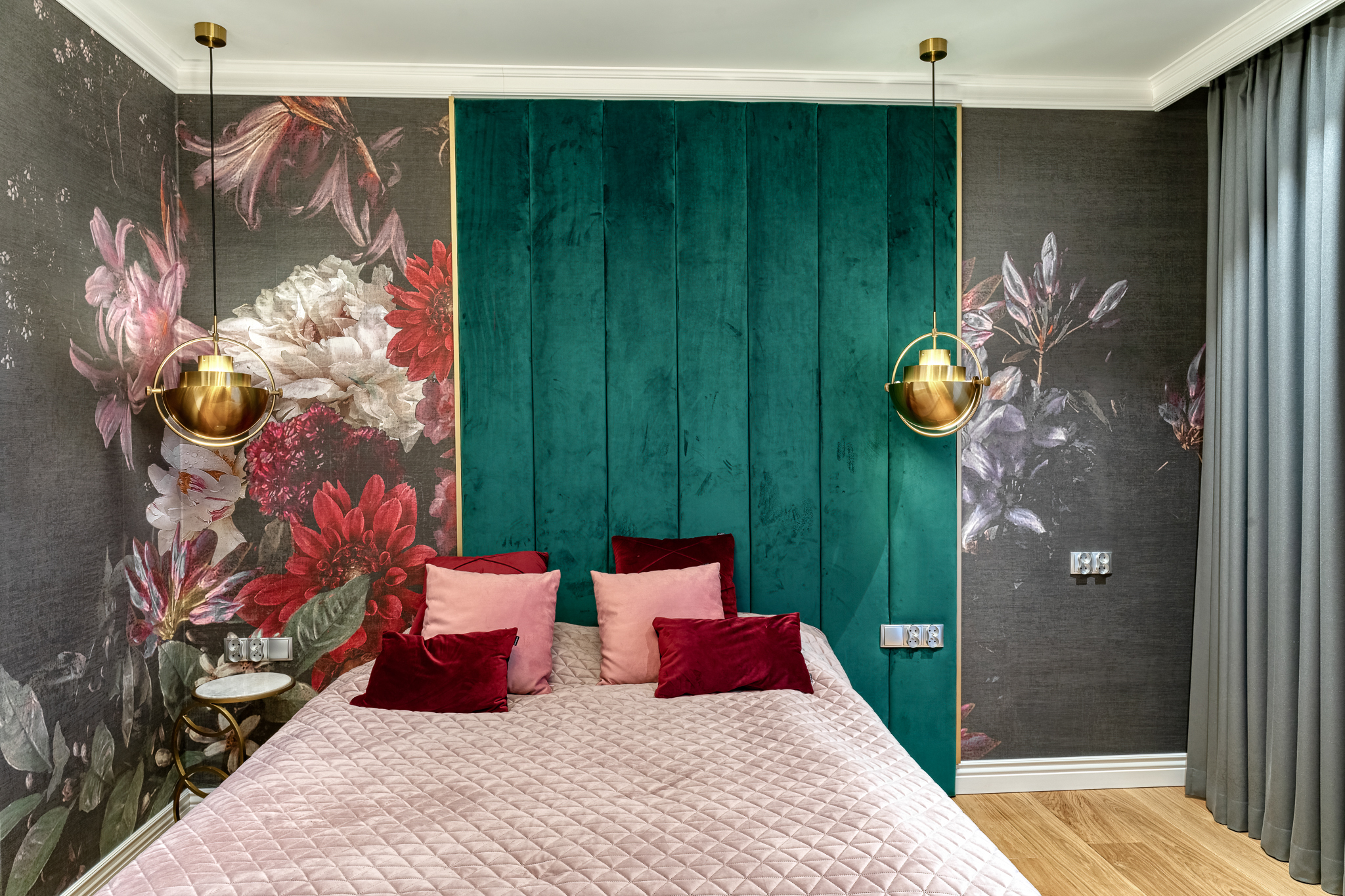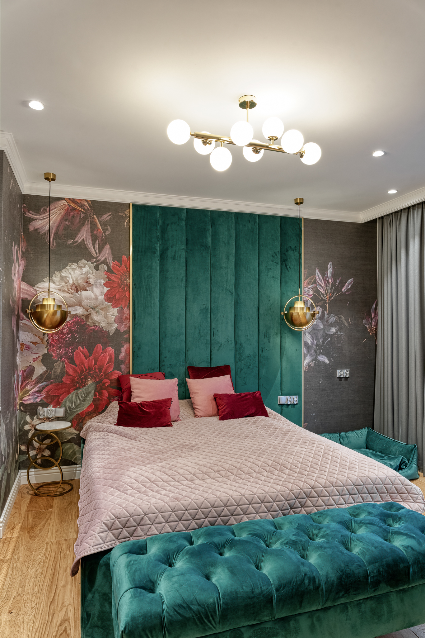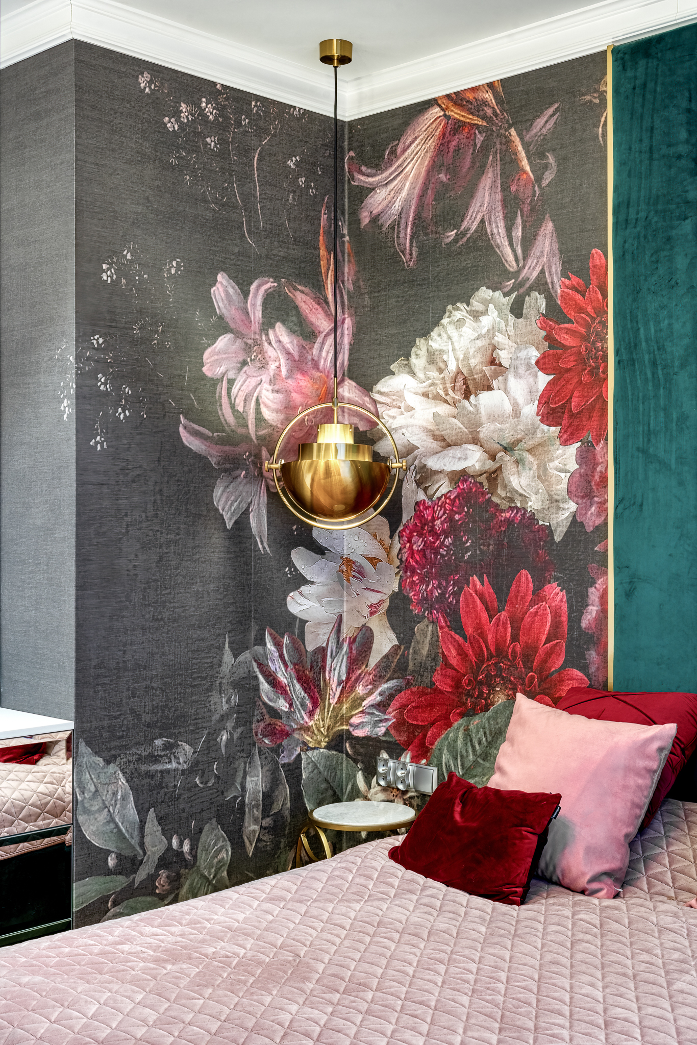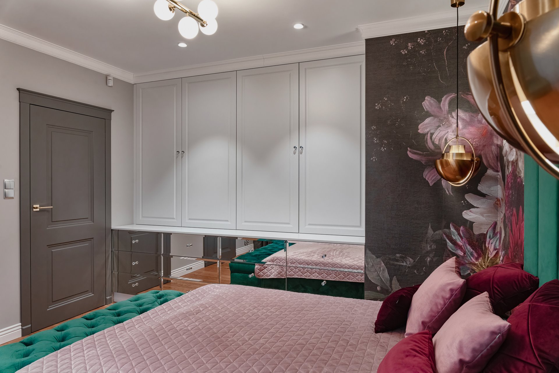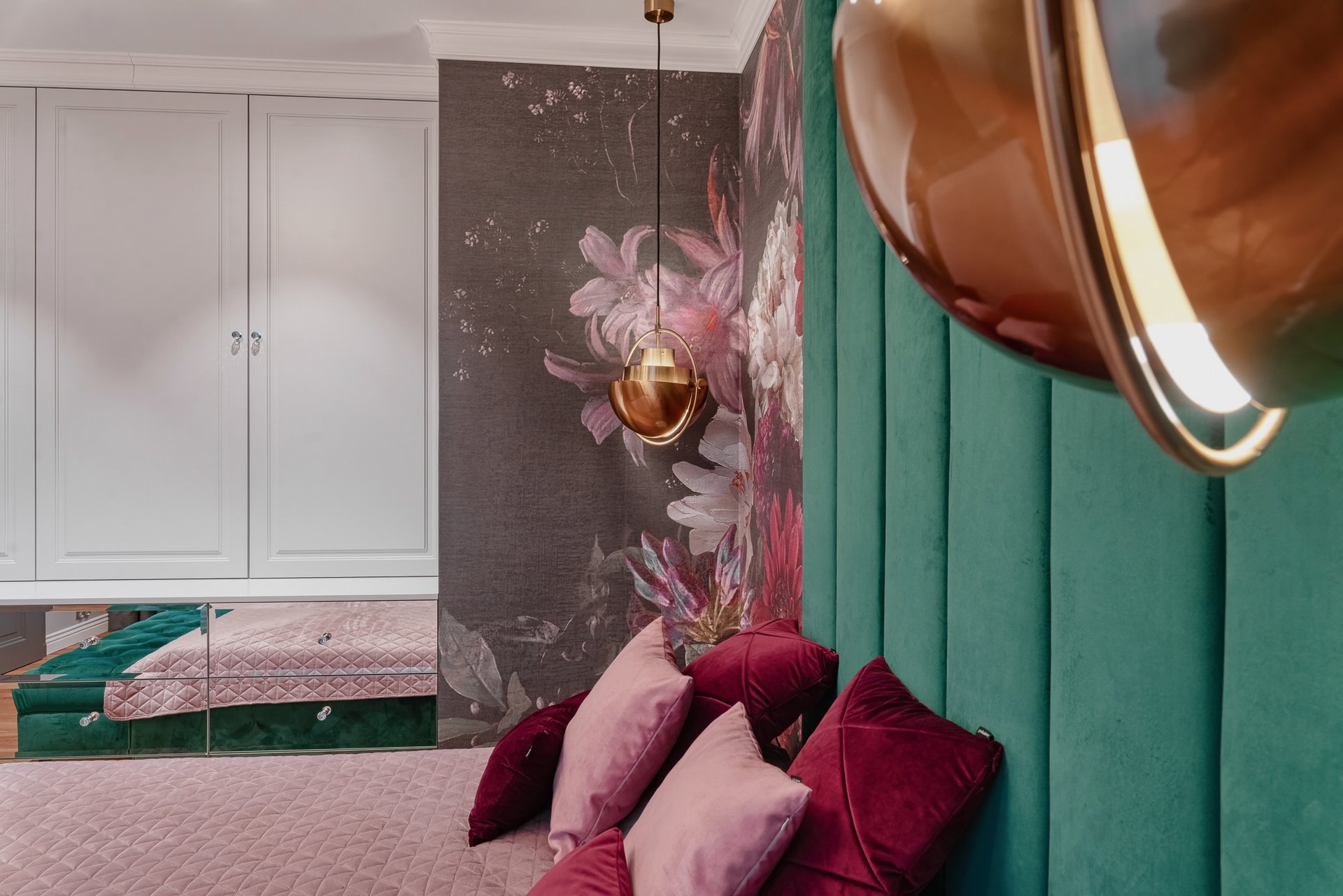 The design of a family interior decoratd with feminine taste. Thanks to great investors, an interior full of crystals, floral patterns and colour (bottle green, emerald) was created. The project included the ground floor: study, kitchen, living room with dining room, guest bathroom; and the first floor where the bedroom and main bathroom were designed at that moment. The interiors have been designed to create colour and material consistency with the ground floor of the house.