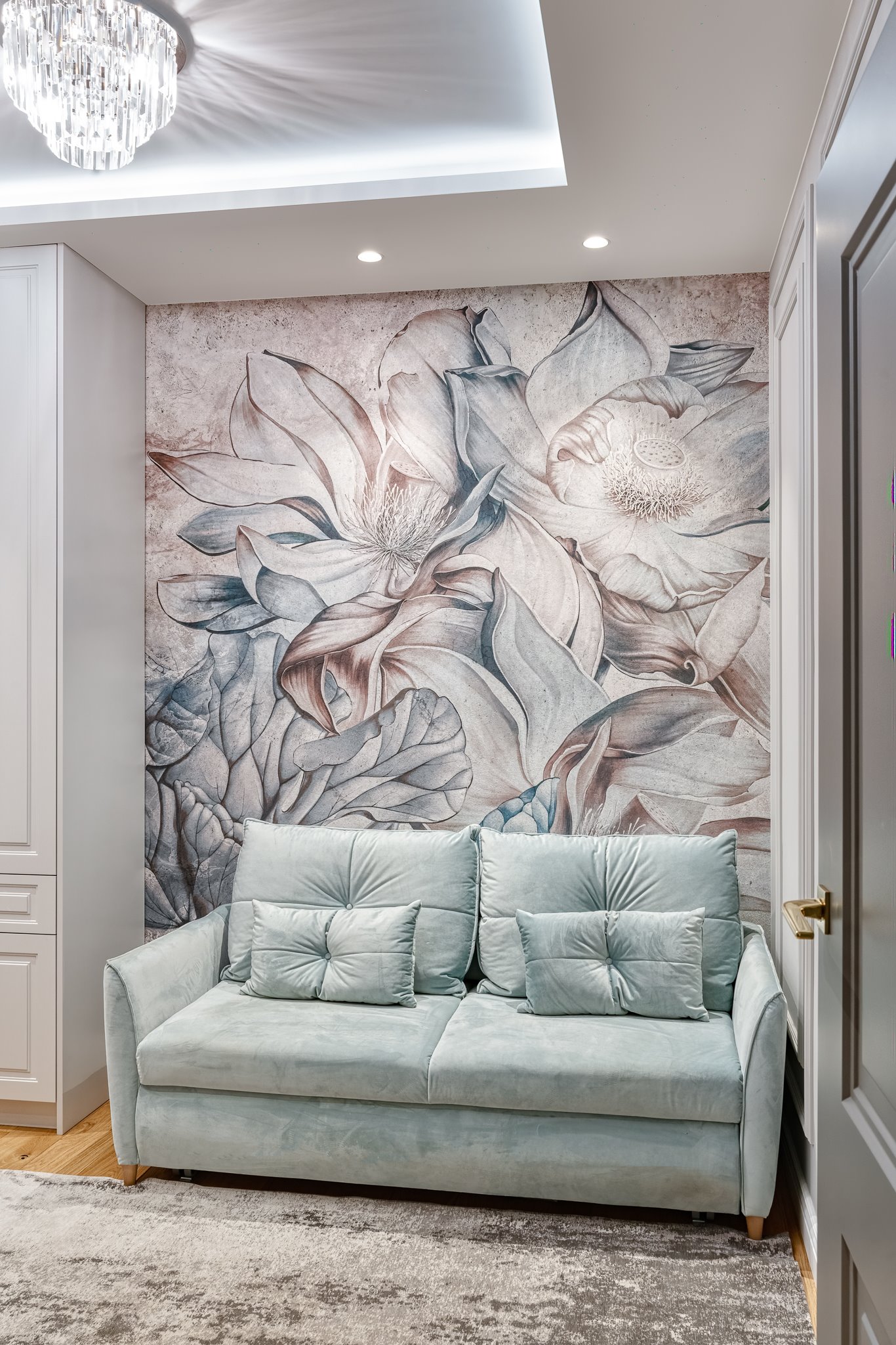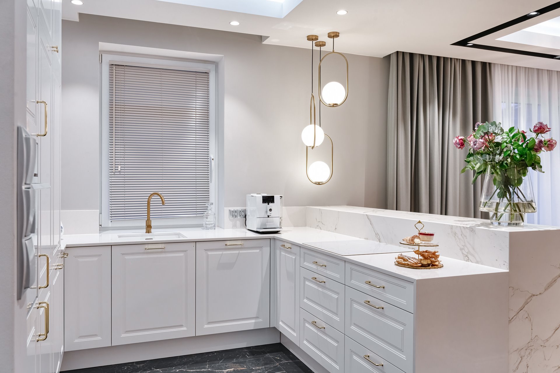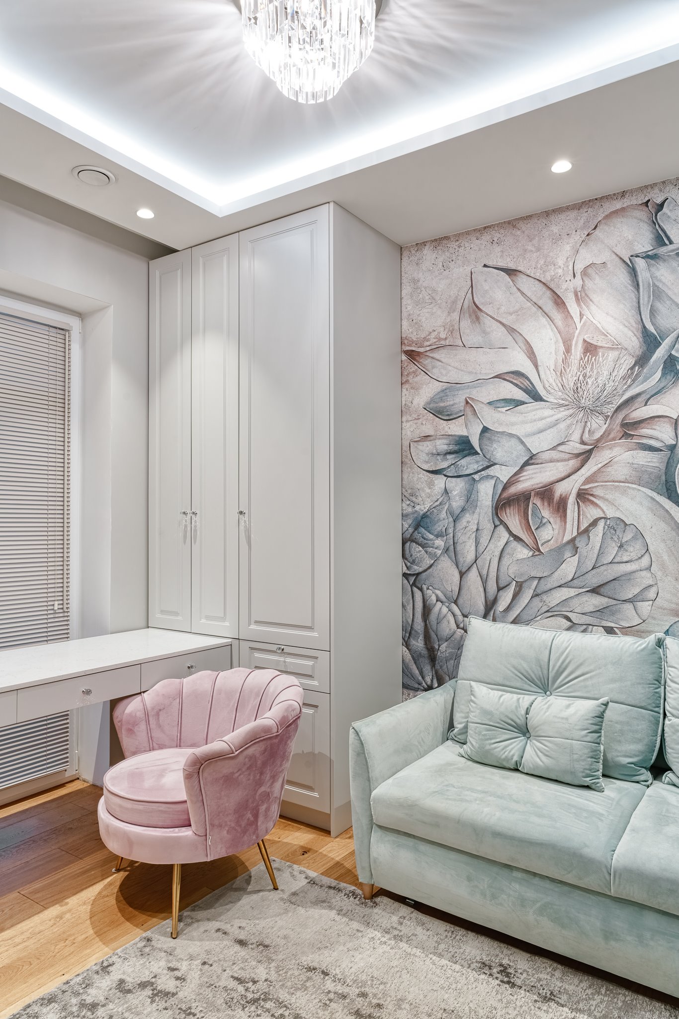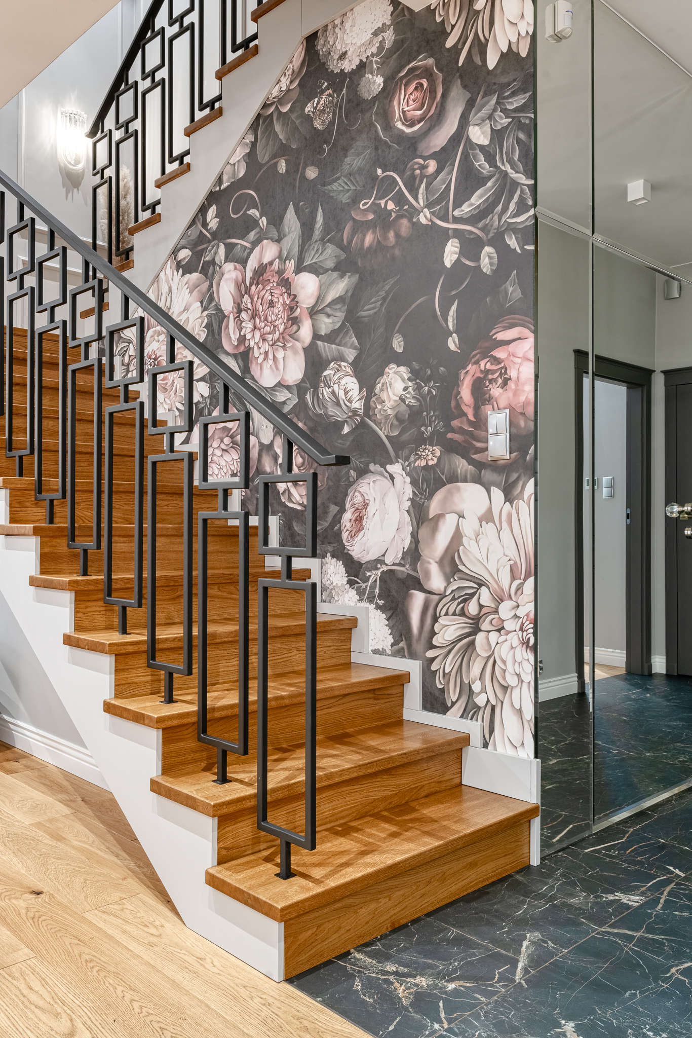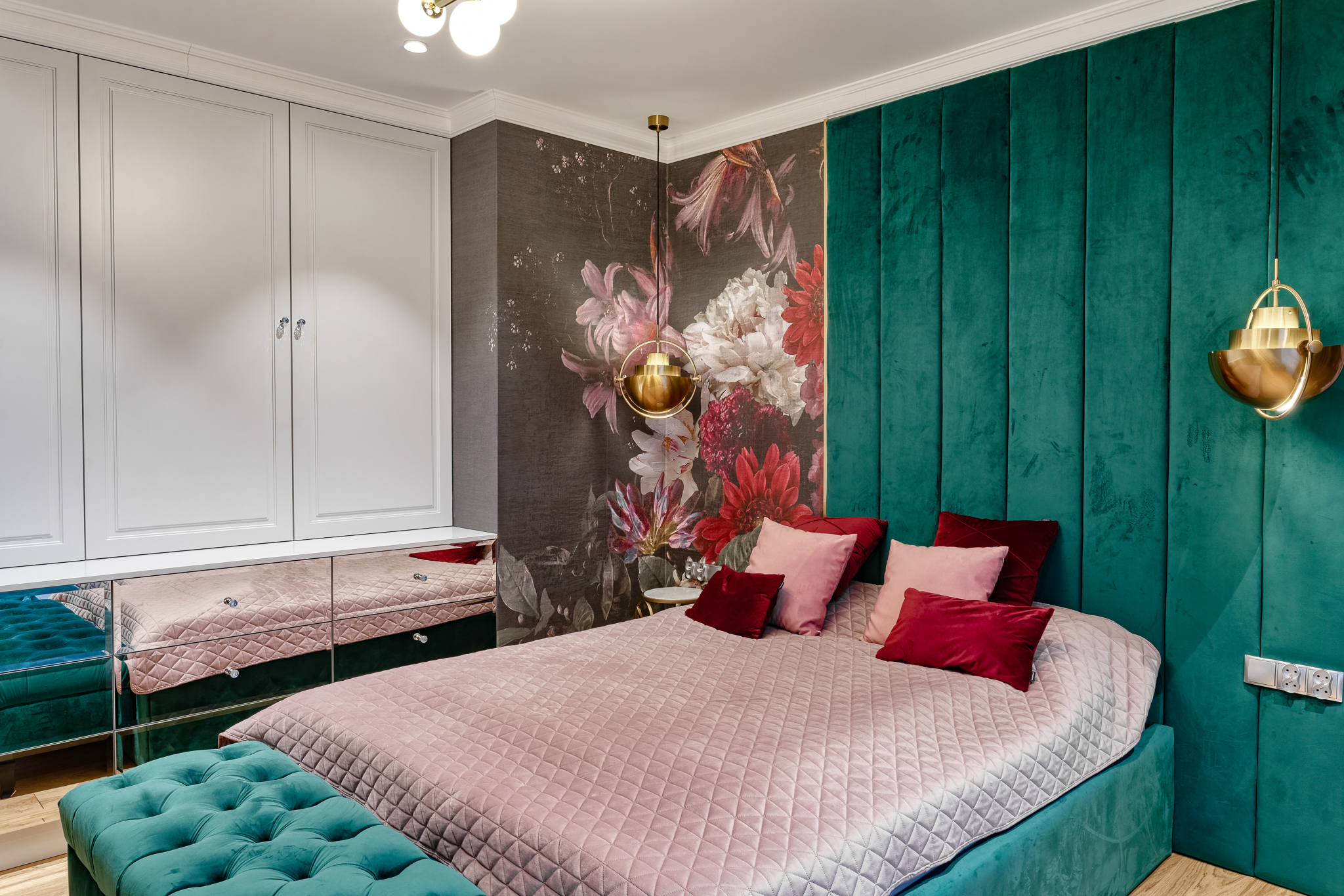 The design of a family interior decoratd with feminine taste. Thanks to great investors, an interior full of crystals, floral patterns and colour (bottle green, emerald) was created. The project included the ground floor: study, kitchen, living room with dining room, guest bathroom; and the first floor where the bedroom and main bathroom were designed at that moment. The interiors have been designed to create colour and material consistency with the ground floor of the house.