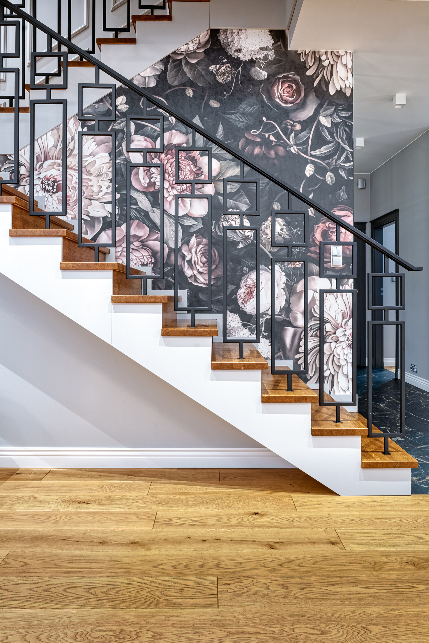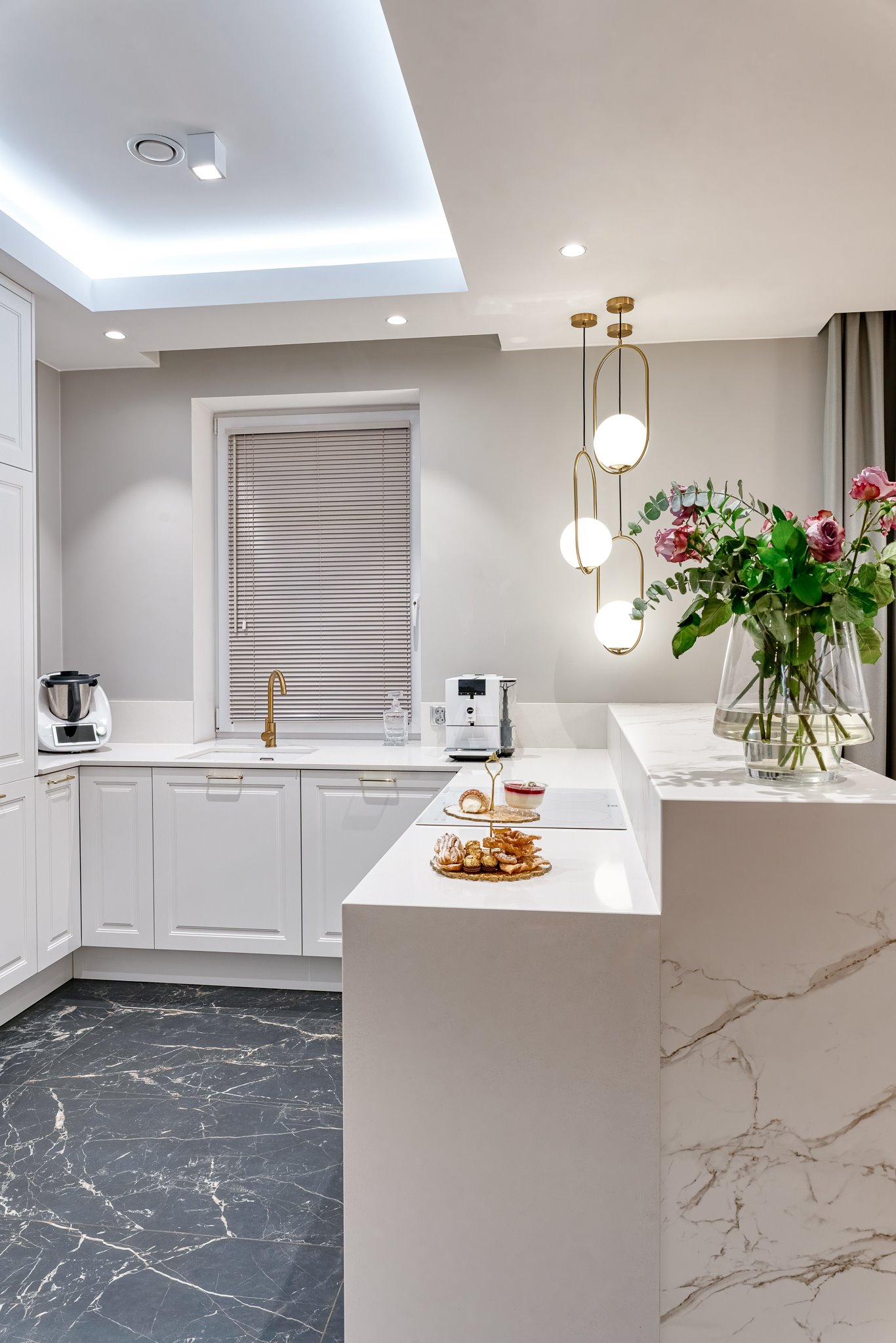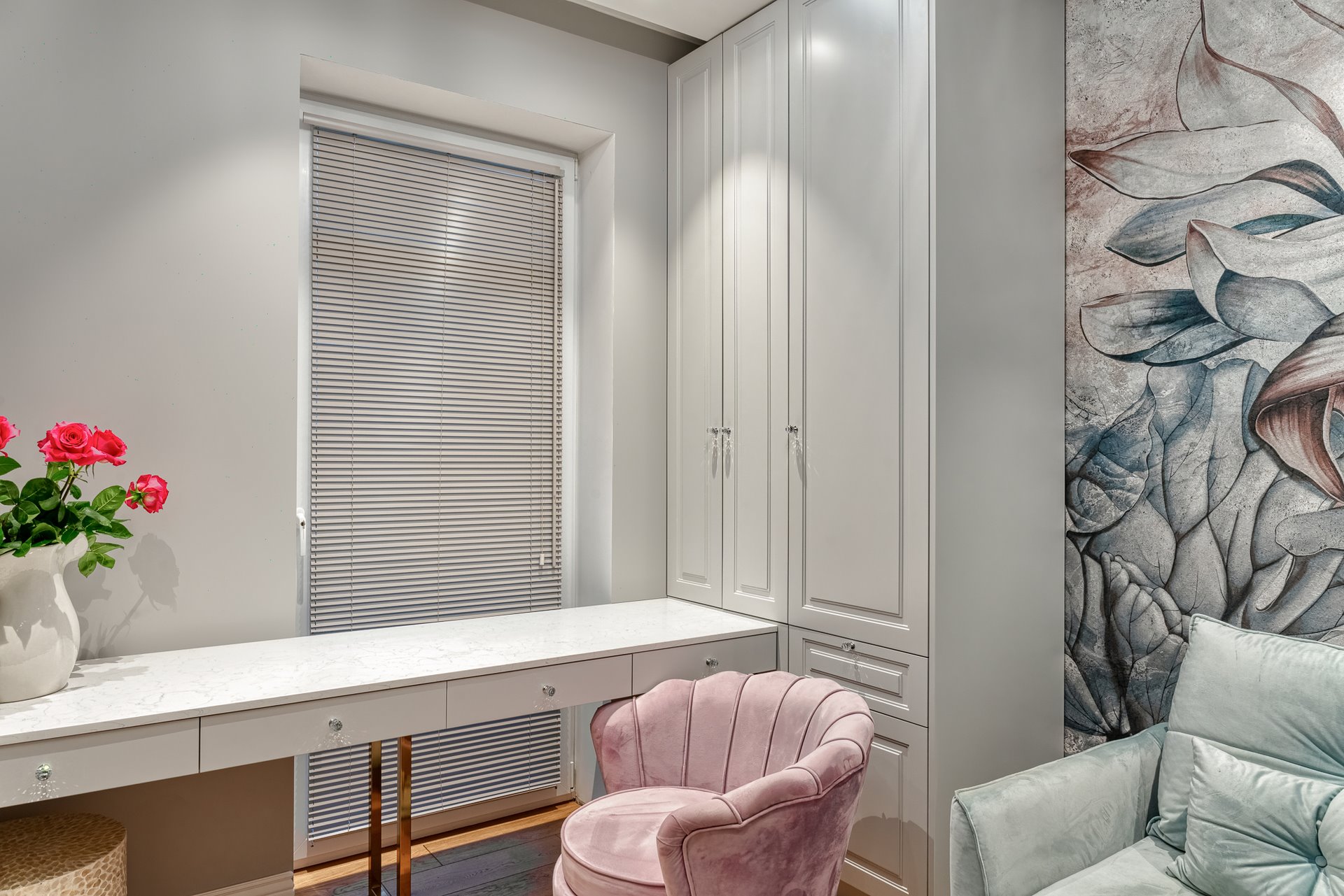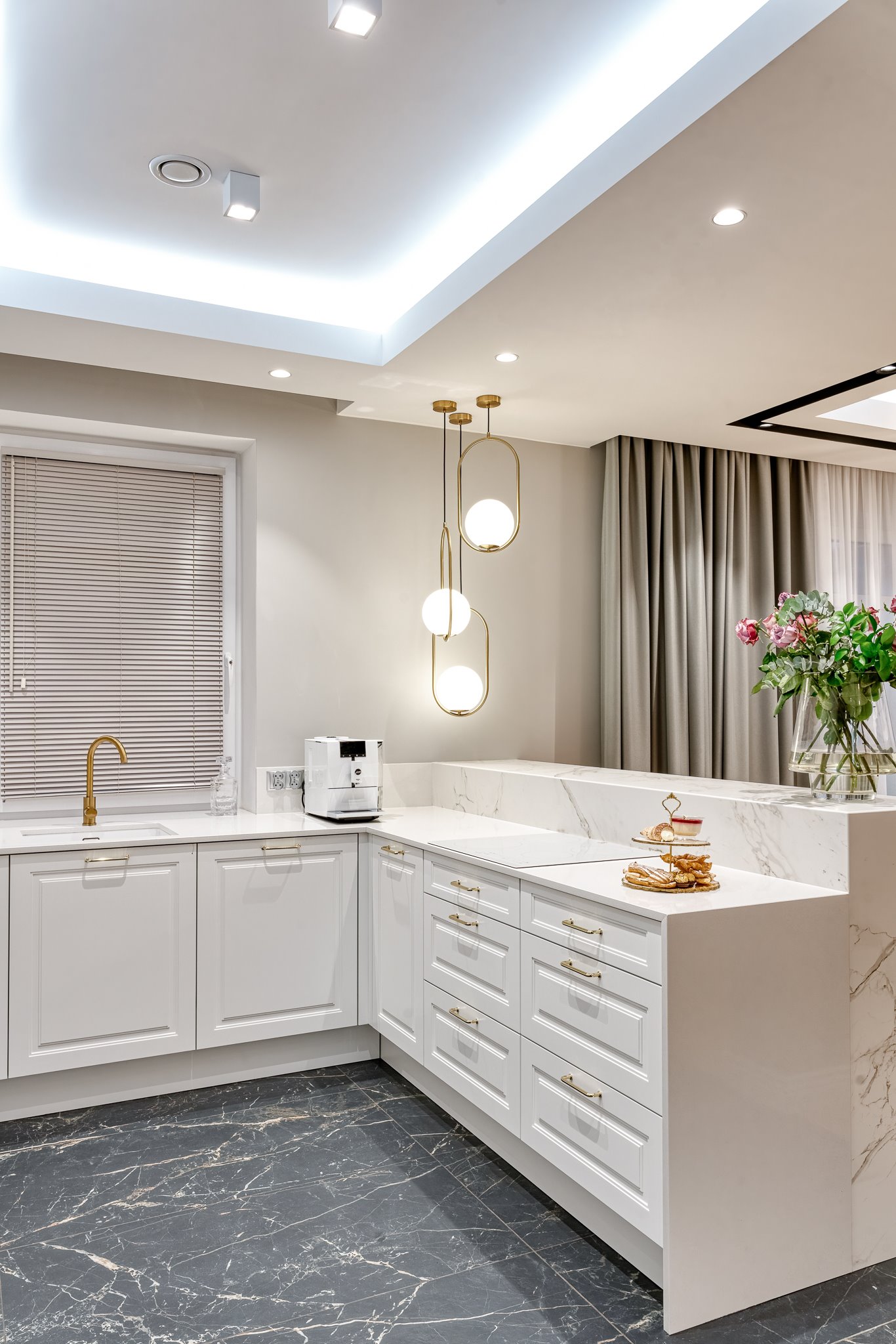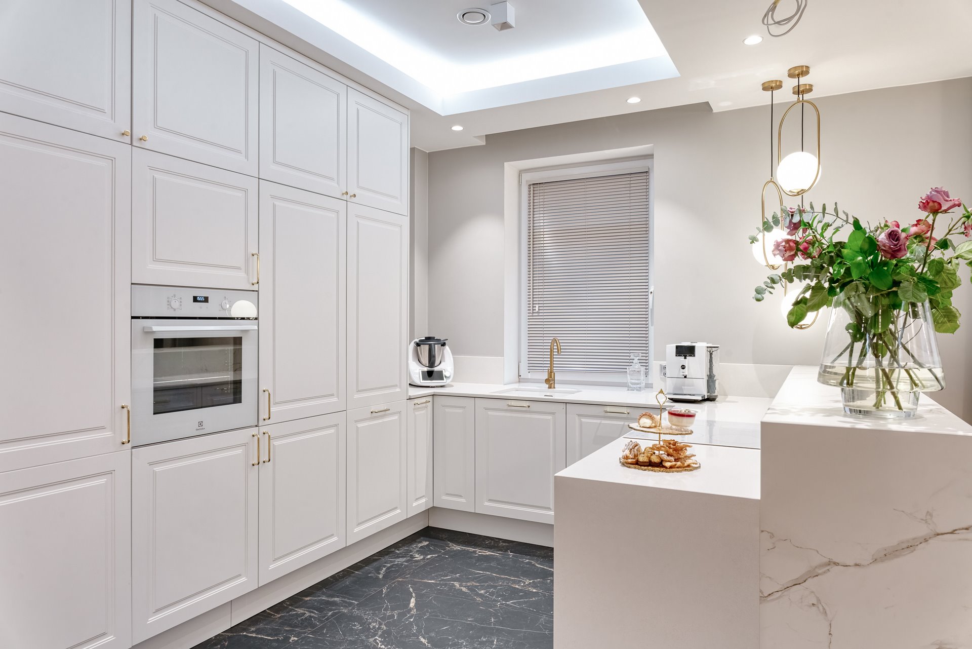 The design of a family interior decoratd with feminine taste. Thanks to great investors, an interior full of crystals, floral patterns and colour (bottle green, emerald) was created. The project included the ground floor: study, kitchen, living room with dining room, guest bathroom; and the first floor where the bedroom and main bathroom were designed at that moment. The interiors have been designed to create colour and material consistency with the ground floor of the house.