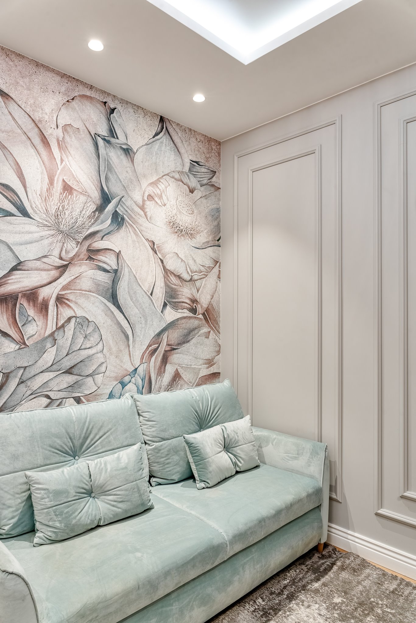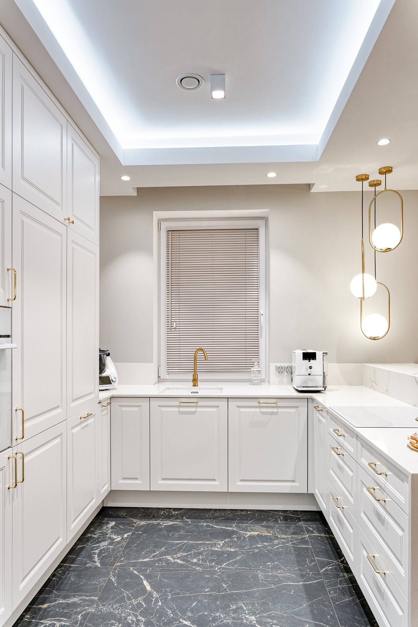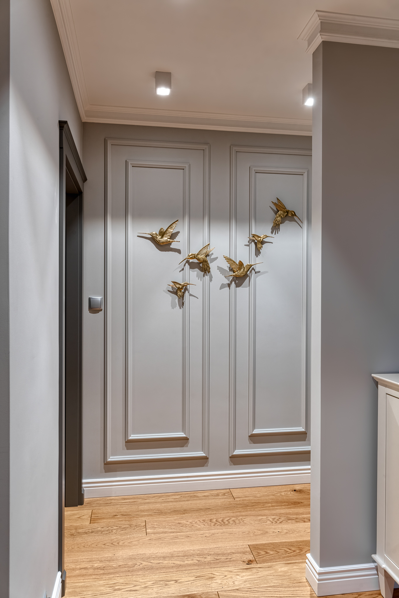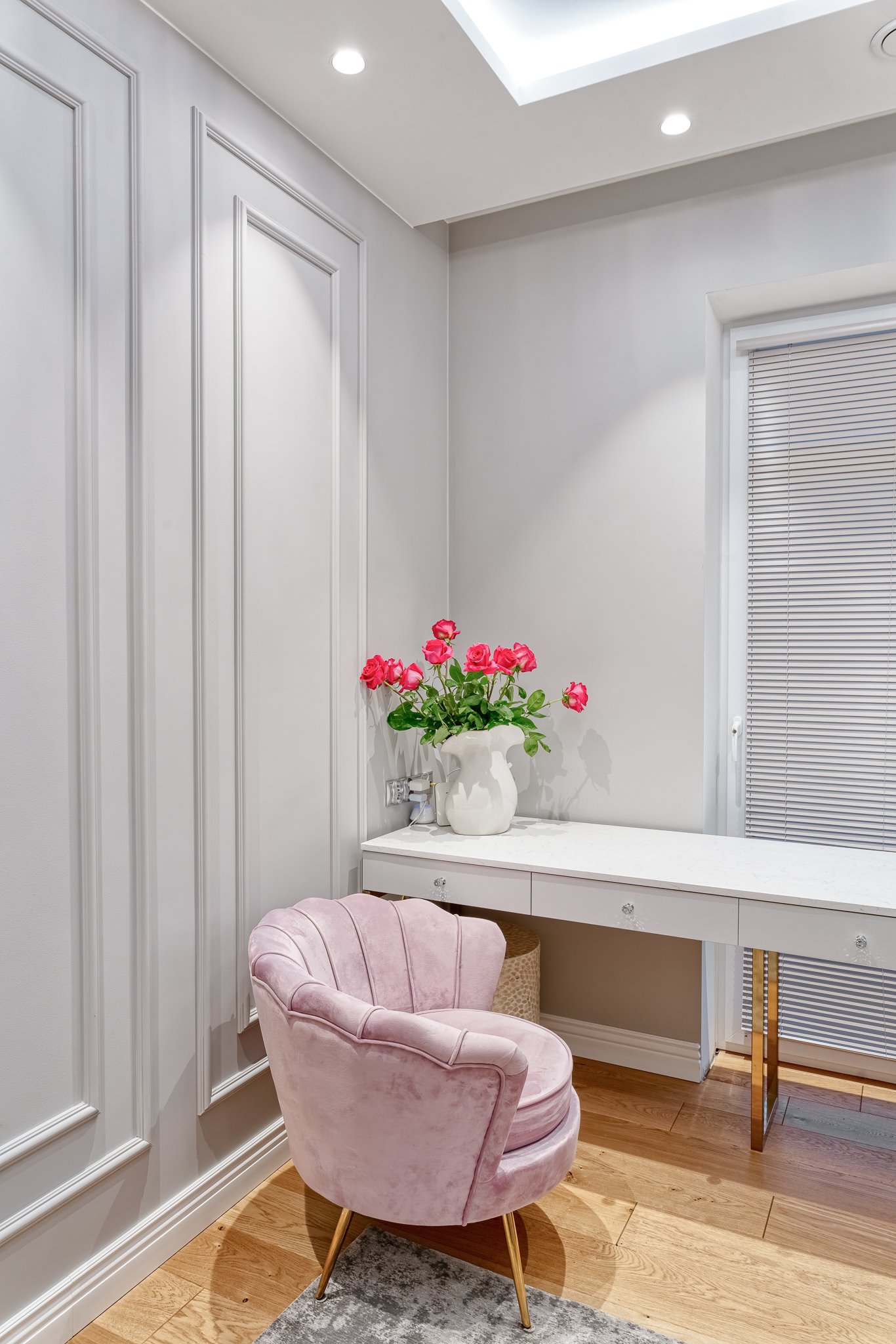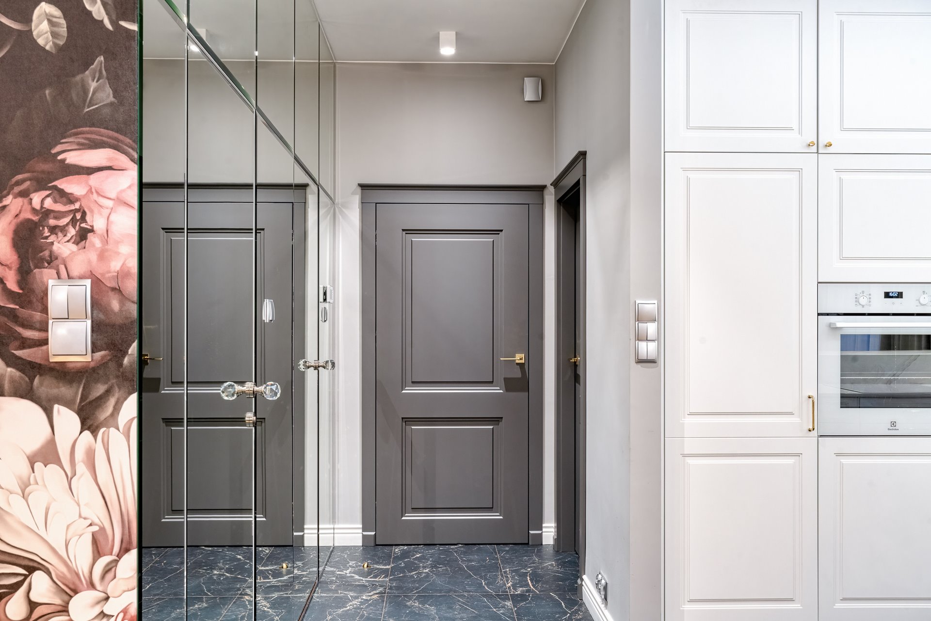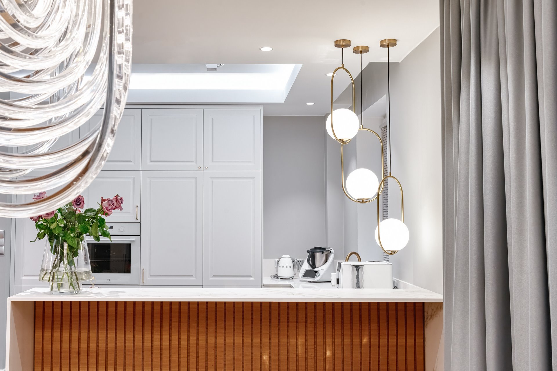 The design of a family interior decoratd with feminine taste. Thanks to great investors, an interior full of crystals, floral patterns and colour (bottle green, emerald) was created. The project included the ground floor: study, kitchen, living room with dining room, guest bathroom; and the first floor where the bedroom and main bathroom were designed at that moment. The interiors have been designed to create colour and material consistency with the ground floor of the house.