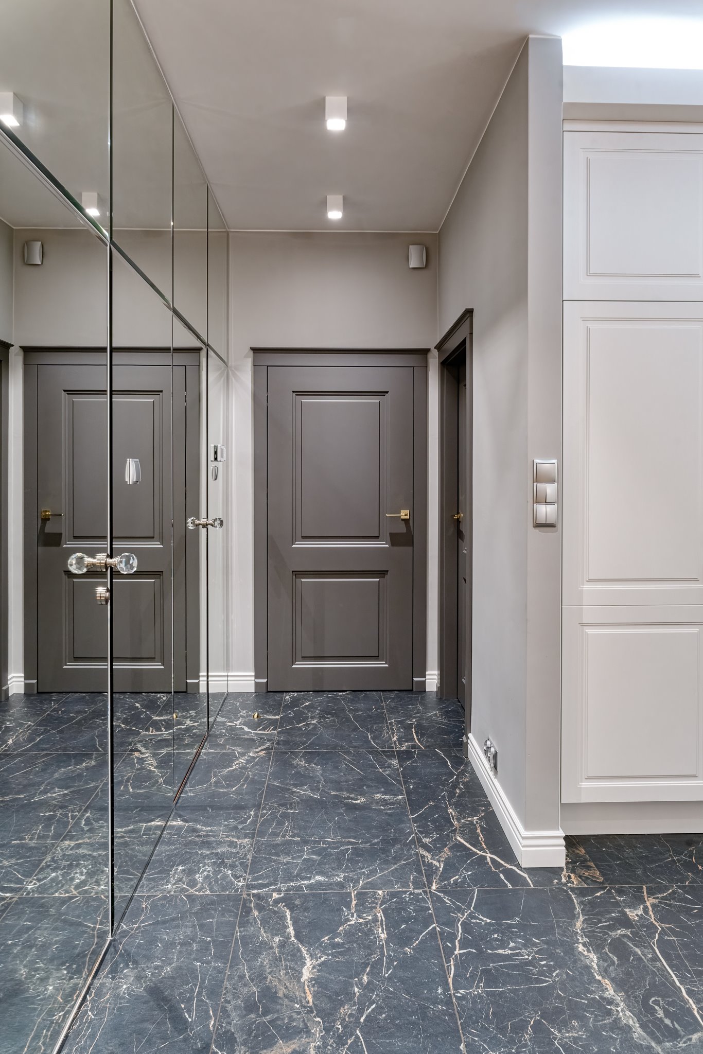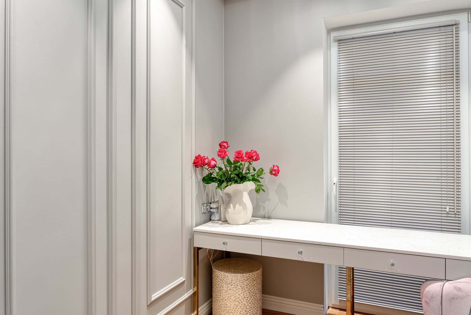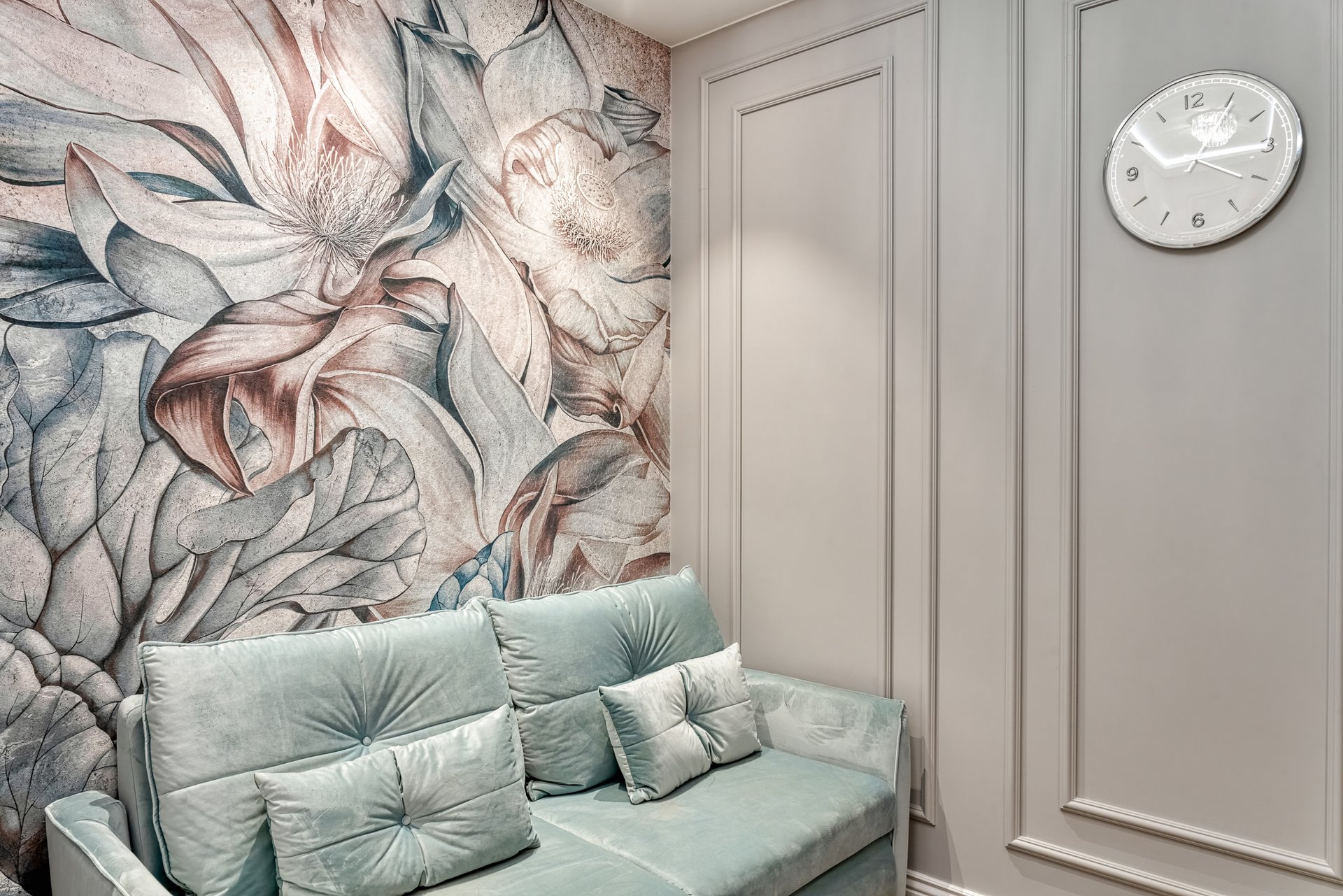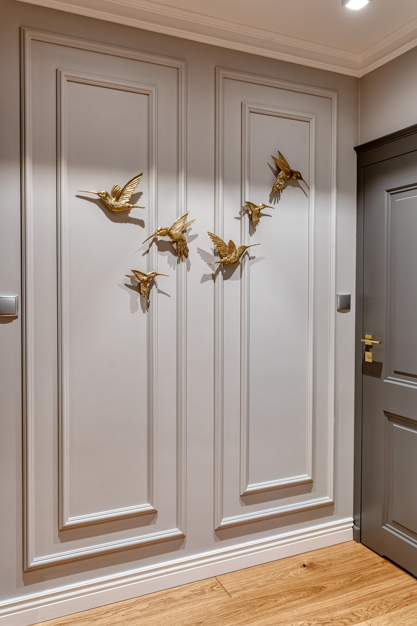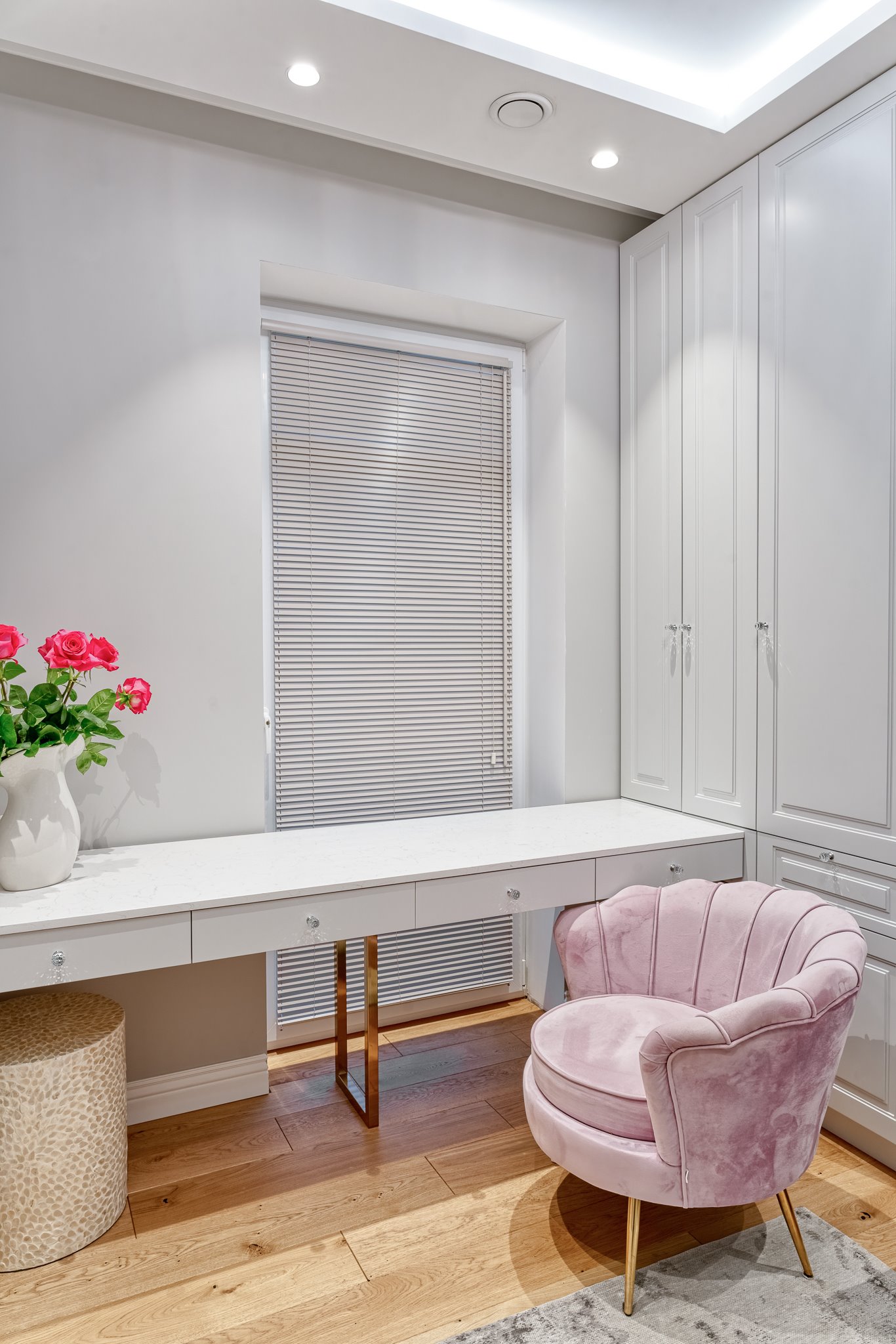 The design of a family interior decoratd with feminine taste. Thanks to great investors, an interior full of crystals, floral patterns and colour (bottle green, emerald) was created. The project included the ground floor: study, kitchen, living room with dining room, guest bathroom; and the first floor where the bedroom and main bathroom were designed at that moment. The interiors have been designed to create colour and material consistency with the ground floor of the house.